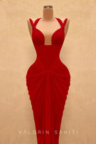 This stunning gown by Valdrin Sahiti is a masterpiece of sculptural elegance and sensual sophistication. Crafted in a rich, bold red hue, the dress features a figure-hugging silhouette and a shape with precision.