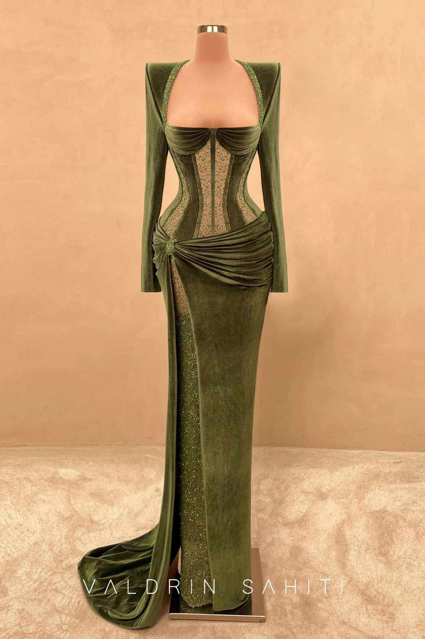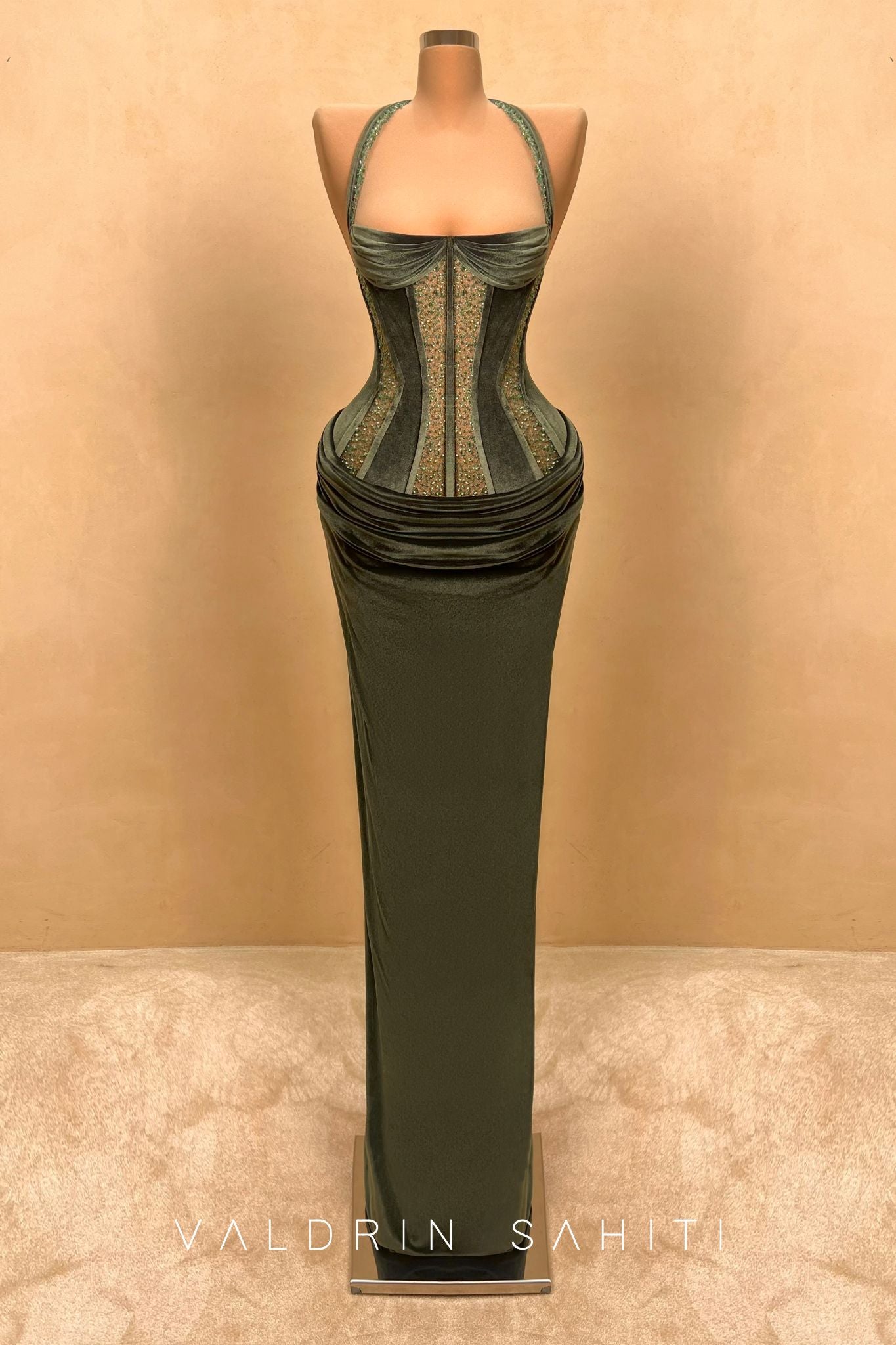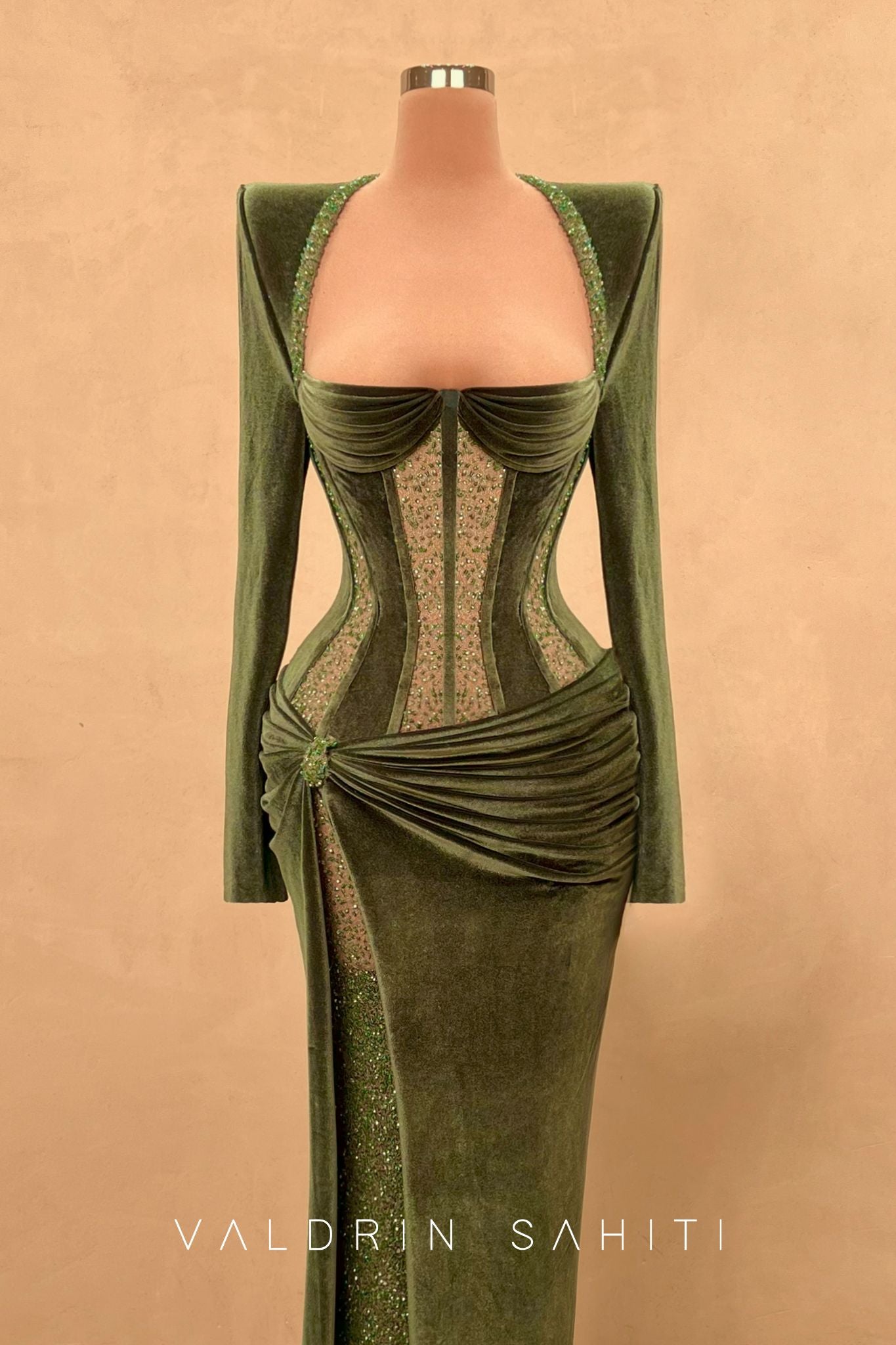 A masterclass in elegance and structure, this emerald green velvet gown features a sculpted corset bodice that enhances the natural silhouette with bold yet sophisticated lines. The velvet catches light with every movement, wrapping the body in rich, luxurious texture. Designed with a flattering draped skirt and high-fashion hip sculpting, this piece exudes architectural finesse.