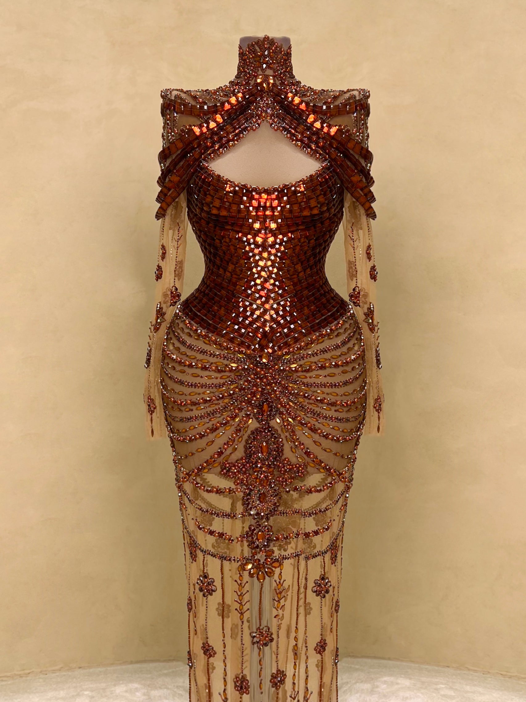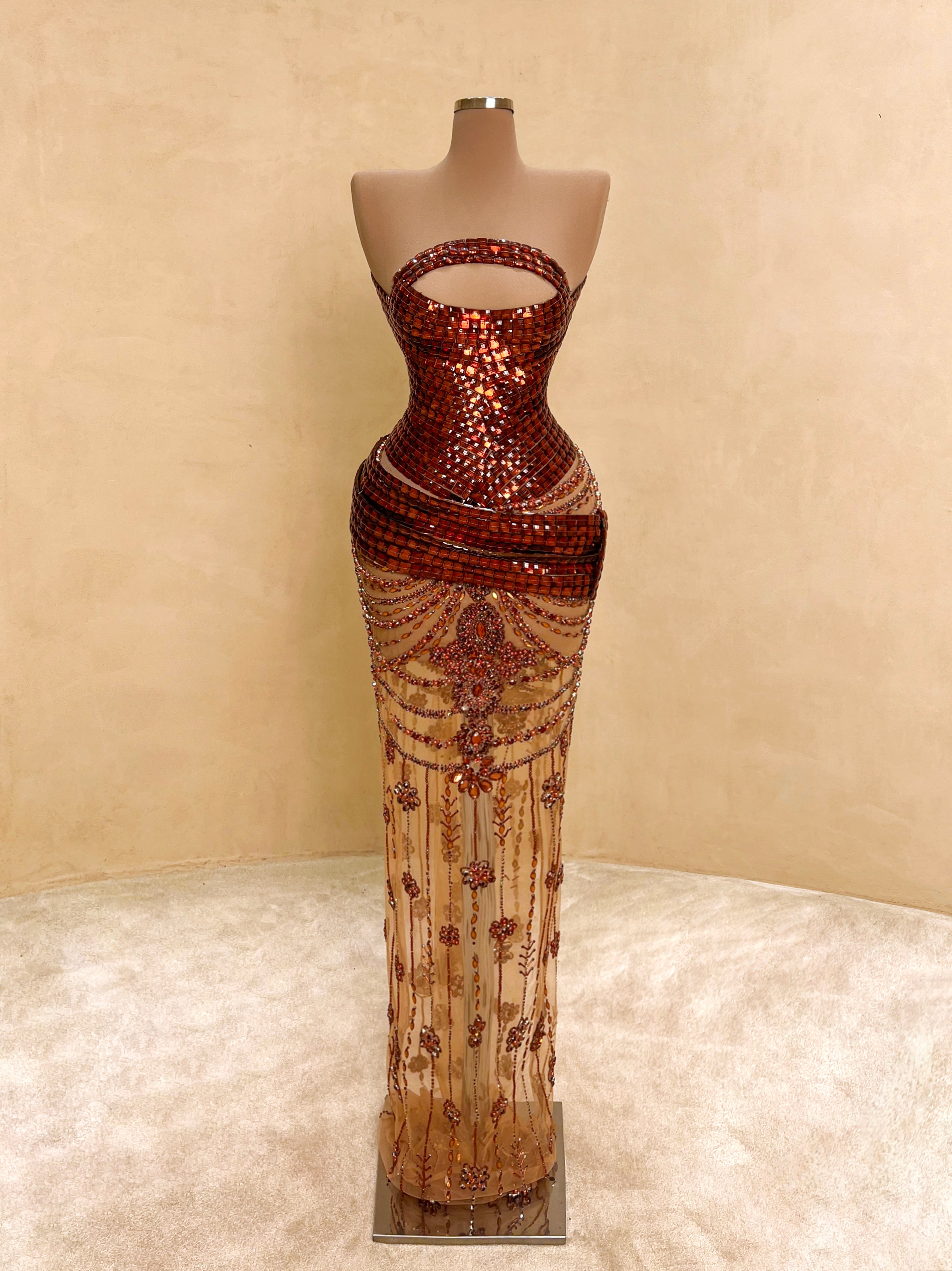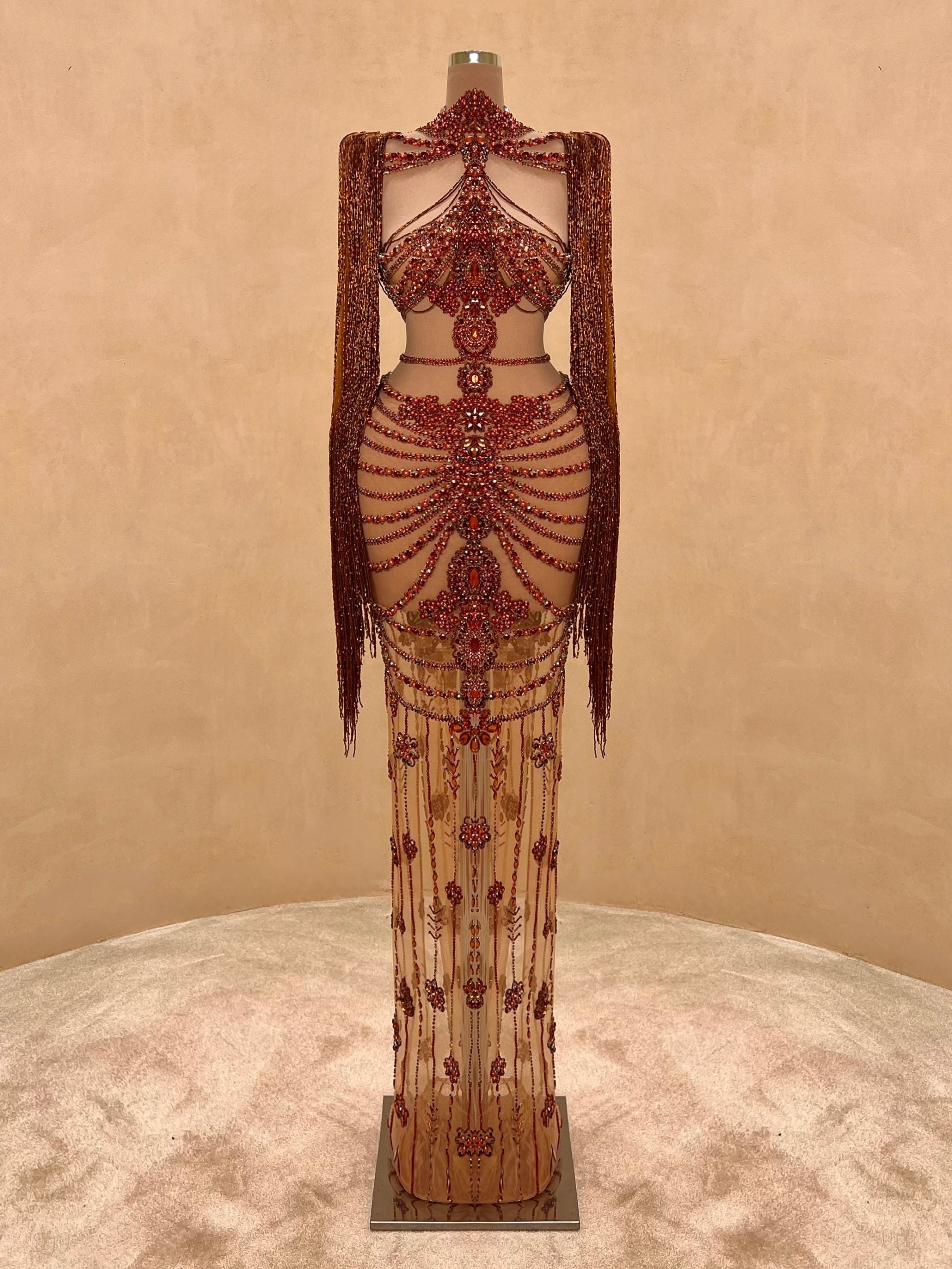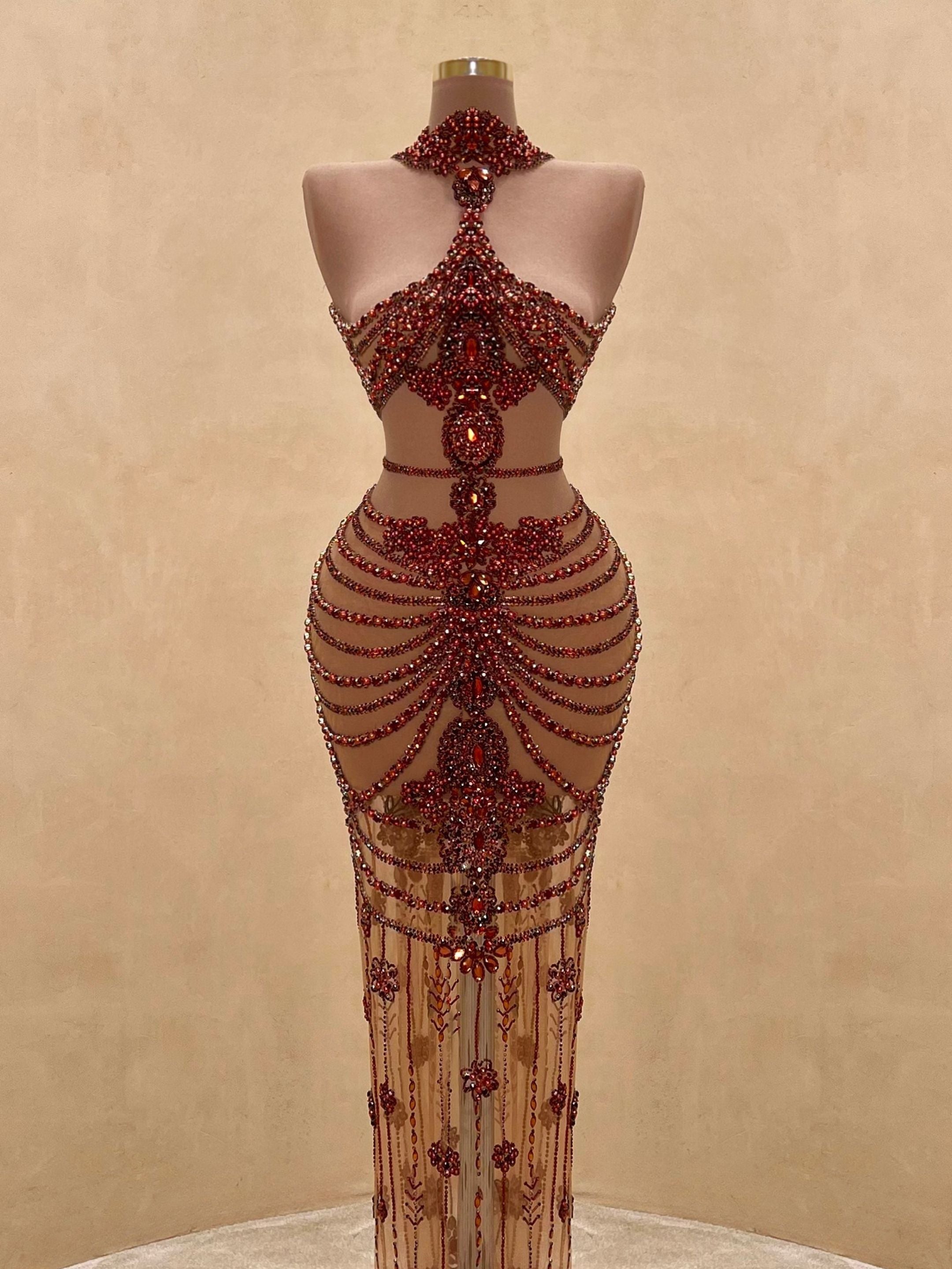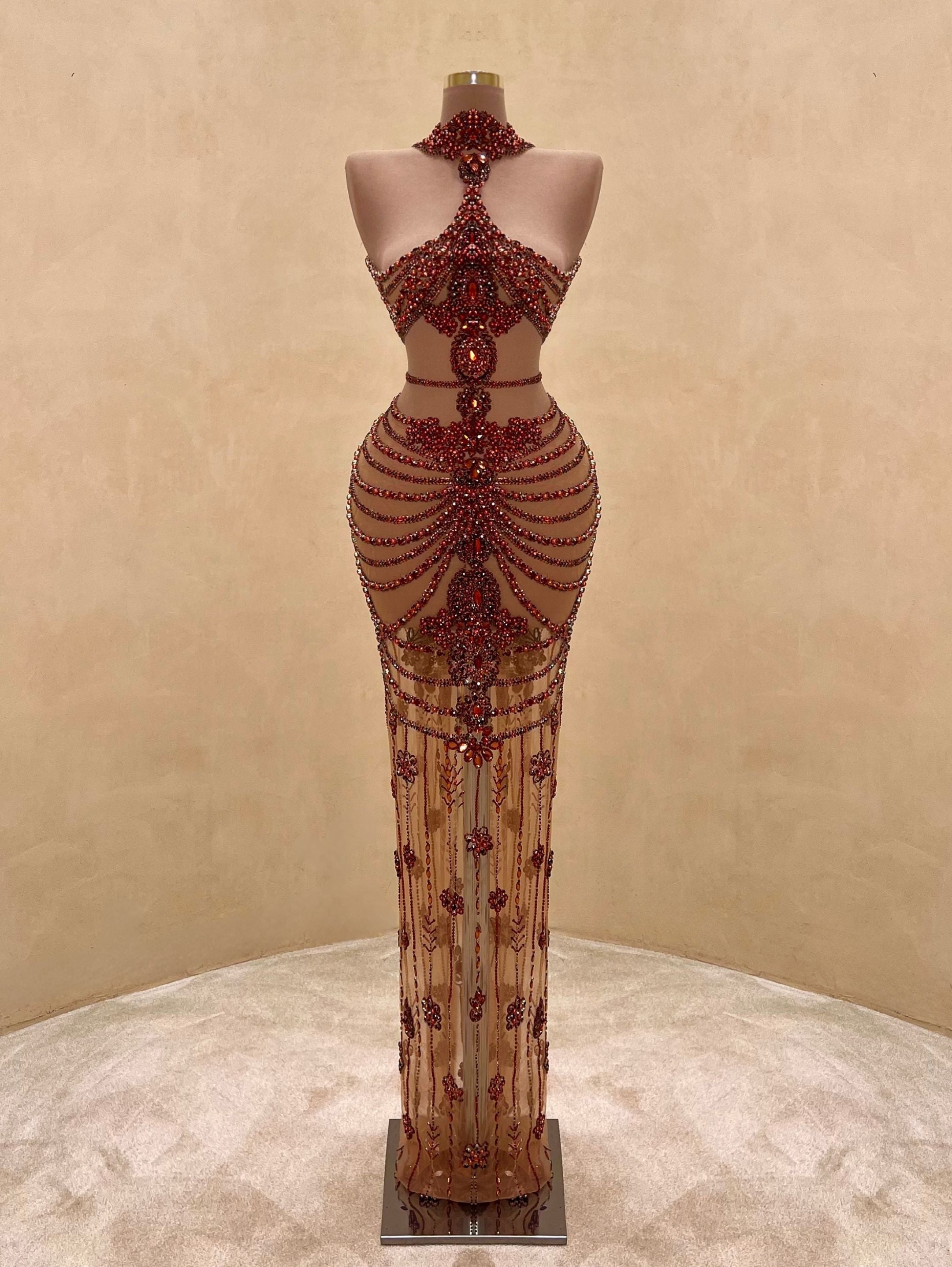 A seductive masterpiece in wine red, this couture gown features bold sculptural beading and a high-neck halter silhouette with an open back. The intricate detailing wraps the body in a dramatic hourglass illusion, finished with delicate sheer panels and symmetrical gemstone embroidery cascading to the floor.