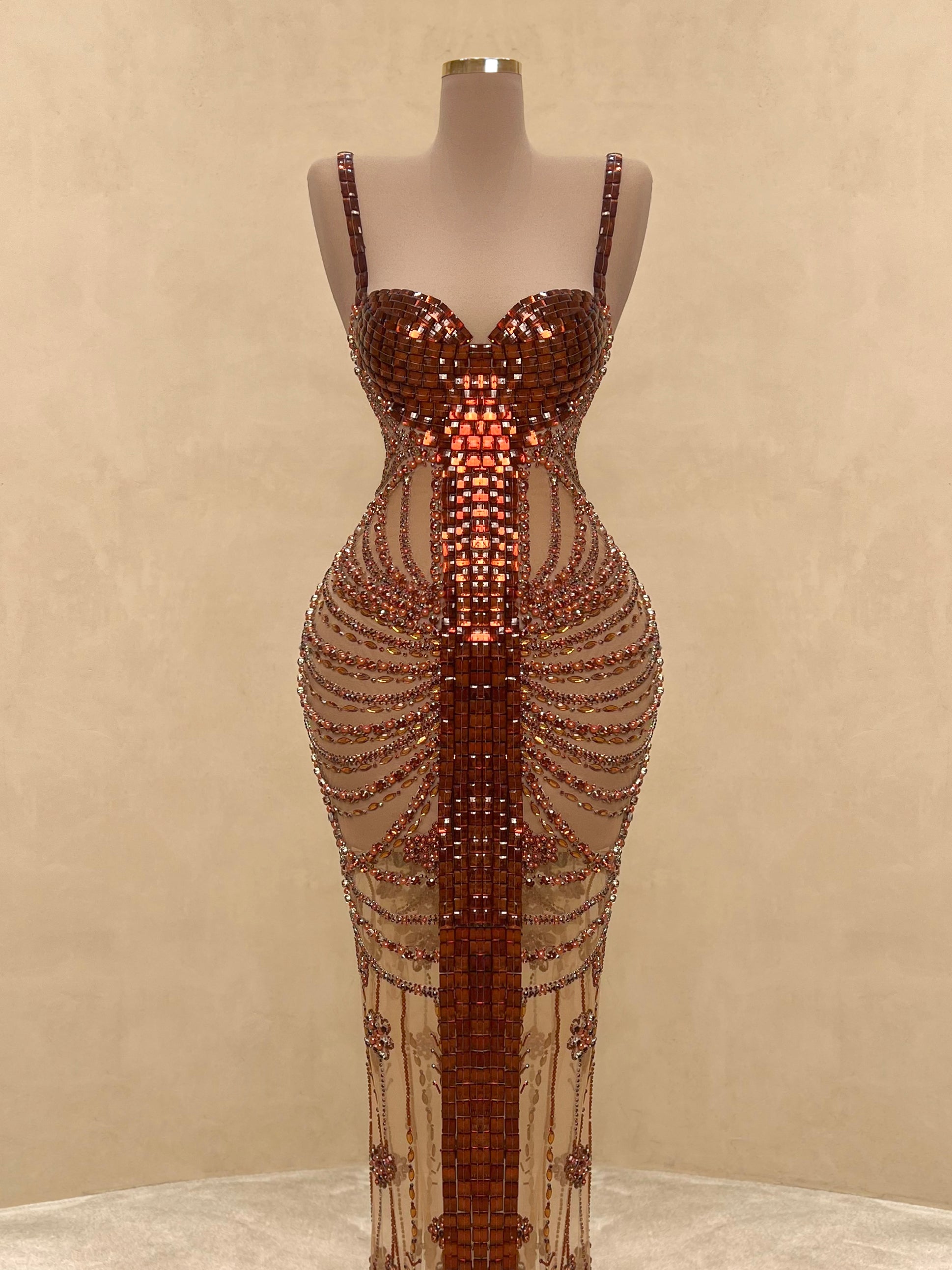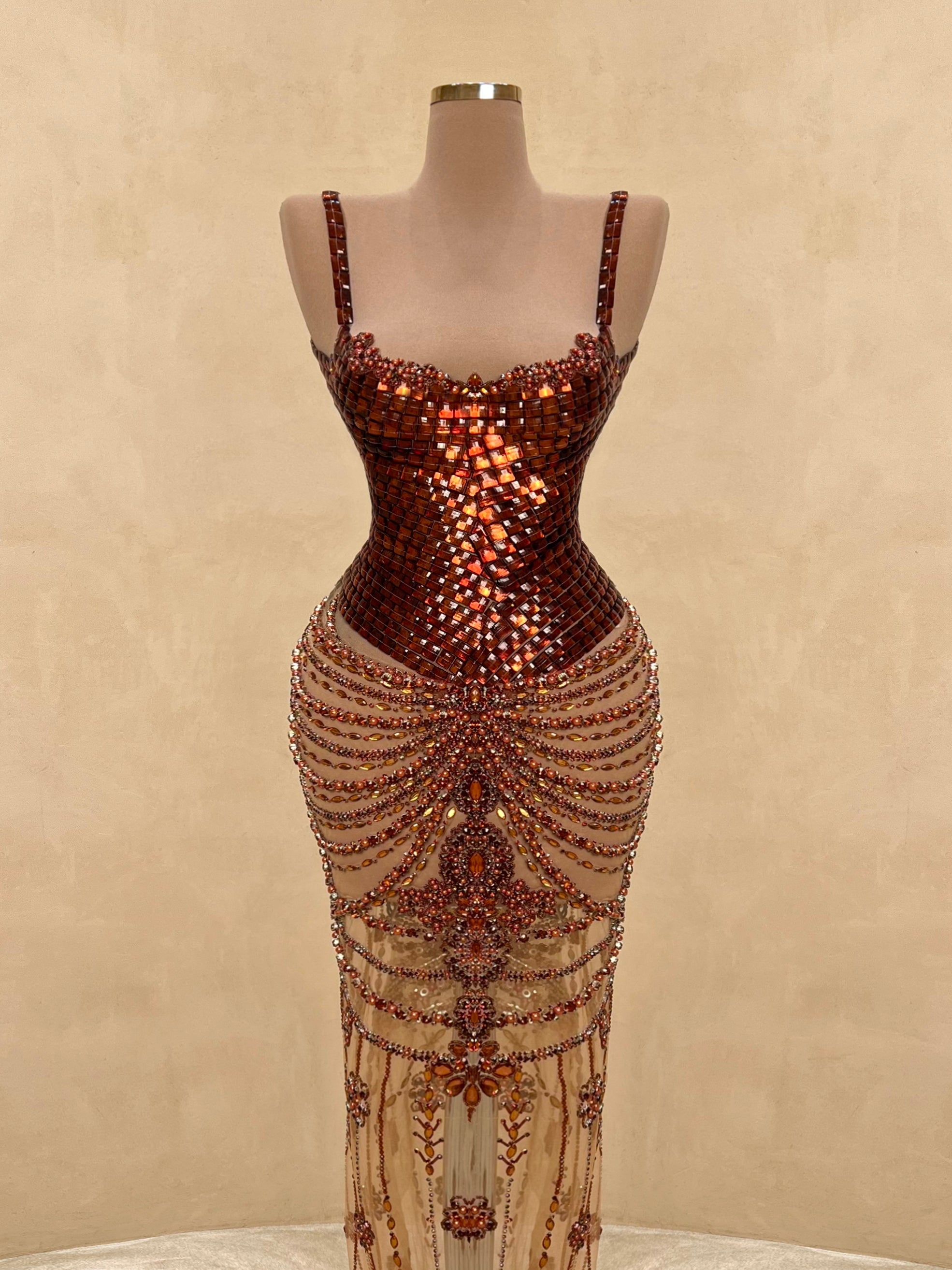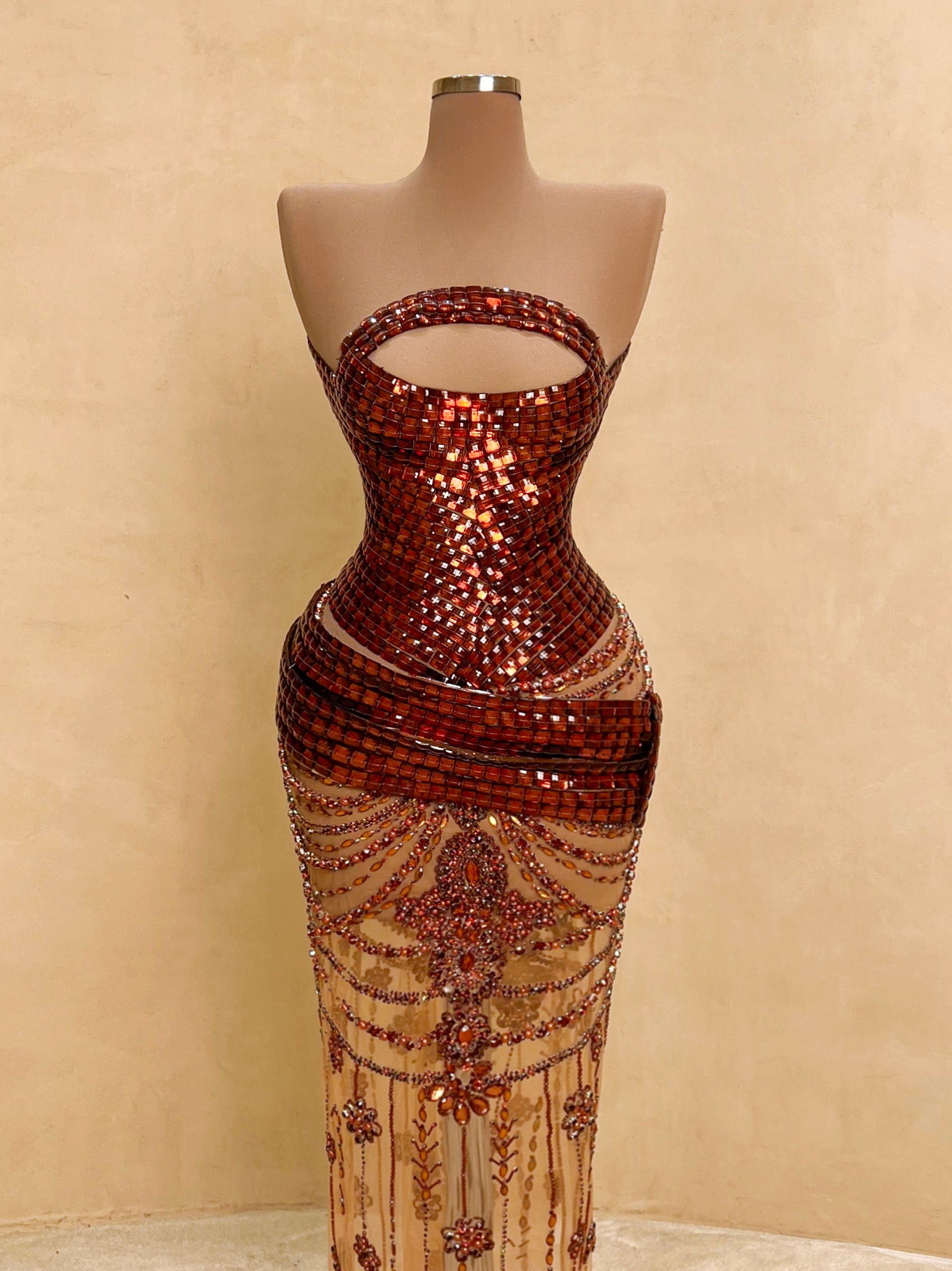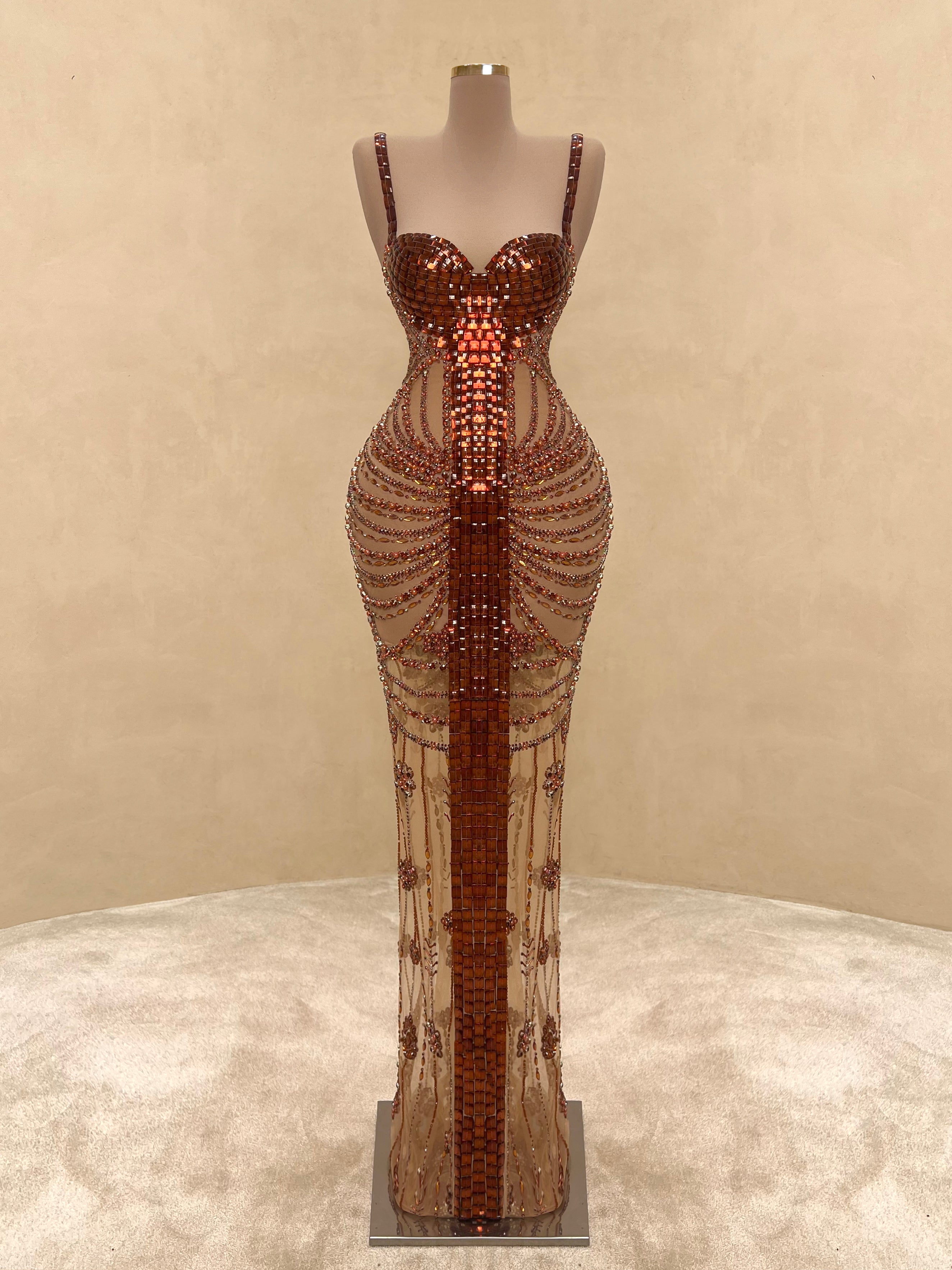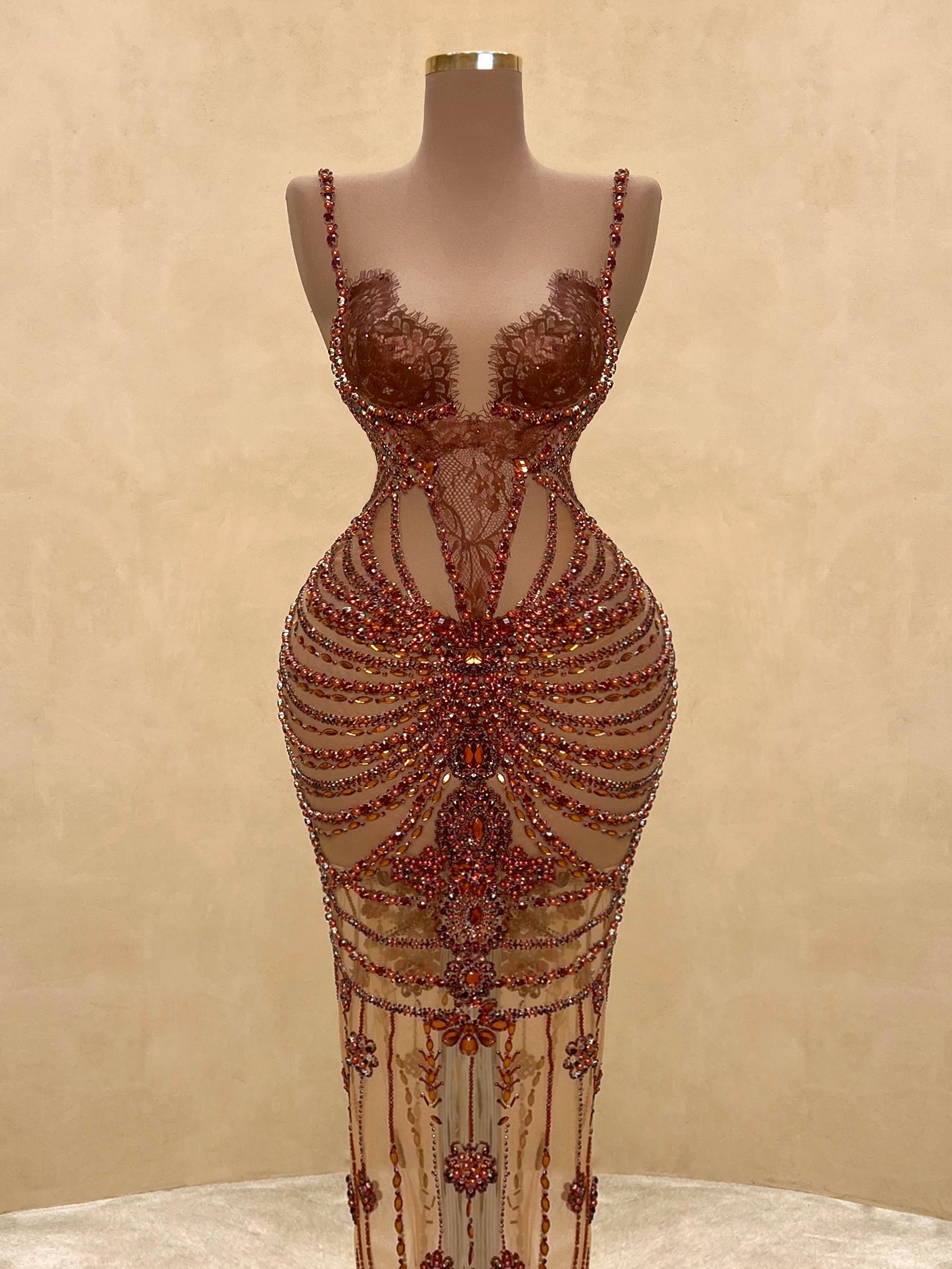 A seductive masterpiece in wine red, this couture gown features bold sculptural beading and a high-neck halter silhouette with an open back. The intricate detailing wraps the body in a dramatic hourglass illusion, finished with delicate sheer panels and symmetrical gemstone embroidery cascading to the floor.