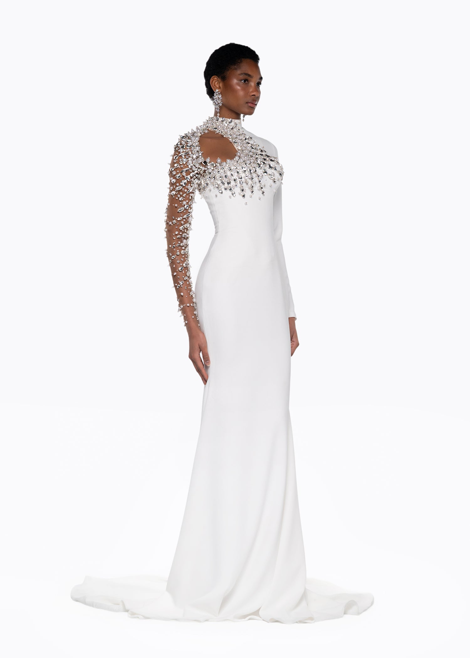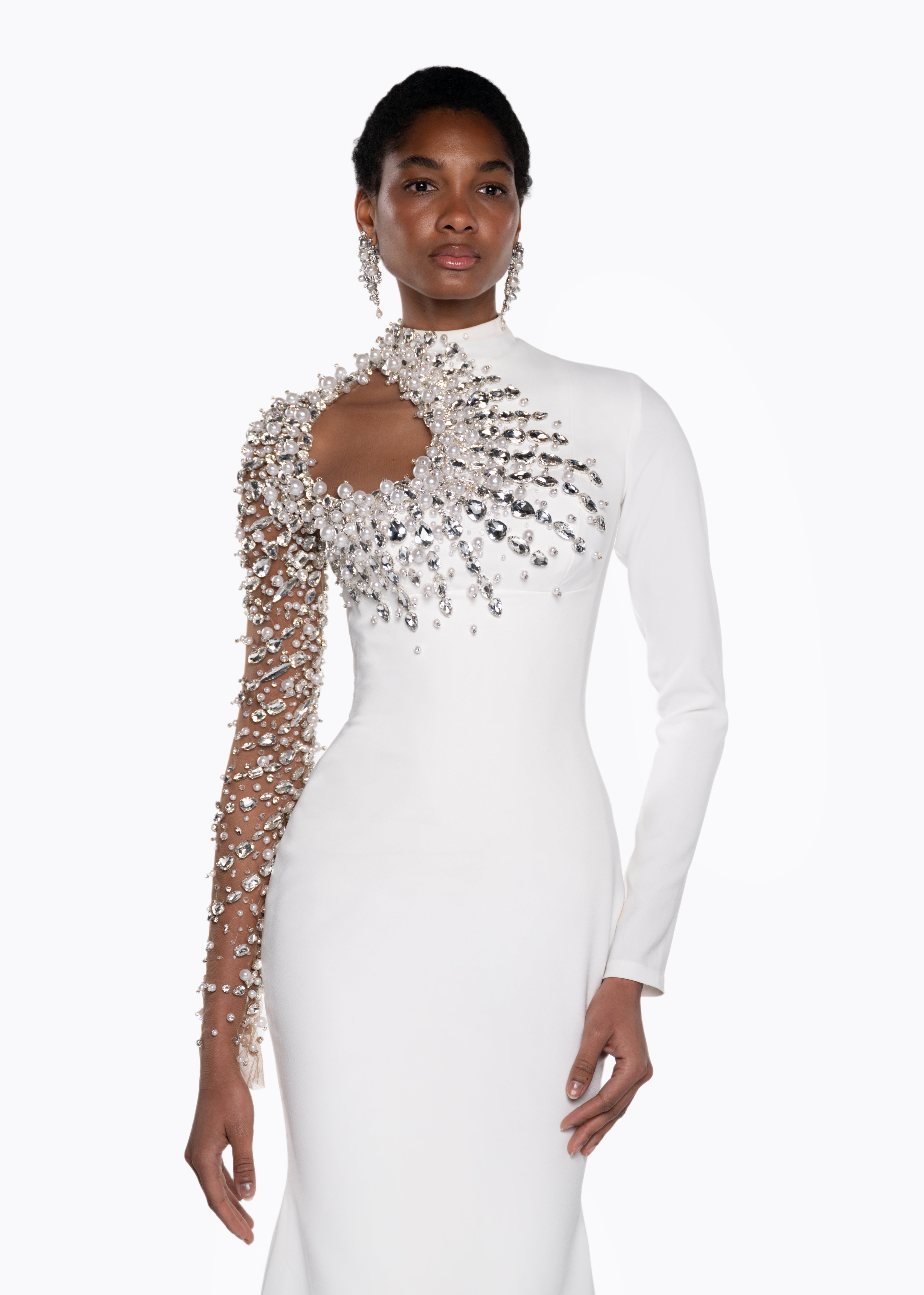 - Crystal and bead explosion embroidery across shoulder and bodice