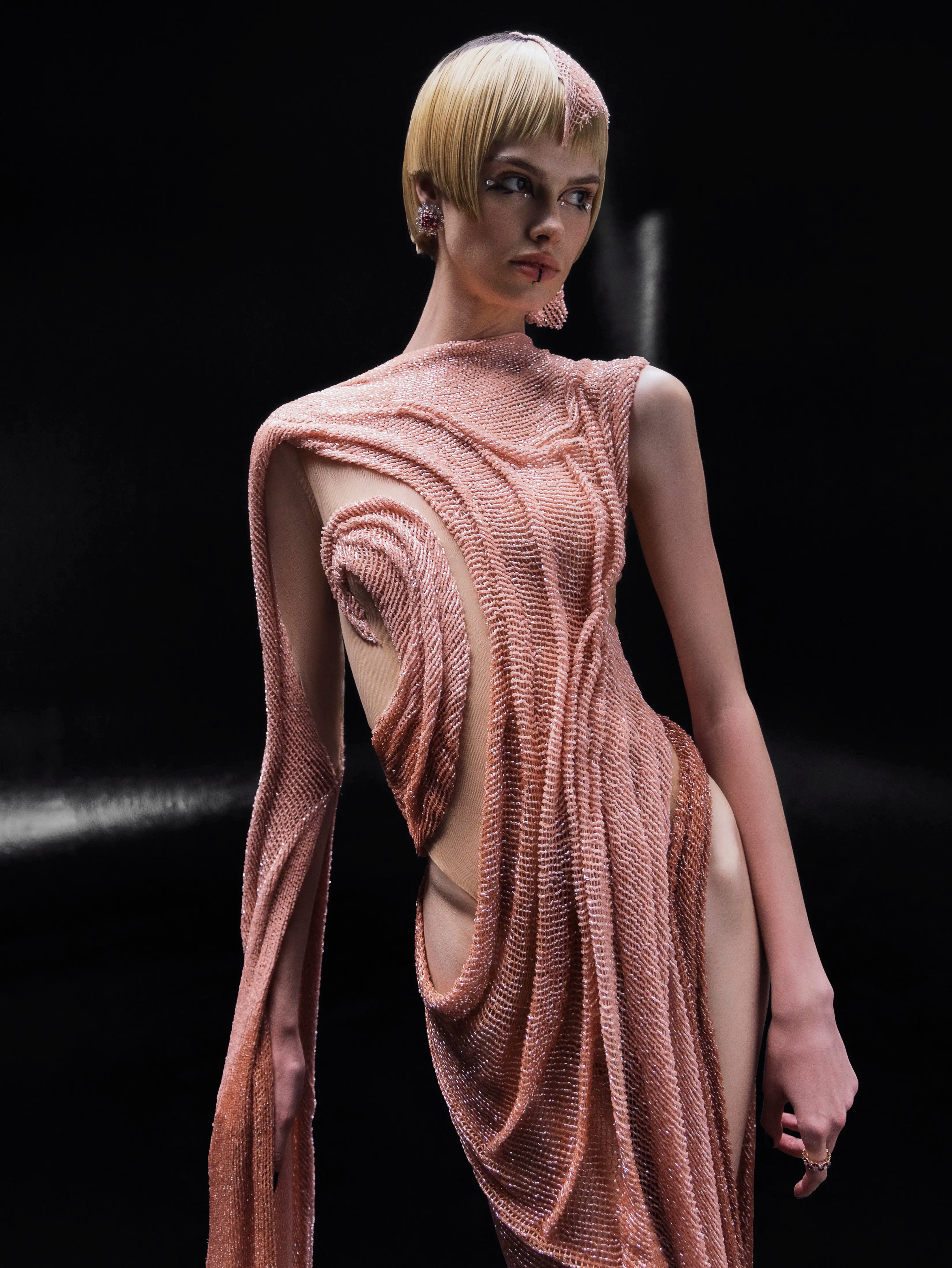 - Sculpted spiral bodice detailing creating futuristic elegance