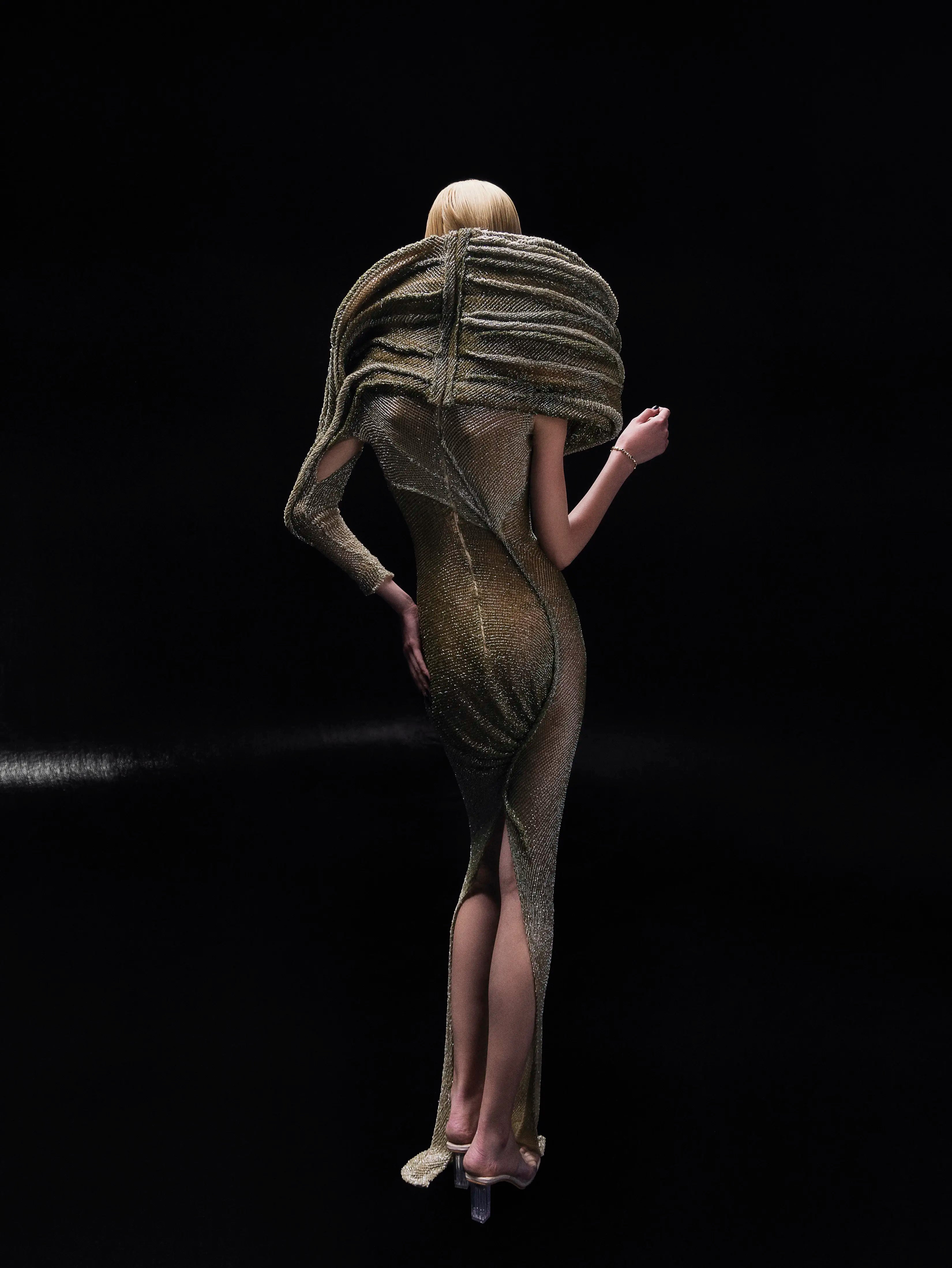 - Dramatic sculpted shoulder wave detail framing the neckline