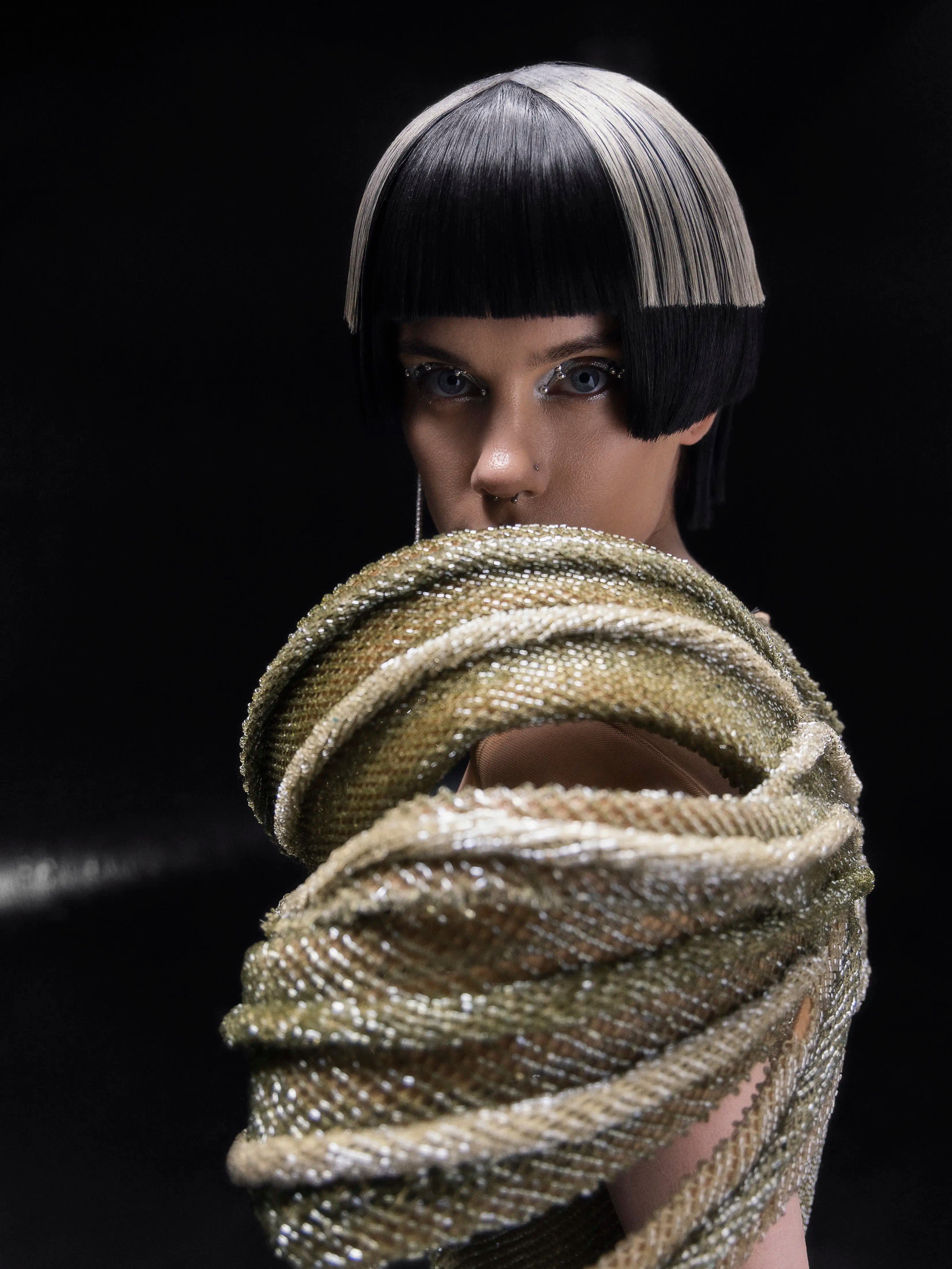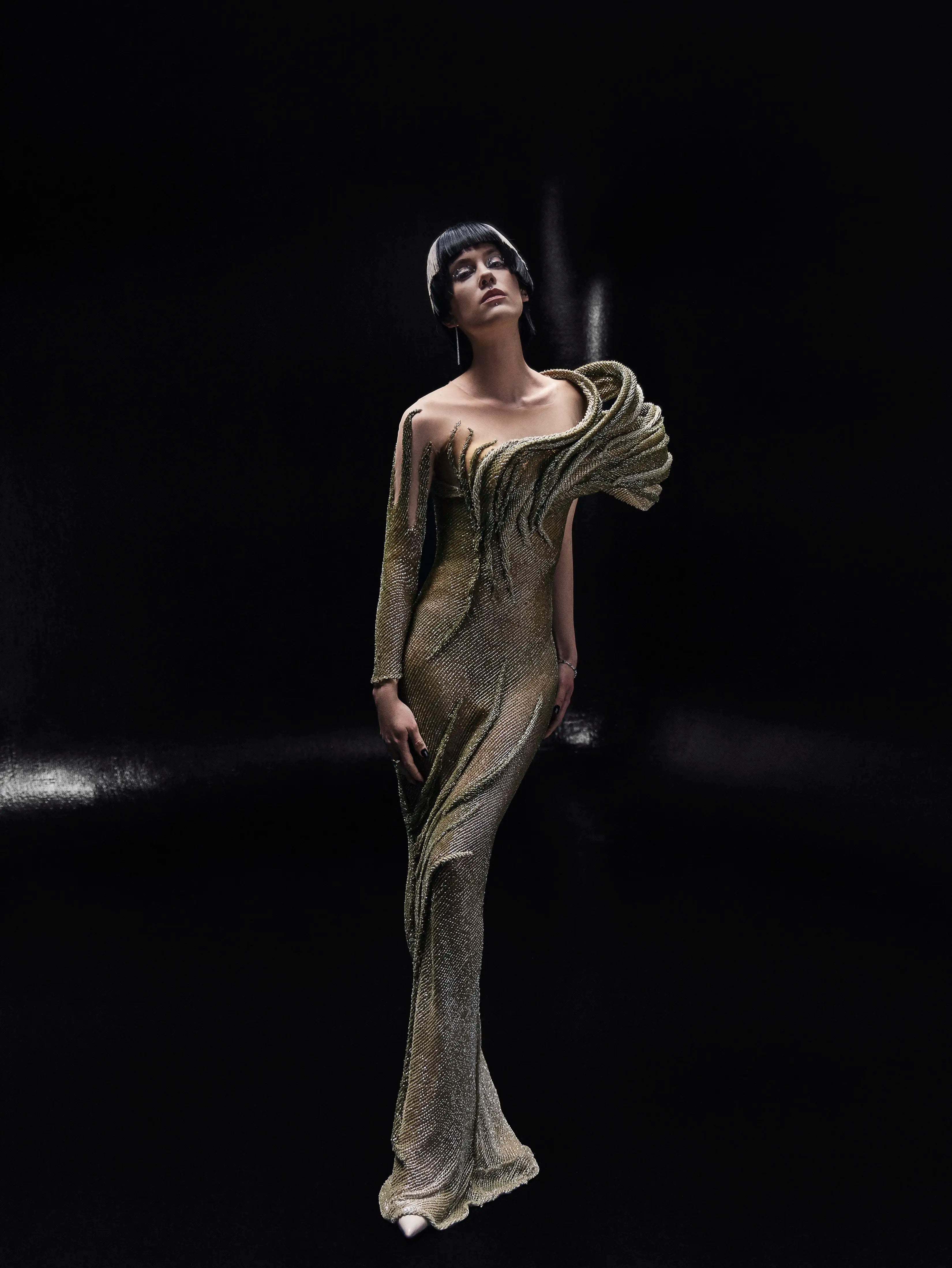 - One-shoulder sculptural gown in a metallic bronze-gold beaded fabric