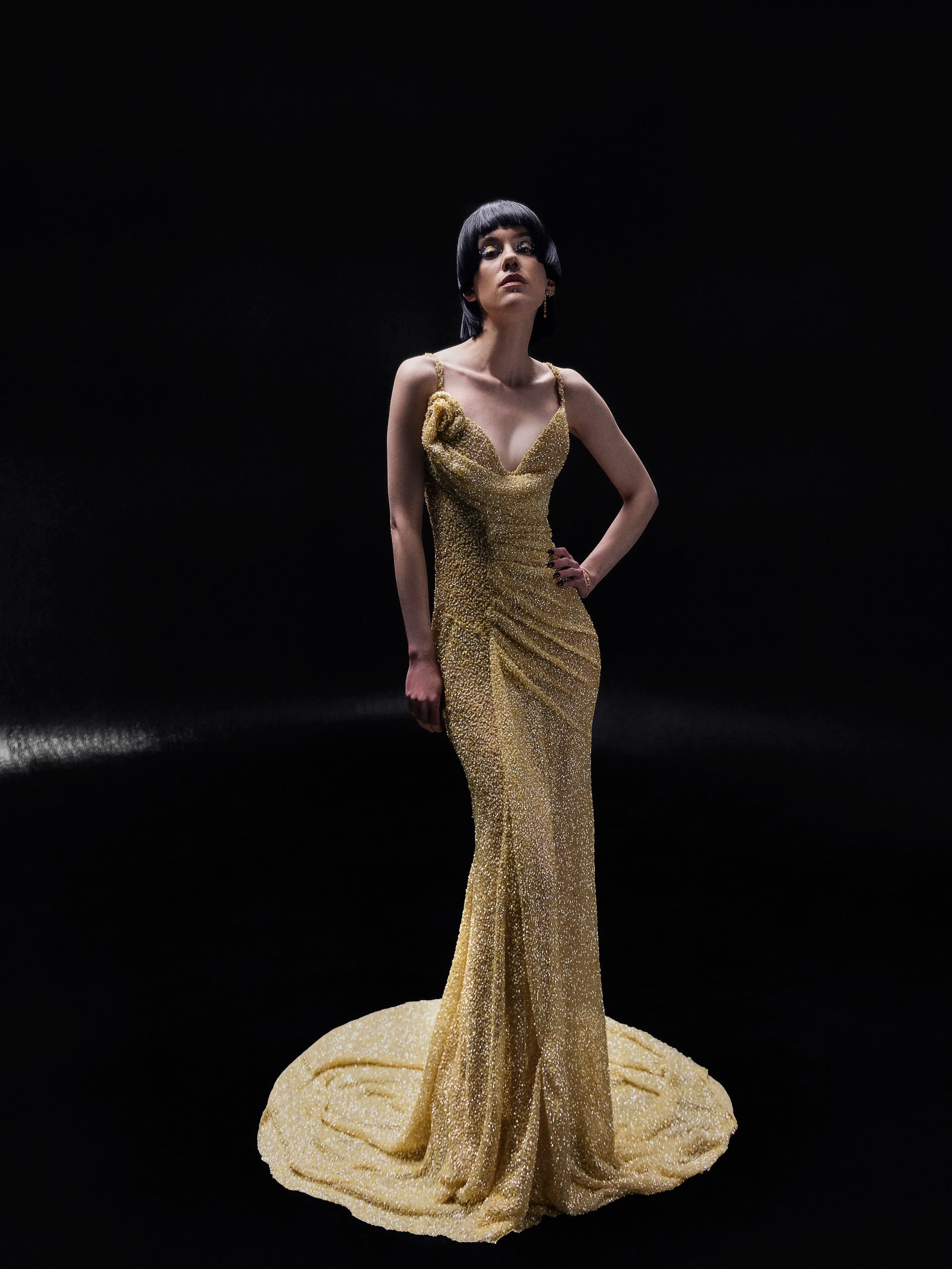 • Elegant floor-length gown crafted in shimmering golden beadwork
