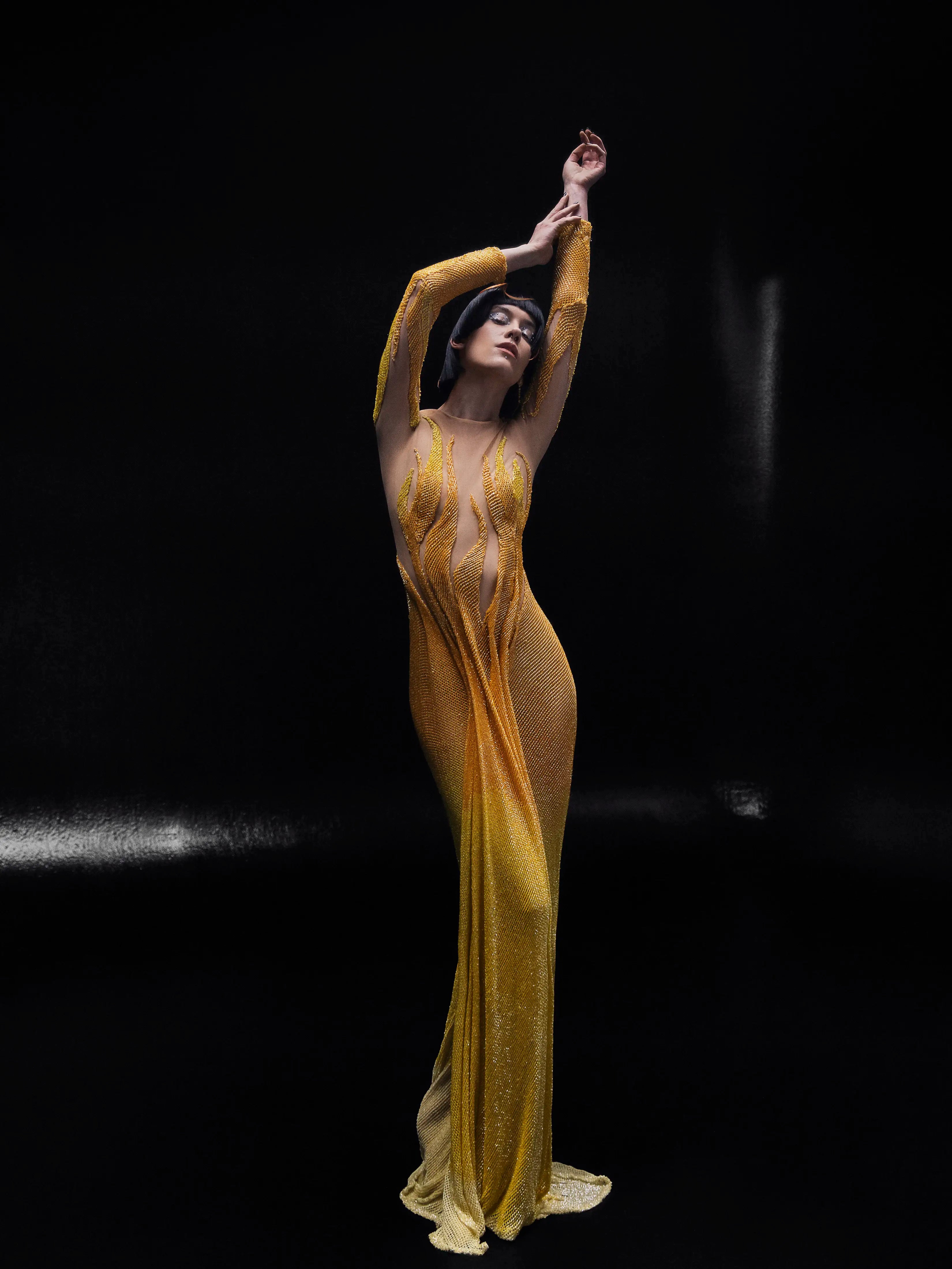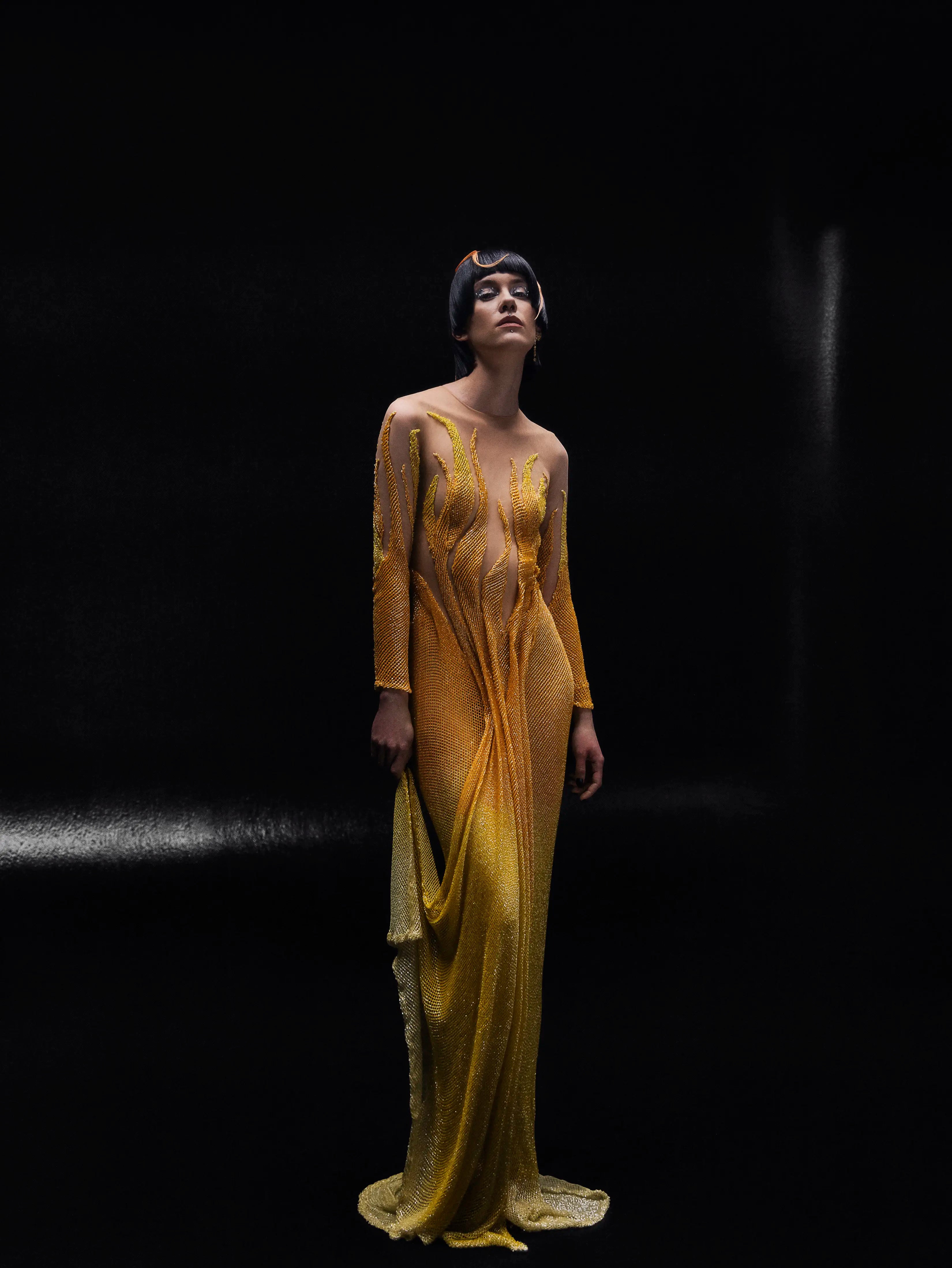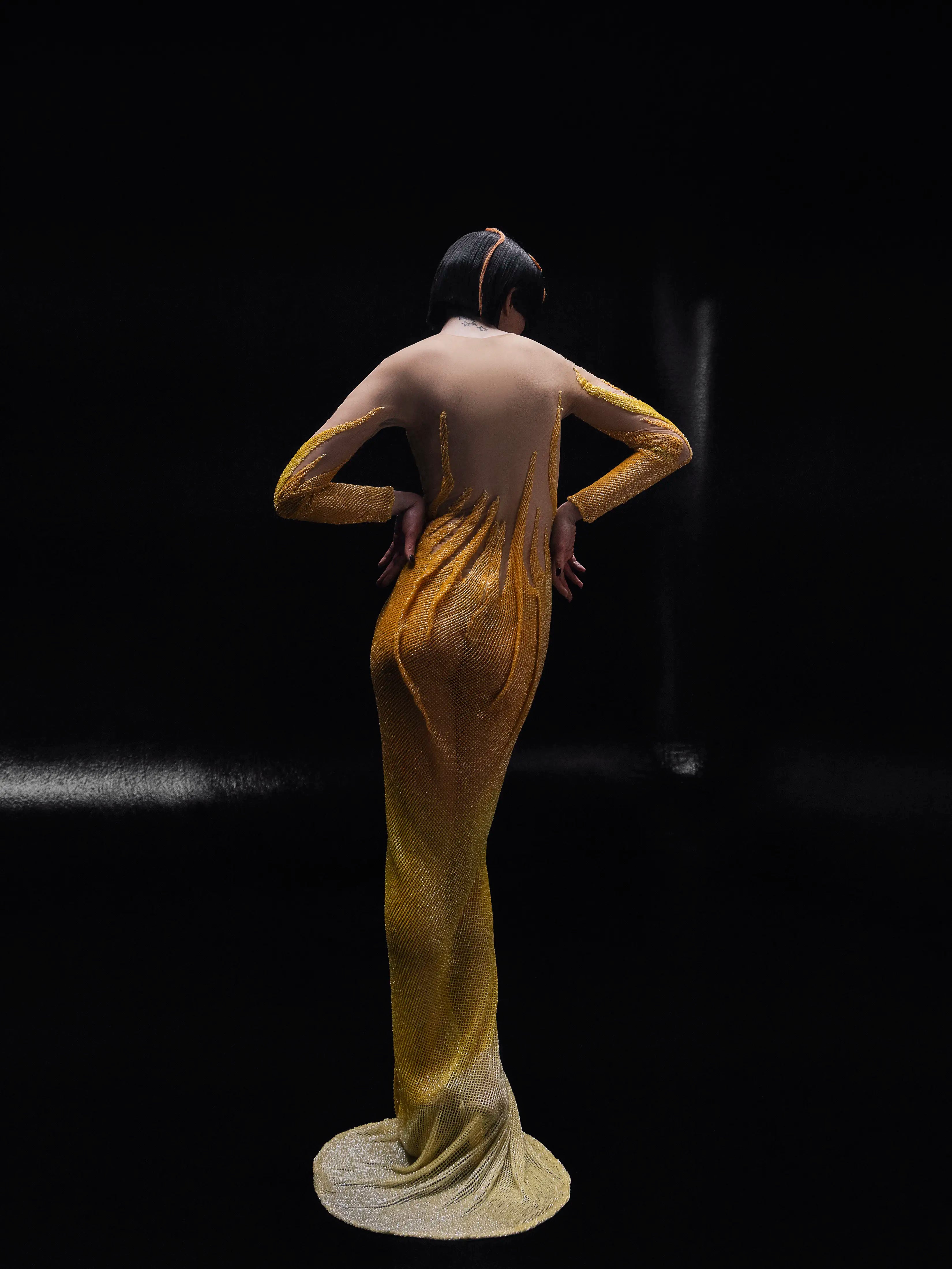- Gradient gold beading flowing from the neckline into fiery patterns
