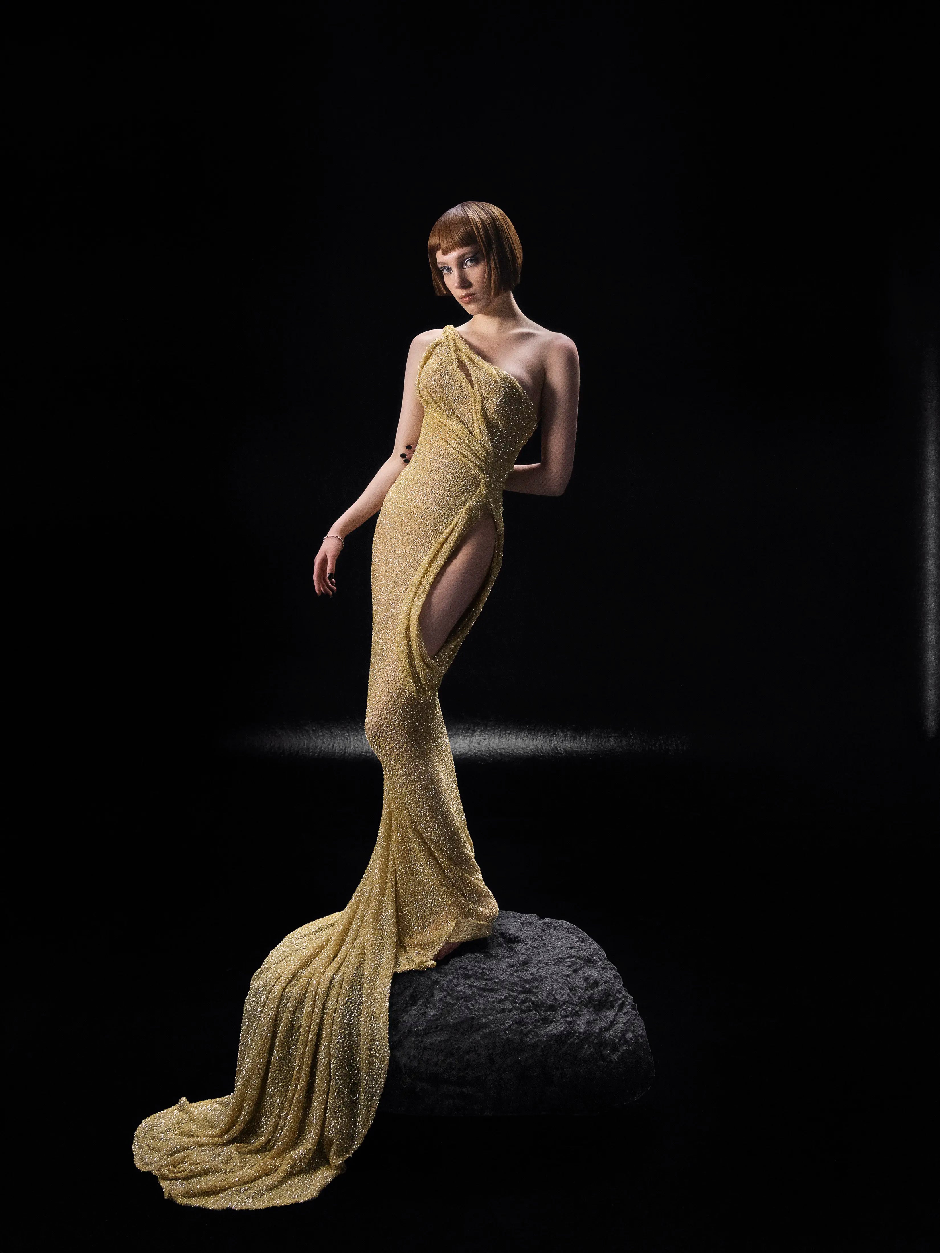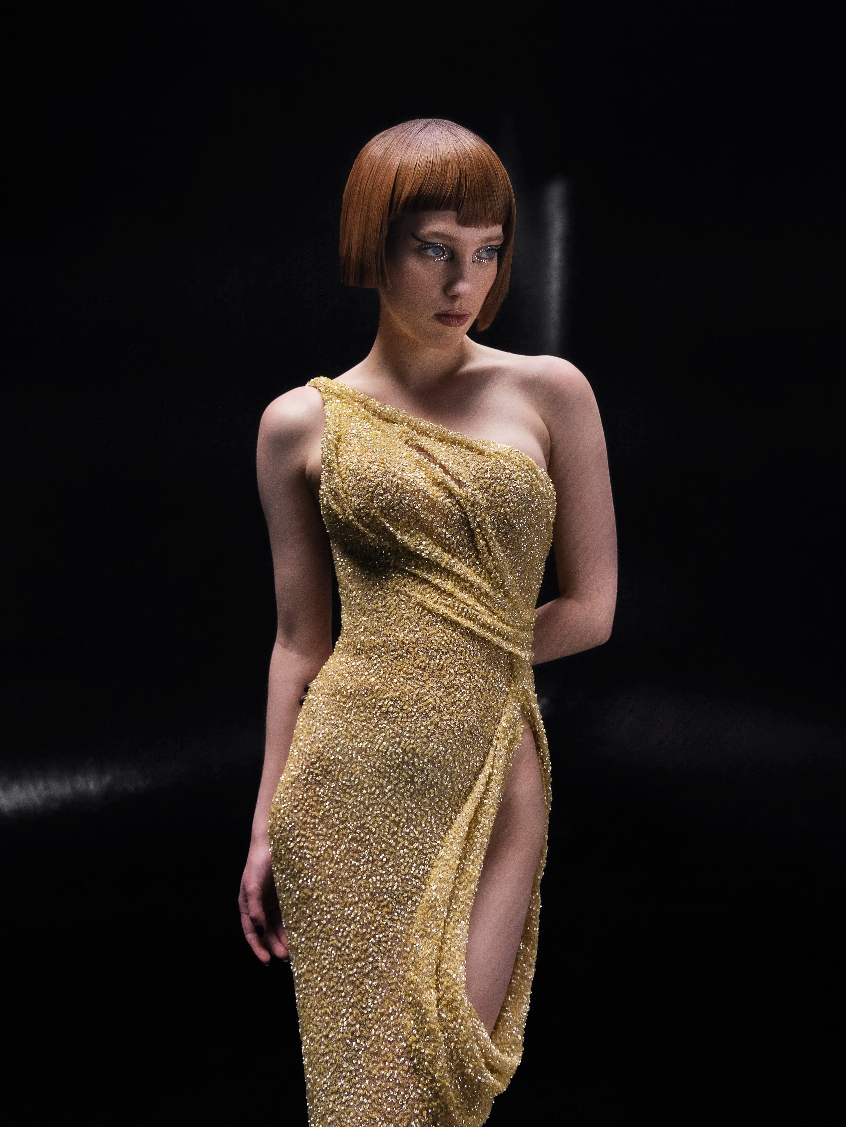 - Fitted silhouette in shimmering gold textured fabric