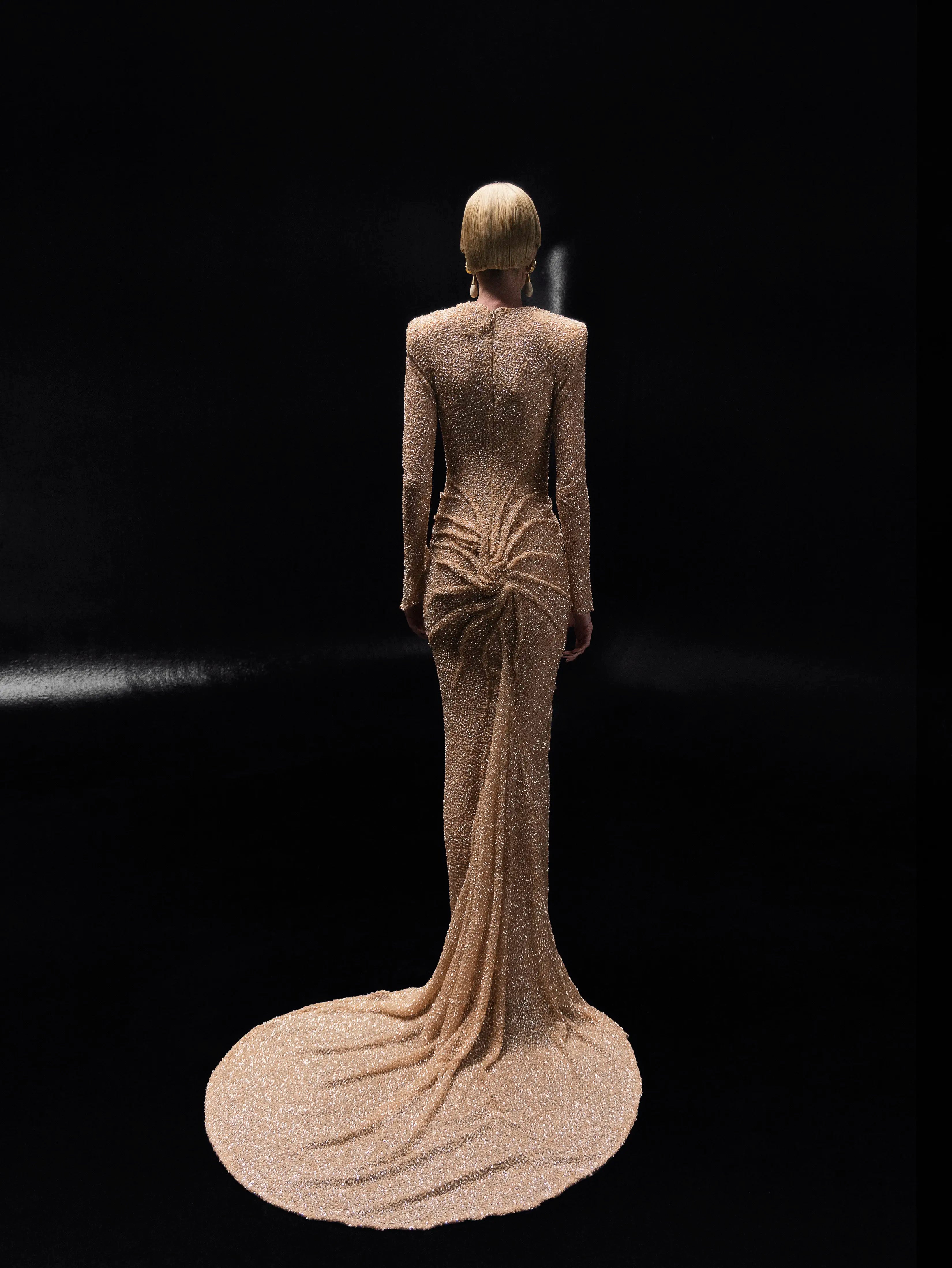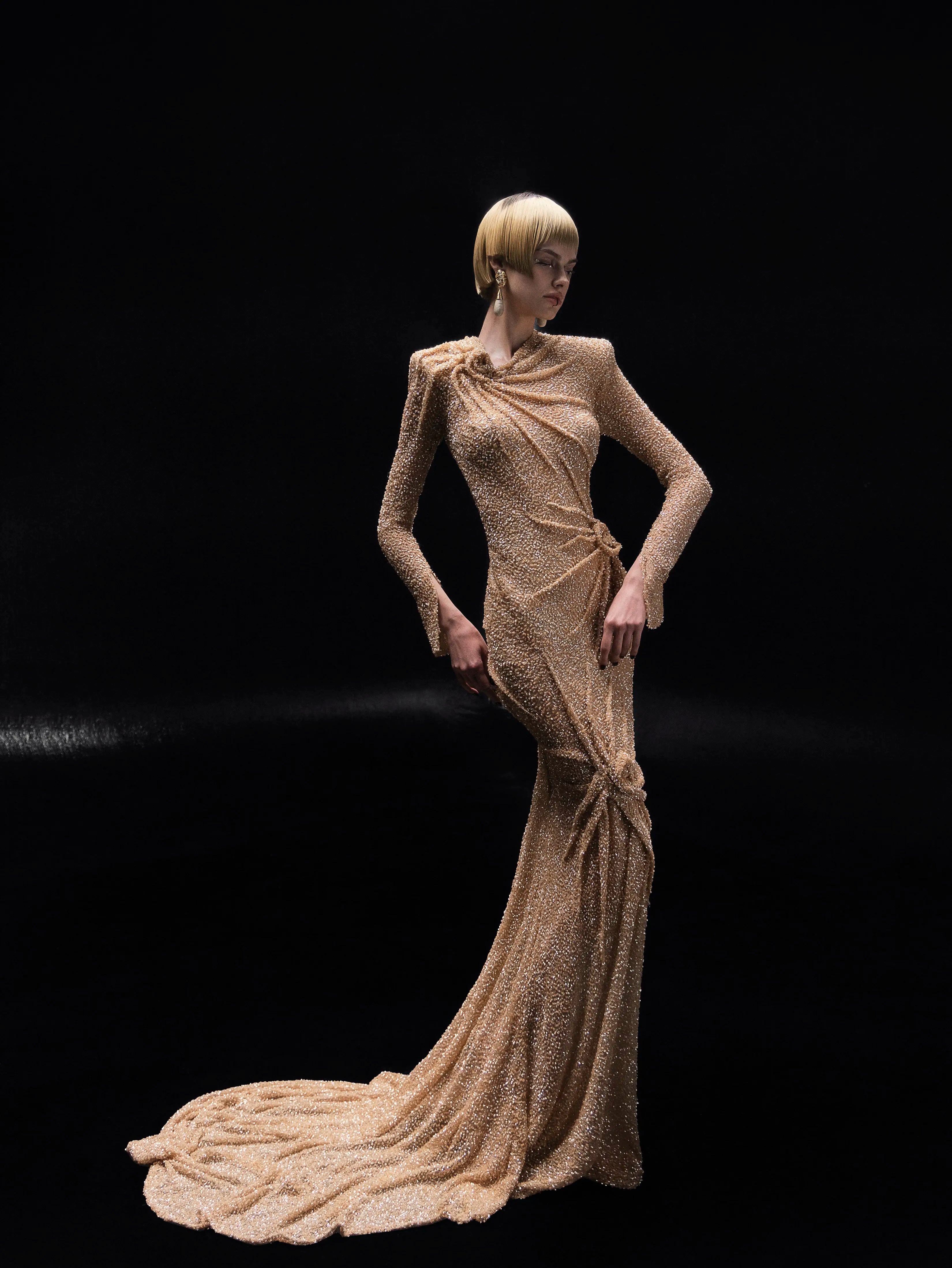 - Artistic knot details at the hip and lower skirt for a sculpted effect