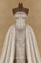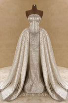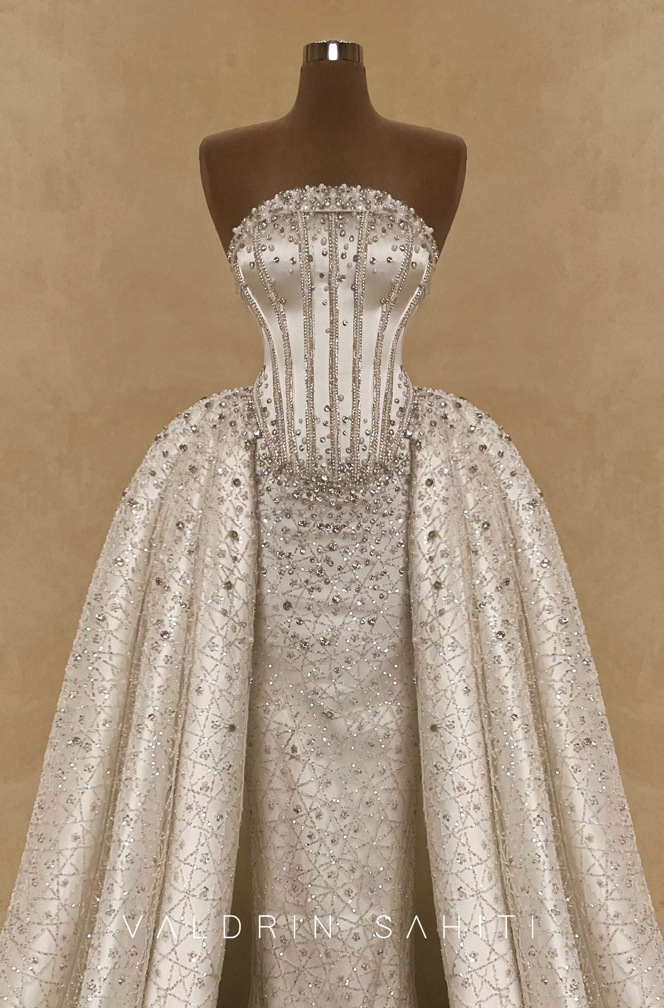 Model wearing a structured strapless bridal gown featuring a crystal-embroidered corset bodice and voluminous overskirt. The dress is fully hand-embellished with geometric beading and sequin motifs, offering an architectural silhouette that blends elegance with opulence — a signature Valdrin Sahiti couture creation.