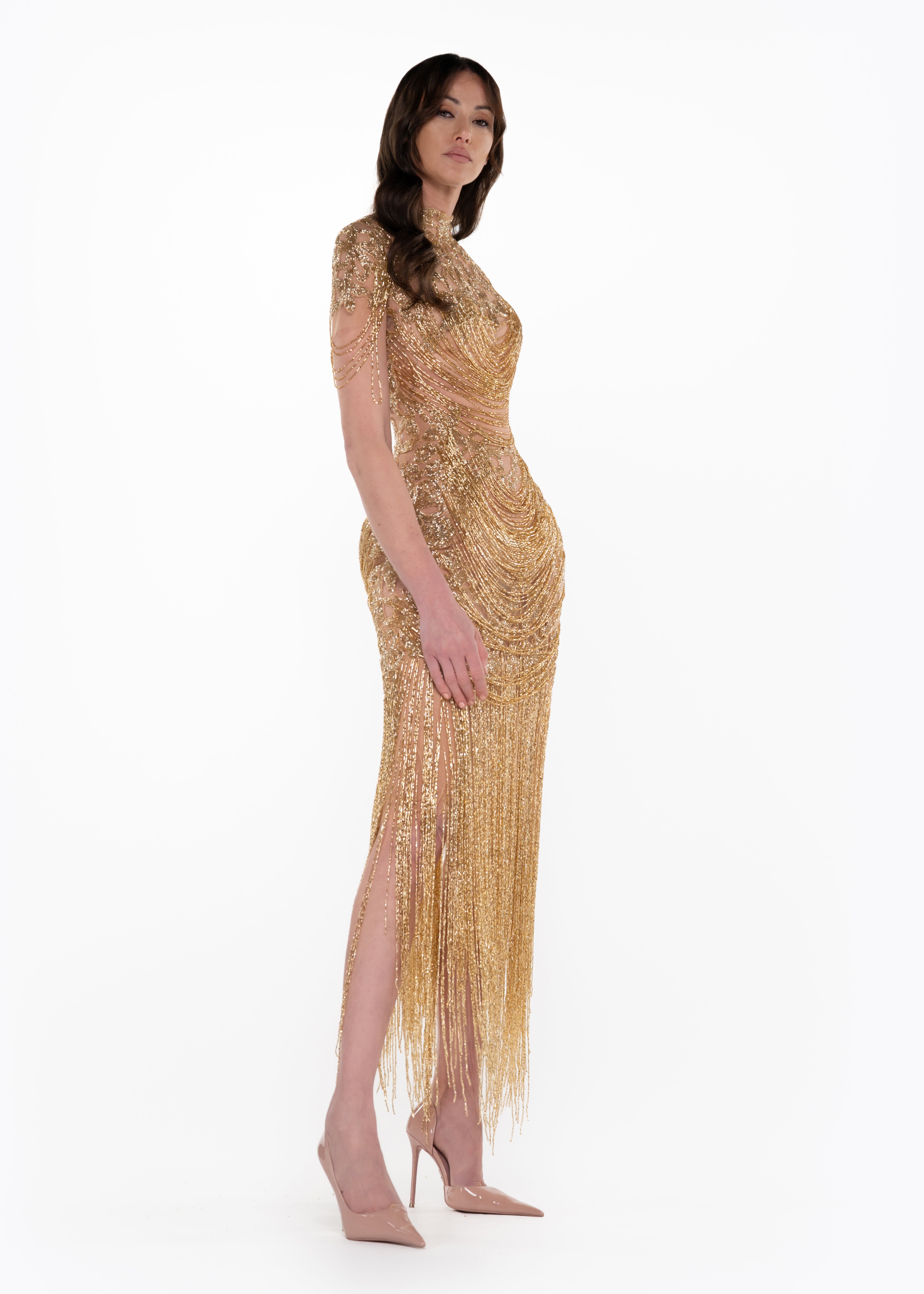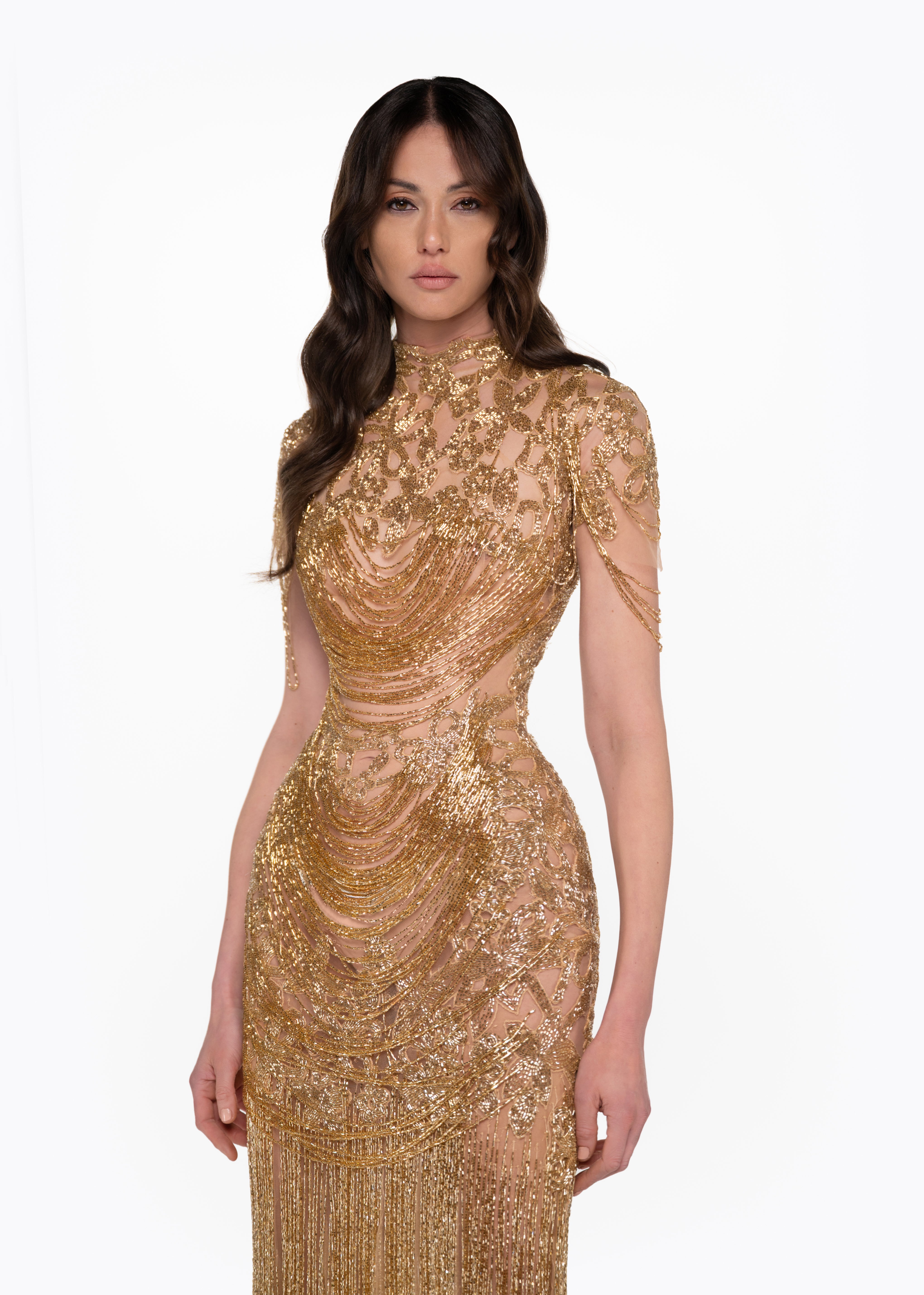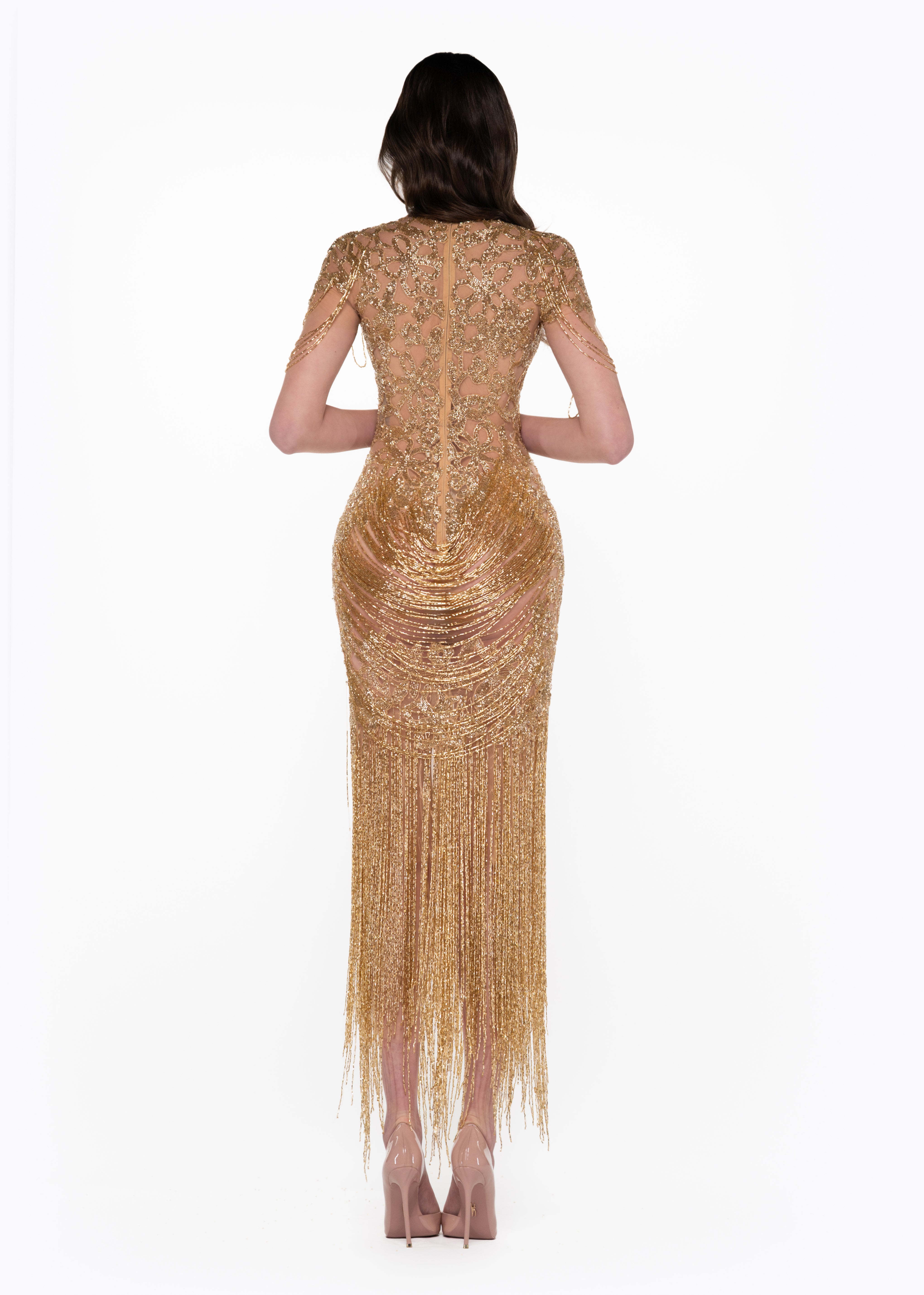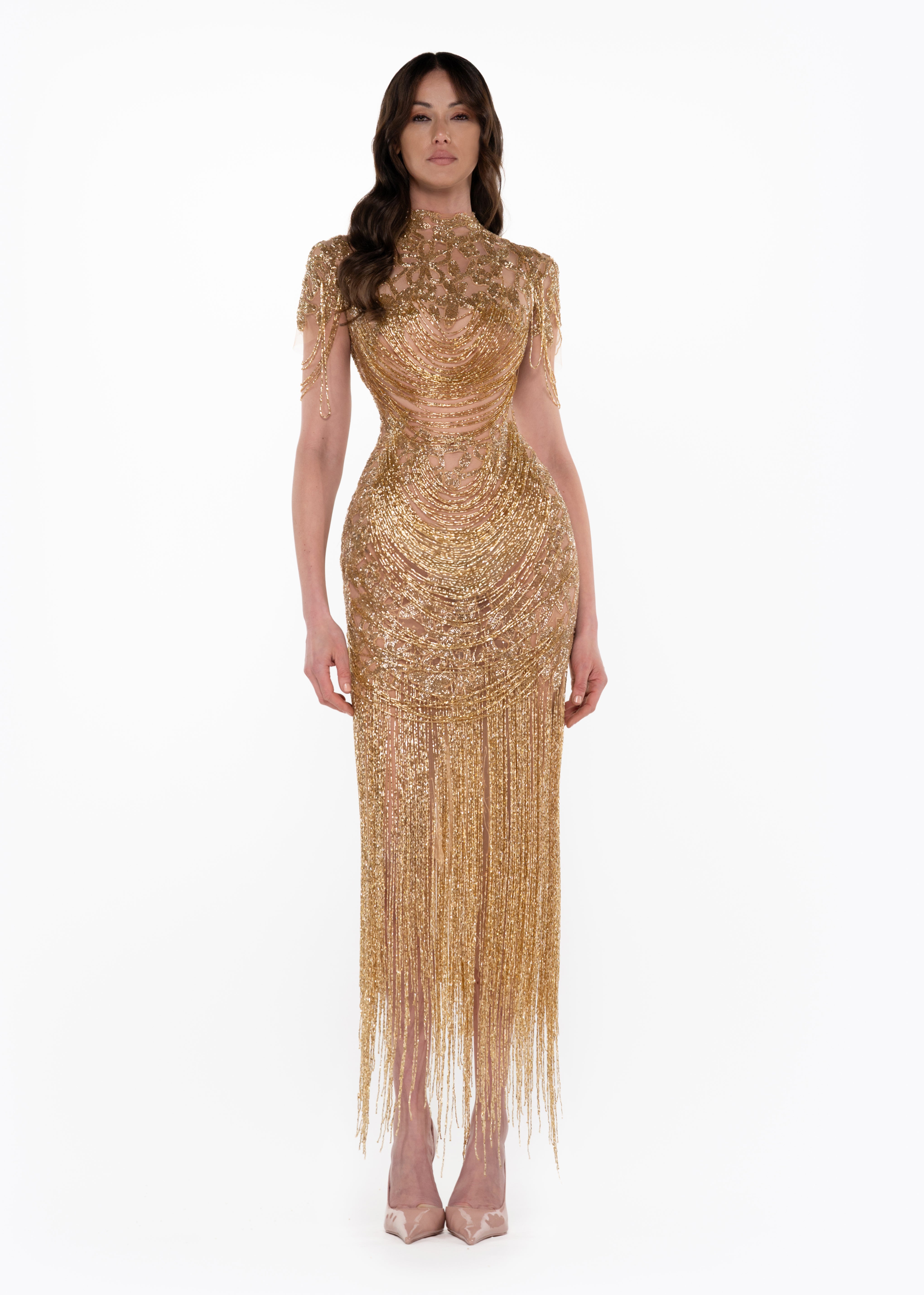 - Sheer nude mesh base with intricate gold beadwork