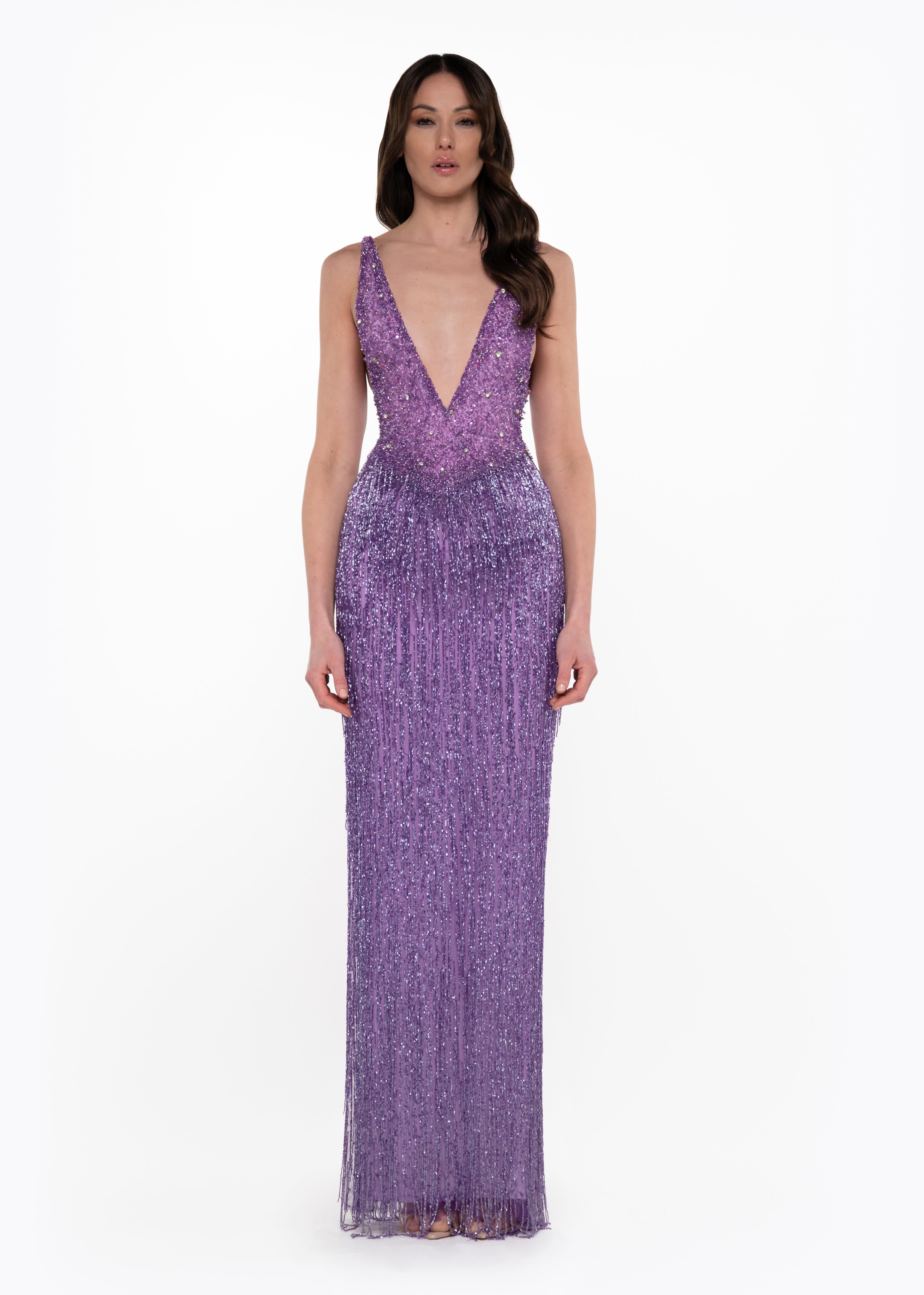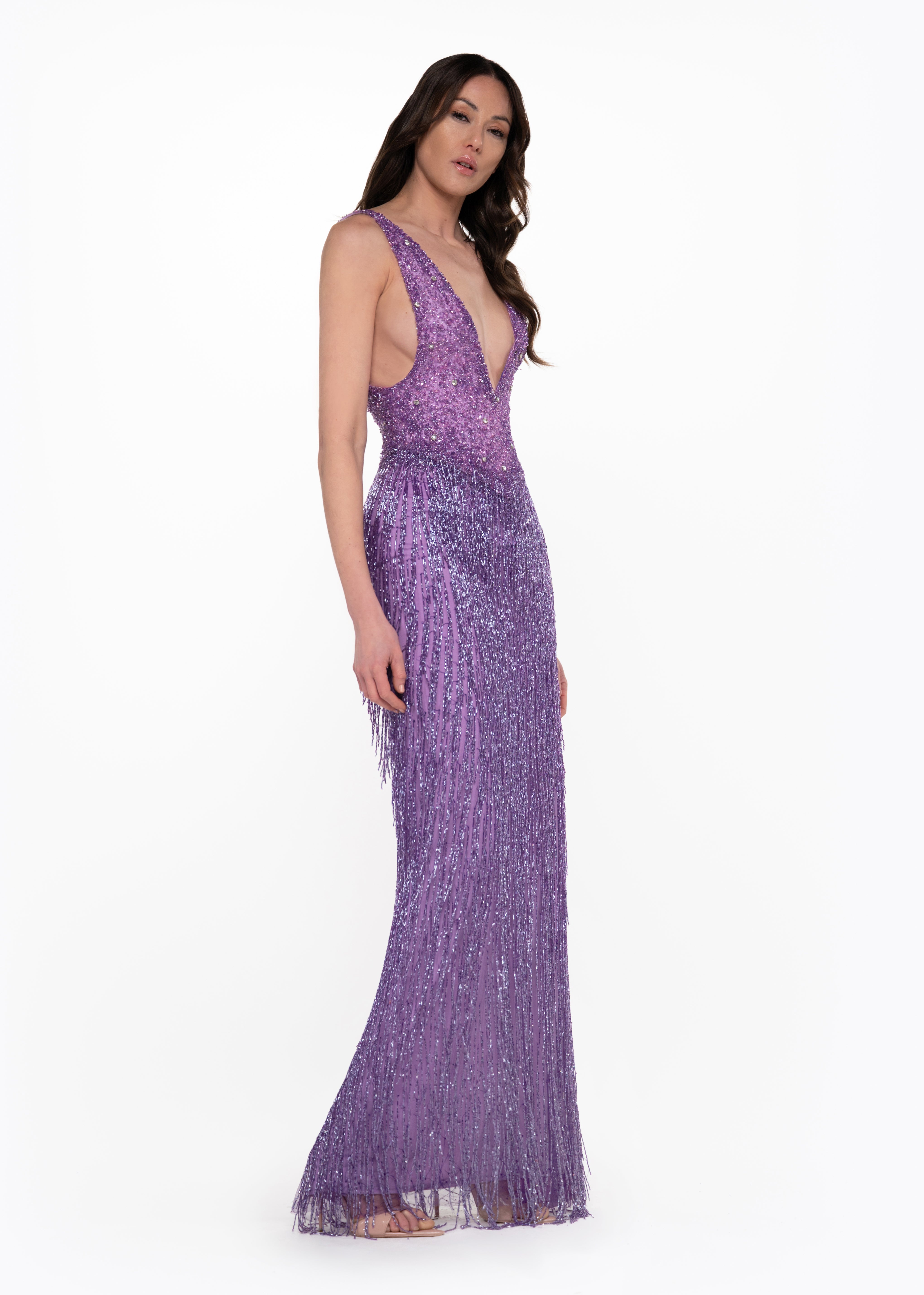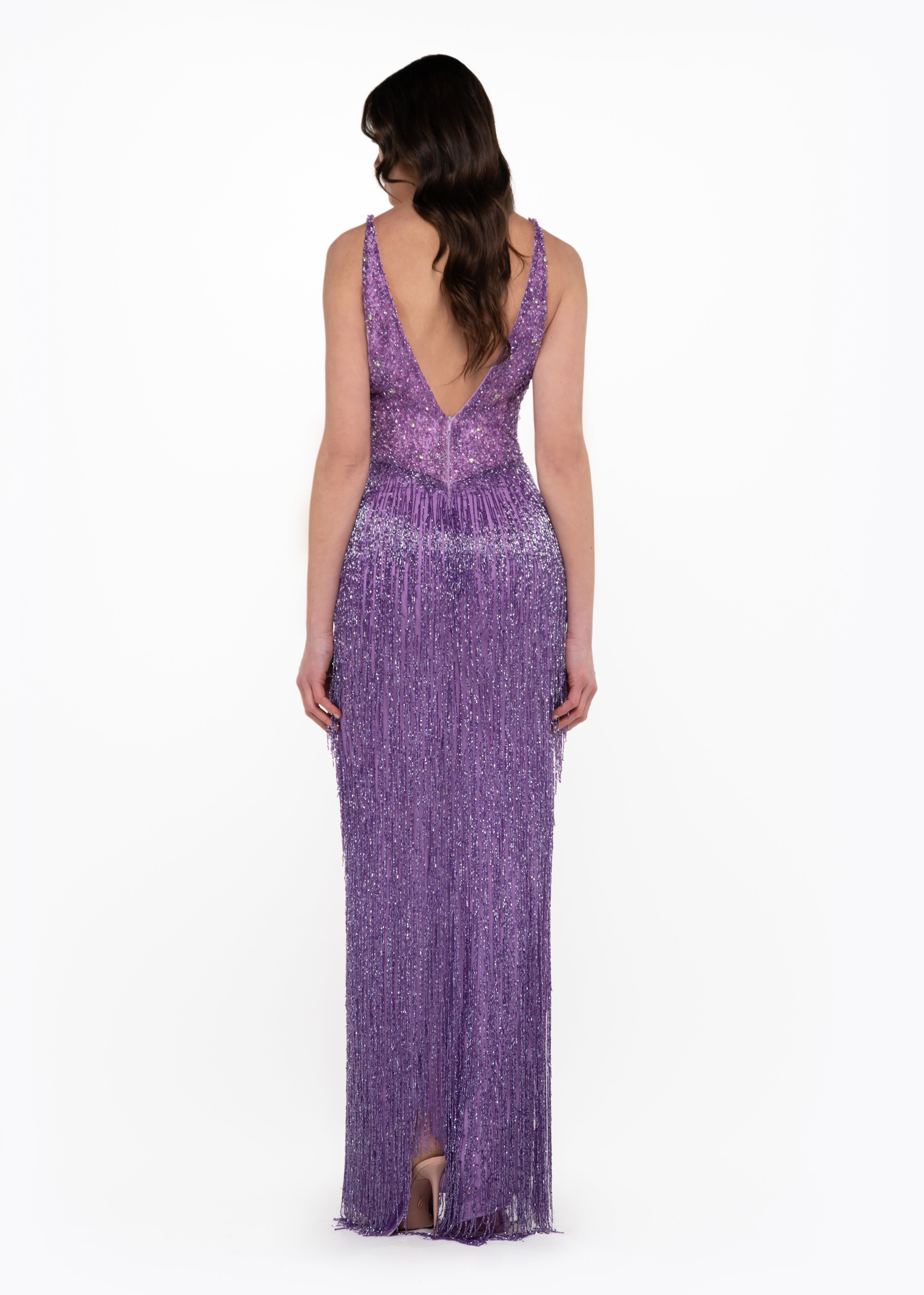 • Gradient beadwork transitioning into fringe