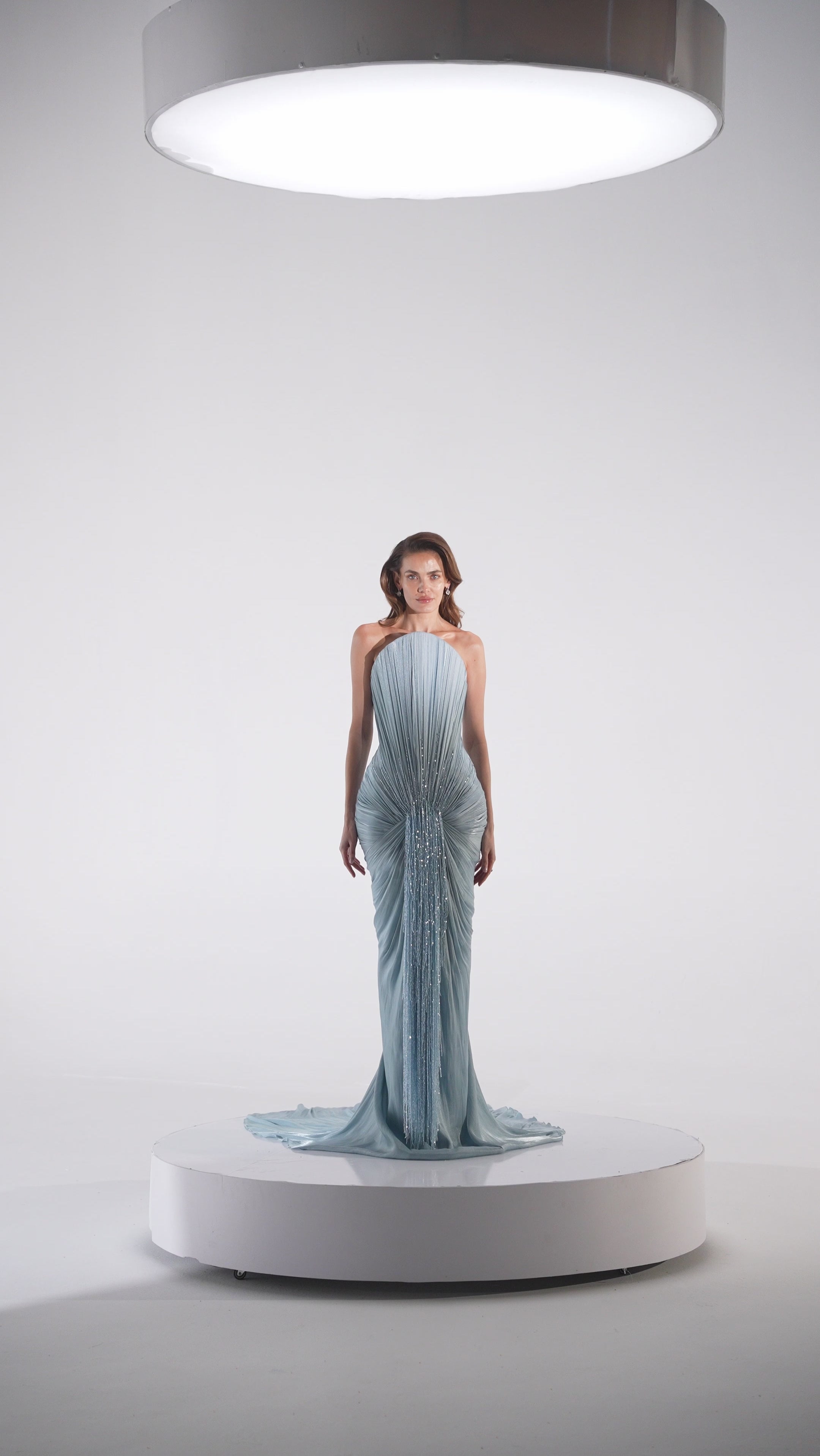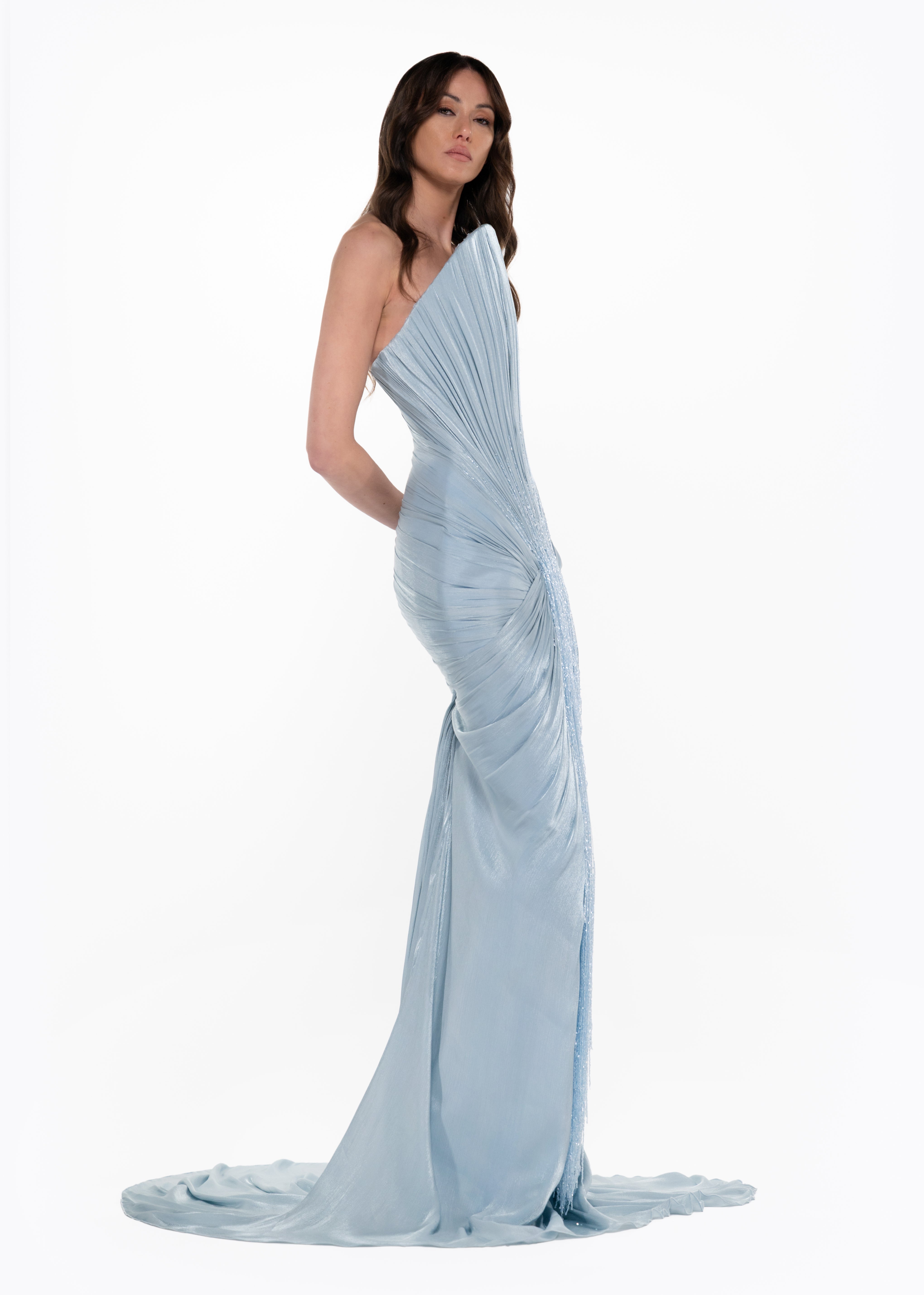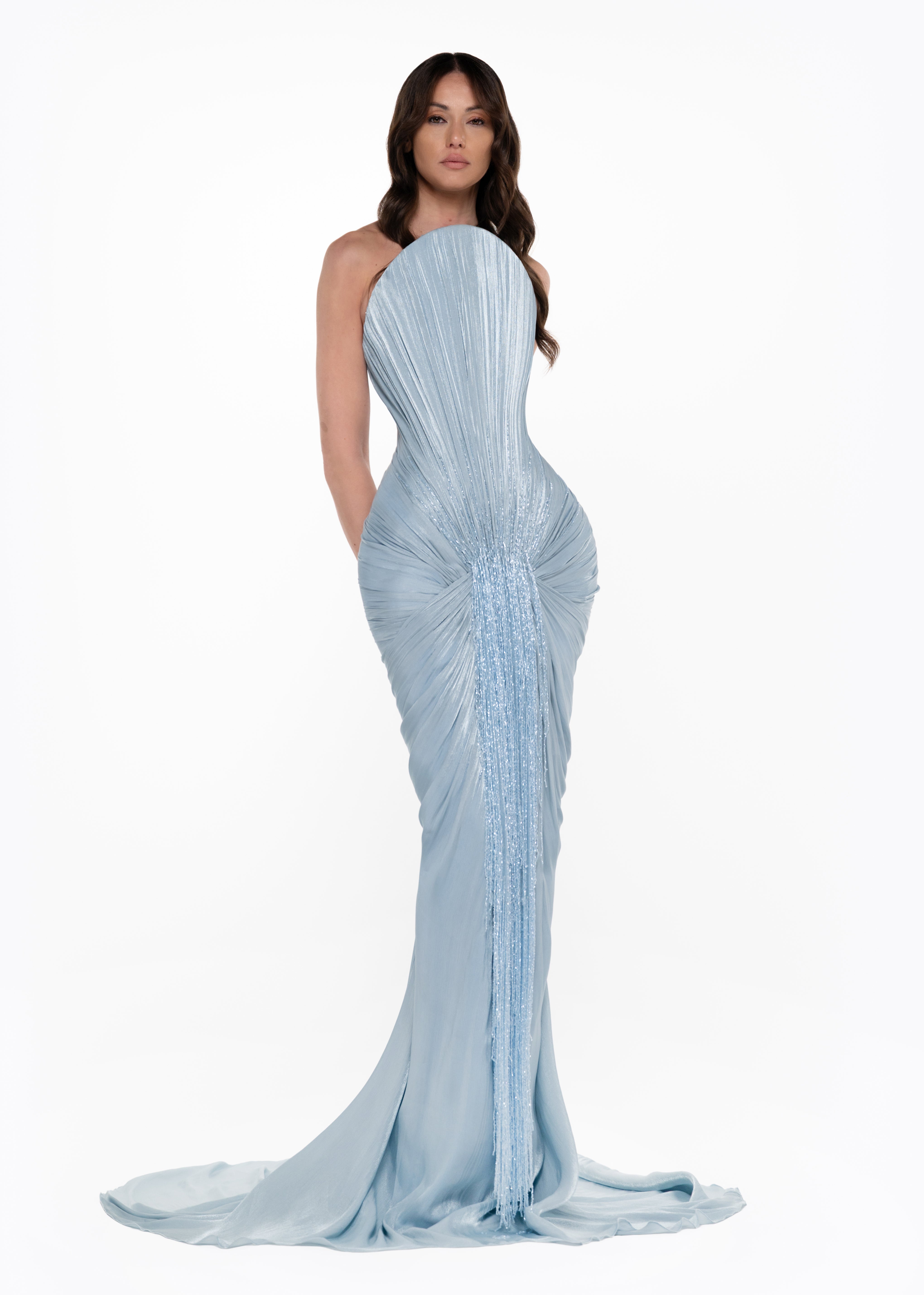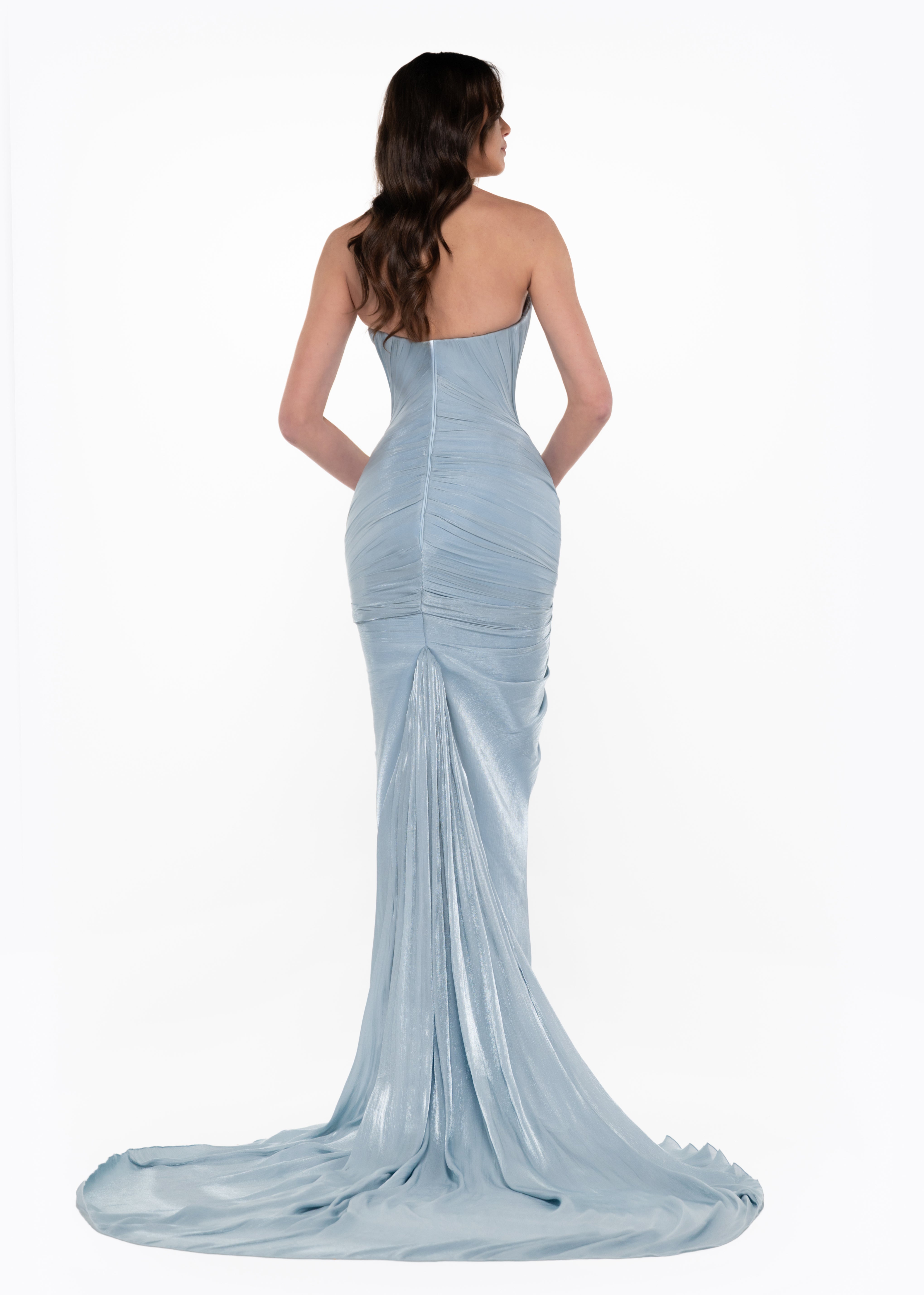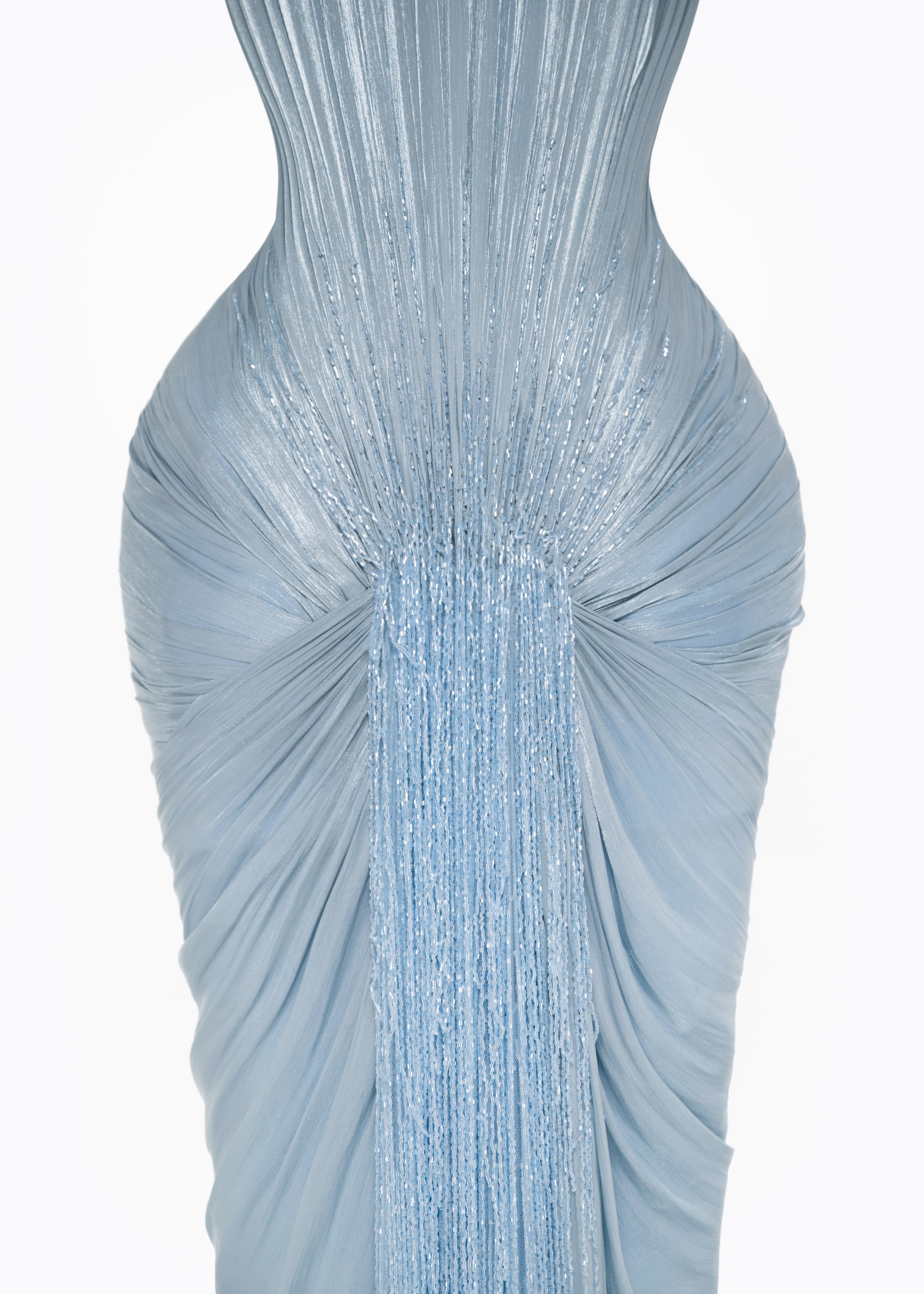 - Vertical pleated draping across bodice