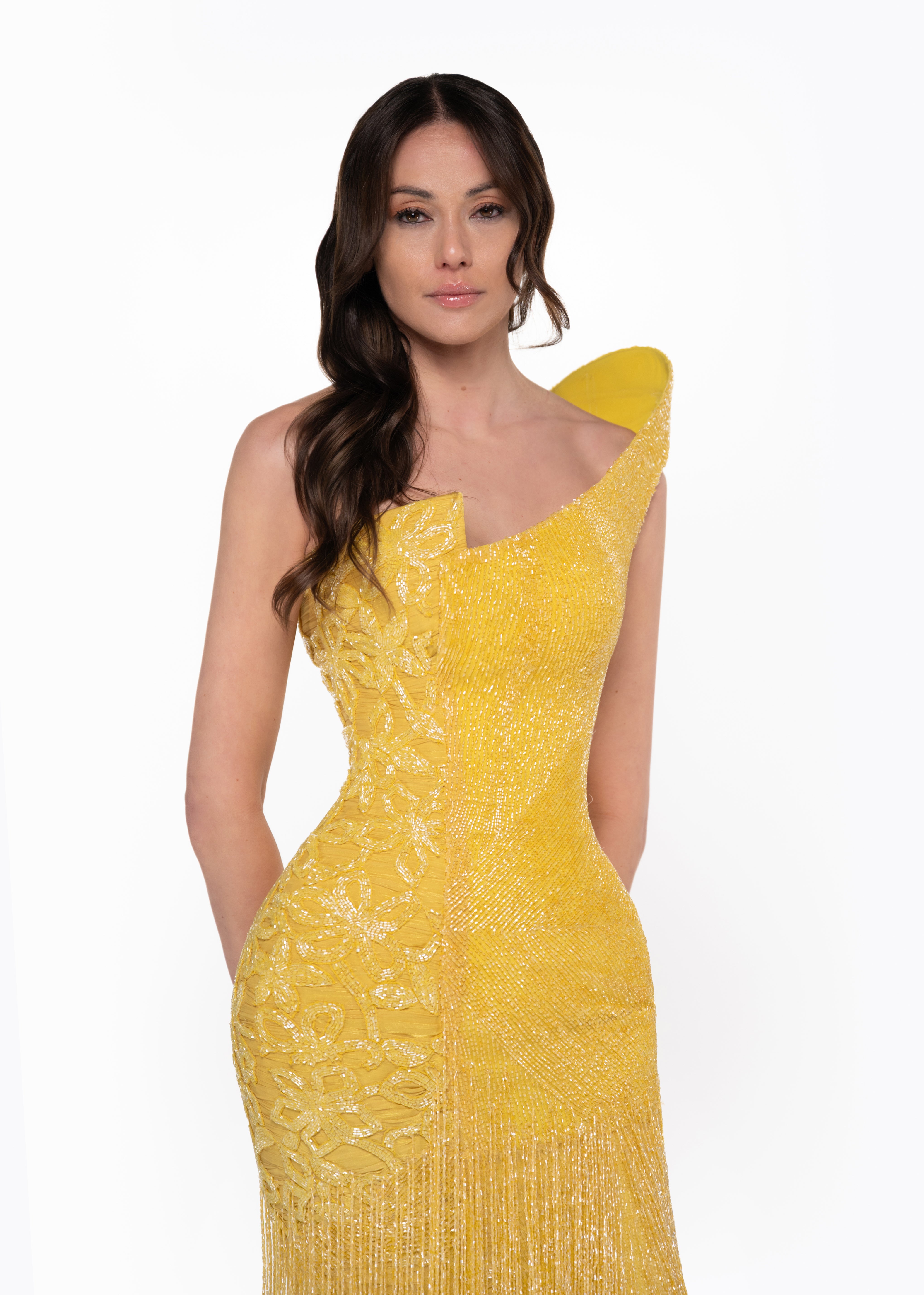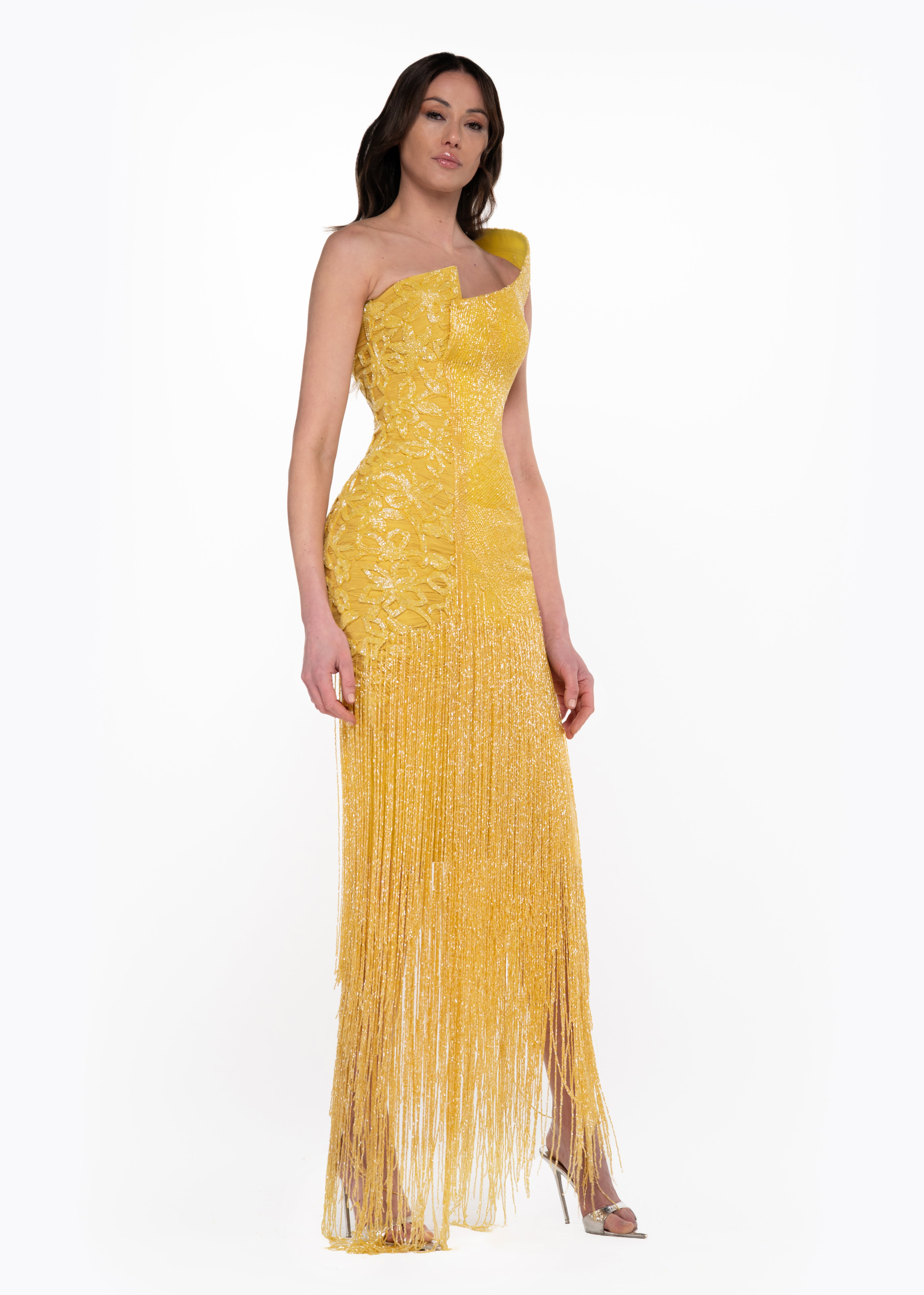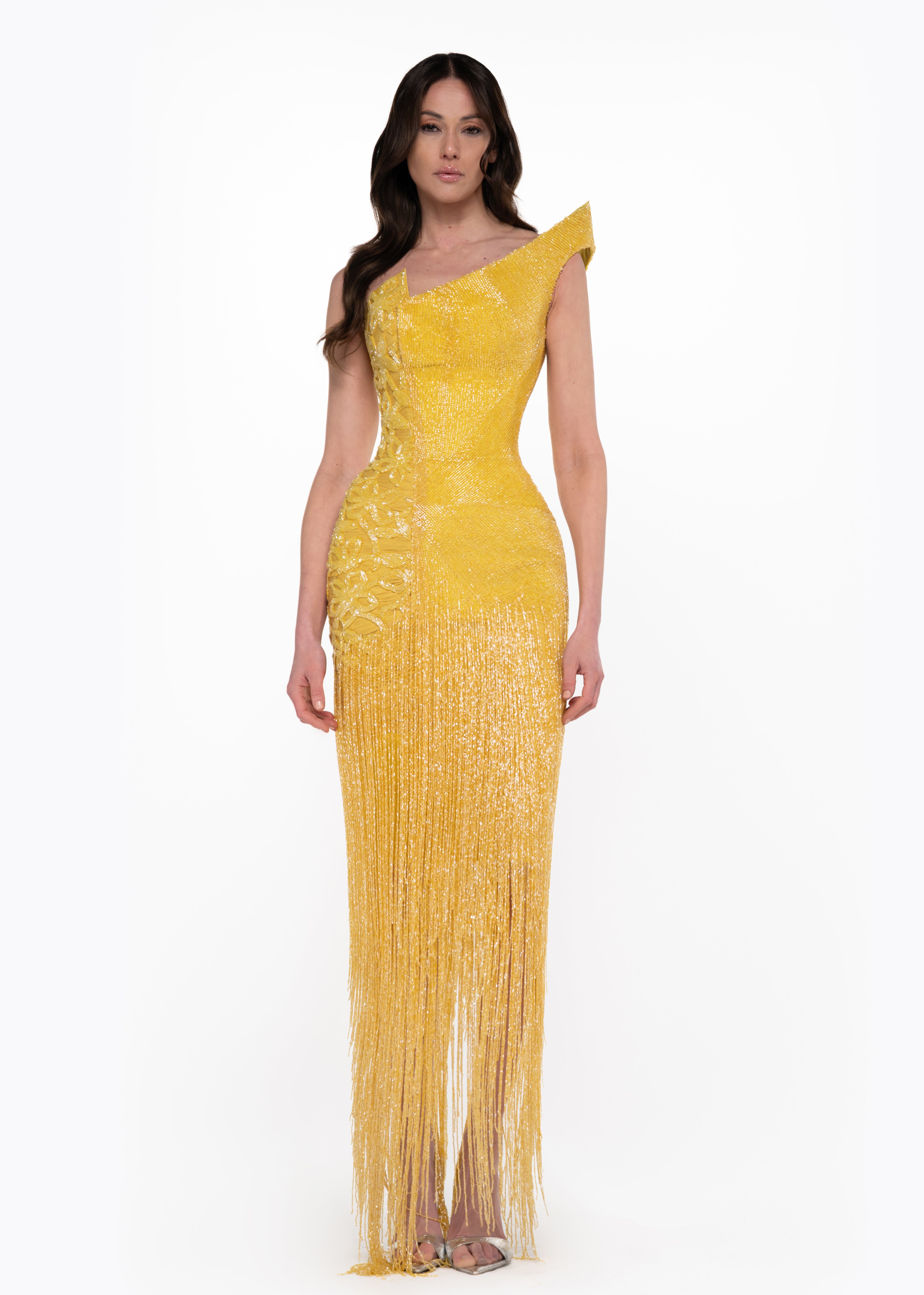 • Dramatic floor length crystal fringe movement