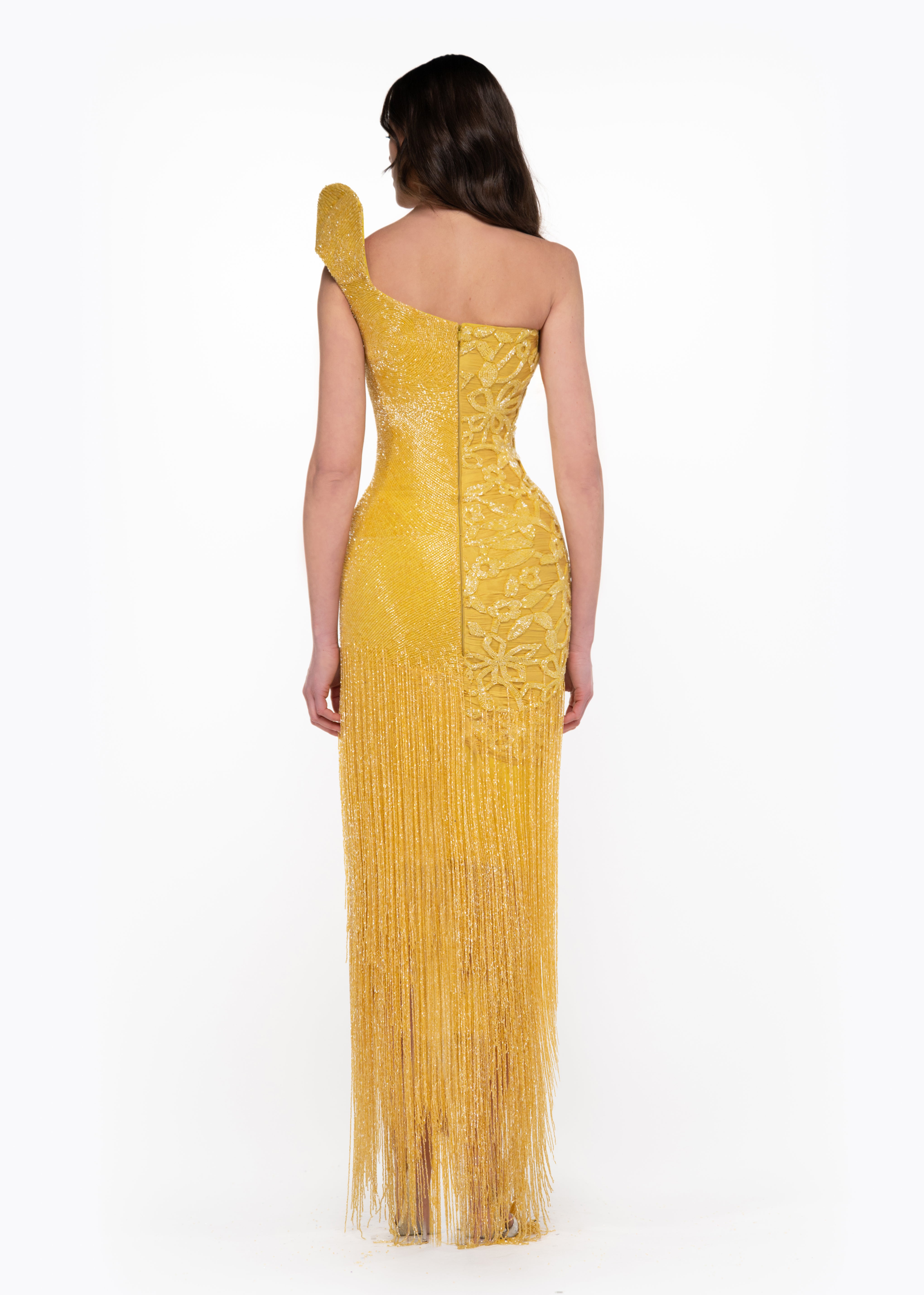 • Fully hand-embellished fringe skirt