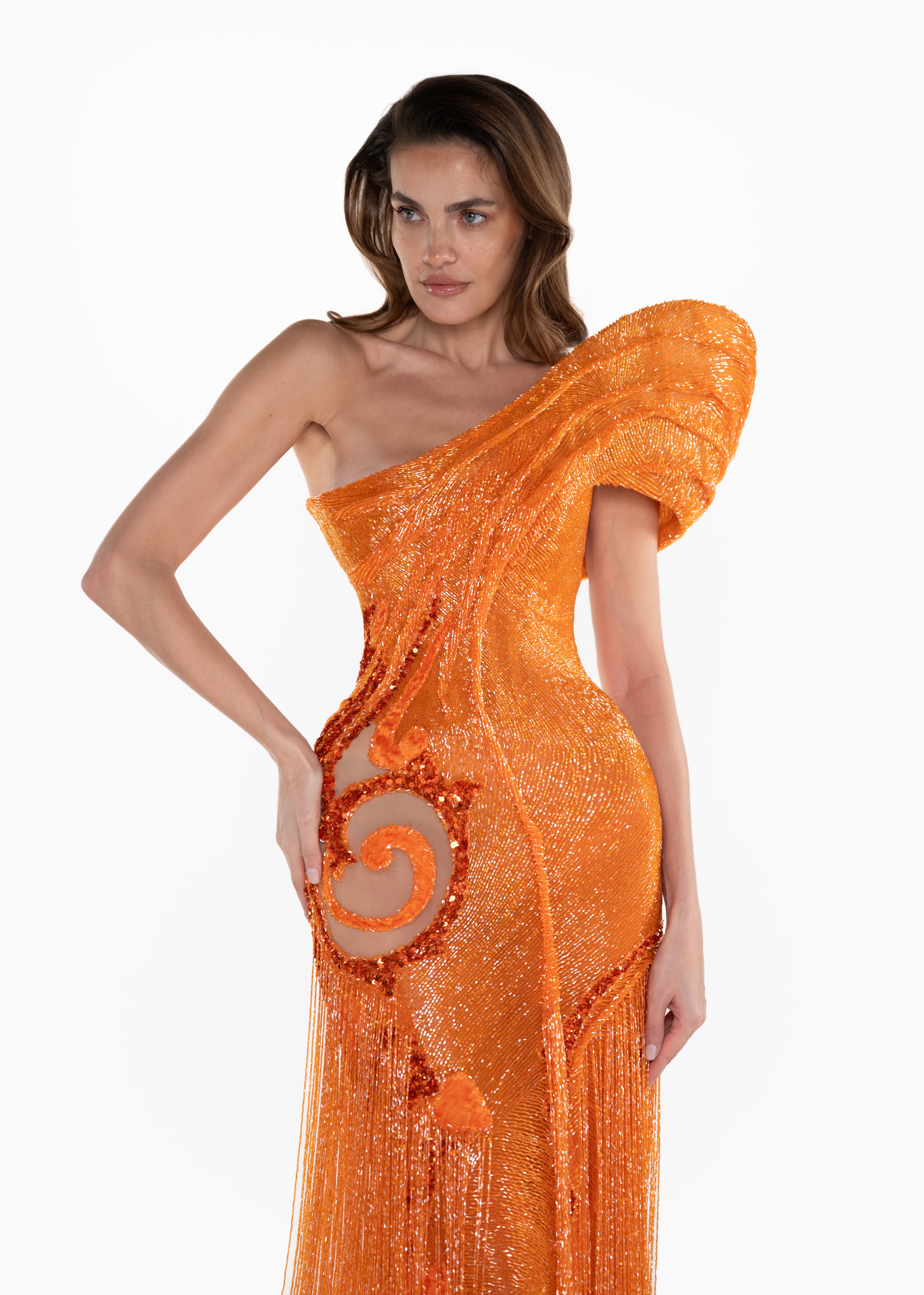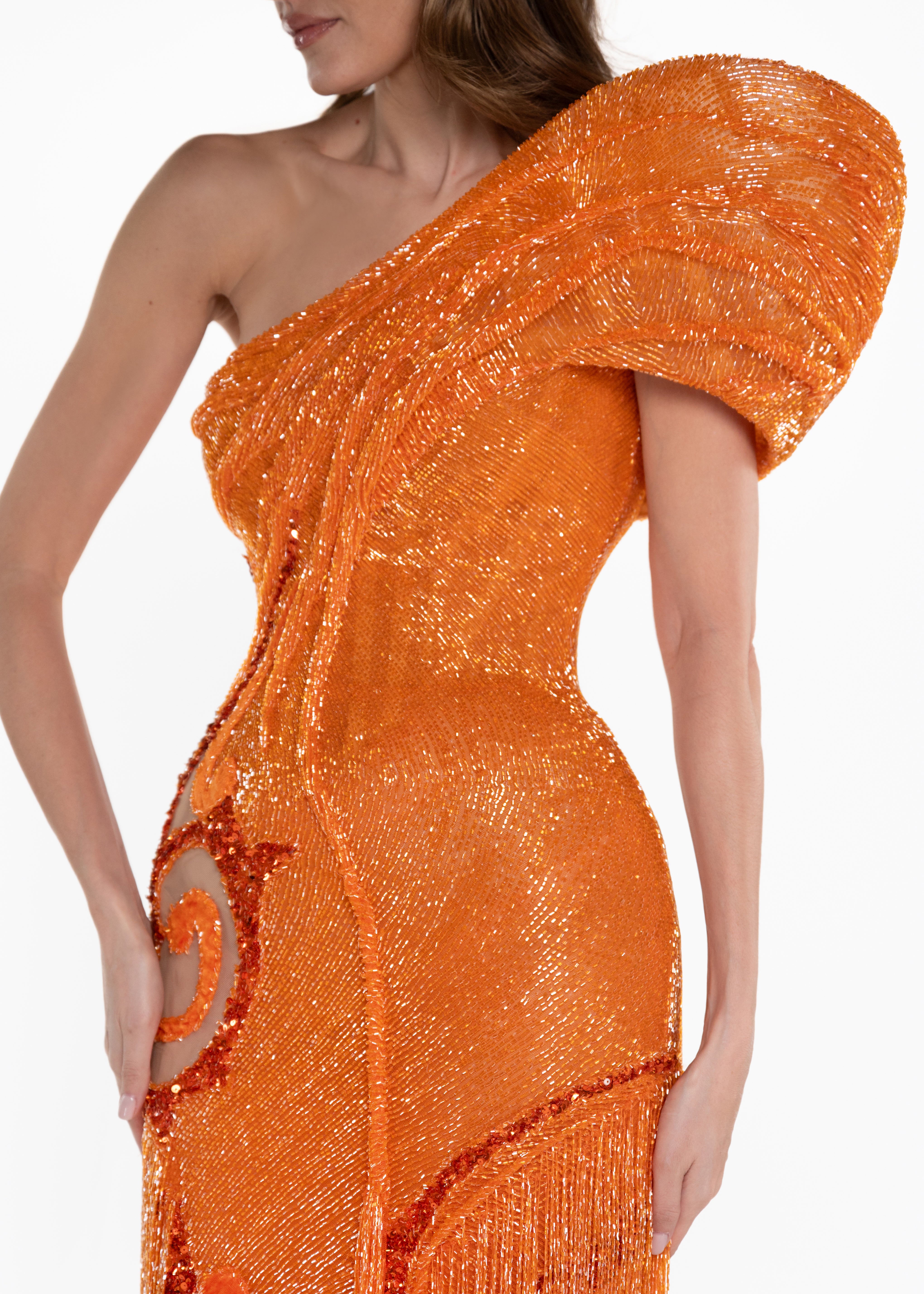 - Swirl bead embroidery motif at hip