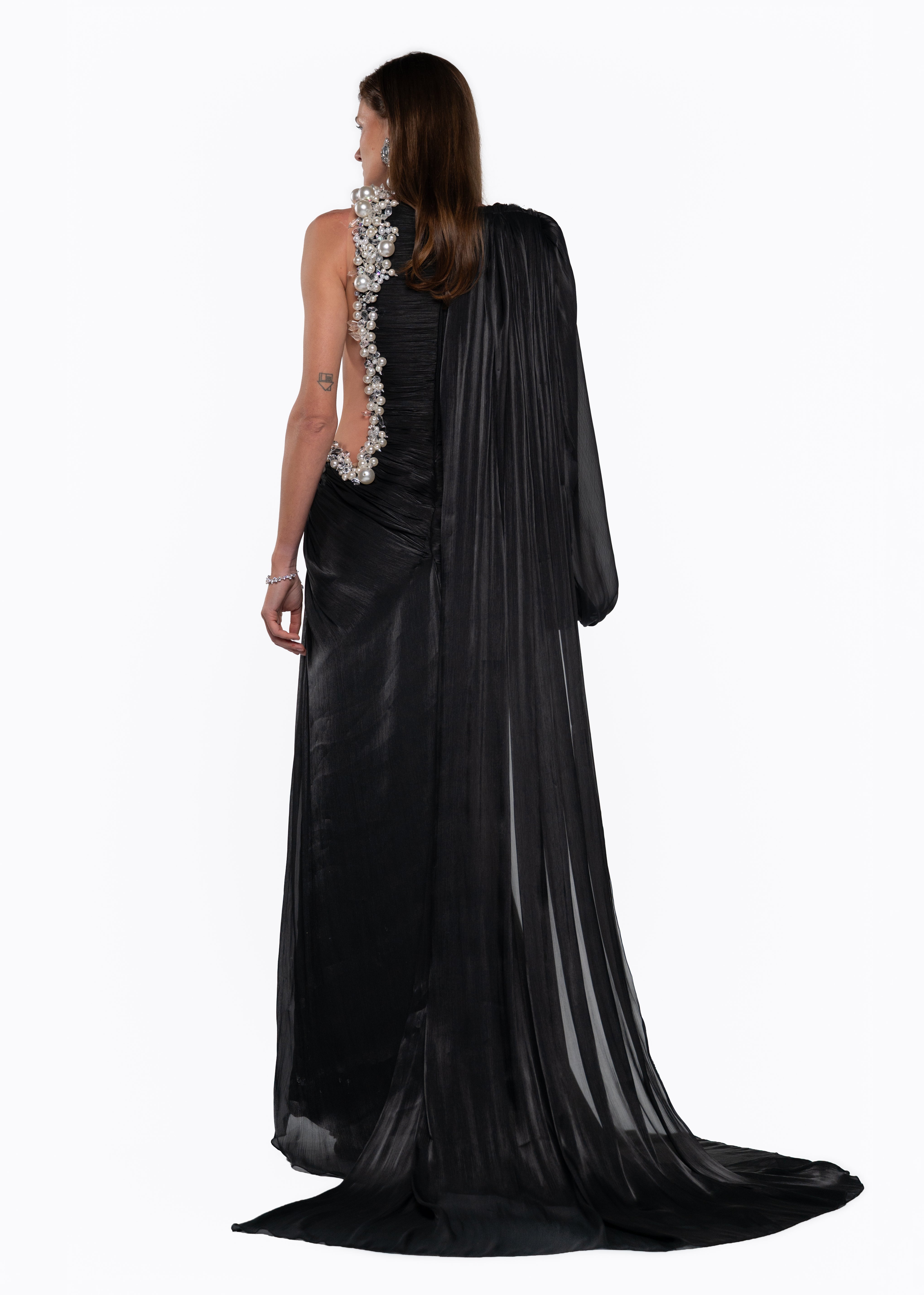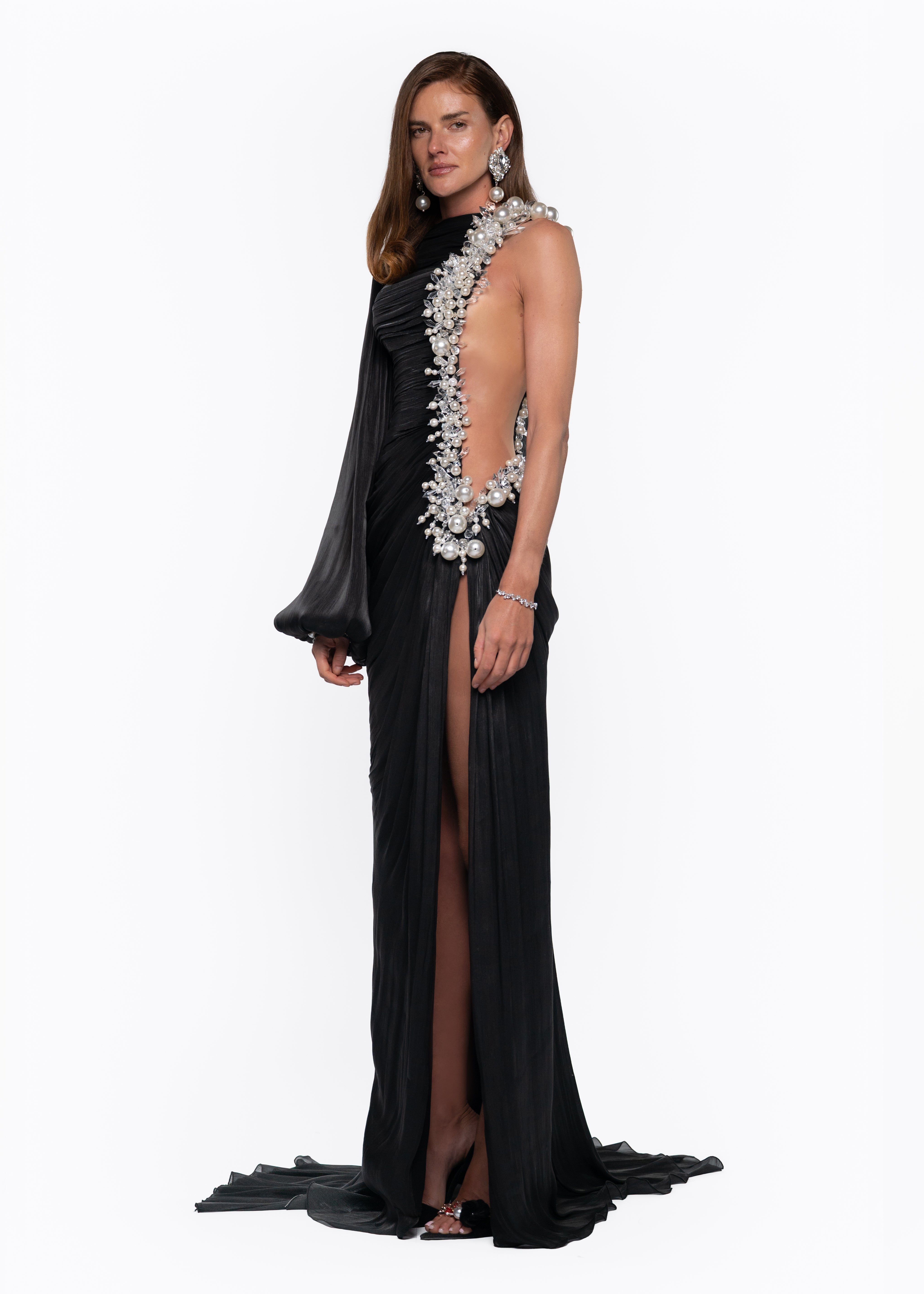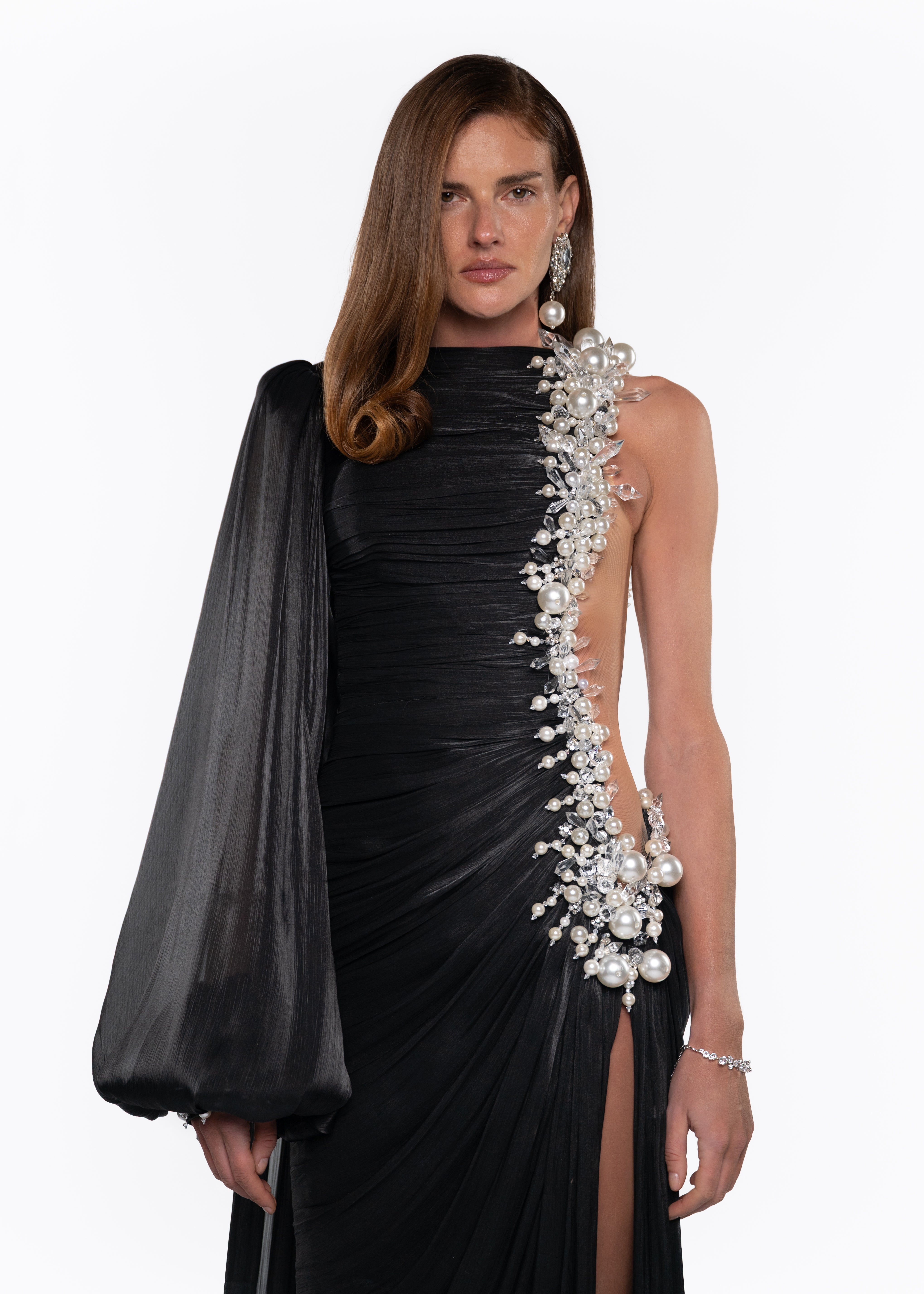A striking black evening gown featuring an asymmetrical silhouette with a dramatic single sleeve and a sculpted drape. The design is elevated by hand-embellished pearl detailing cascading along the bodice, adding refined glamour and couture elegance. A high slit enhances movement and sensuality, making this look a bold statement of modern sophistication and timeless luxury.