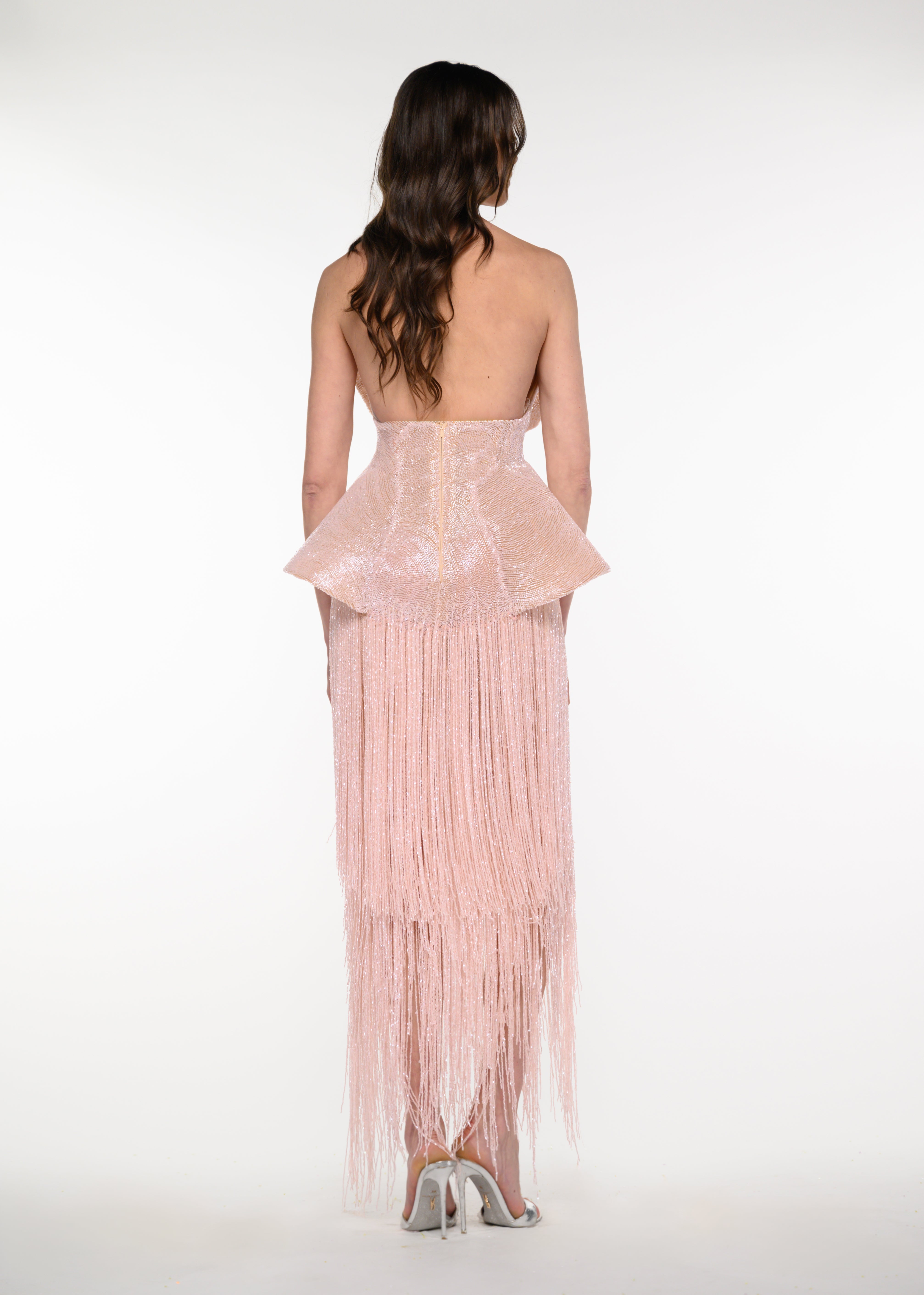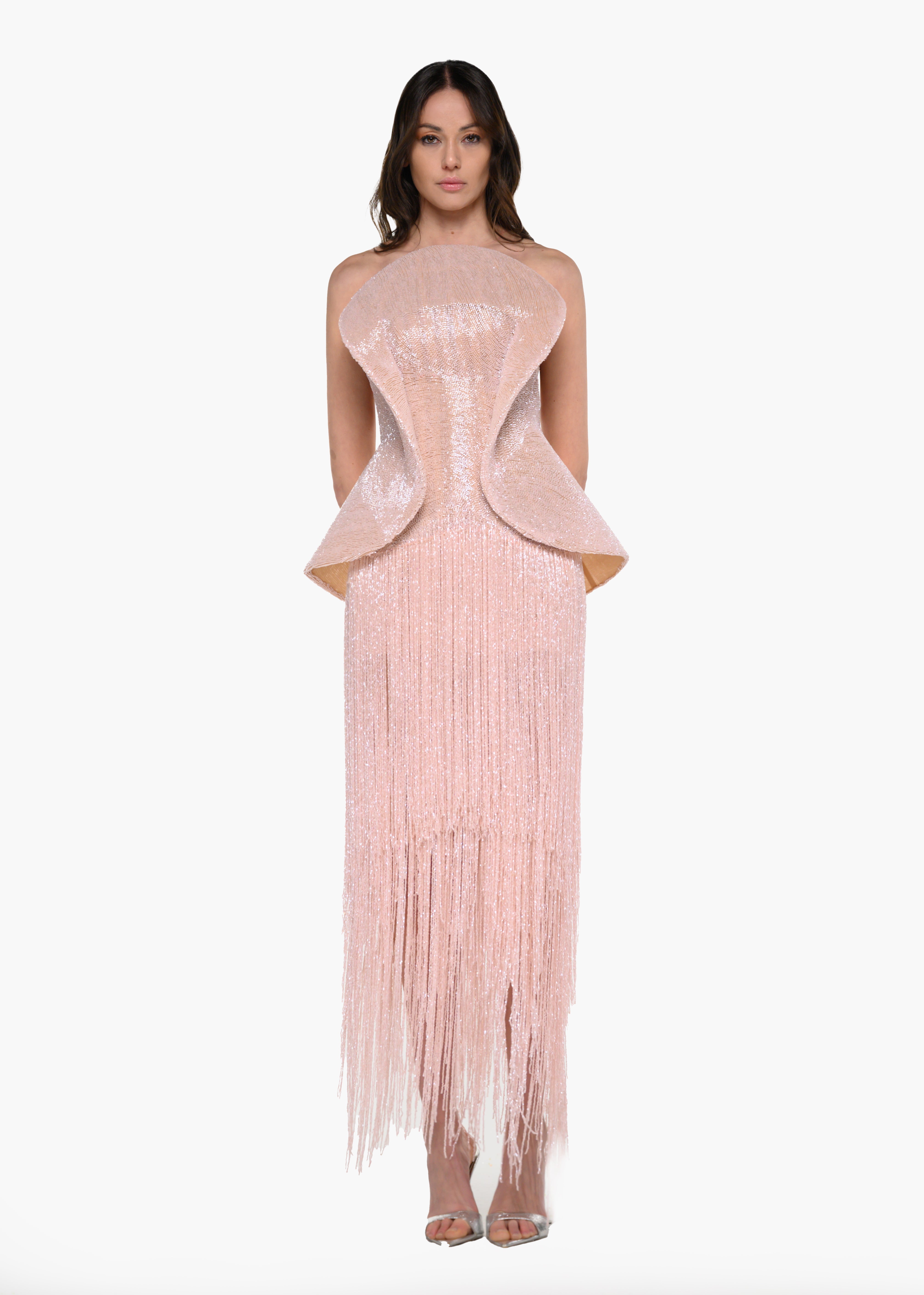 • Strapless neckline with sculpted, architectural bodice