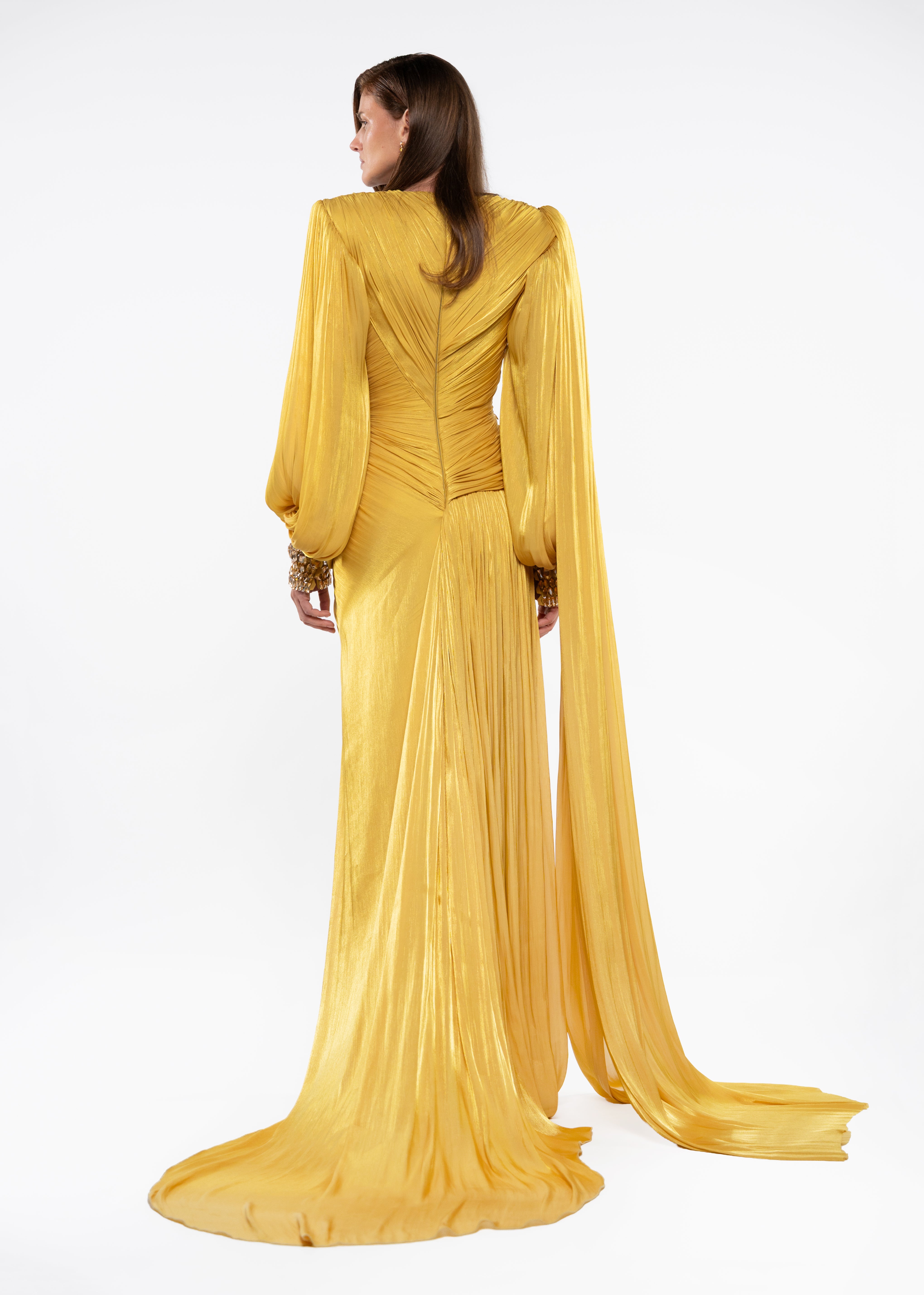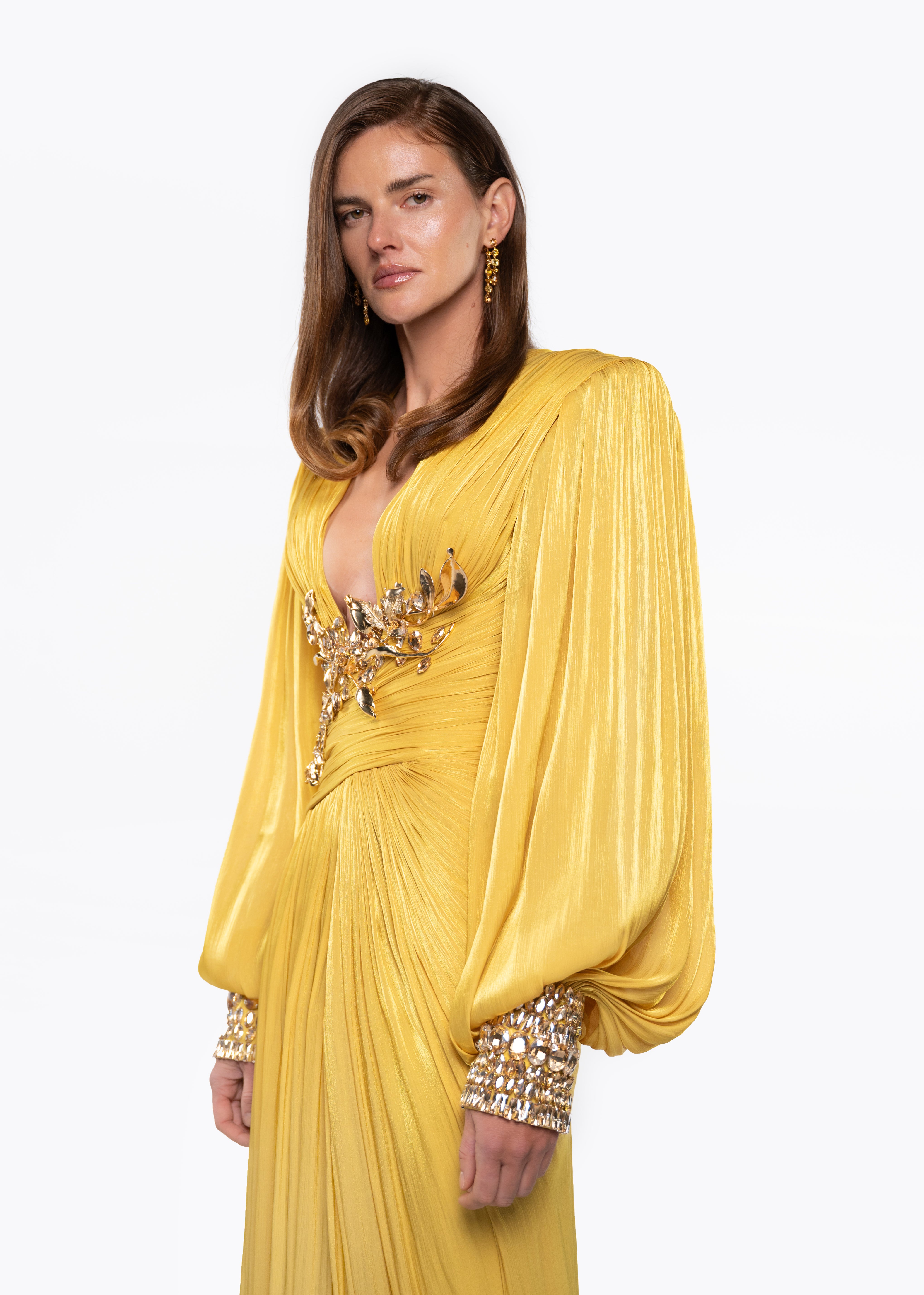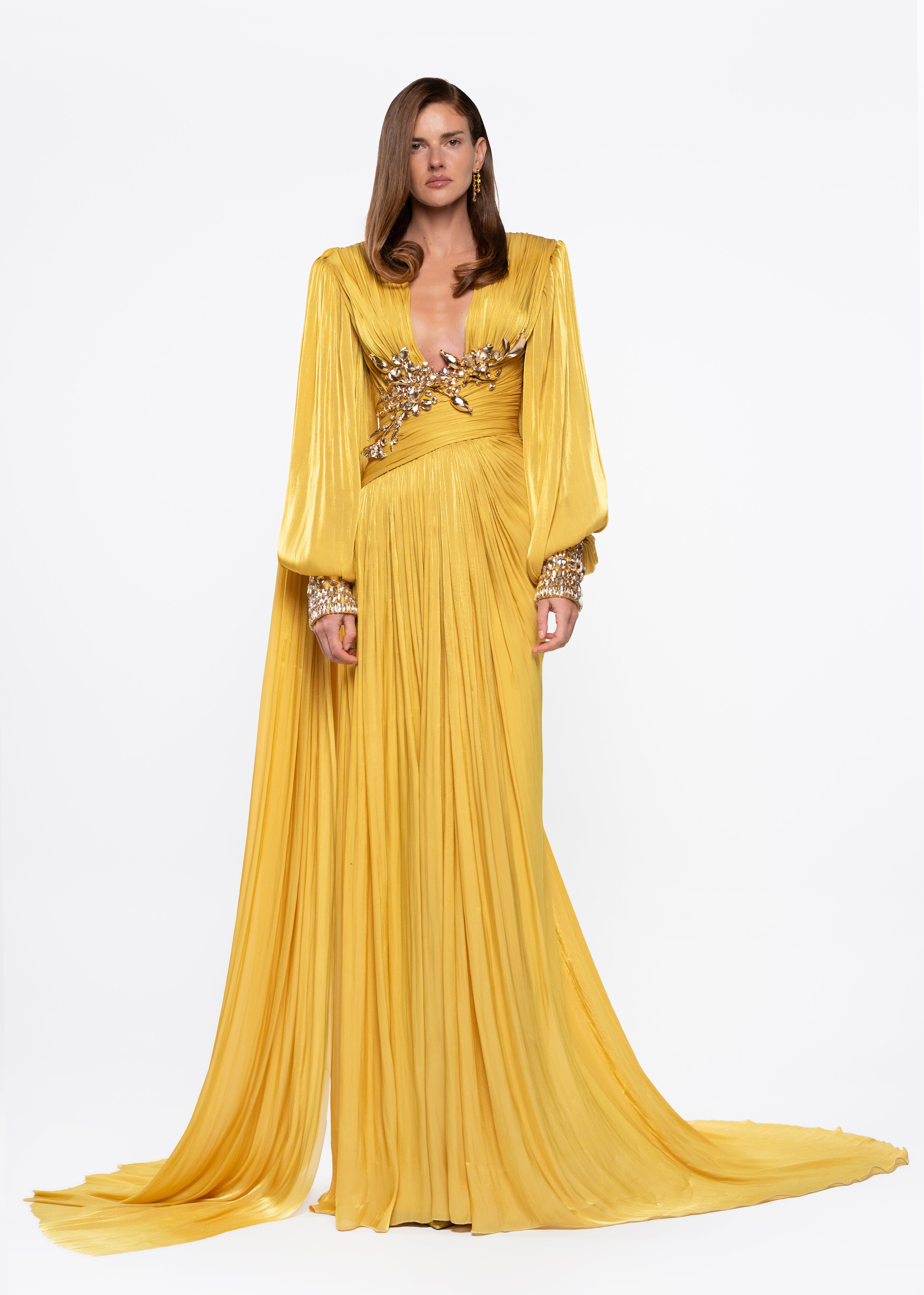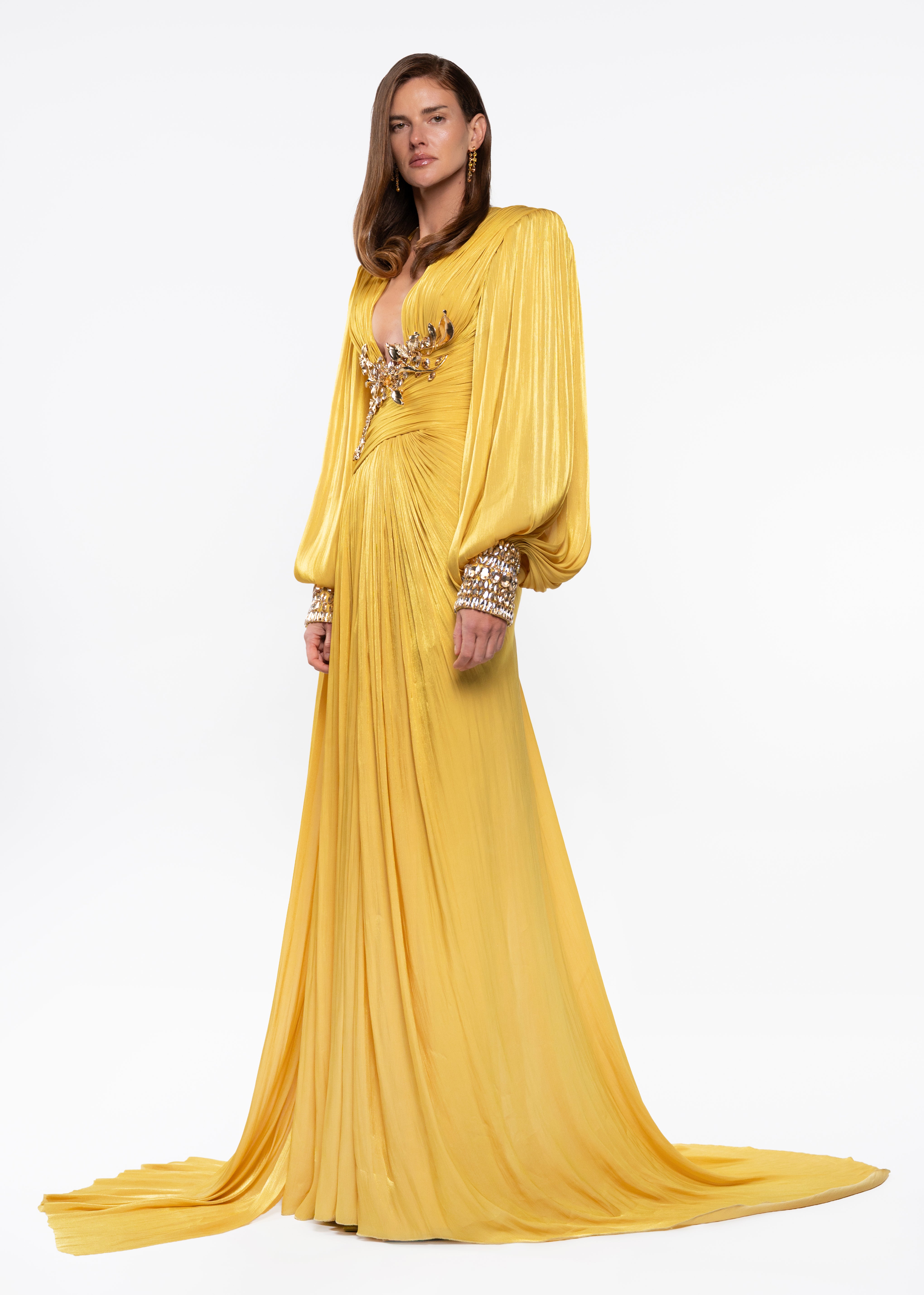 A luxury ready-to-wear gown in radiant gold, defined by crystal embellishments, long sleeves, and a refined pleated design that enhances an elegant, flowing silhouette
