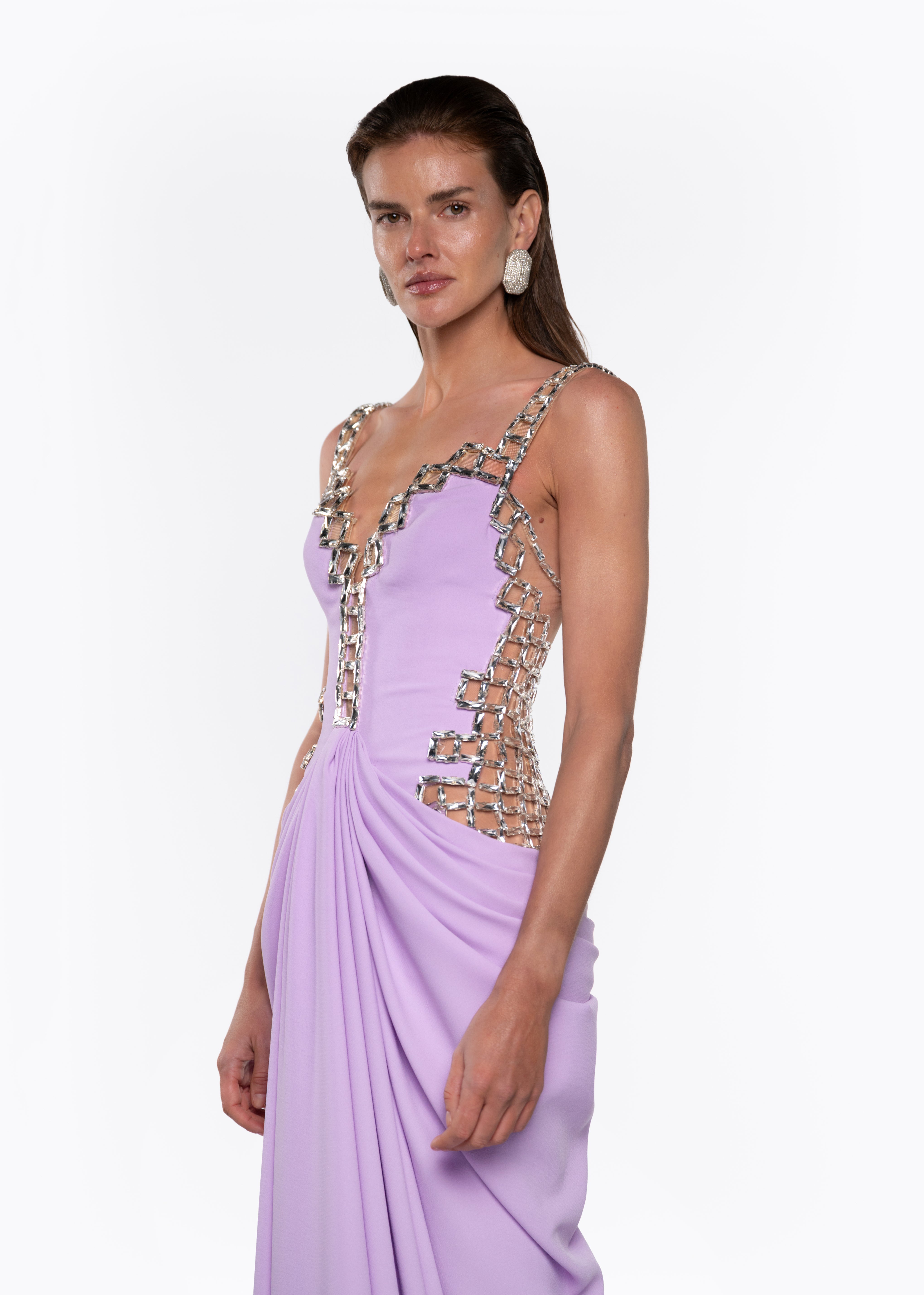 A refined lilac evening gown featuring a structured bodice with metallic chain-link details and a softly draped skirt that flows into an elegant train. Designed for modern glamour, this look is ideal for red carpet appearances, gala events, and luxury evenings.