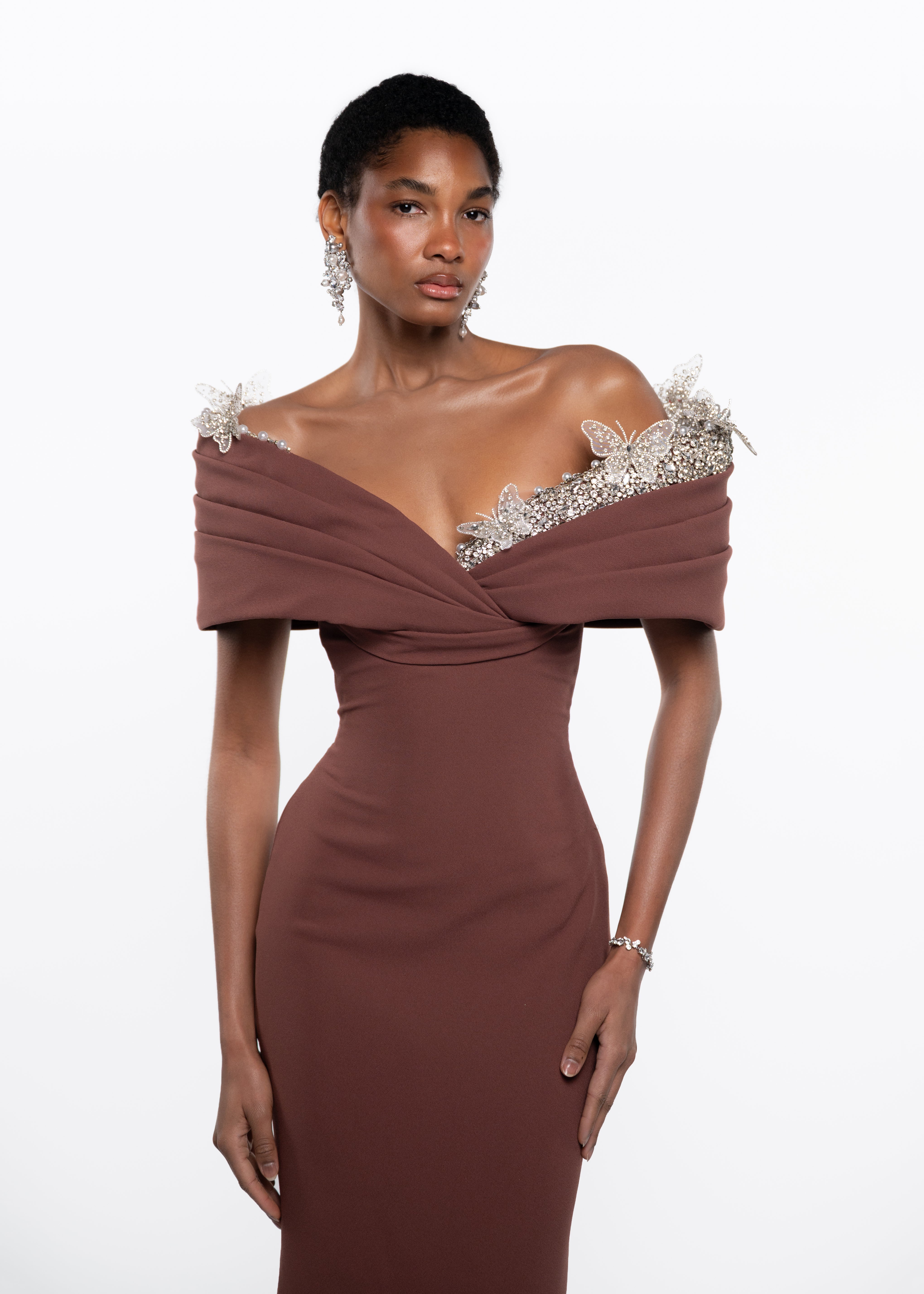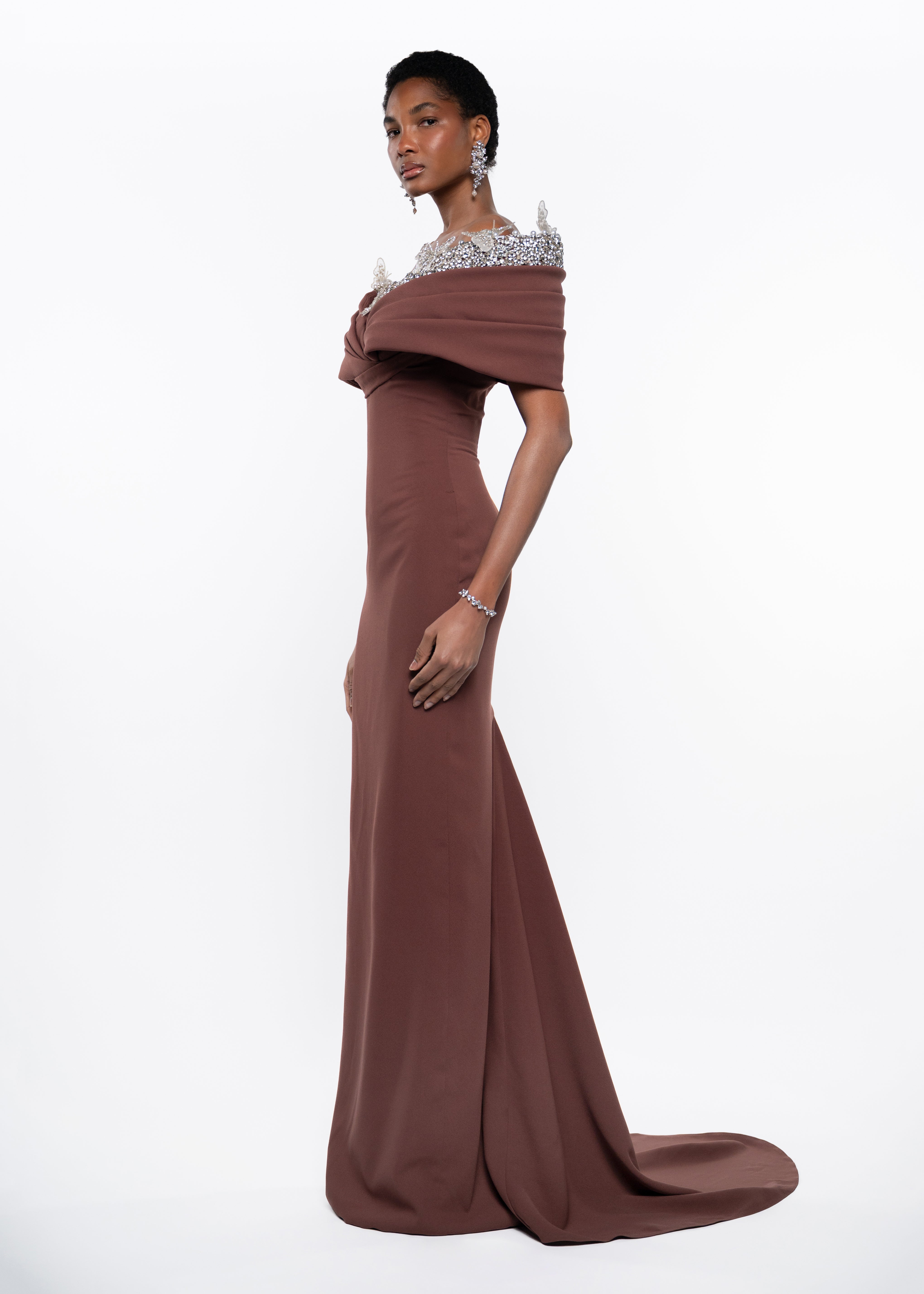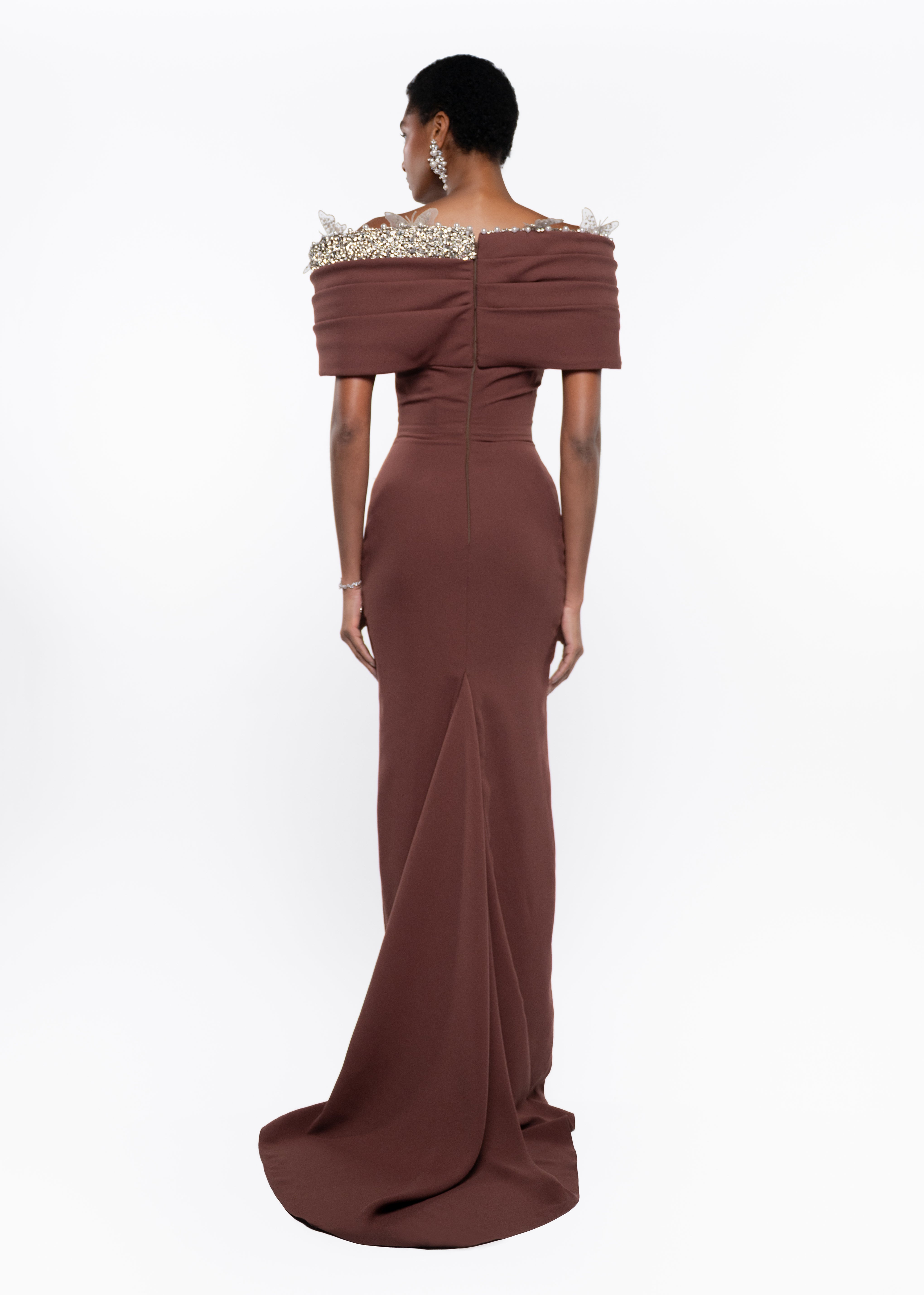 An elegant off-shoulder evening gown crafted in a rich chocolate brown tone. This sculpted silhouette features a softly draped neckline adorned with delicate crystal embellishments, creating a refined balance between structure and femininity