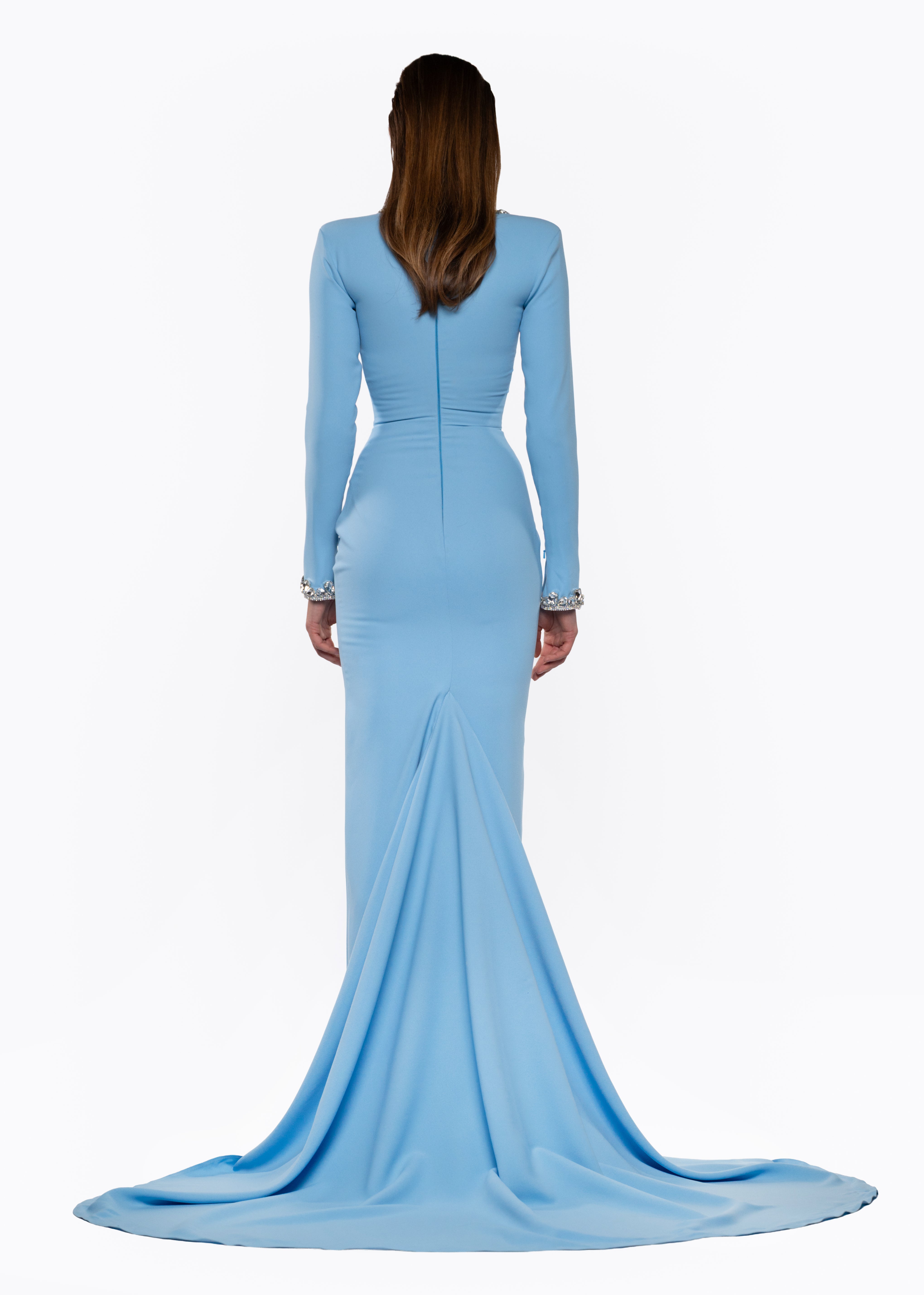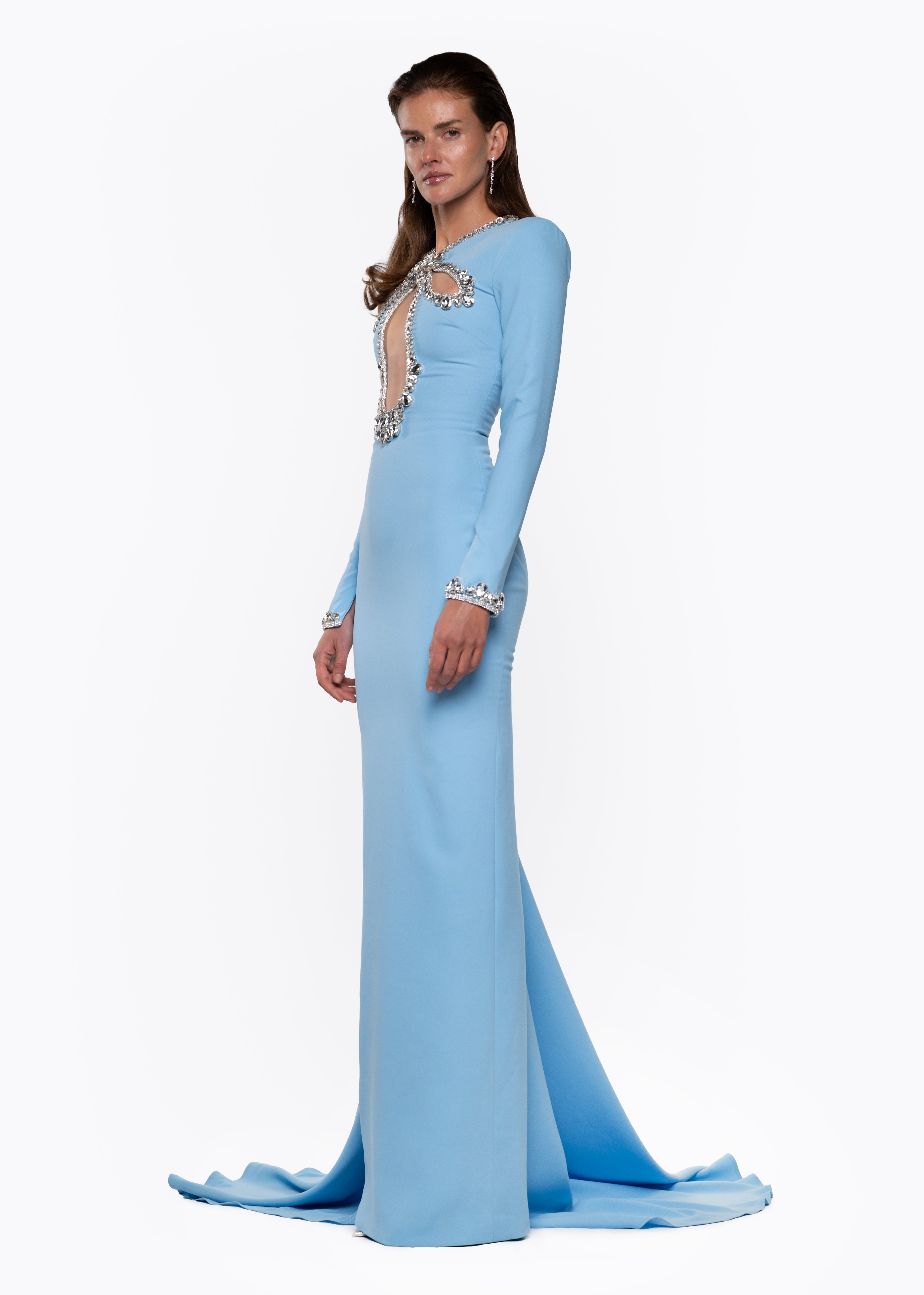 This sky blue floor-length gown embodies modern elegance and refined glamour. Crafted with a sculpted silhouette, long sleeves, and a bold crystal-embellished cut-out neckline, this design highlights femininity with architectural precision.