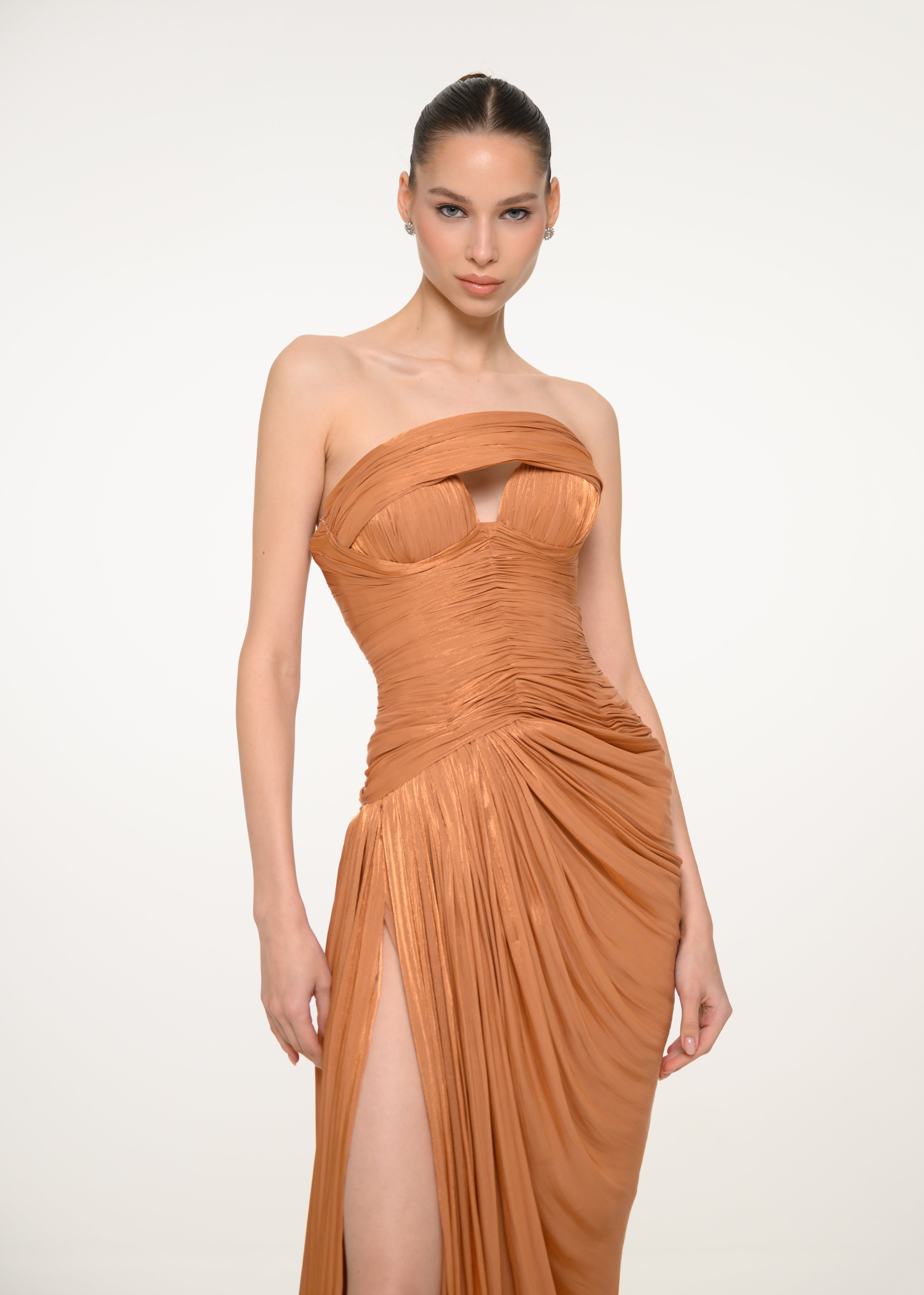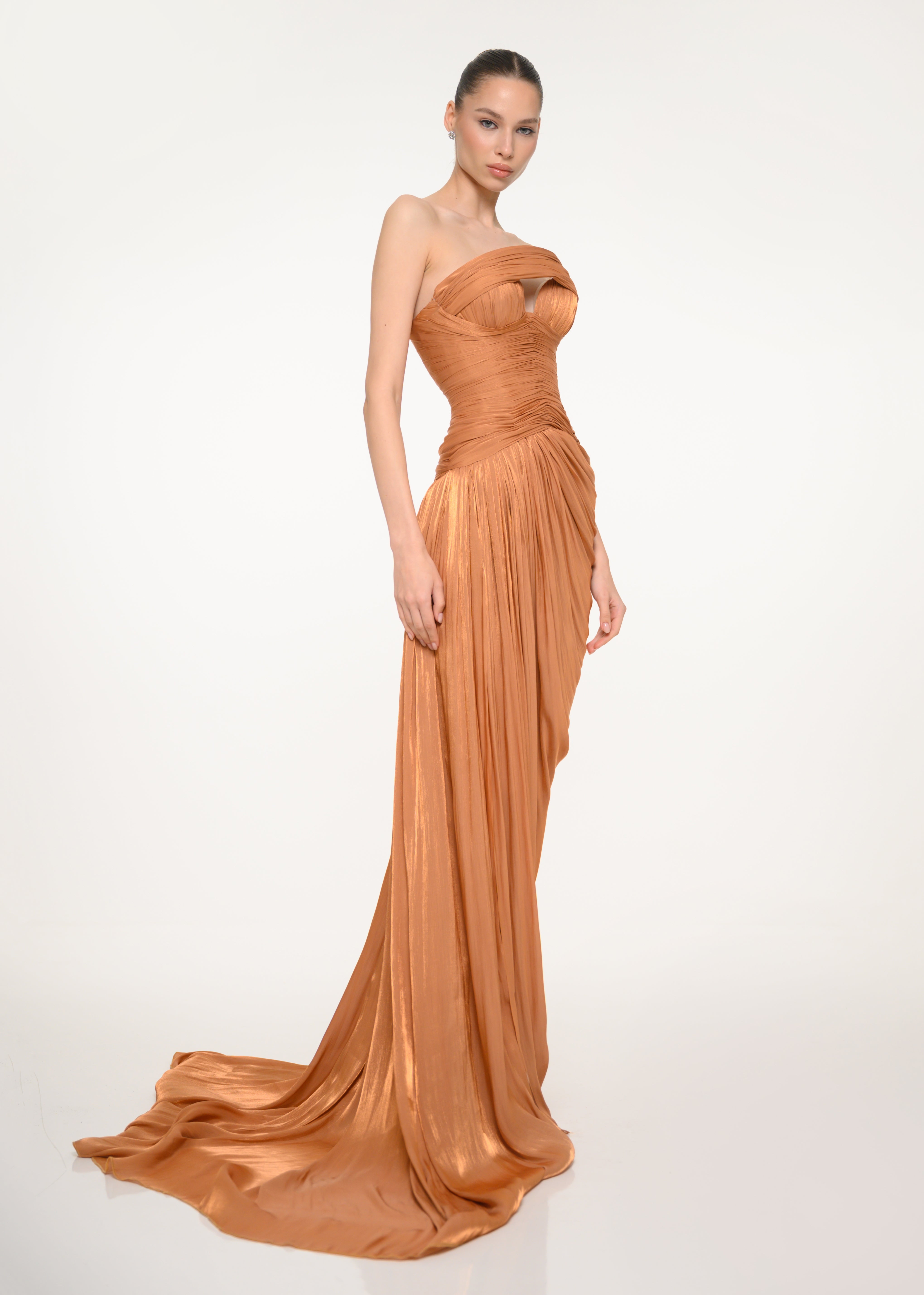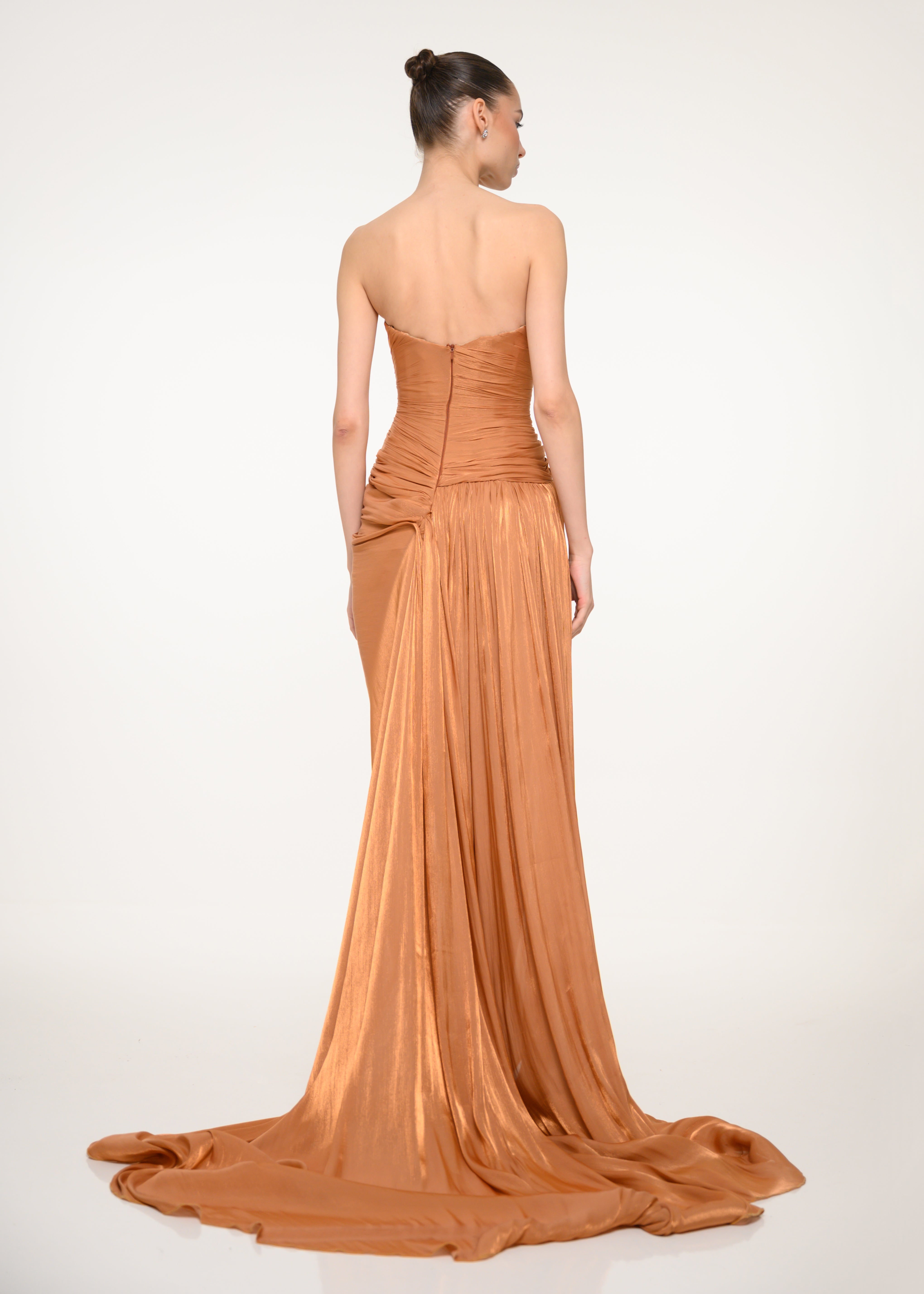 A bronze satin dress featuring a sculpted strapless bodice and fluid draping that flows into a soft train, radiating timeless elegance with a modern, luminous finish.