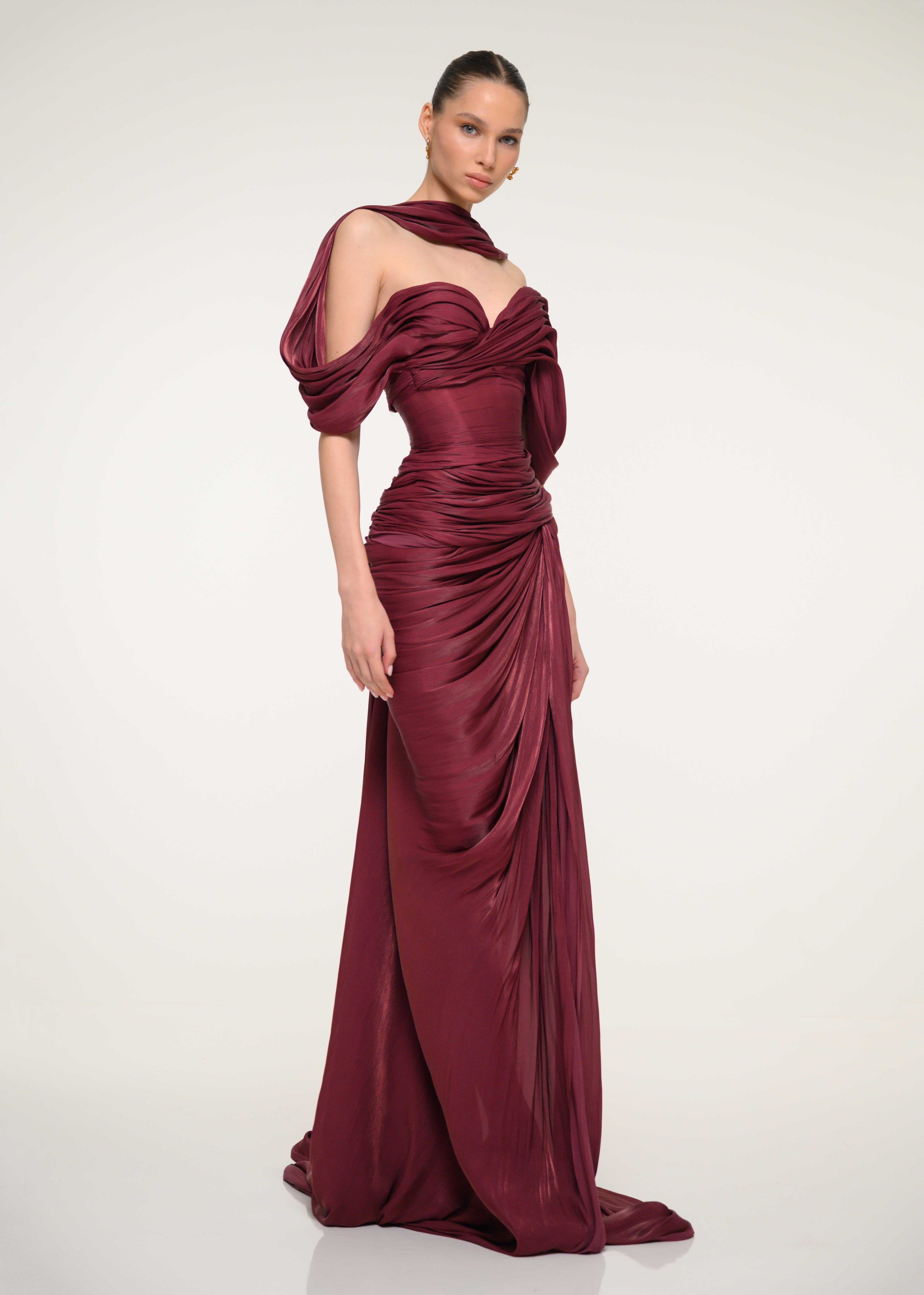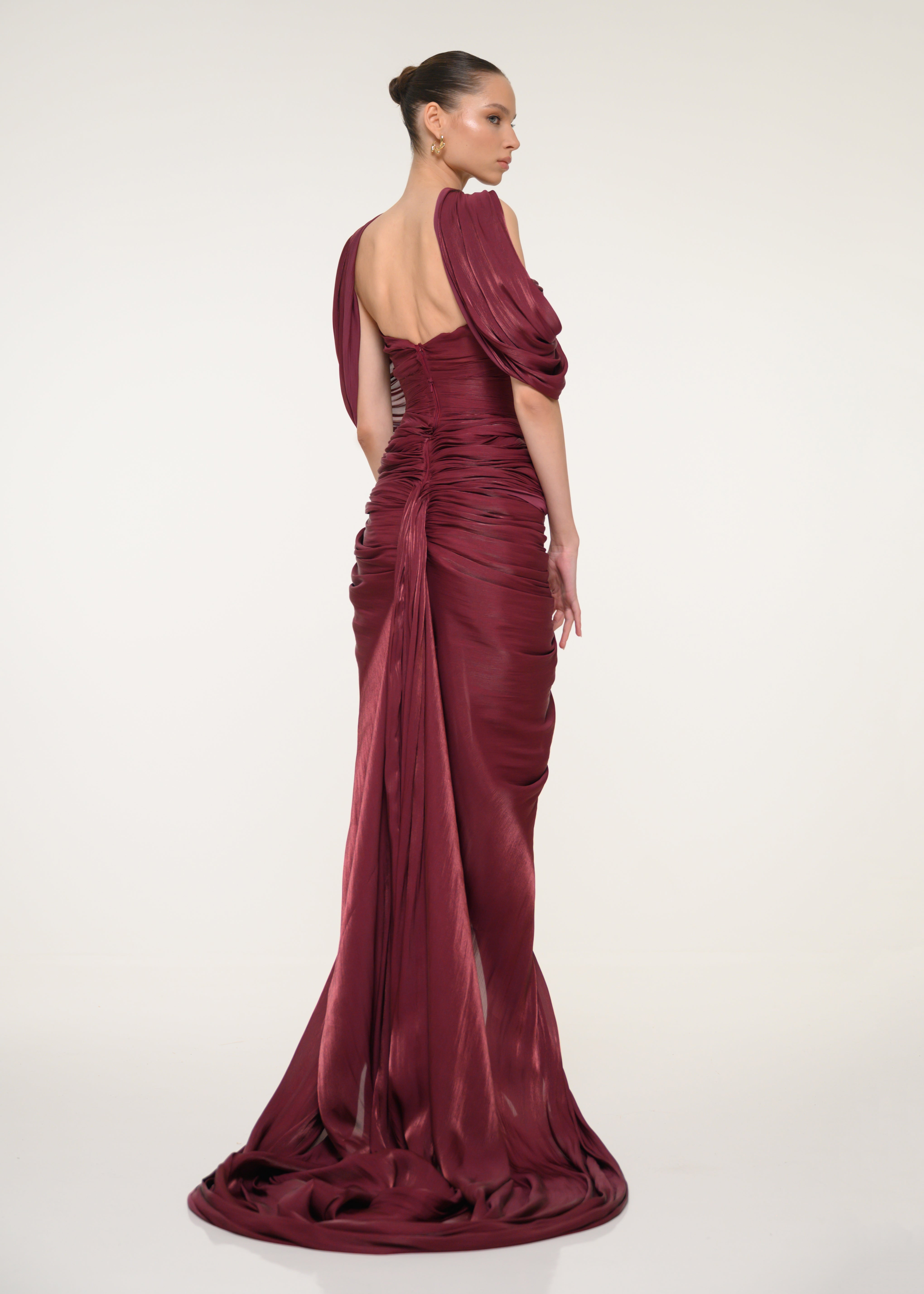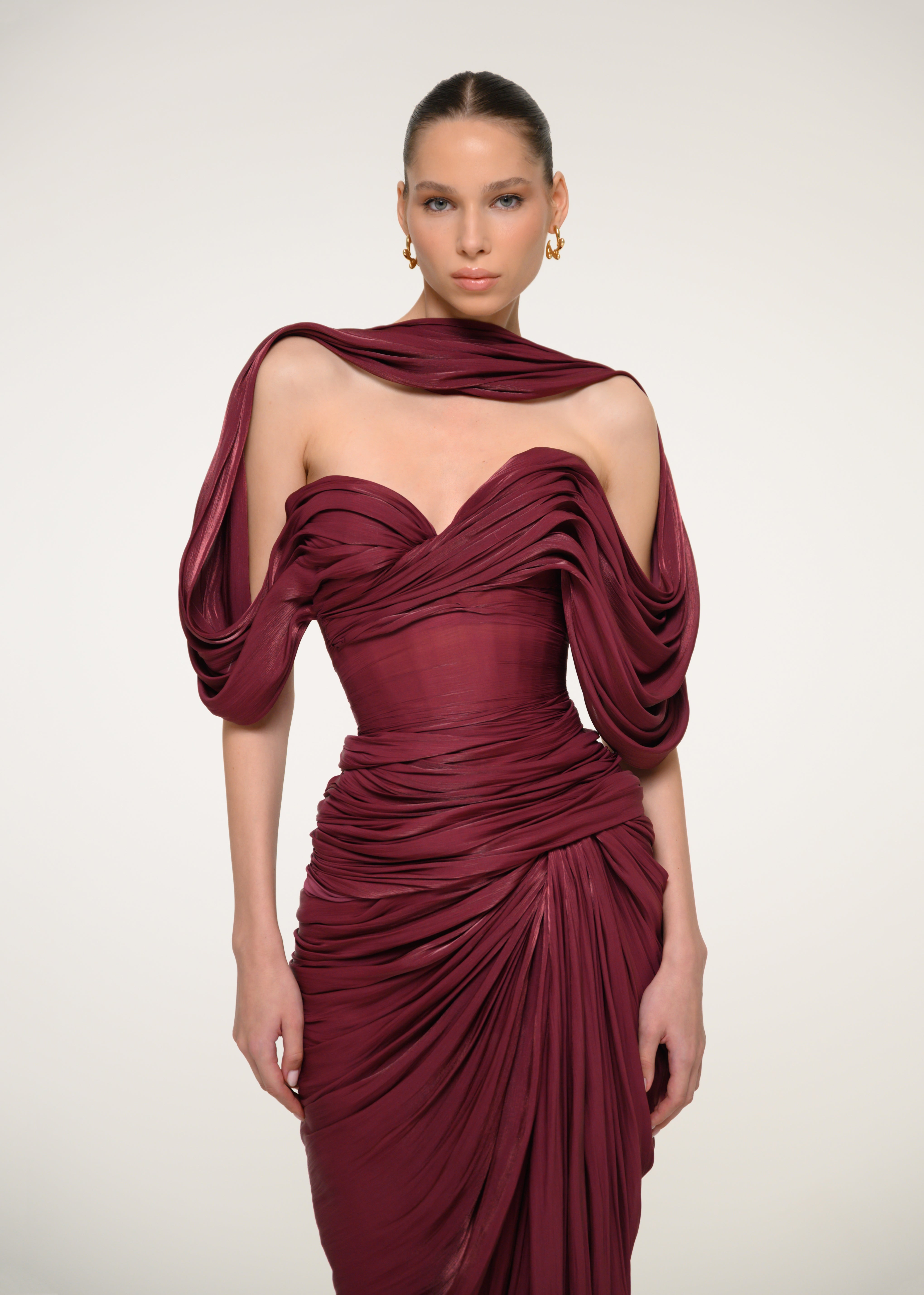 A deep burgundy dress with fluid draping and an open back - timeless elegance for unforgettable evenings.