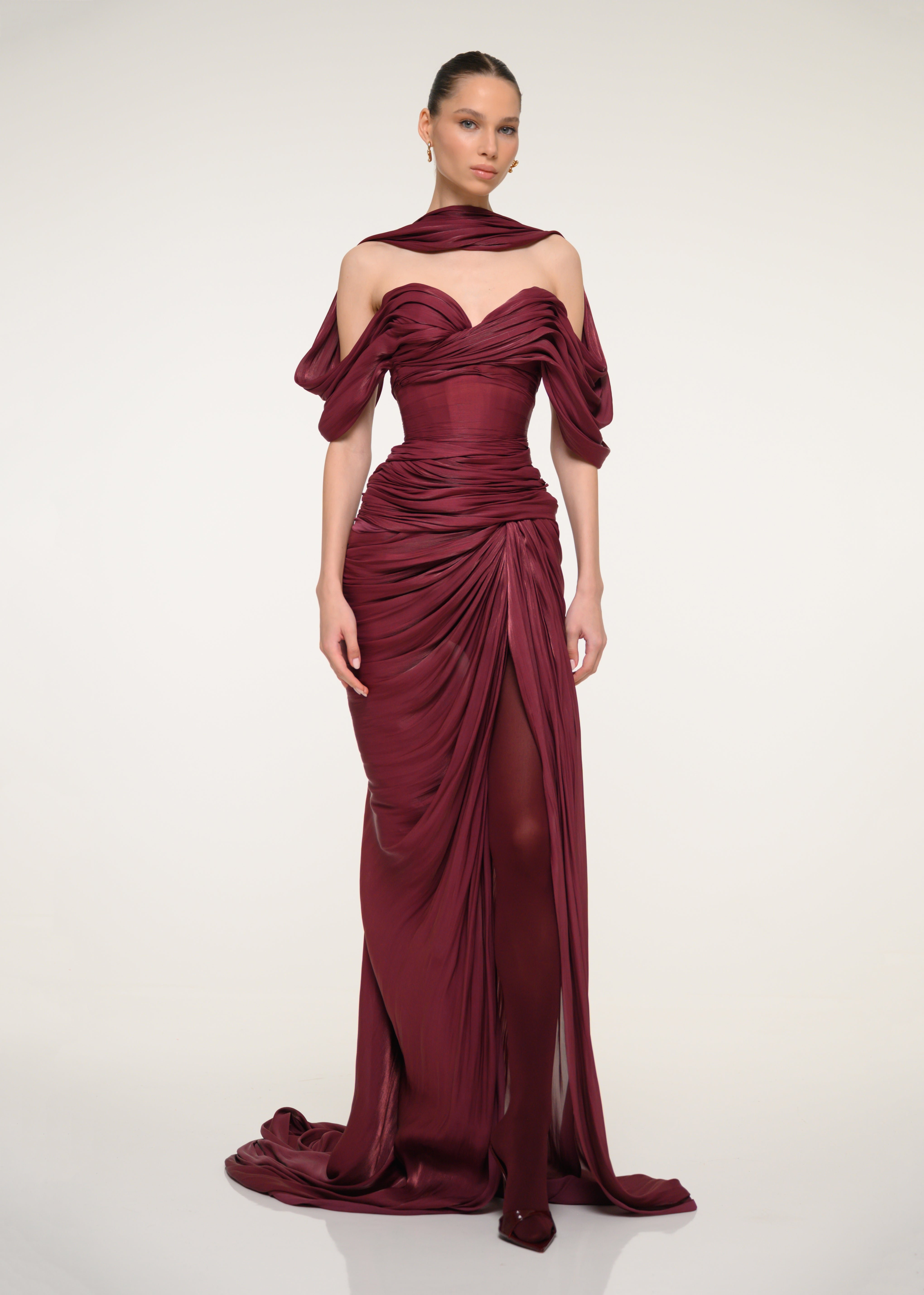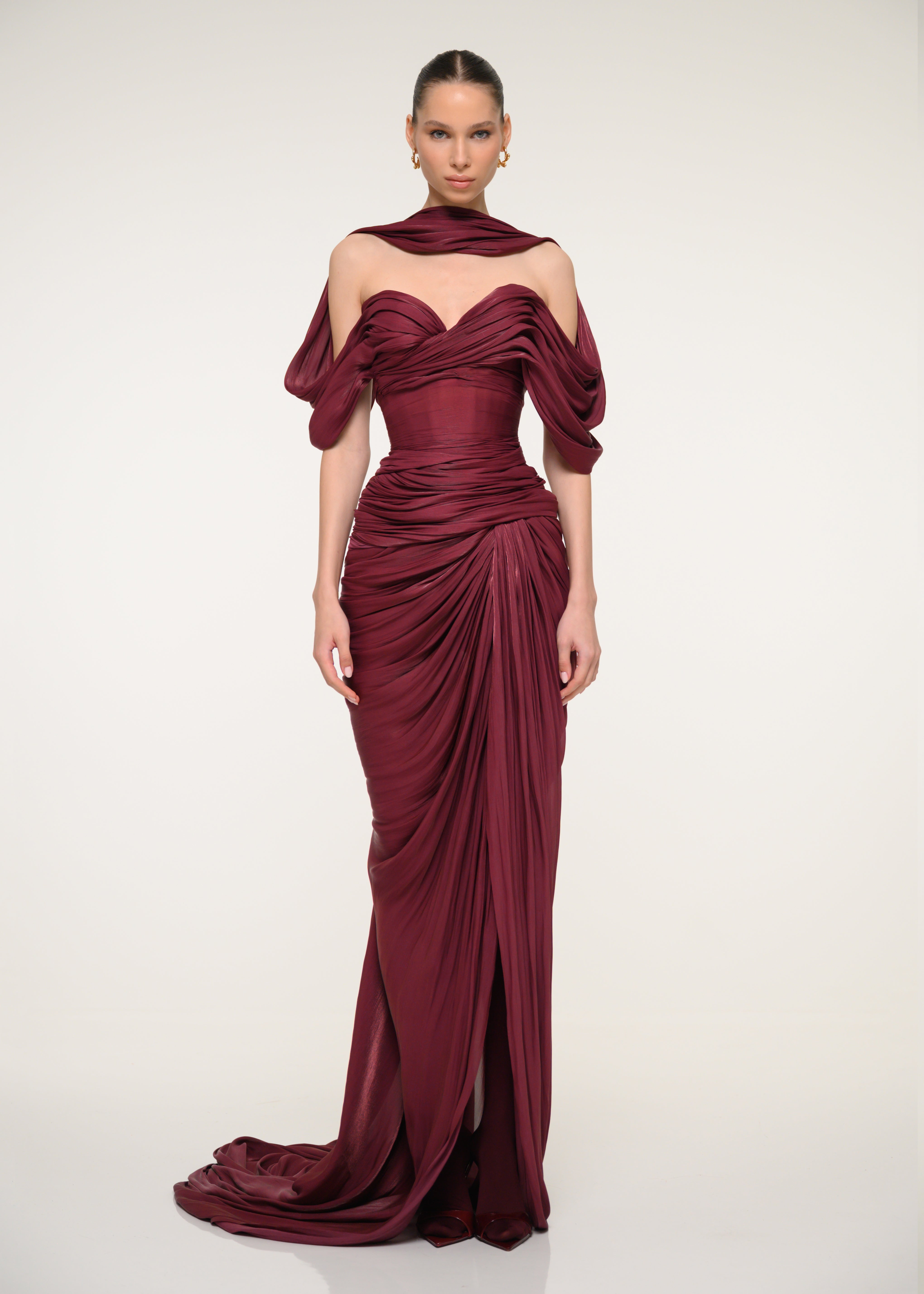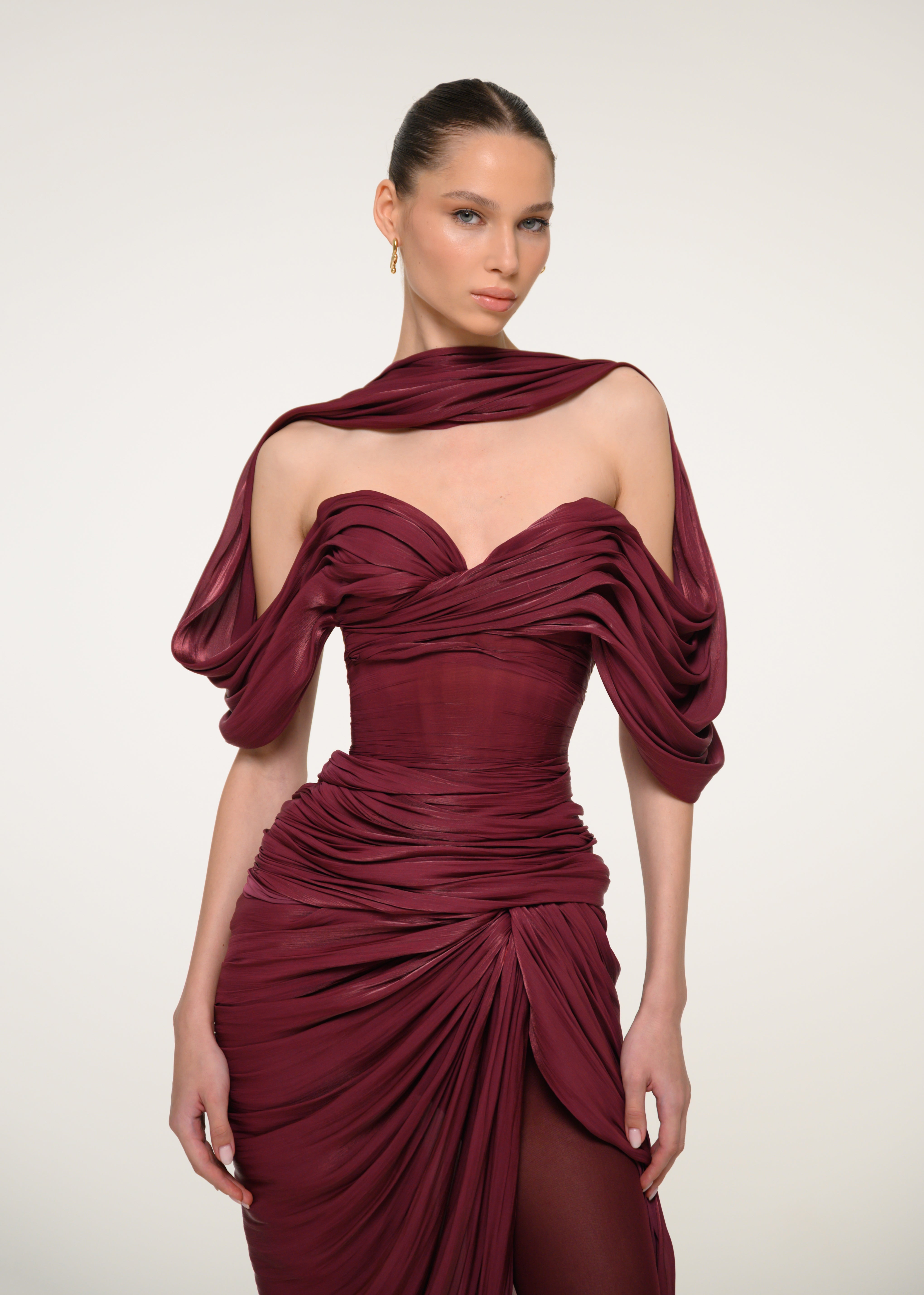A deep burgundy dress with fluid draping and an open back - timeless elegance for unforgettable evenings.