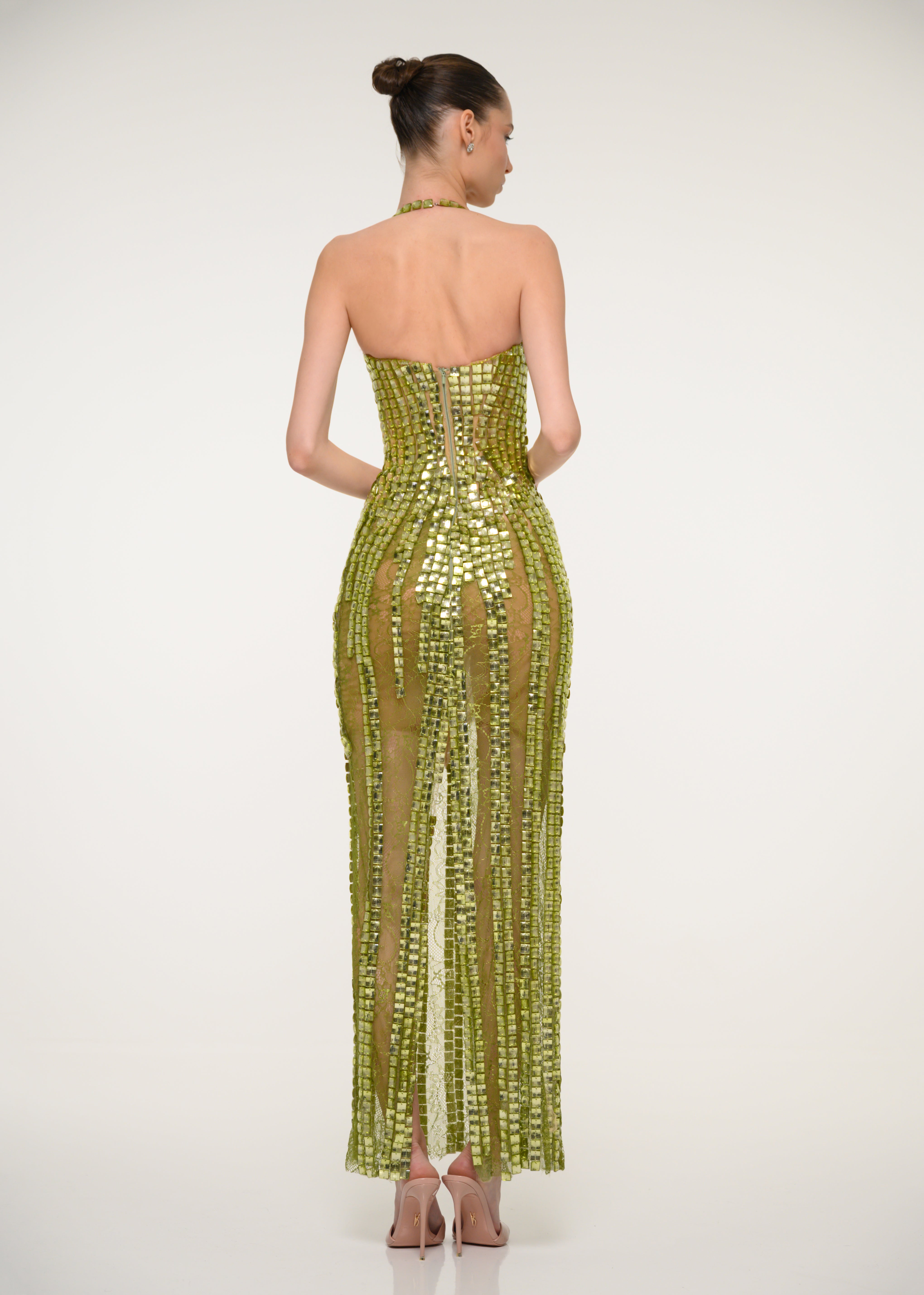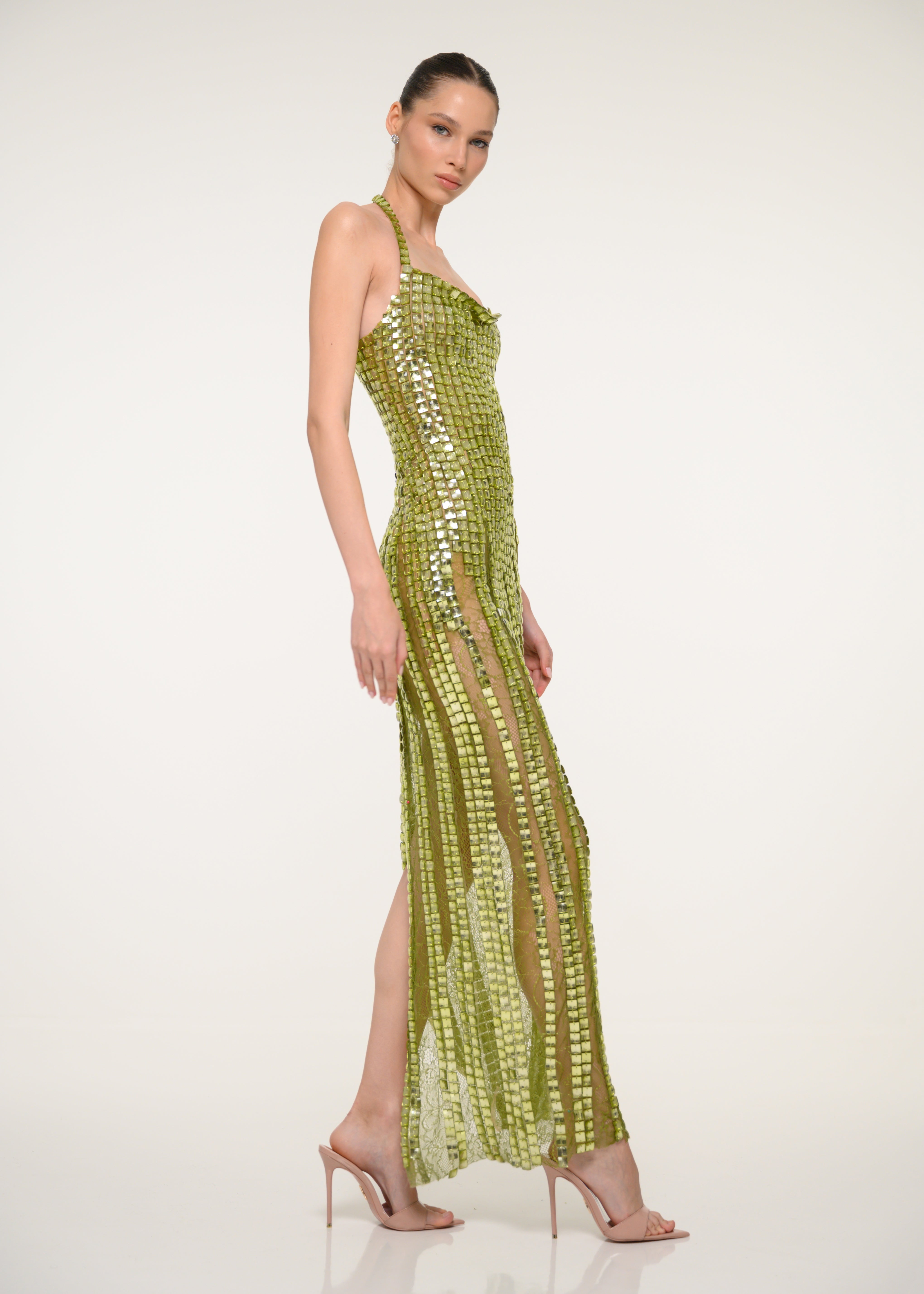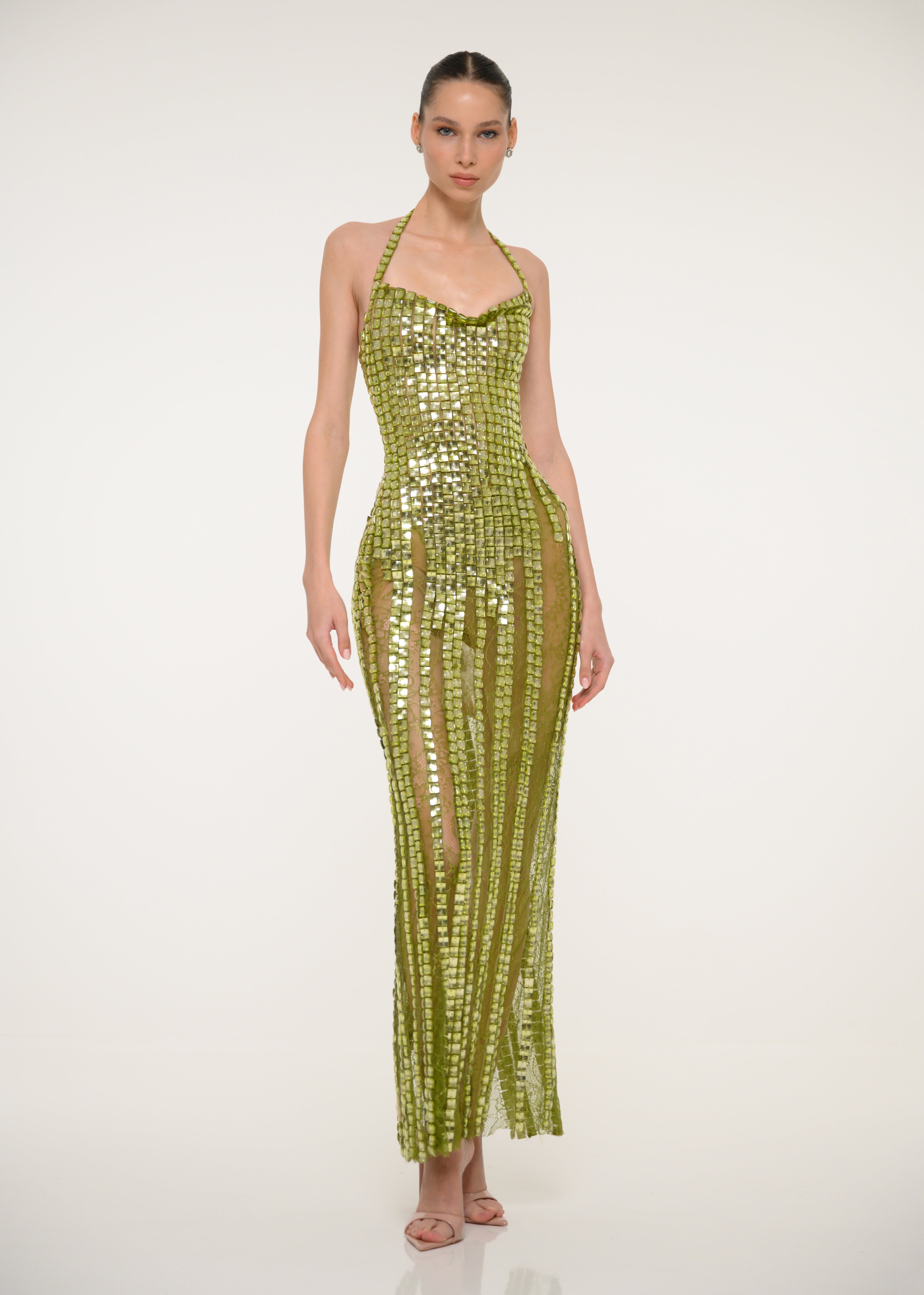A sleek green dress crafted from shimmering sequins - a modern show stopping silhouette.