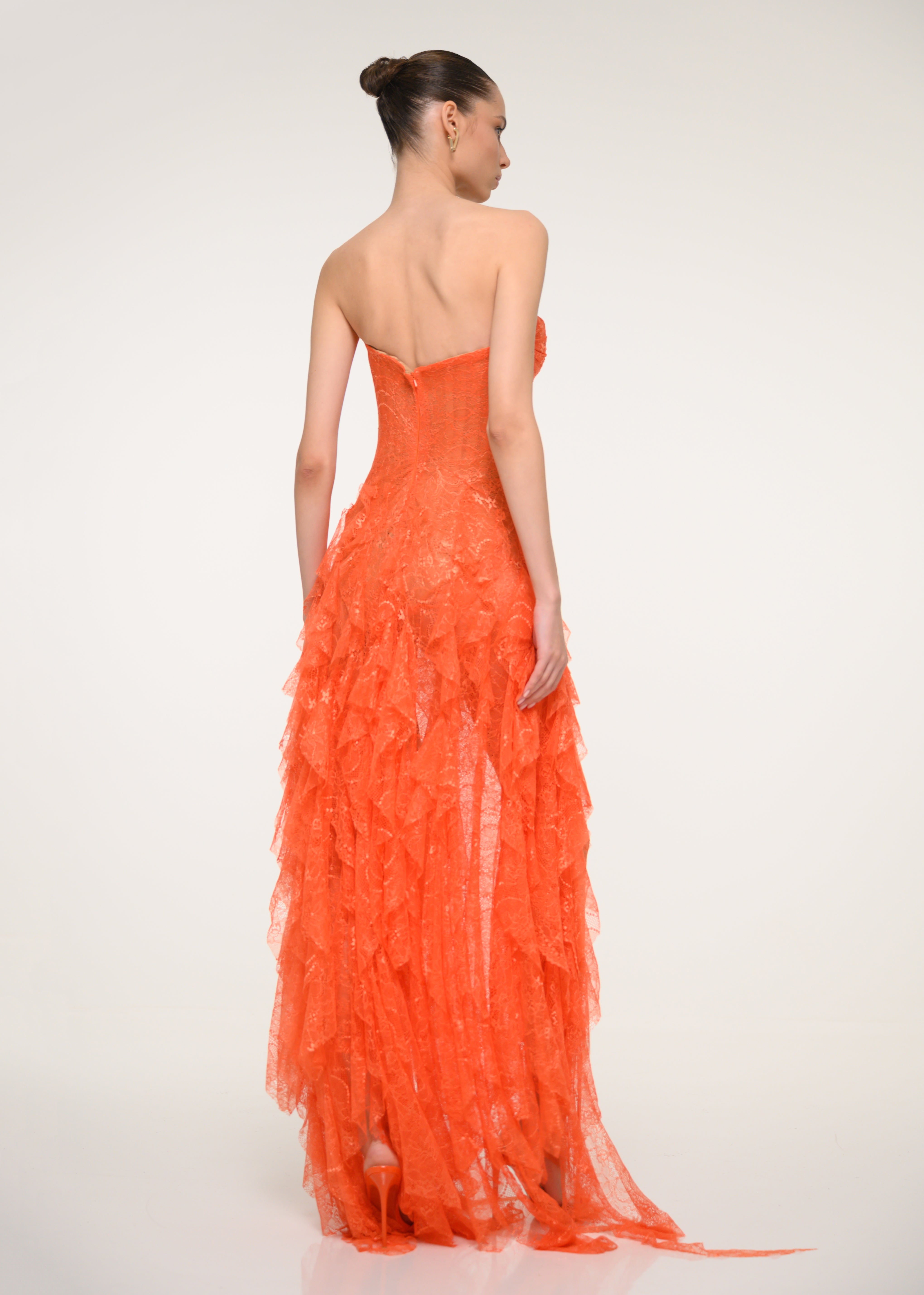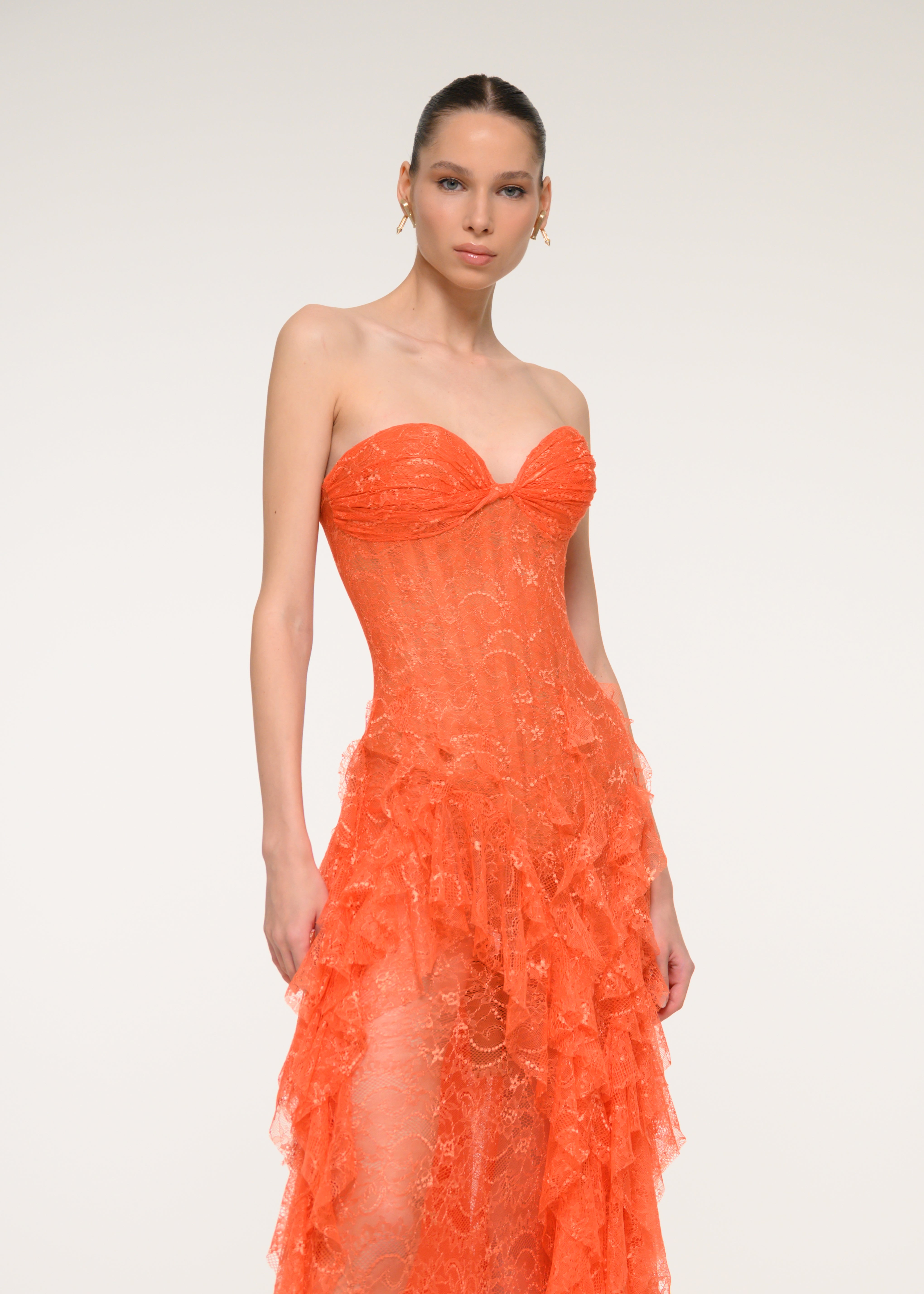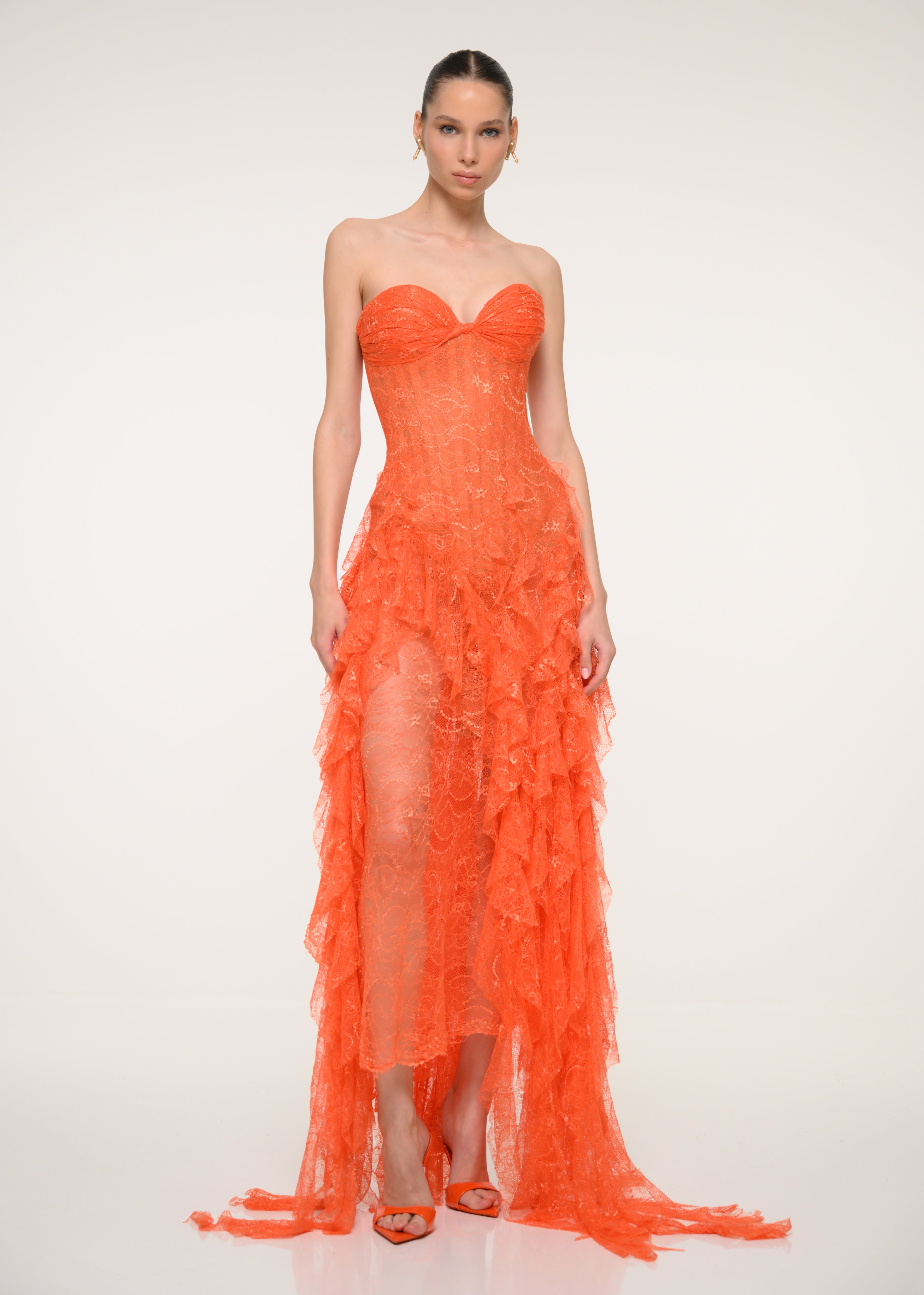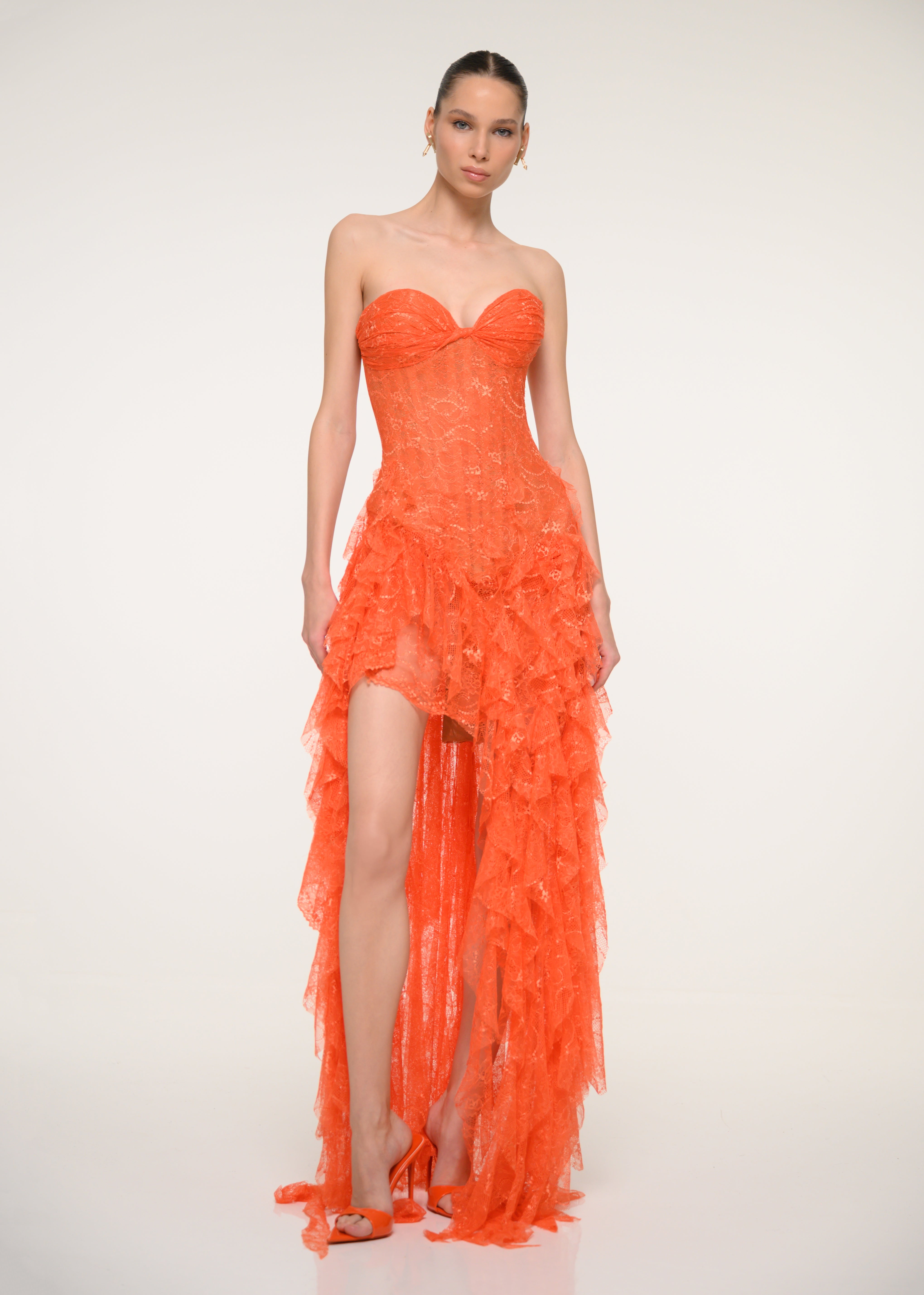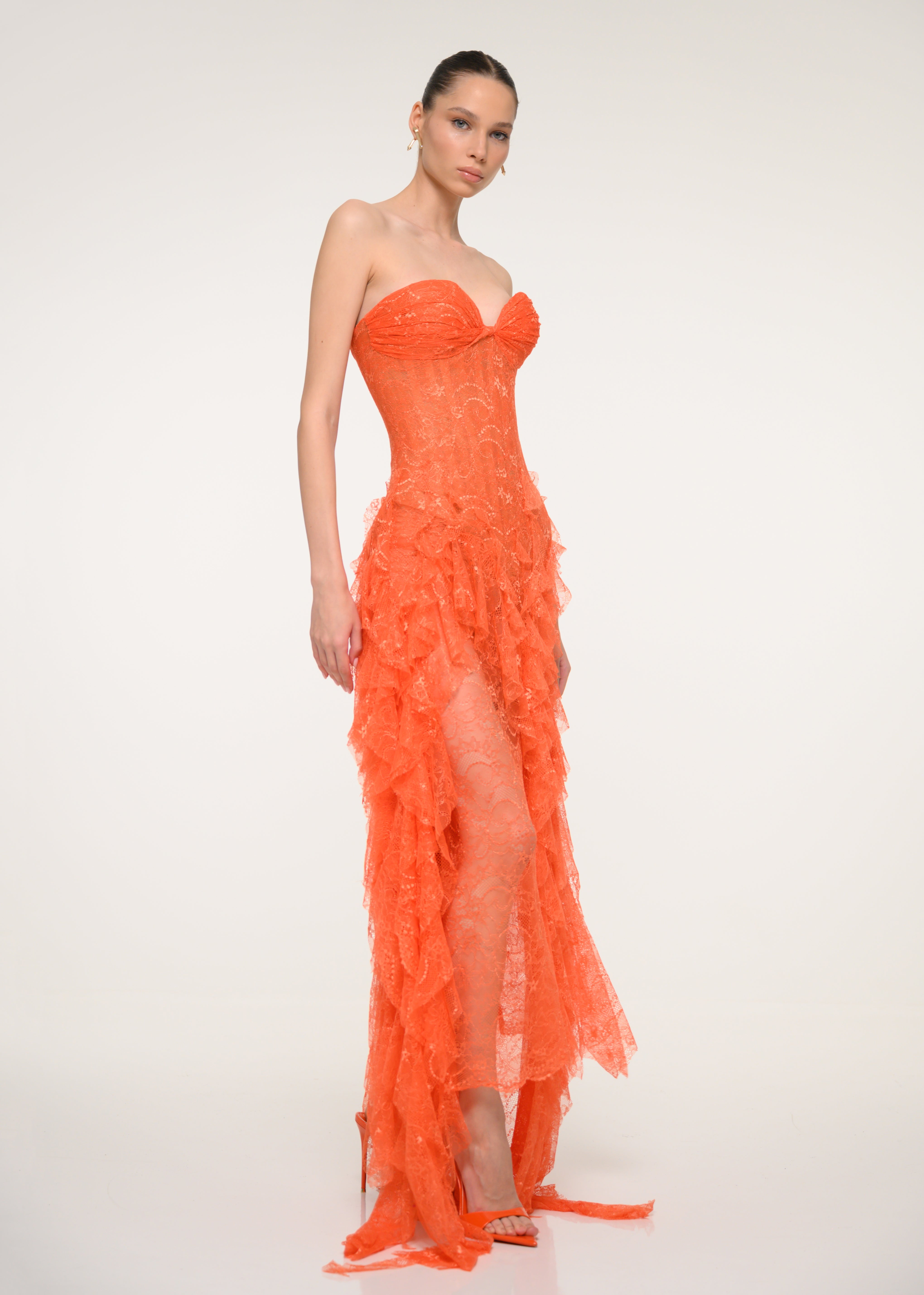 A romantic strapless dress in orange floral lace, finished with a side slit - pure confidence wrapped in color.