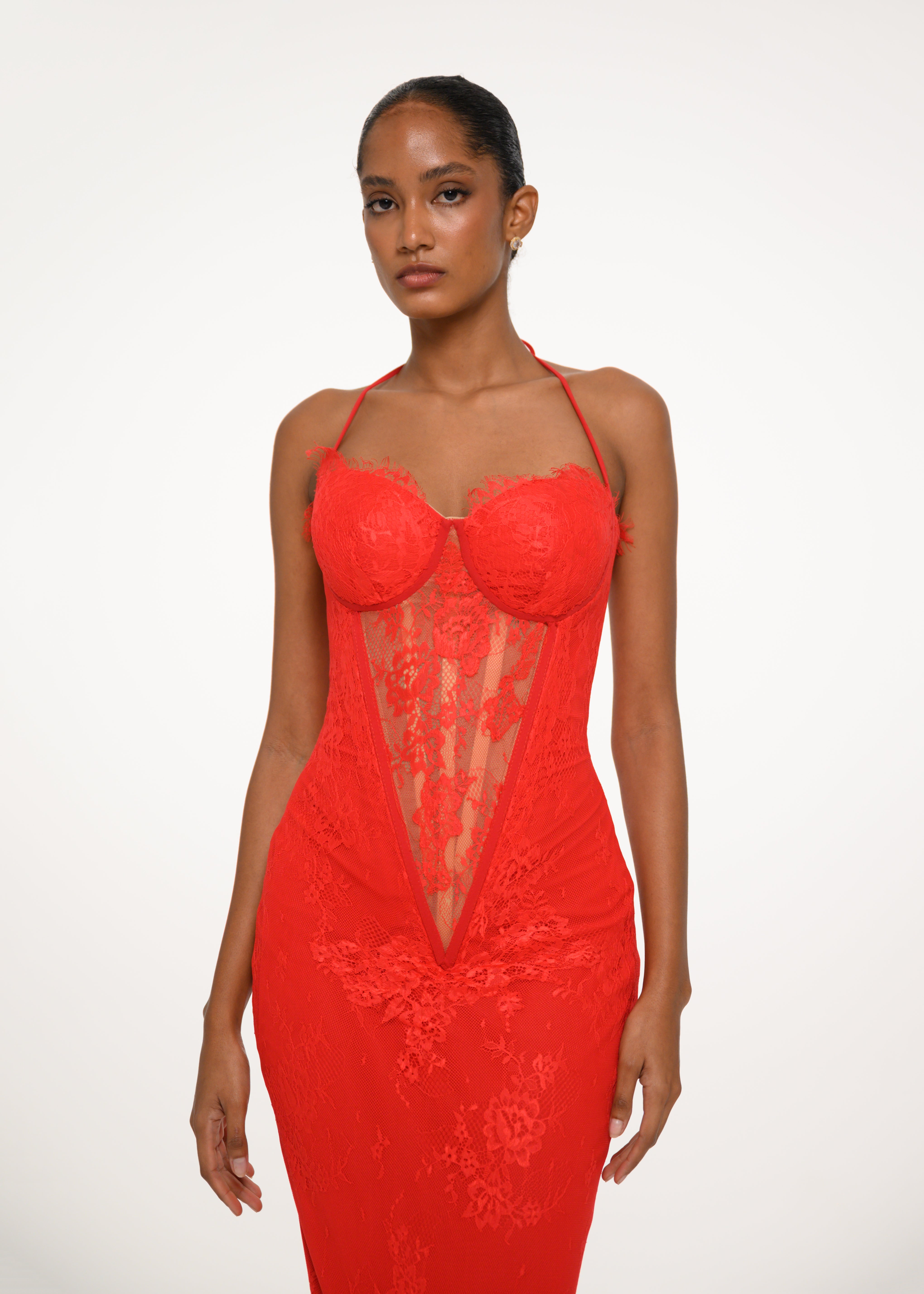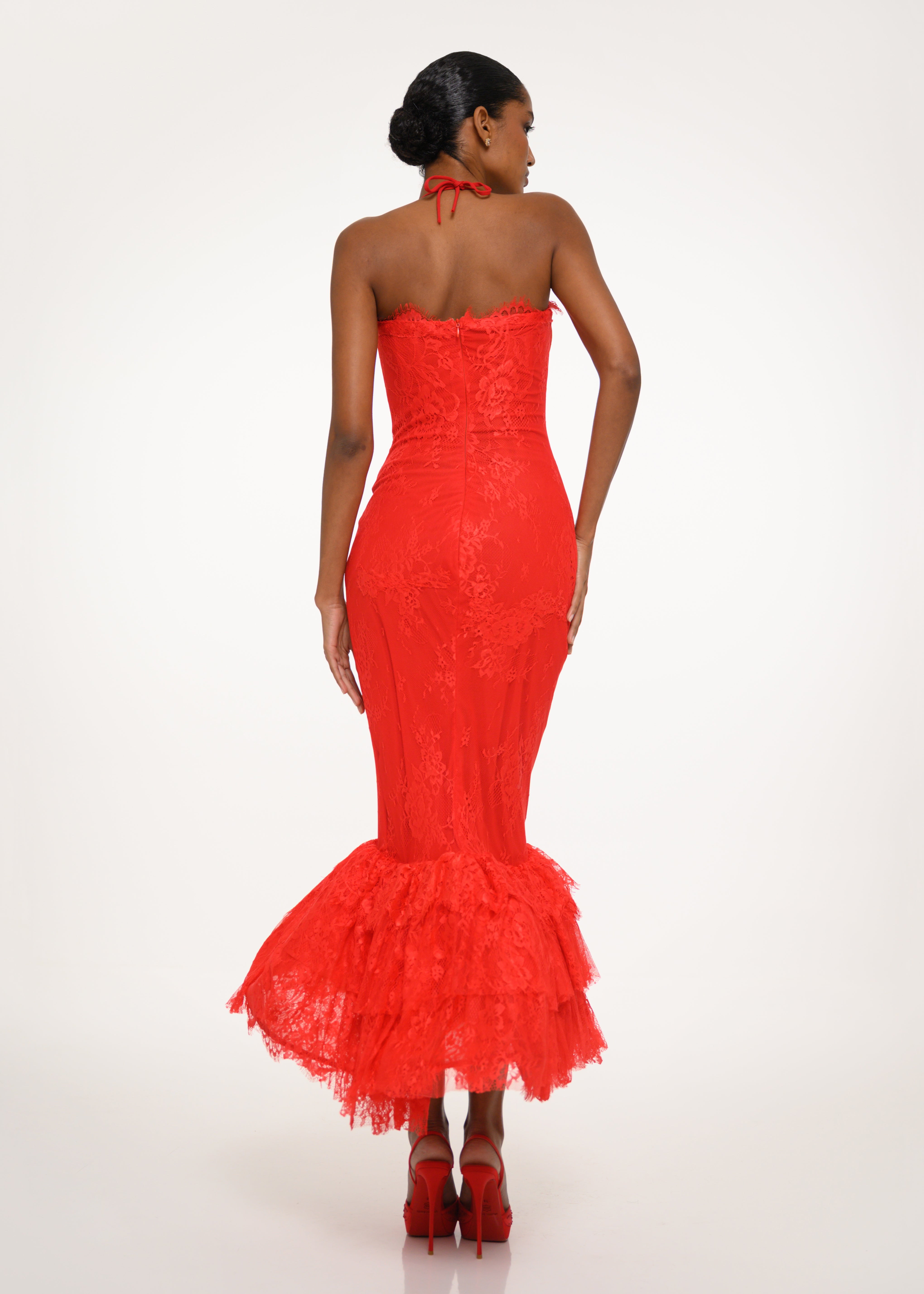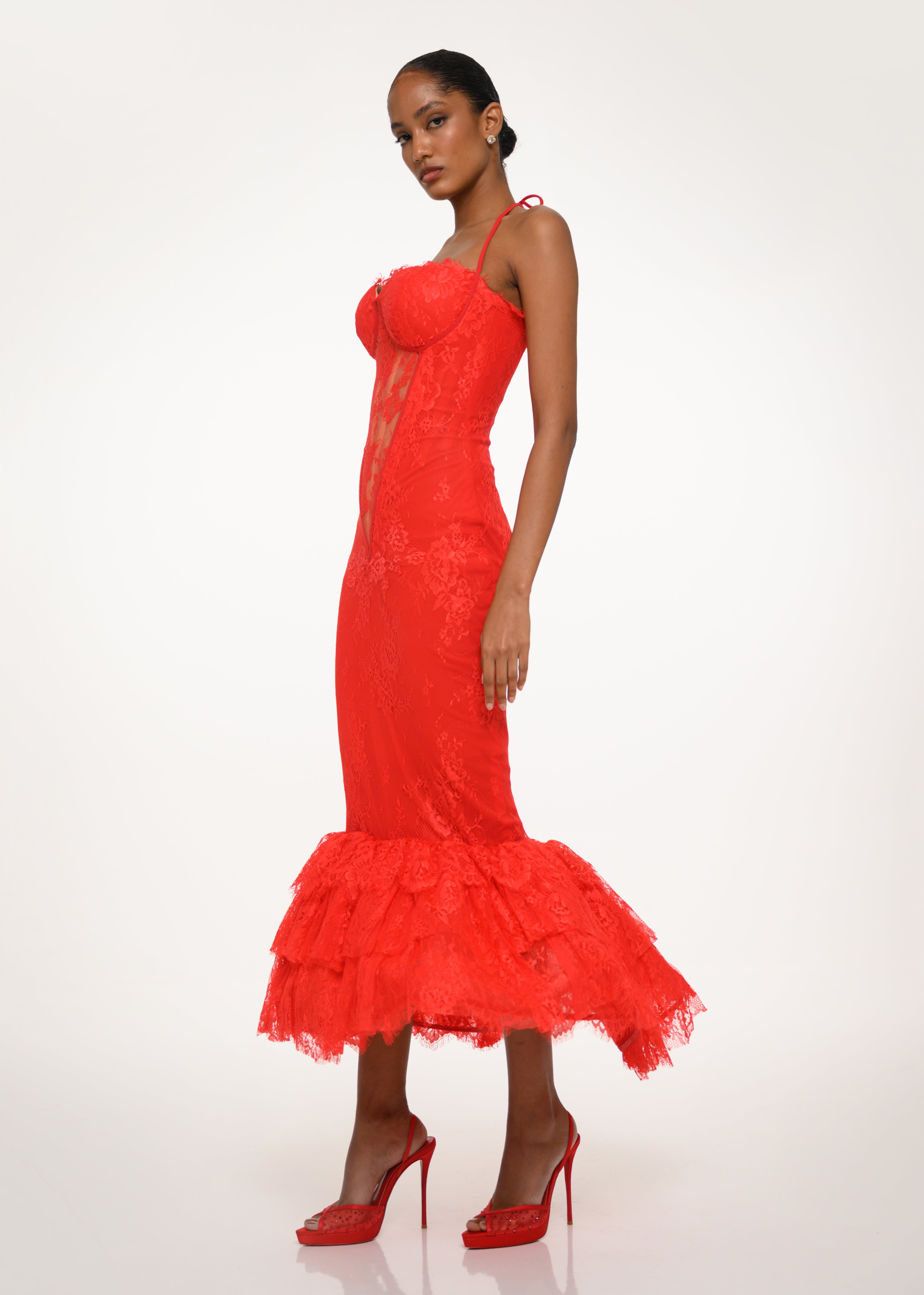 A bold red lace dress with a structured corset bodice and sheer detailing — ending in a dramatic tiered mermaid hem for undeniable allure.