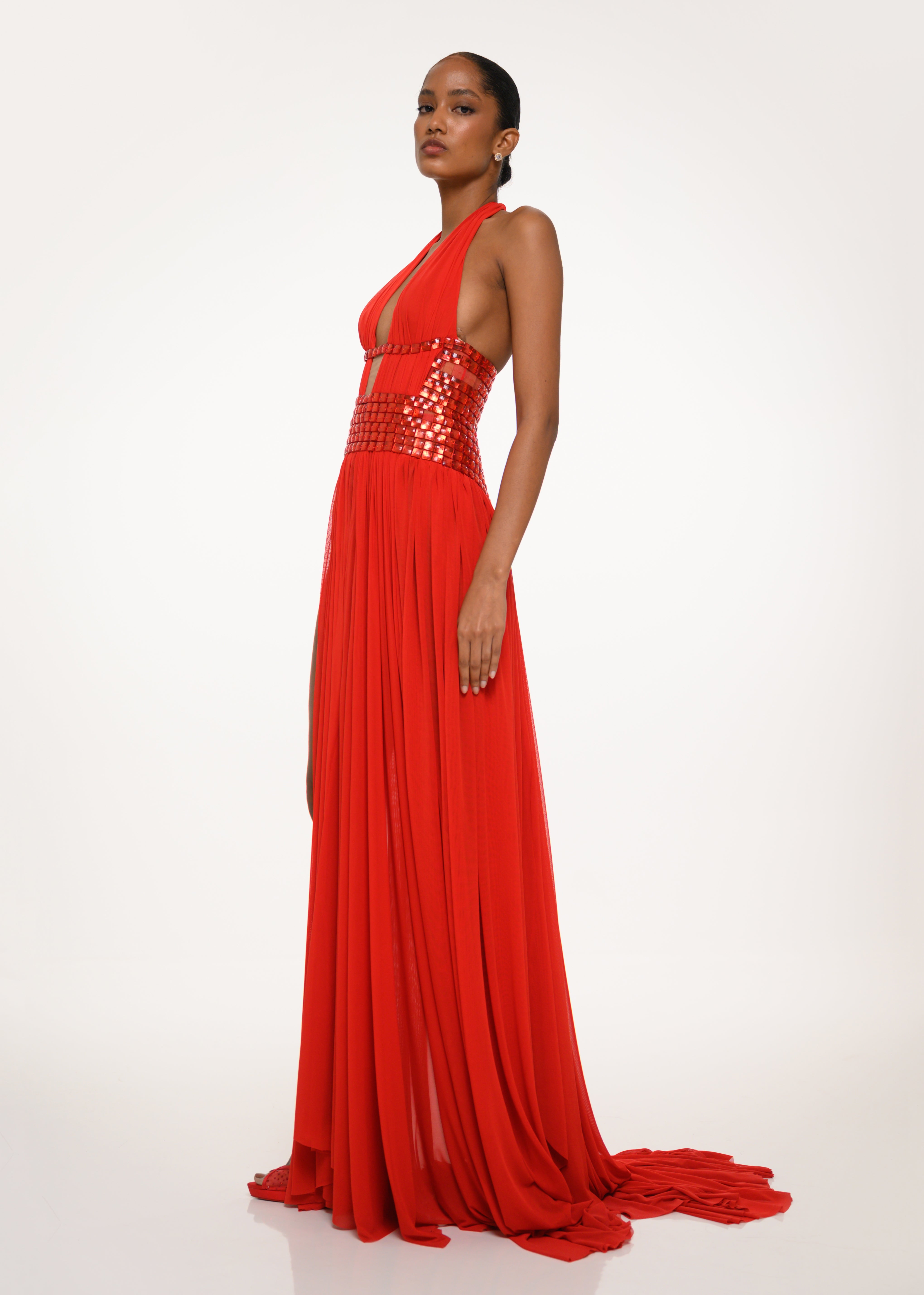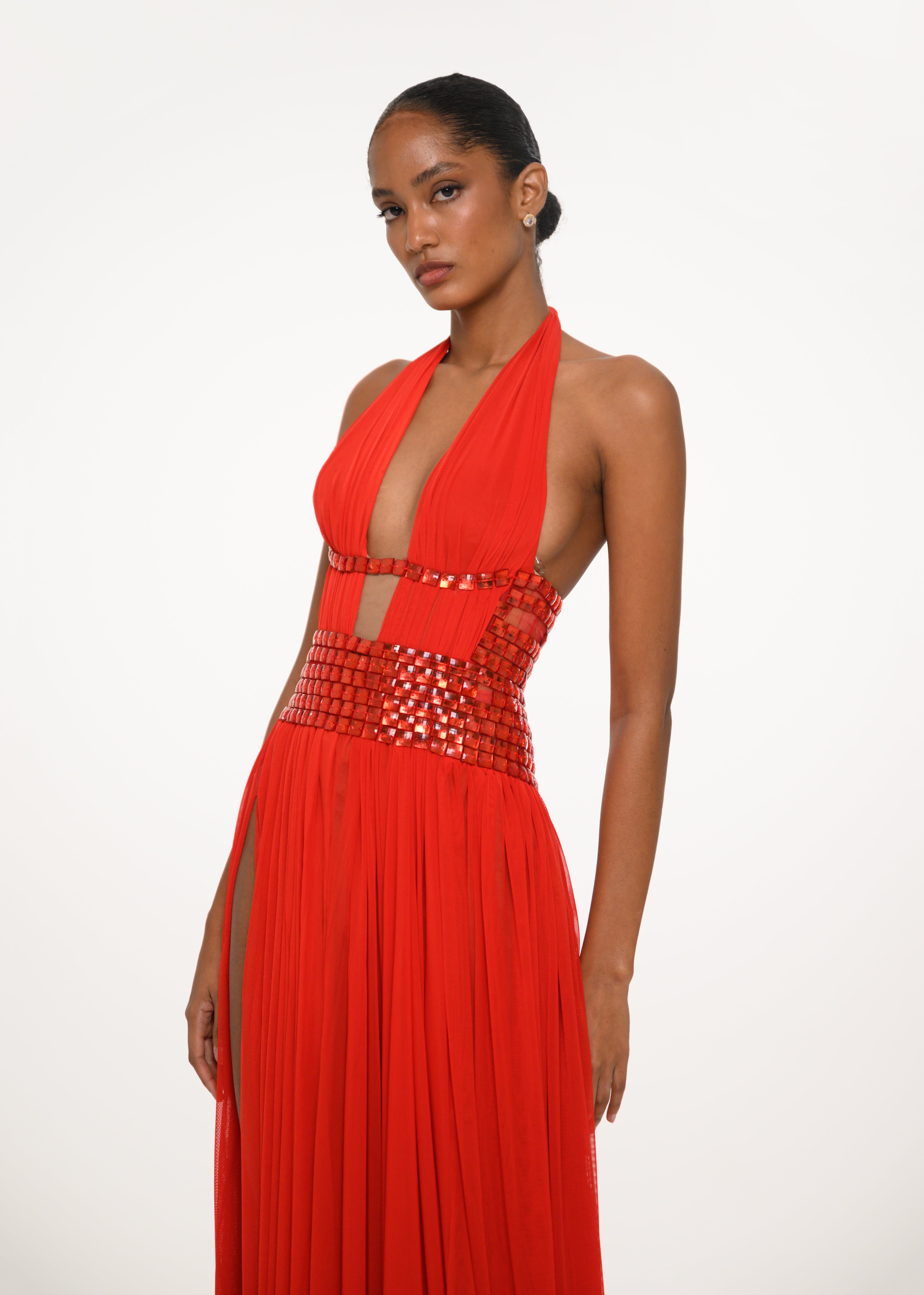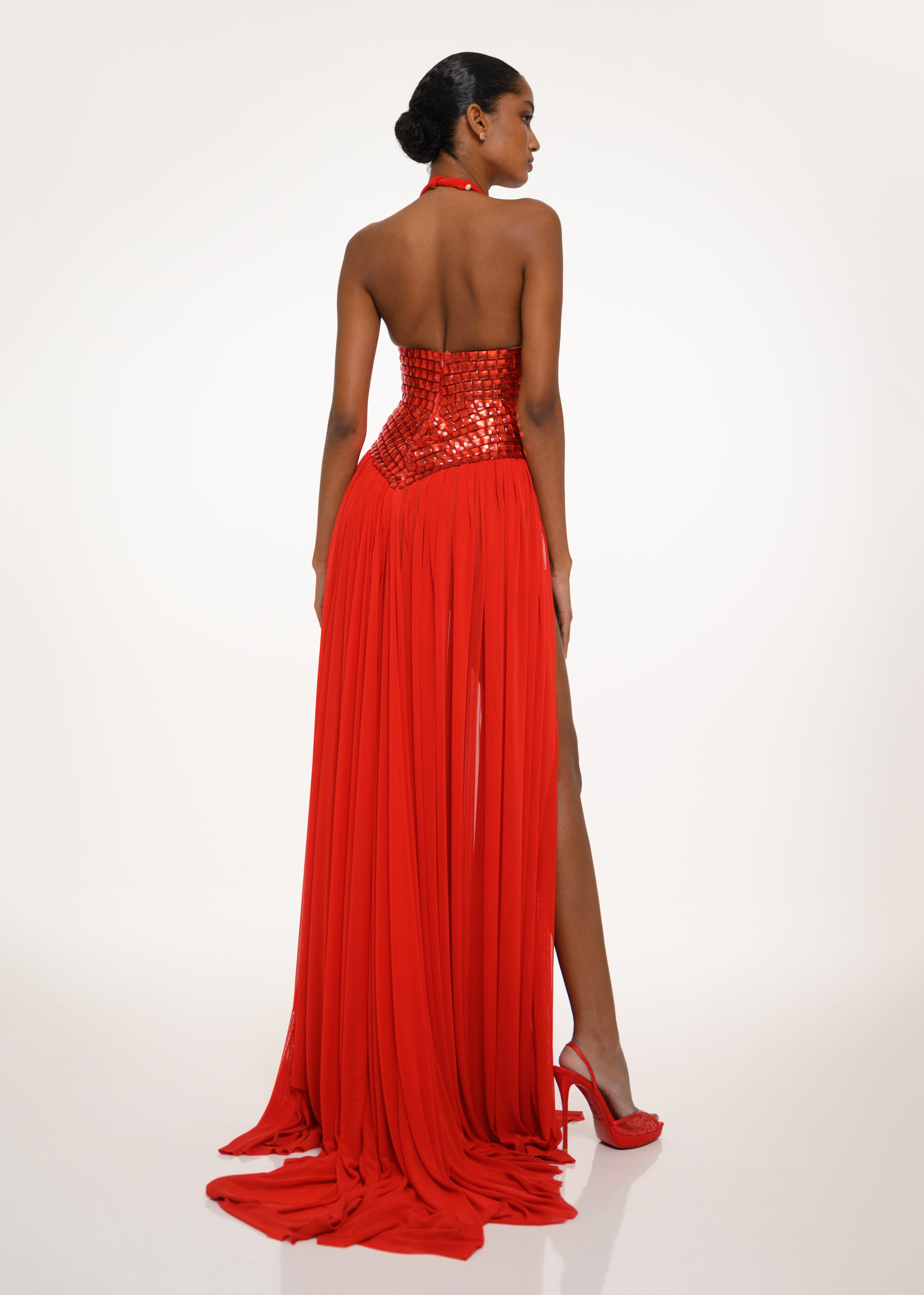 A daring red halter gown with a mirror-embellished corset and flowing pleated skirt — designed to command every room with confidence.