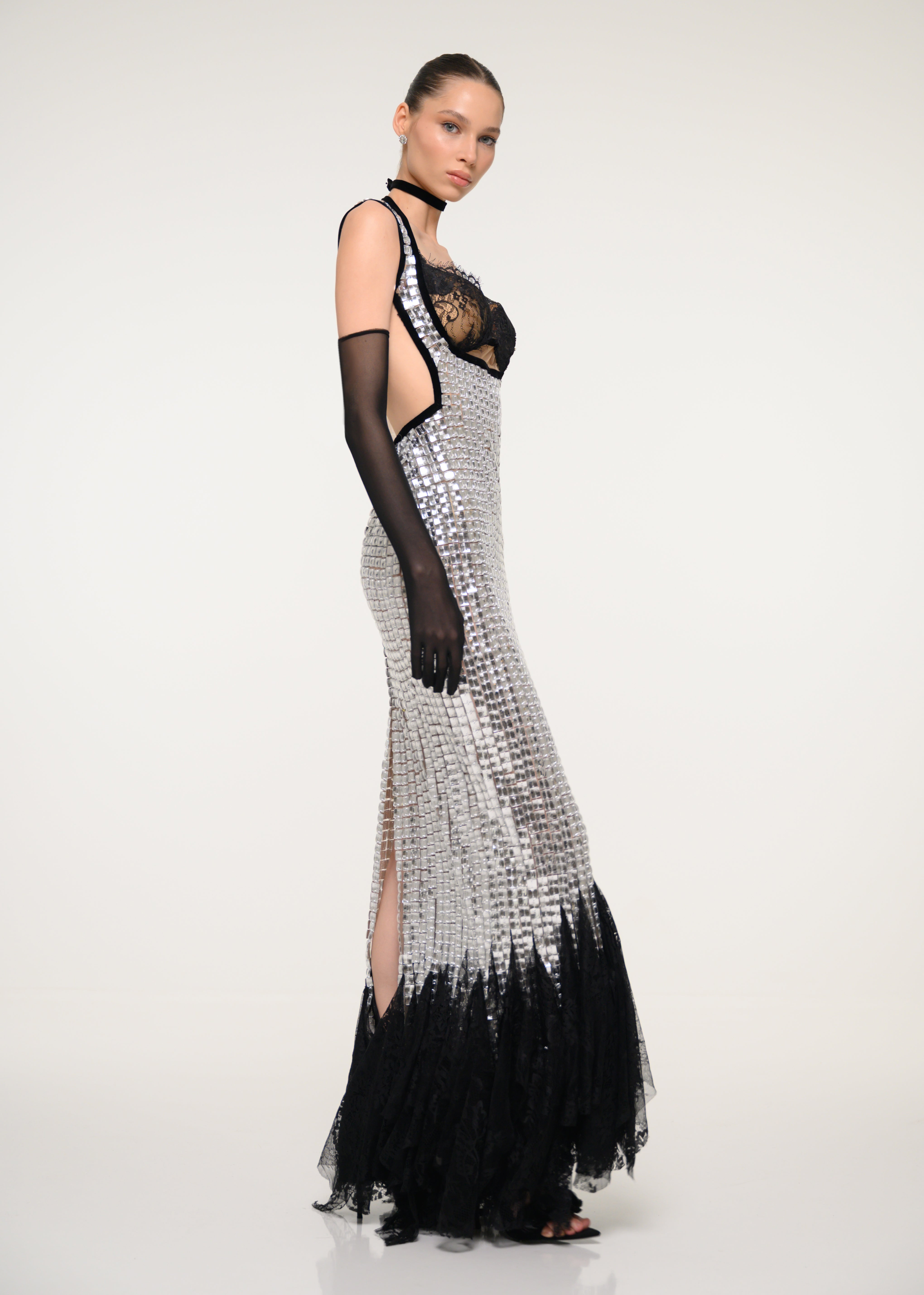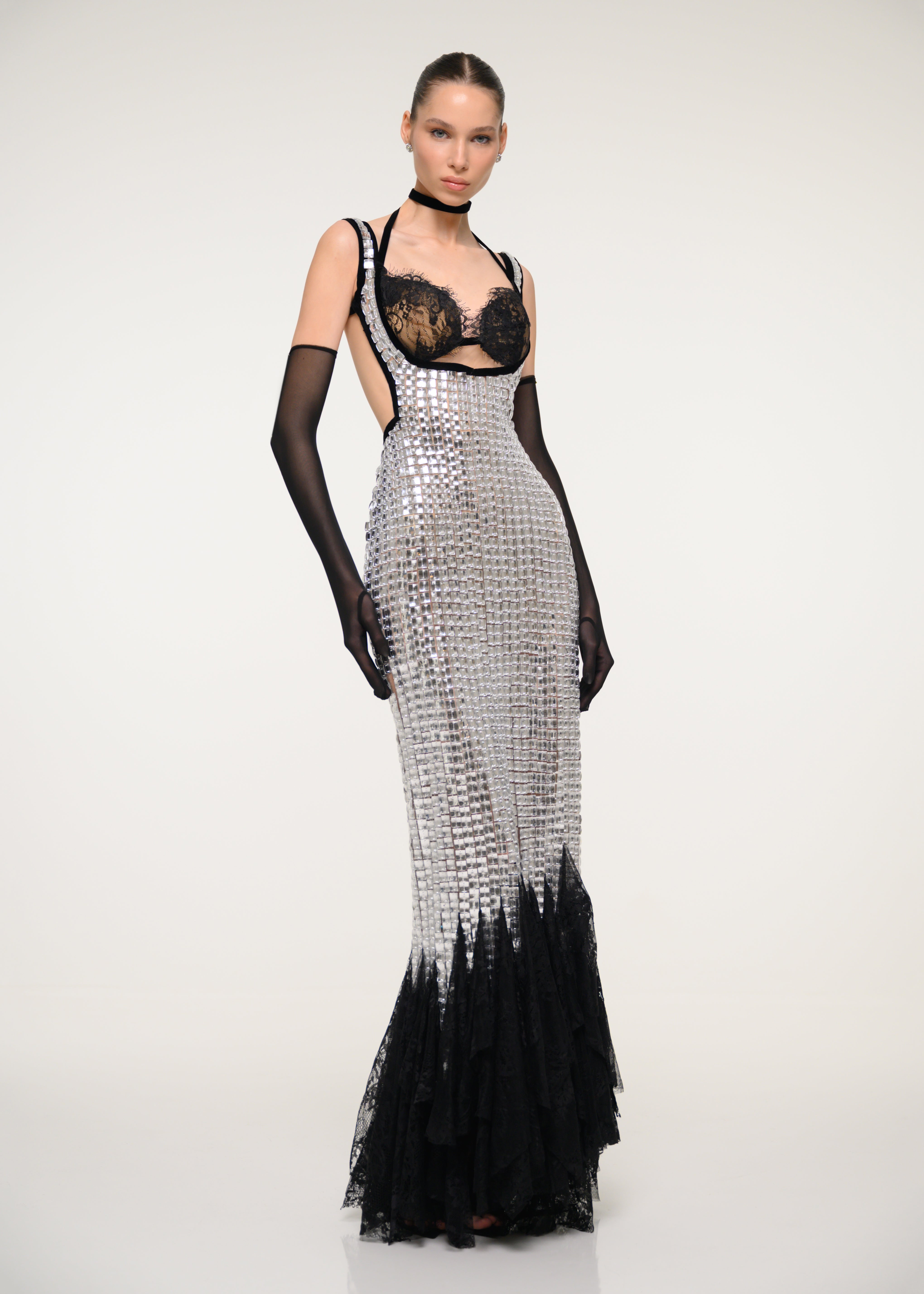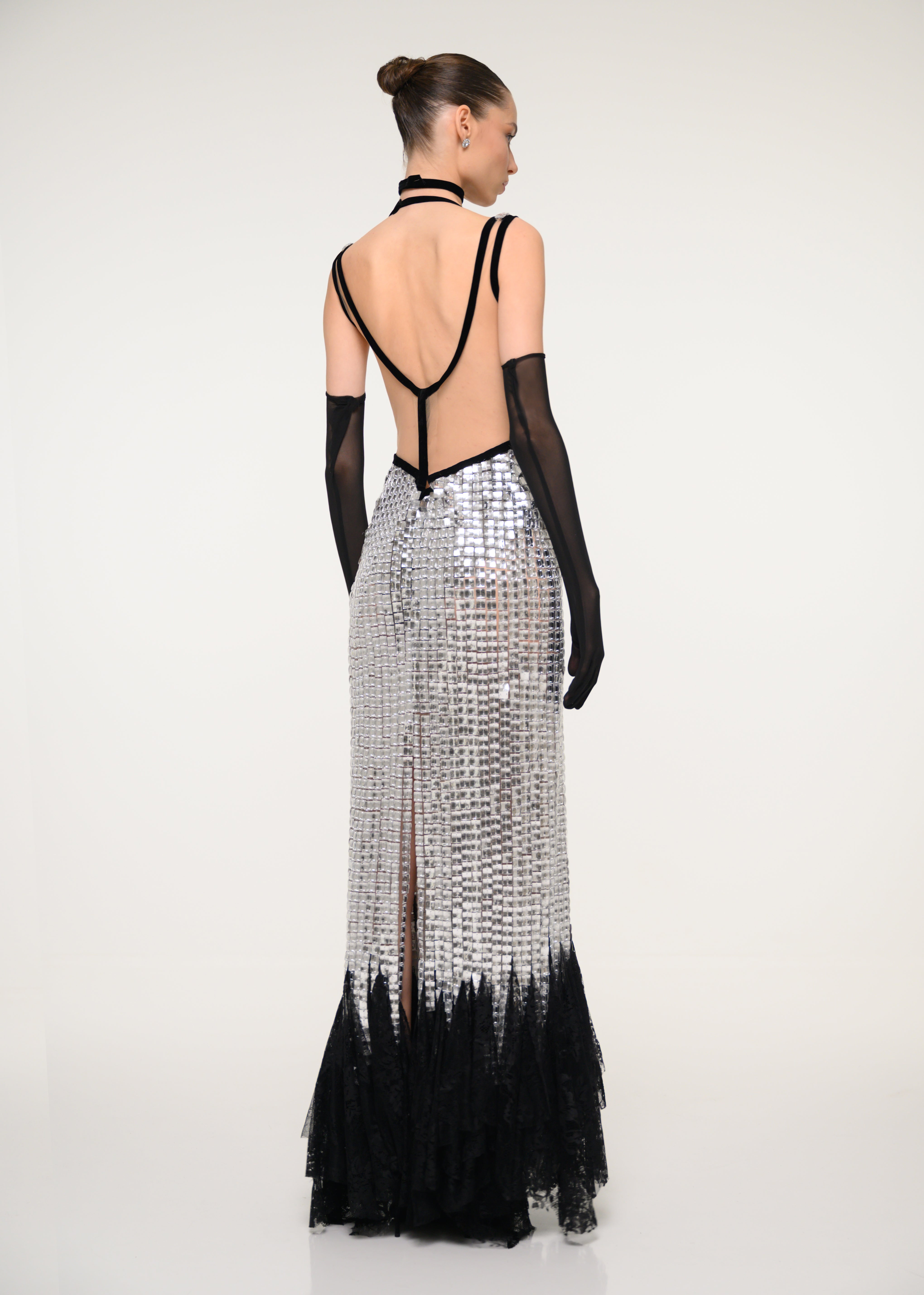 Silver and Black Sequin Gown with Satin Gloves