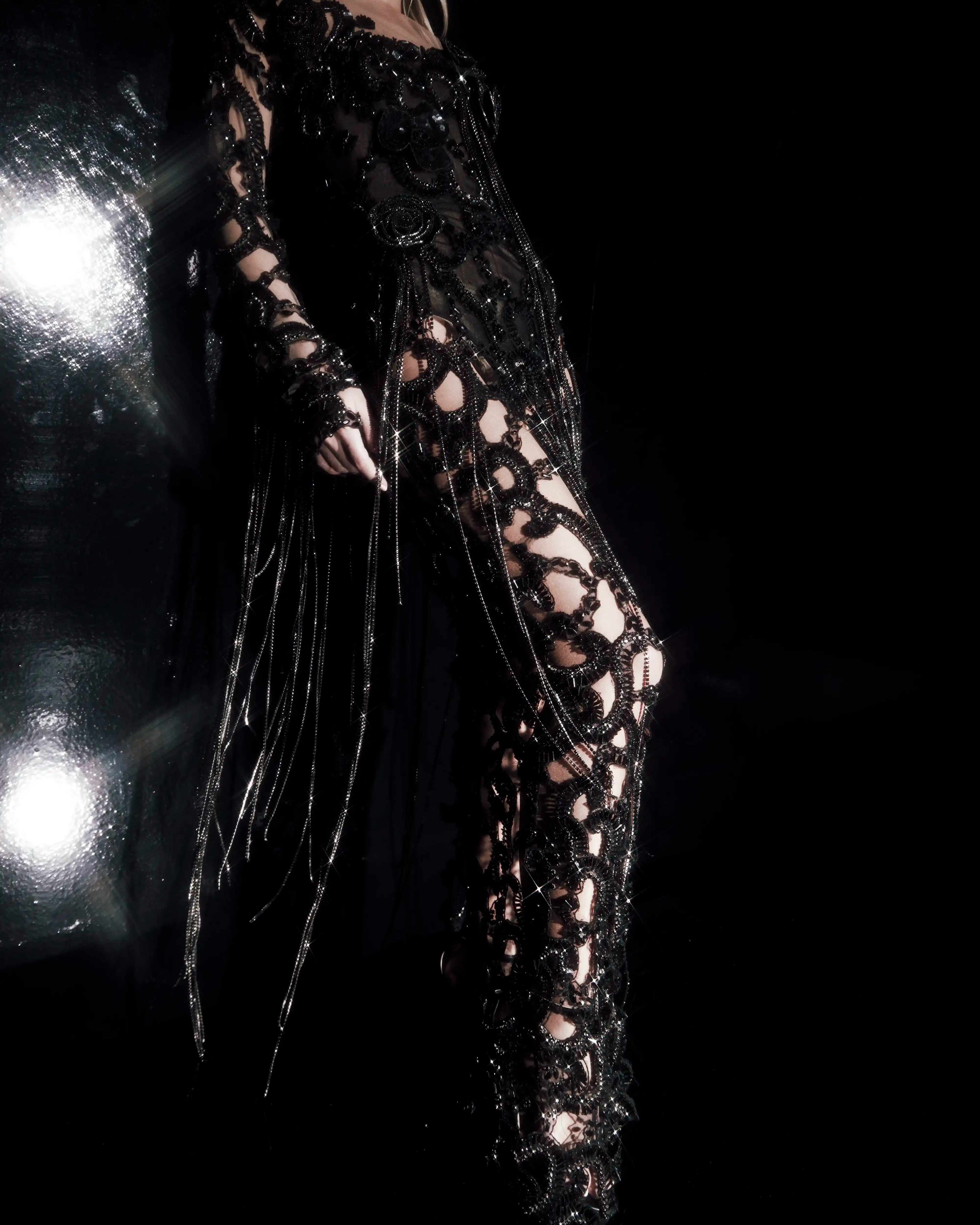 Asymmetrical Black Fabric Dress with Rhinestone Fringe Detail