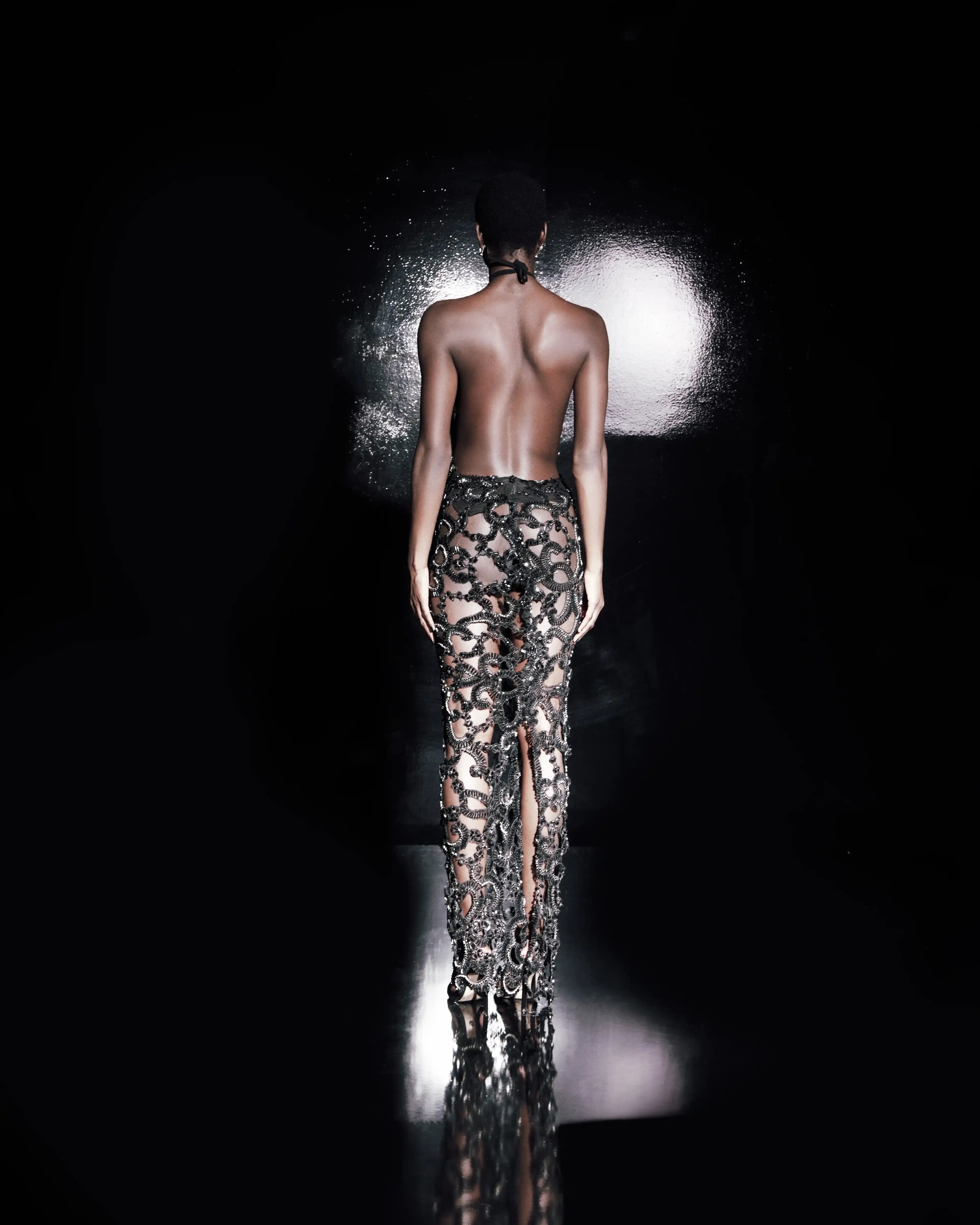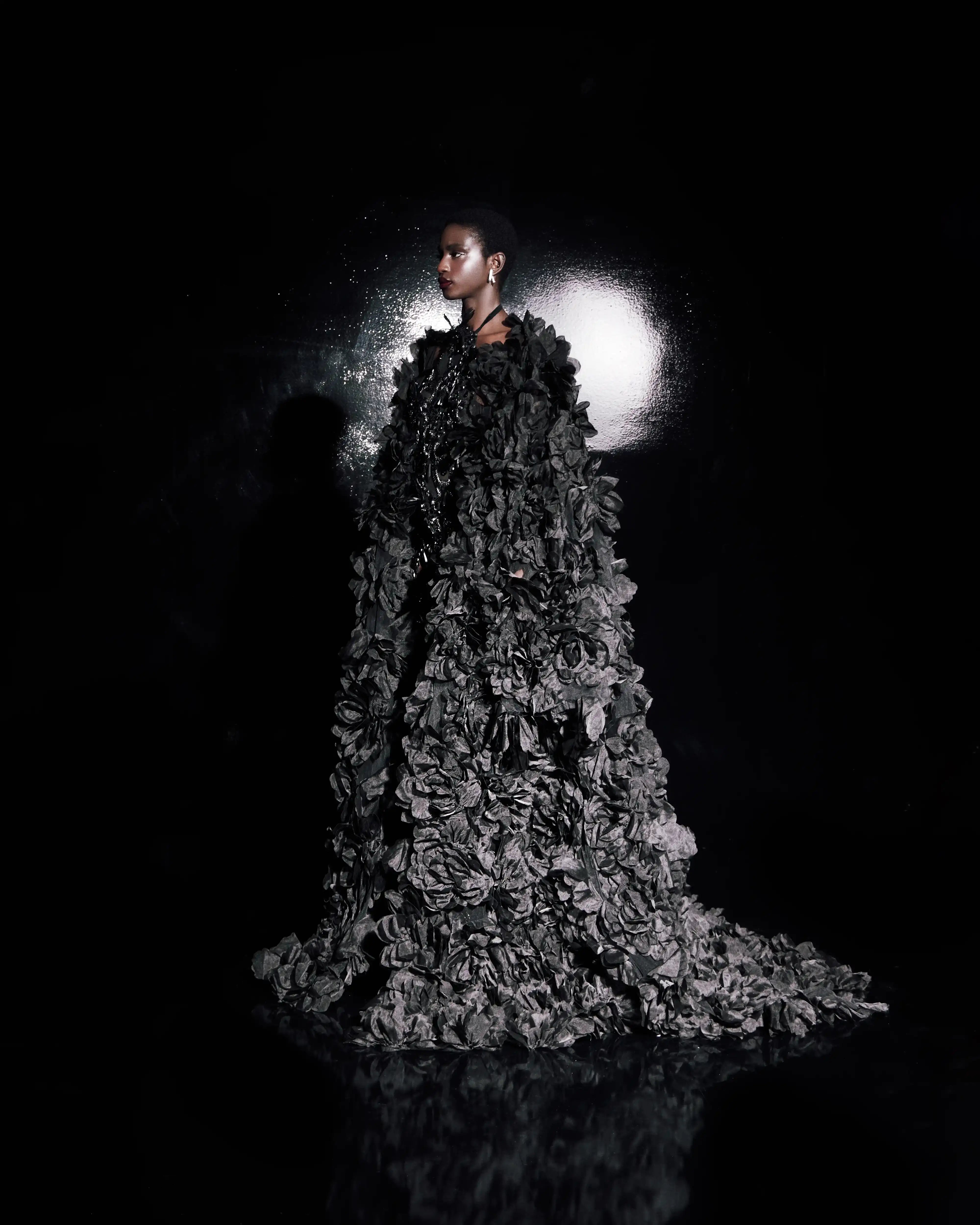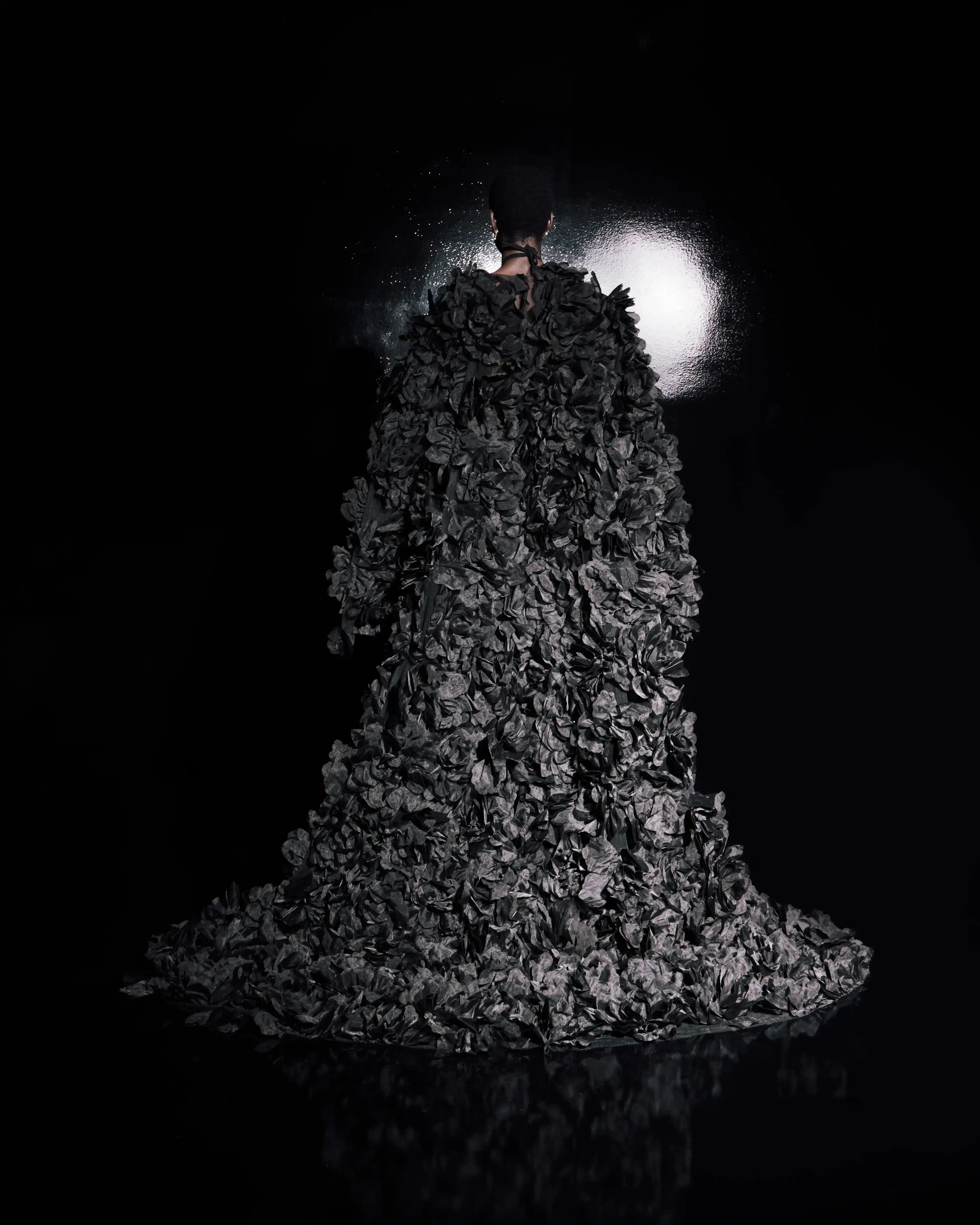 Halter Black Fabric Dress with Feather Detail and Voluminous Floral Ruffled Cape