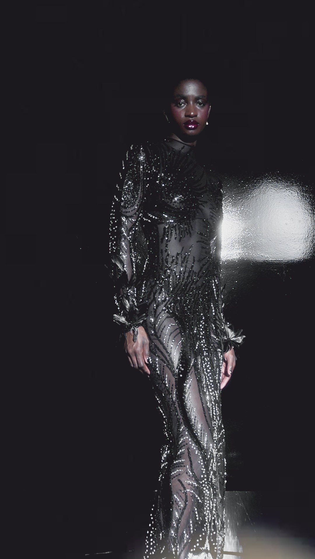 Semi-Transparent Black Fabric Long Sleeve Dress with Feather Cuffed Sleeves