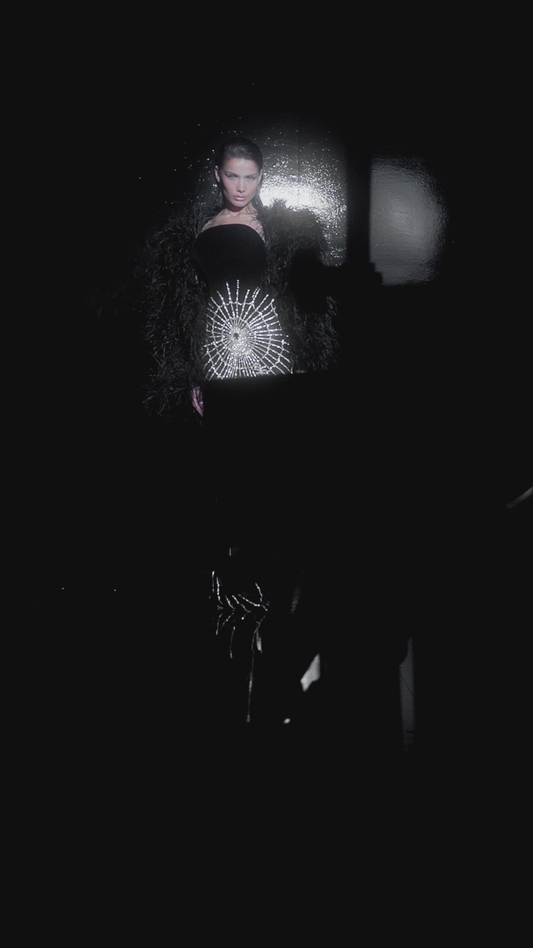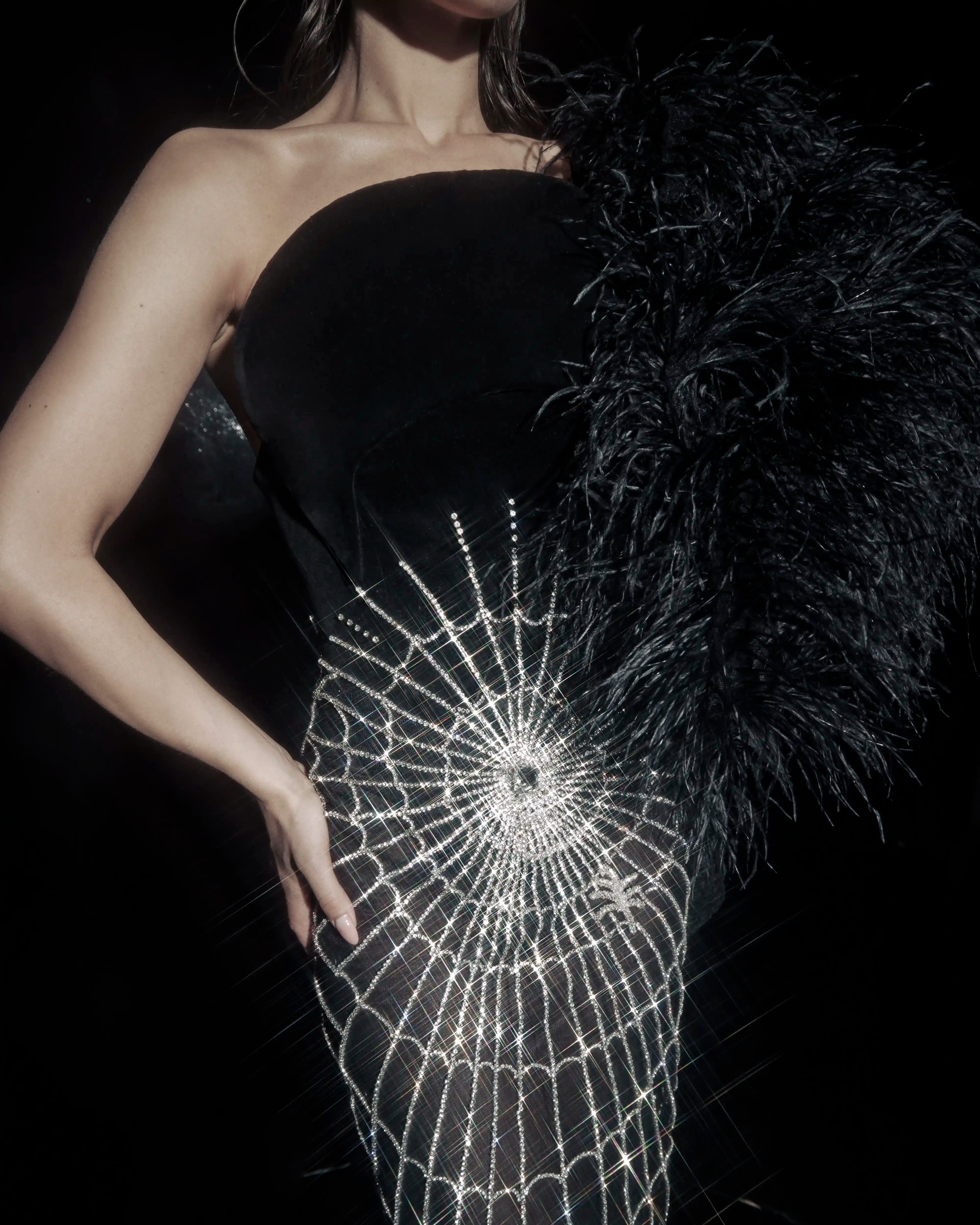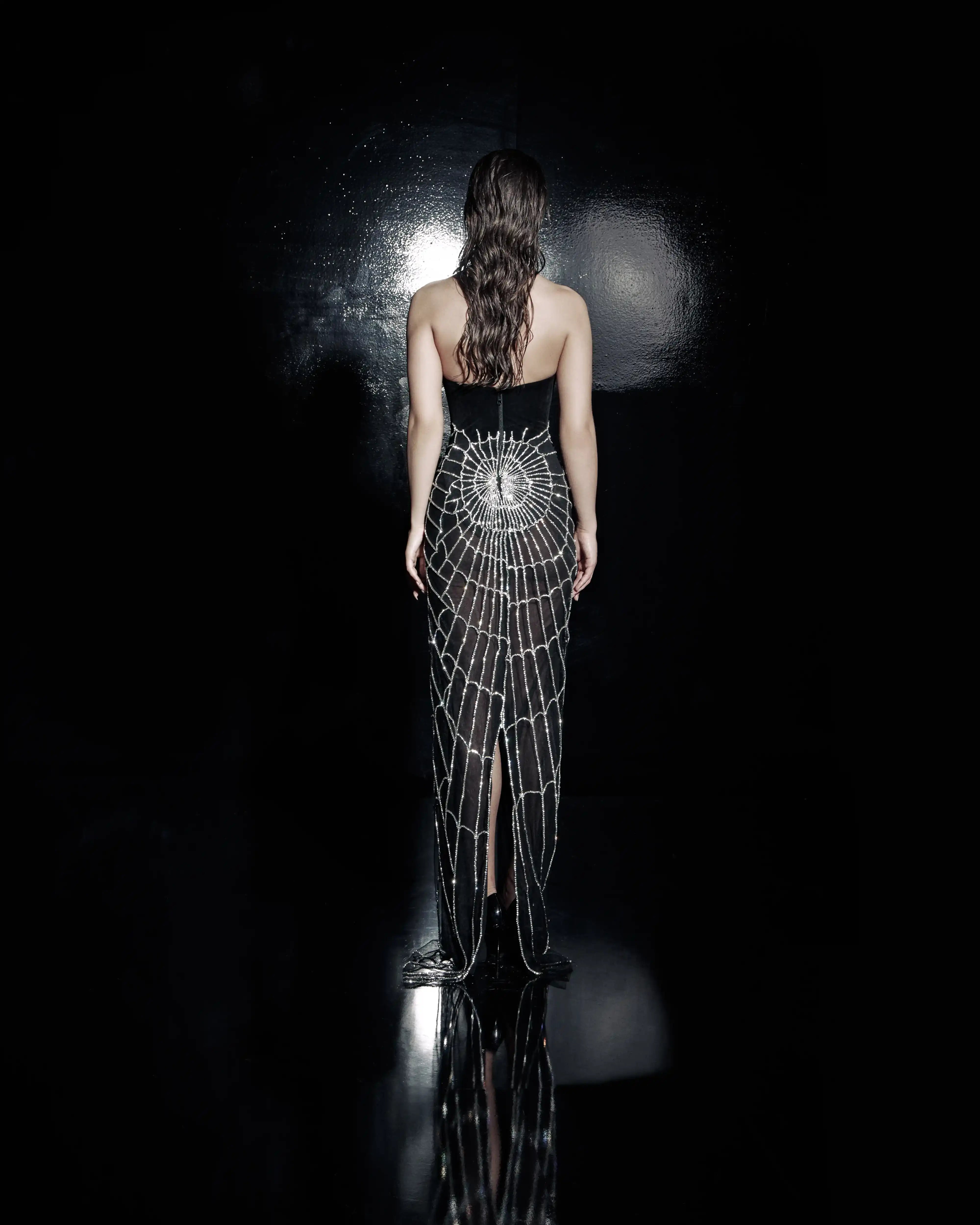 Strapless Black Dress with Semi-Transparent Skirt and Cascading Silver Rhinestones in Web Pattern