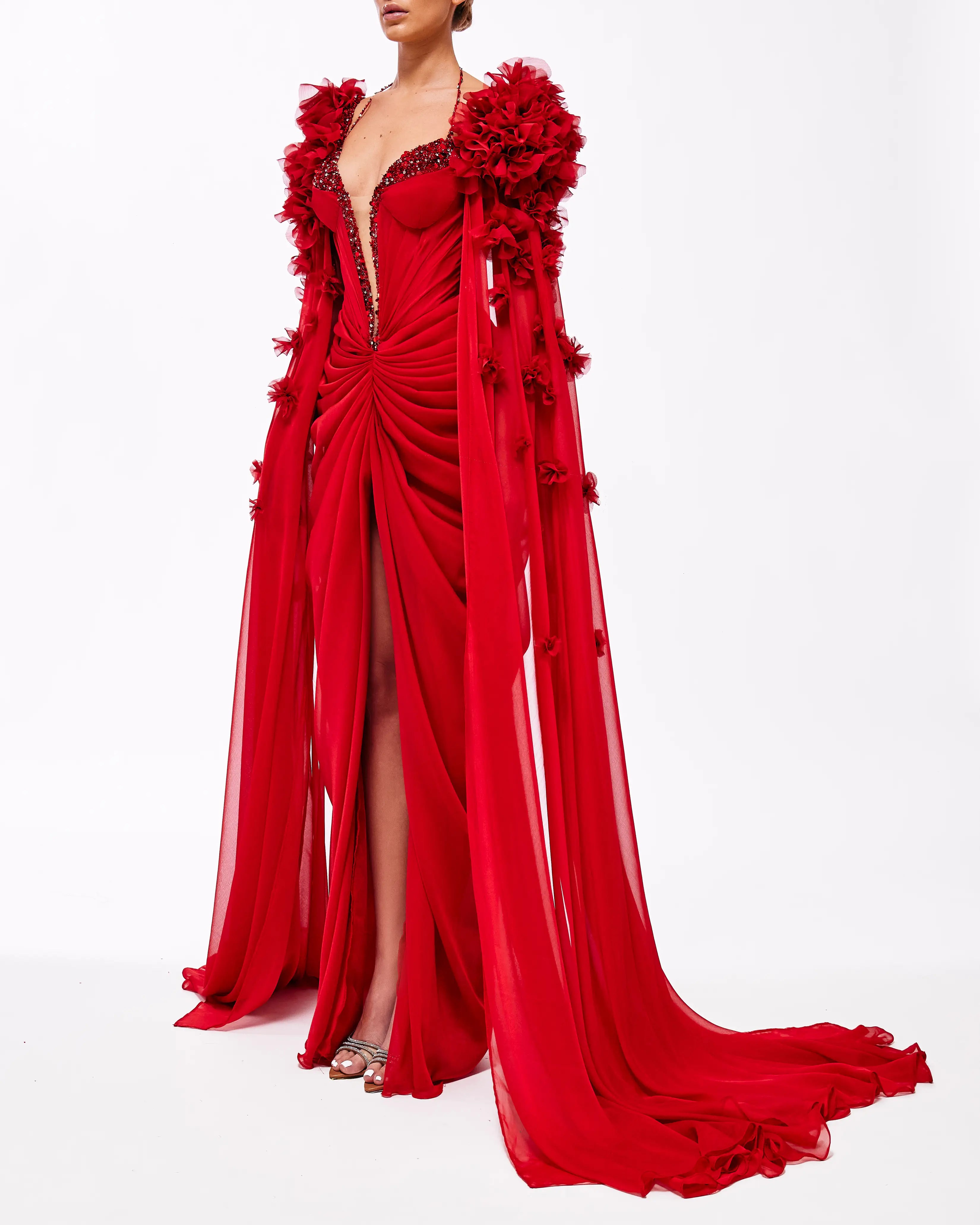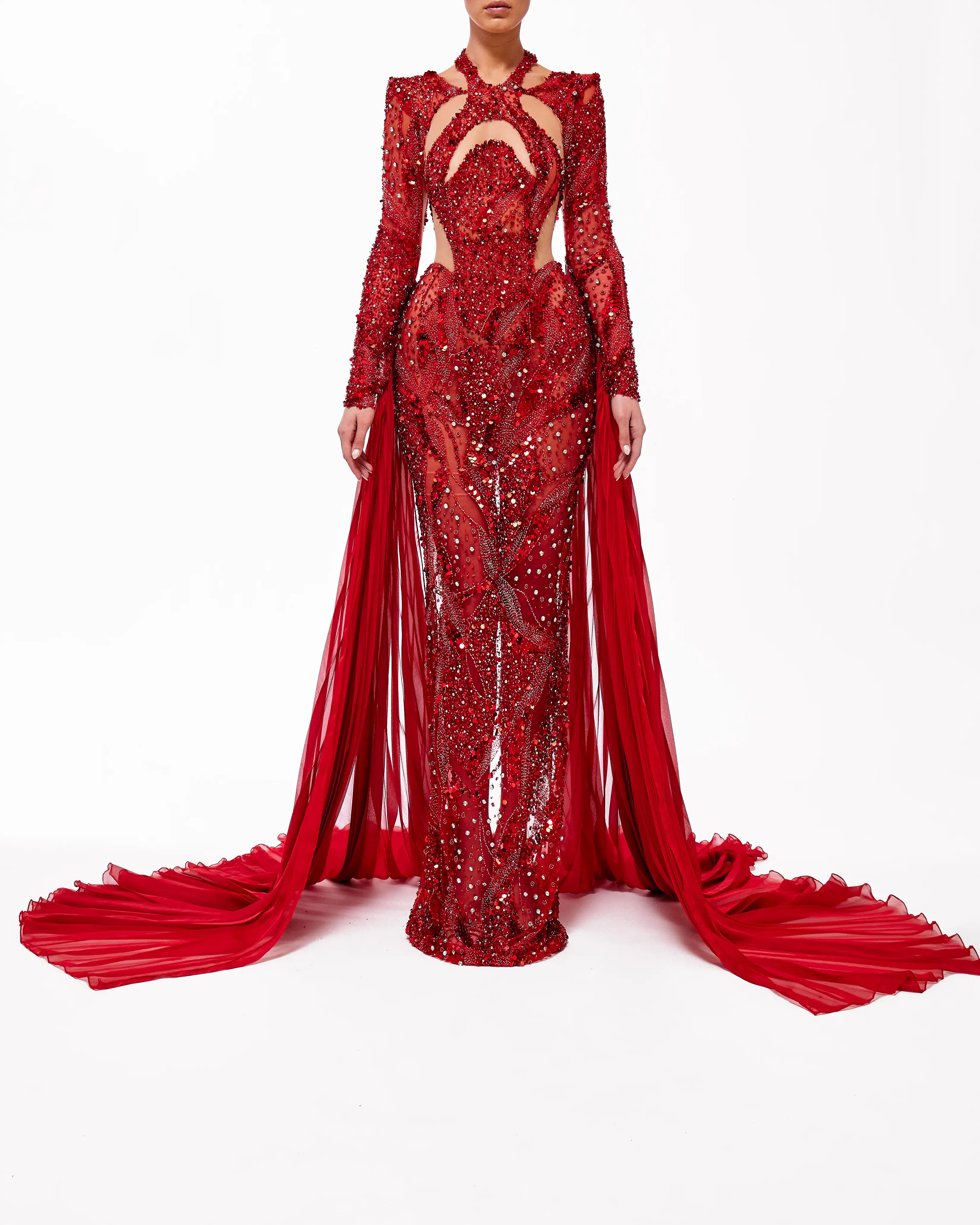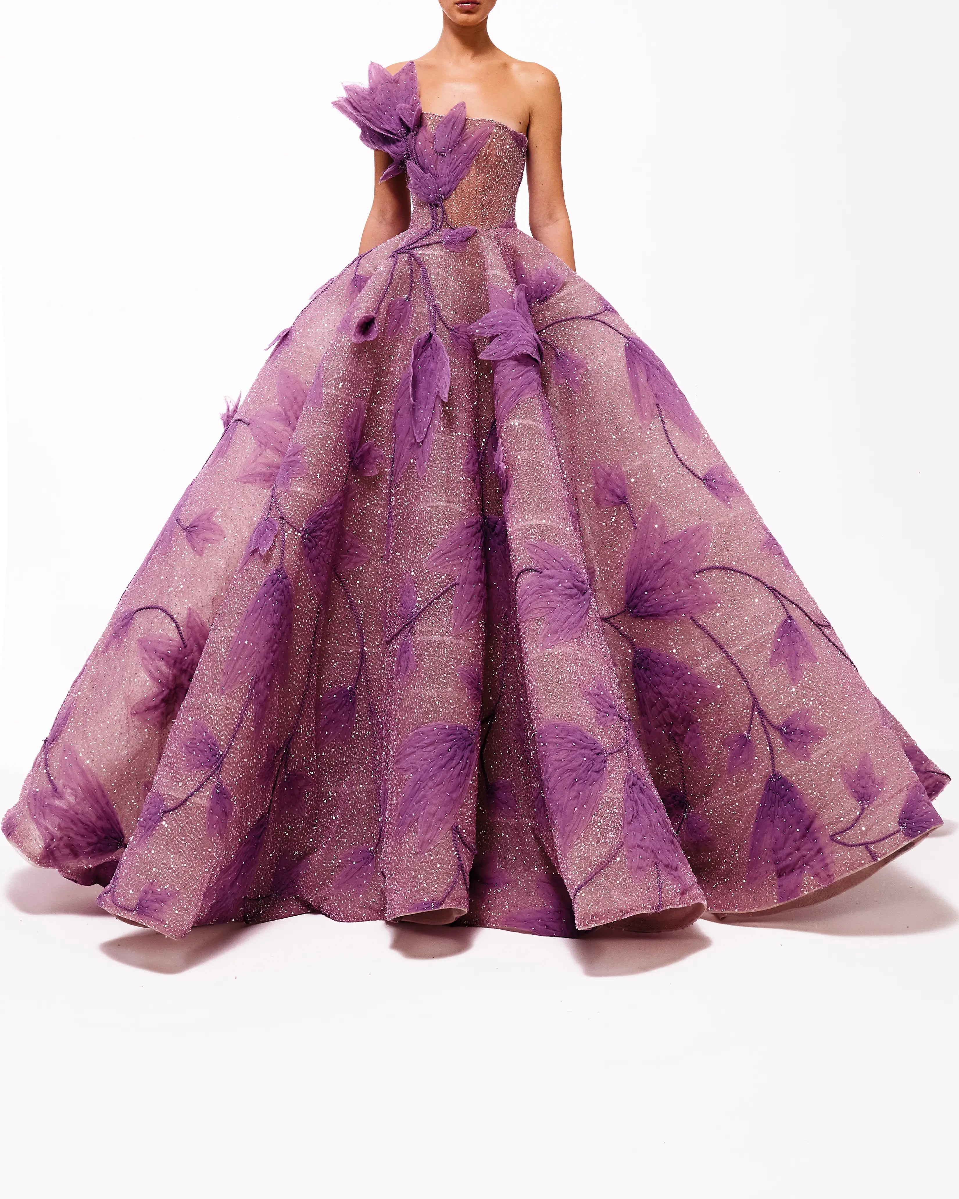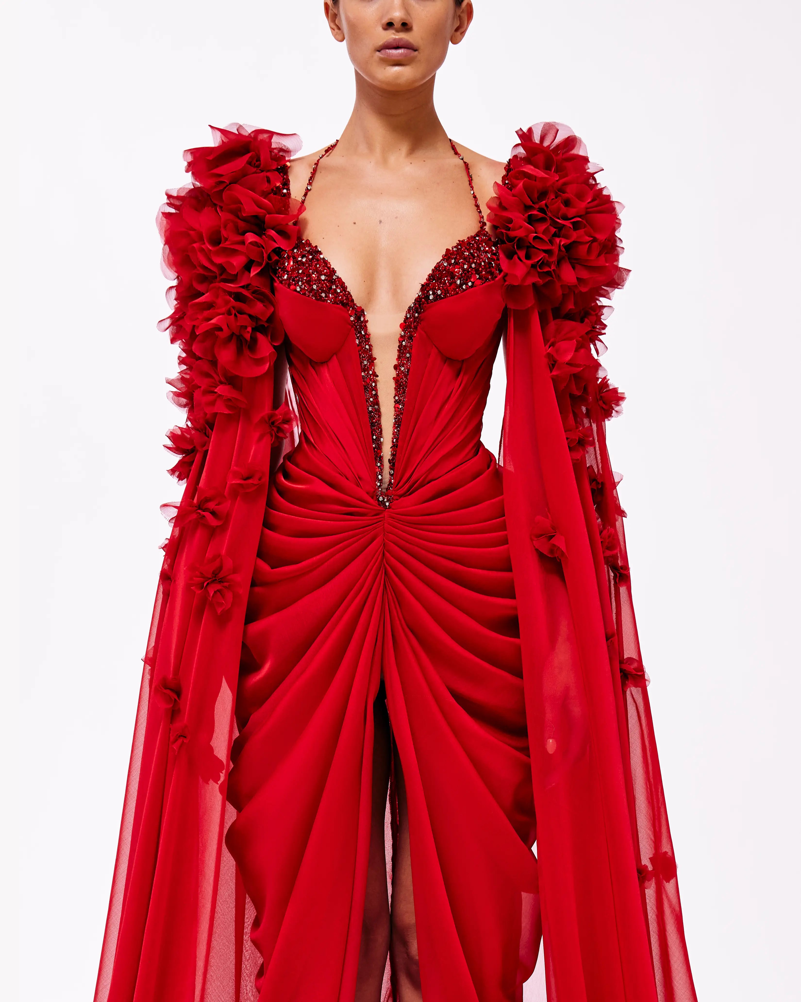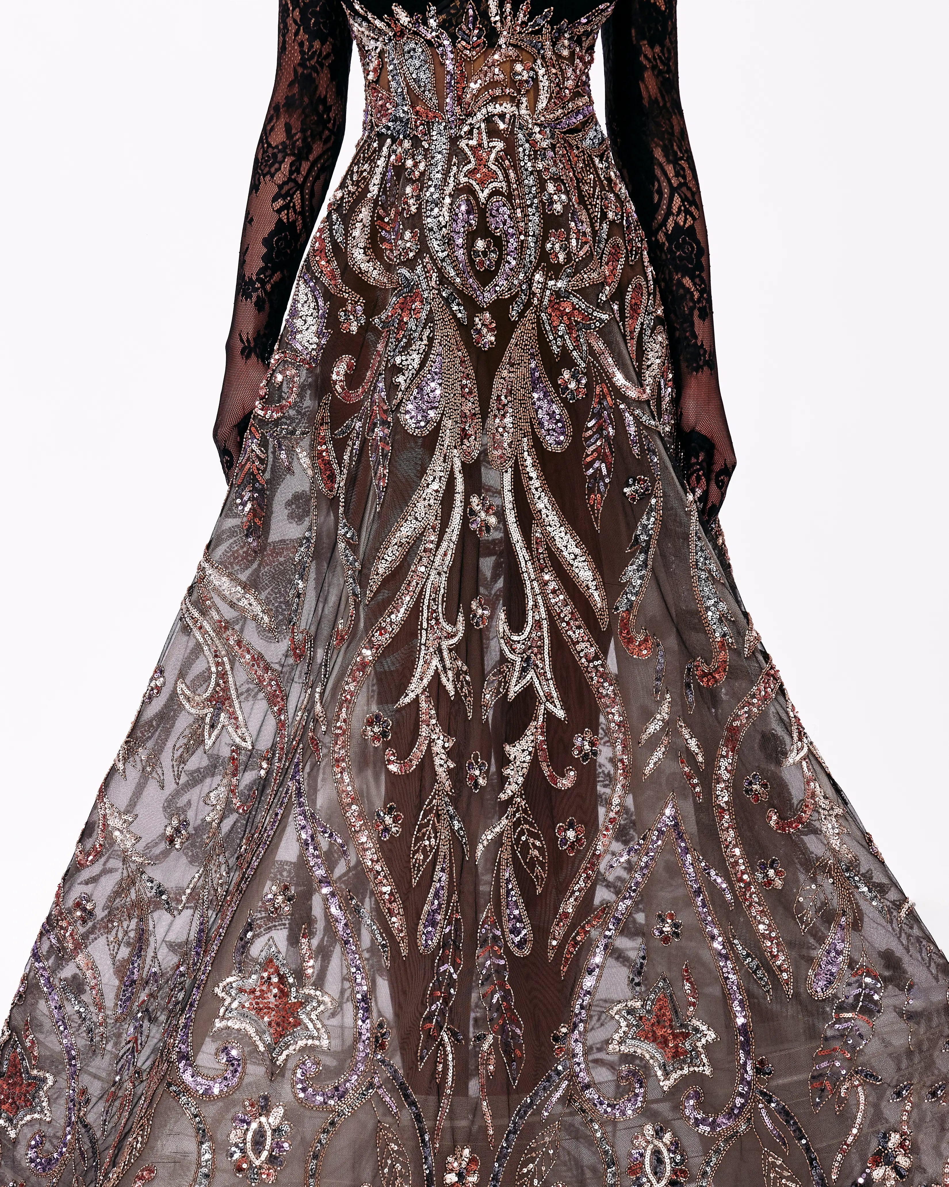 A collection full of life, Haute Allure brings your imagination to reality. With a vast selection in hues, these gowns provide ample options for extravagant events. This collection is elegantly maximalistic, with the floral lace material, cape aspect, and other unique features. Enter a world of colorful drama through Valdrin Sahiti.