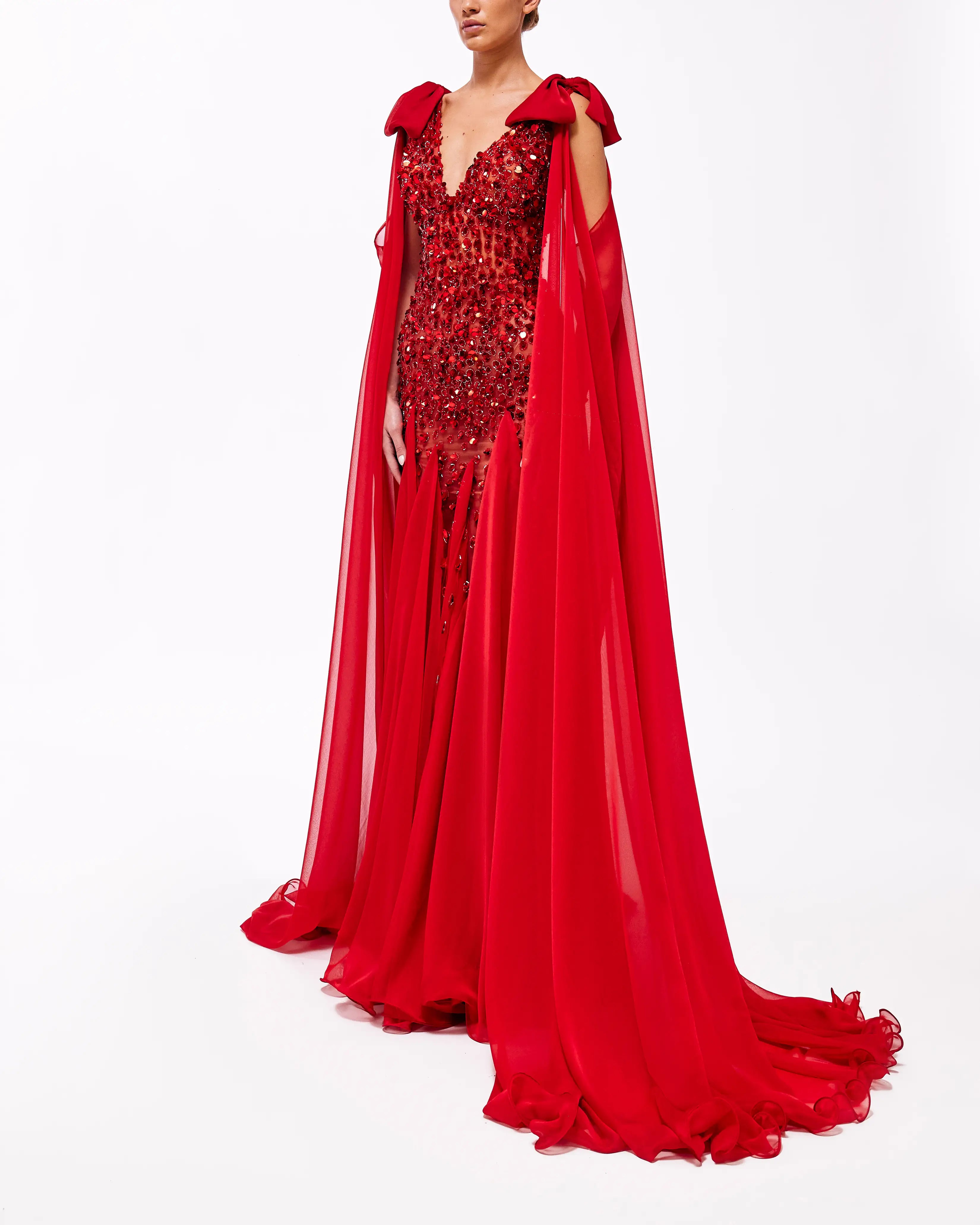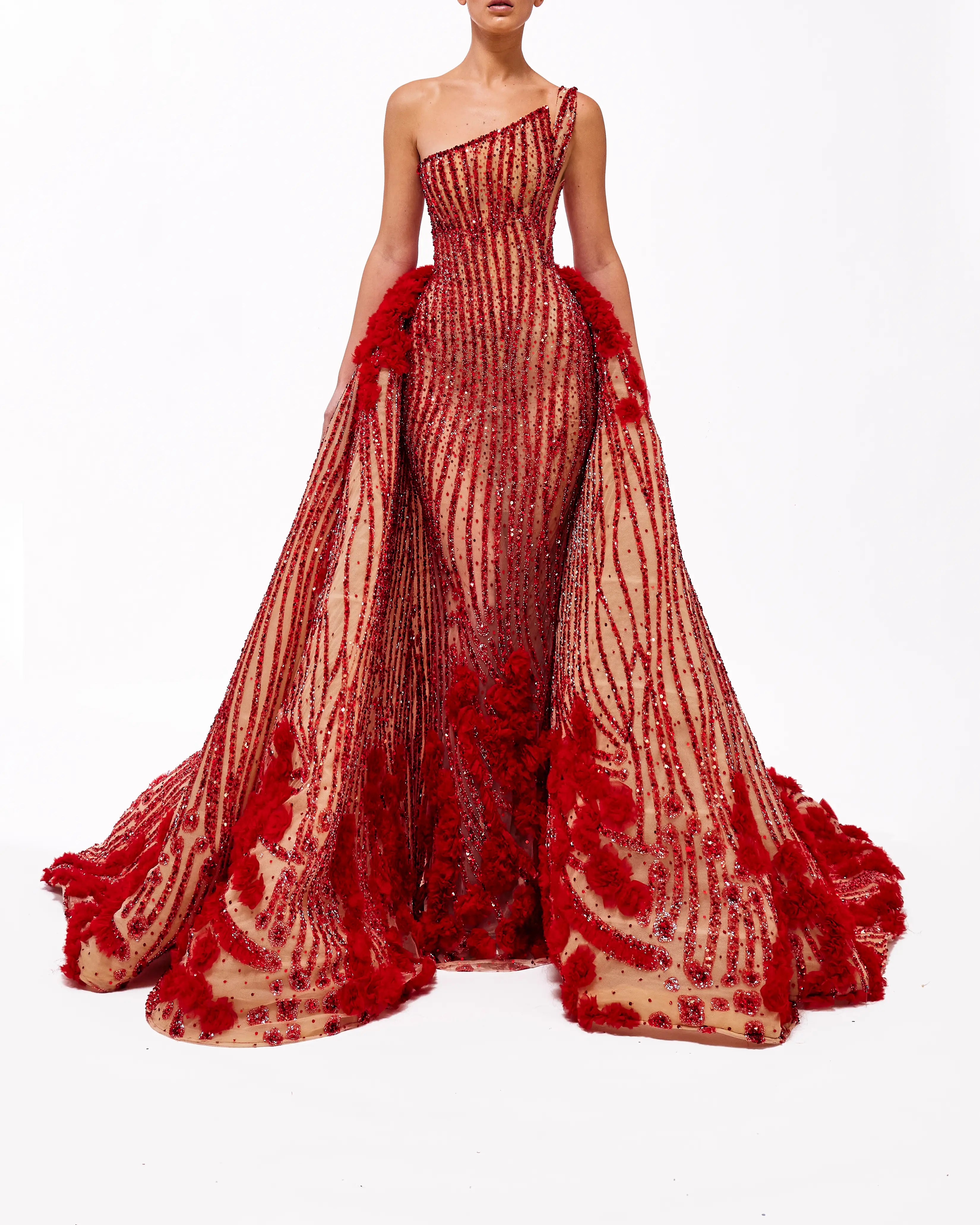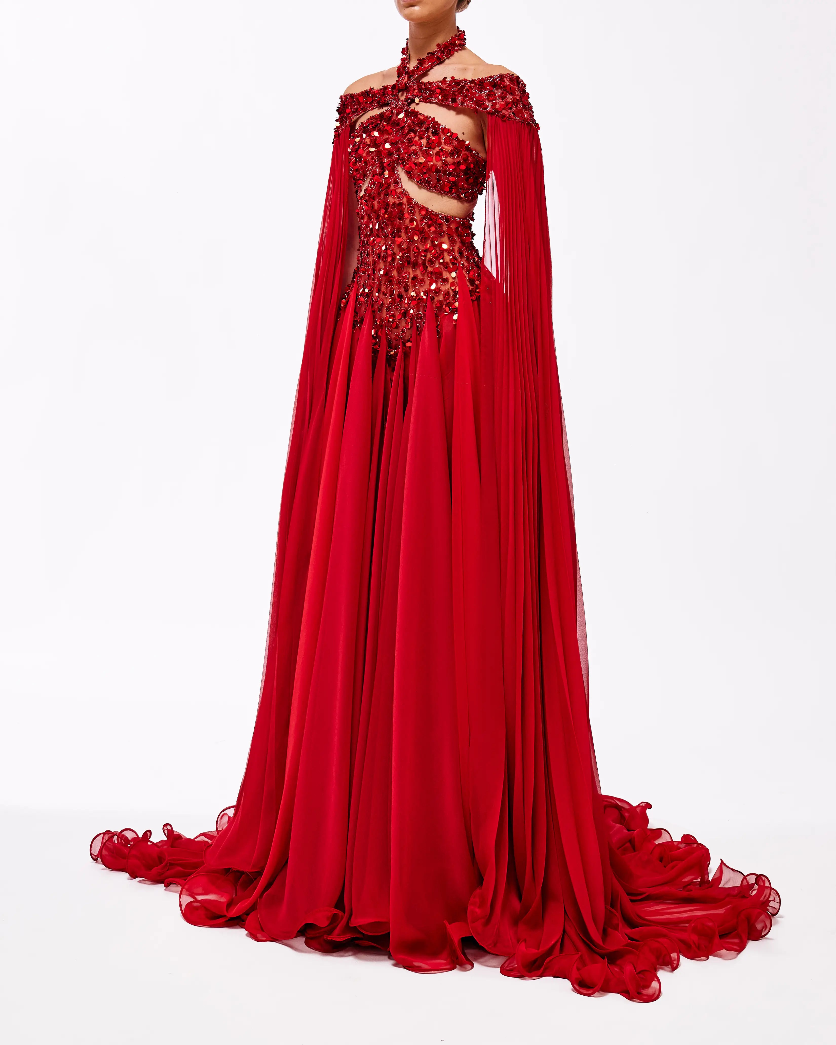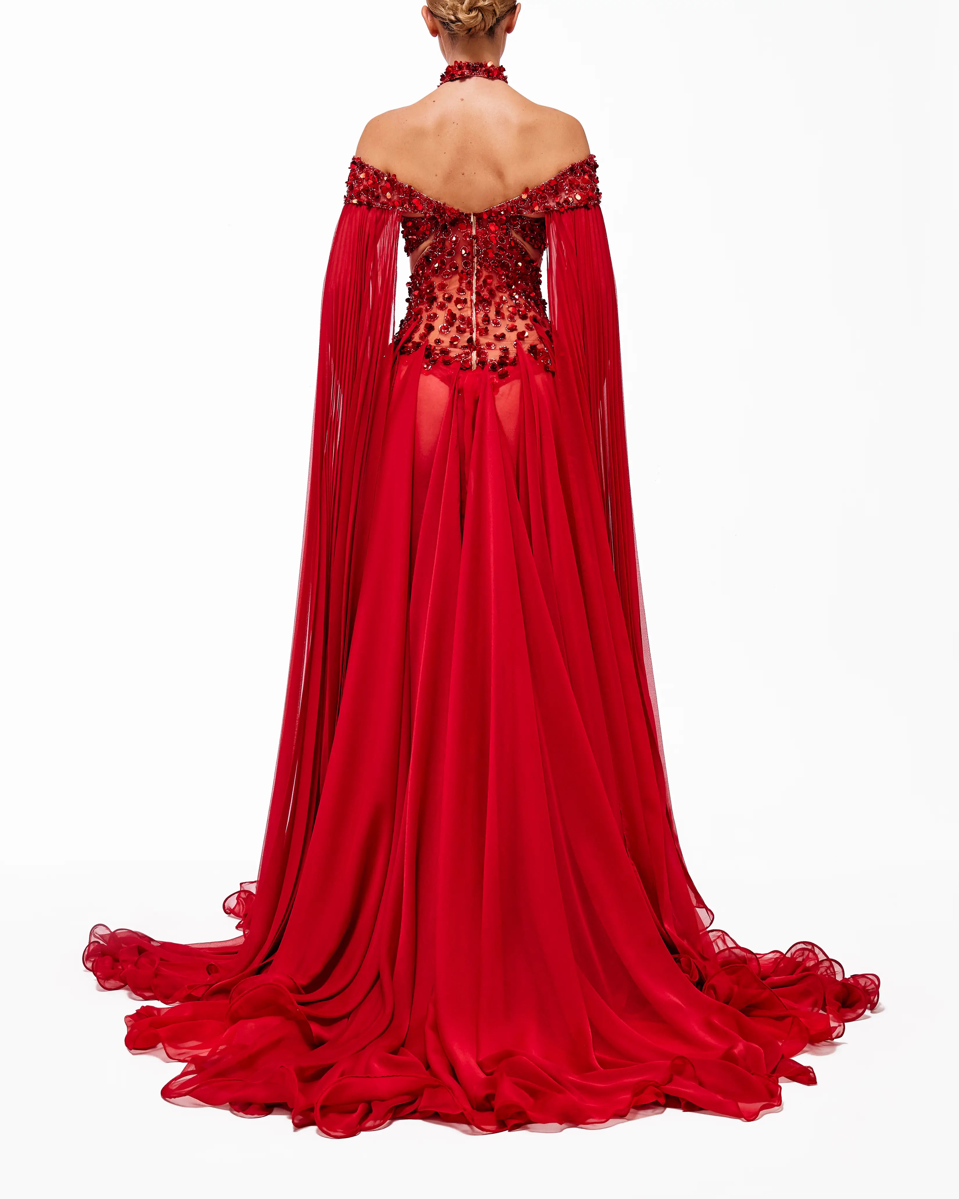 A collection full of life, Haute Allure brings your imagination to reality. With a vast selection in hues, these gowns provide ample options for extravagant events. This collection is elegantly maximalistic, with the floral lace material, cape aspect, and other unique features. Enter a world of colorful drama through Valdrin Sahiti.