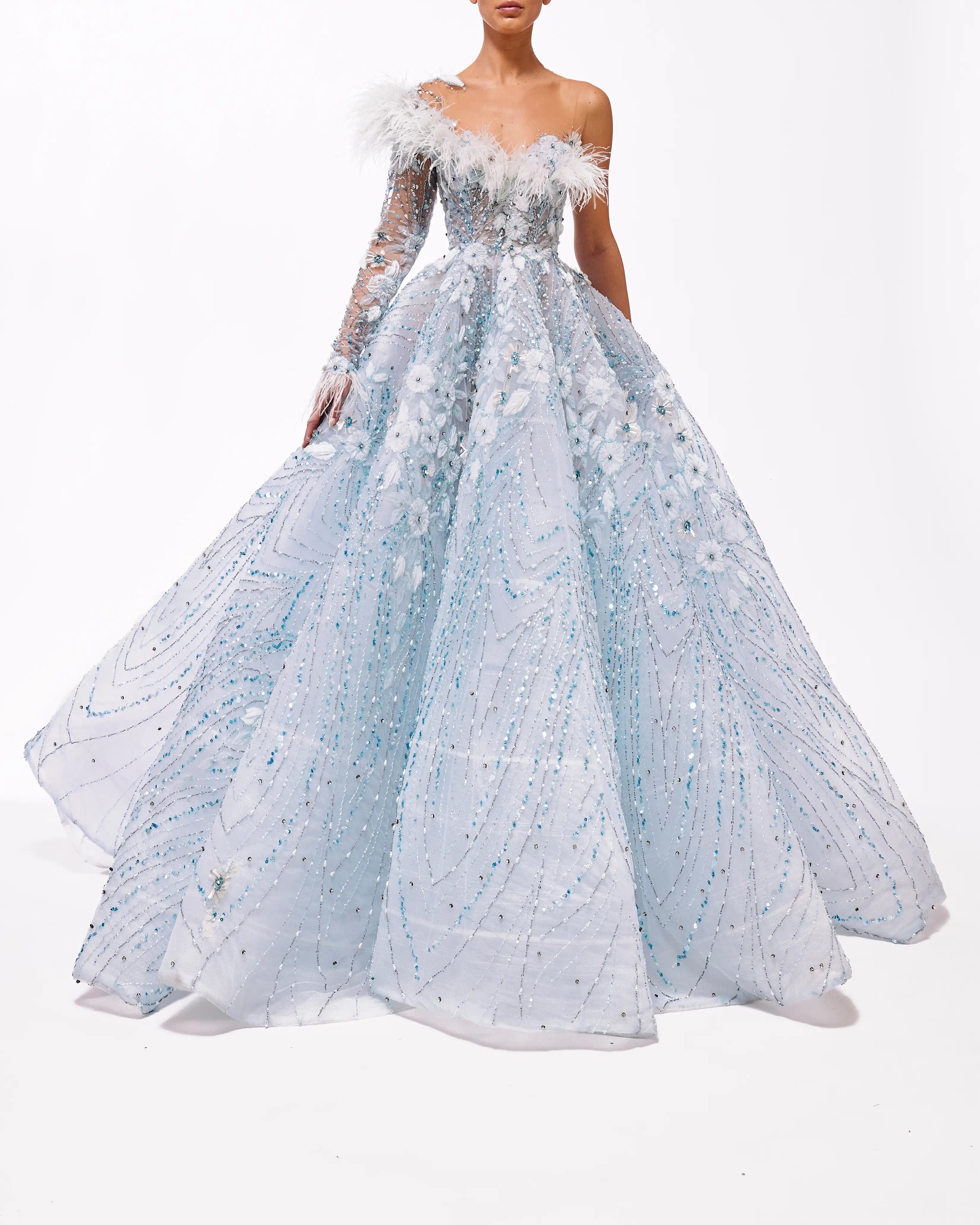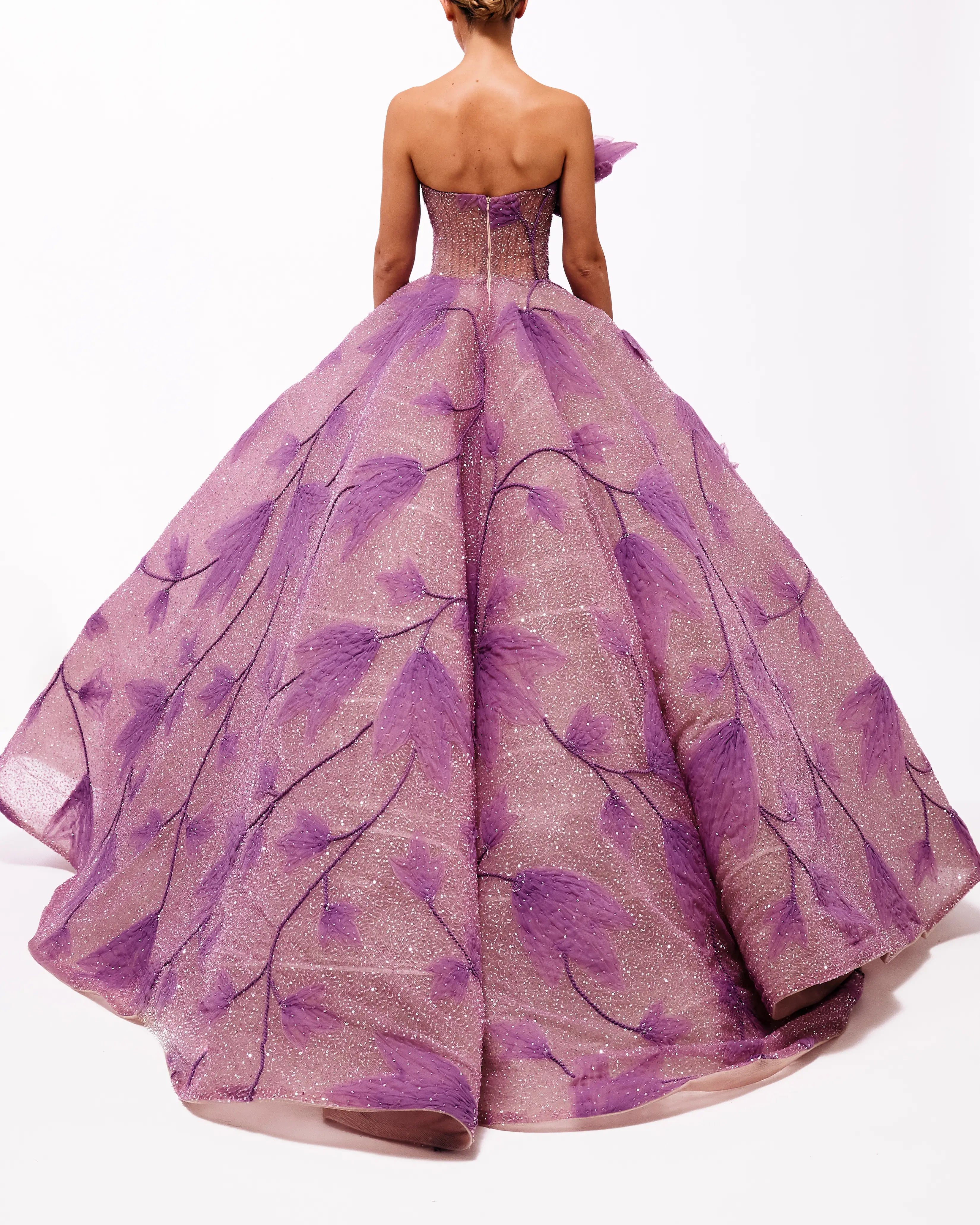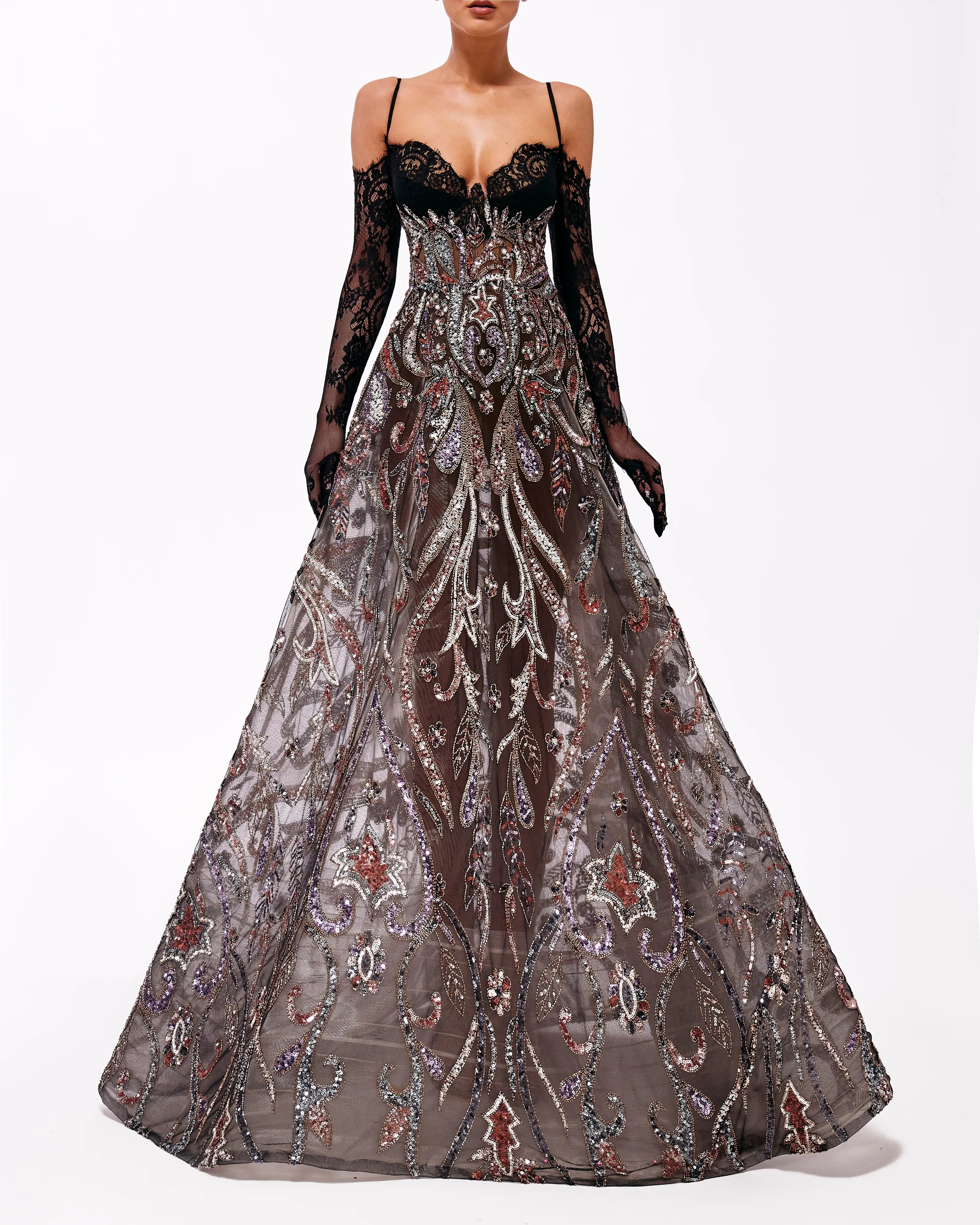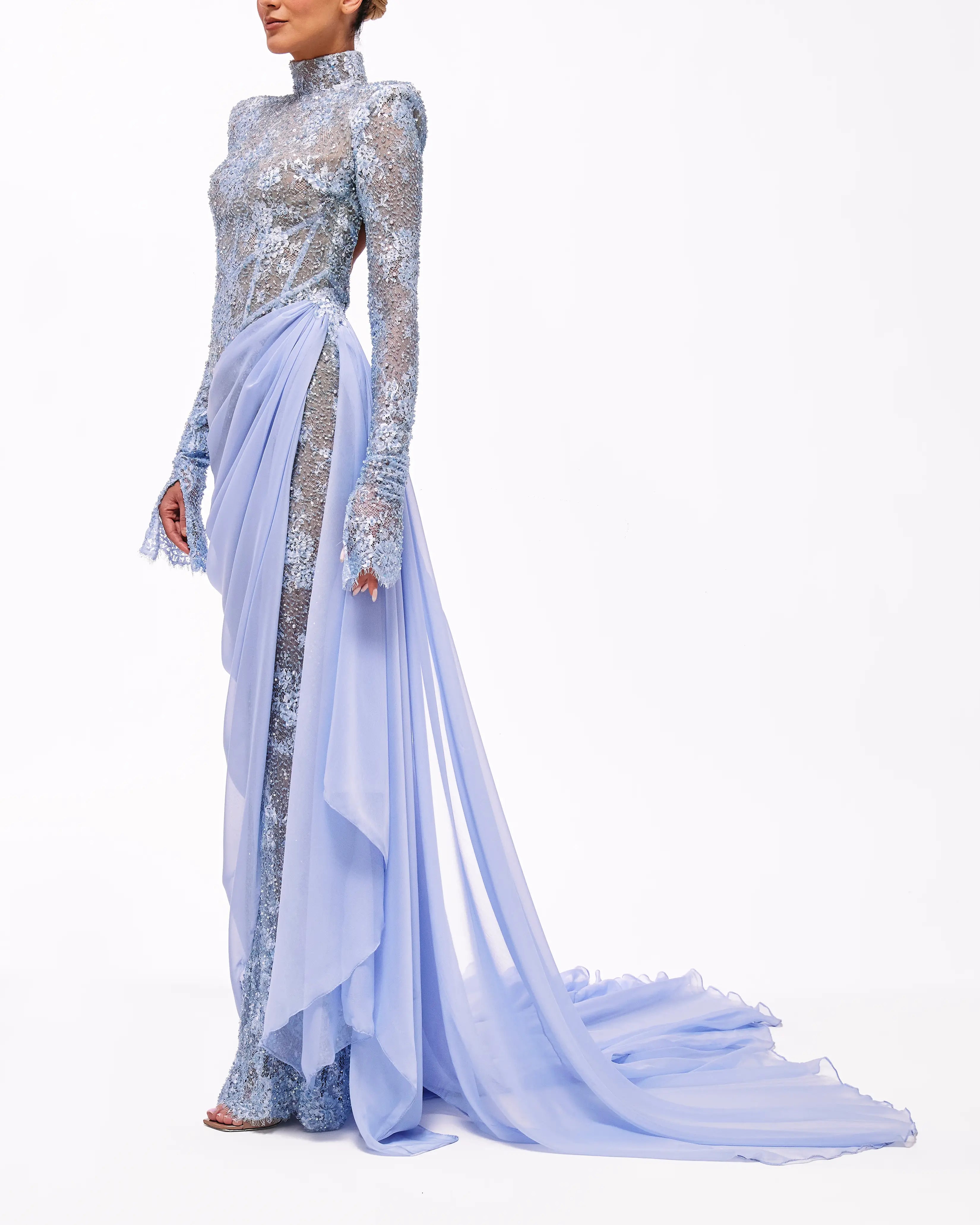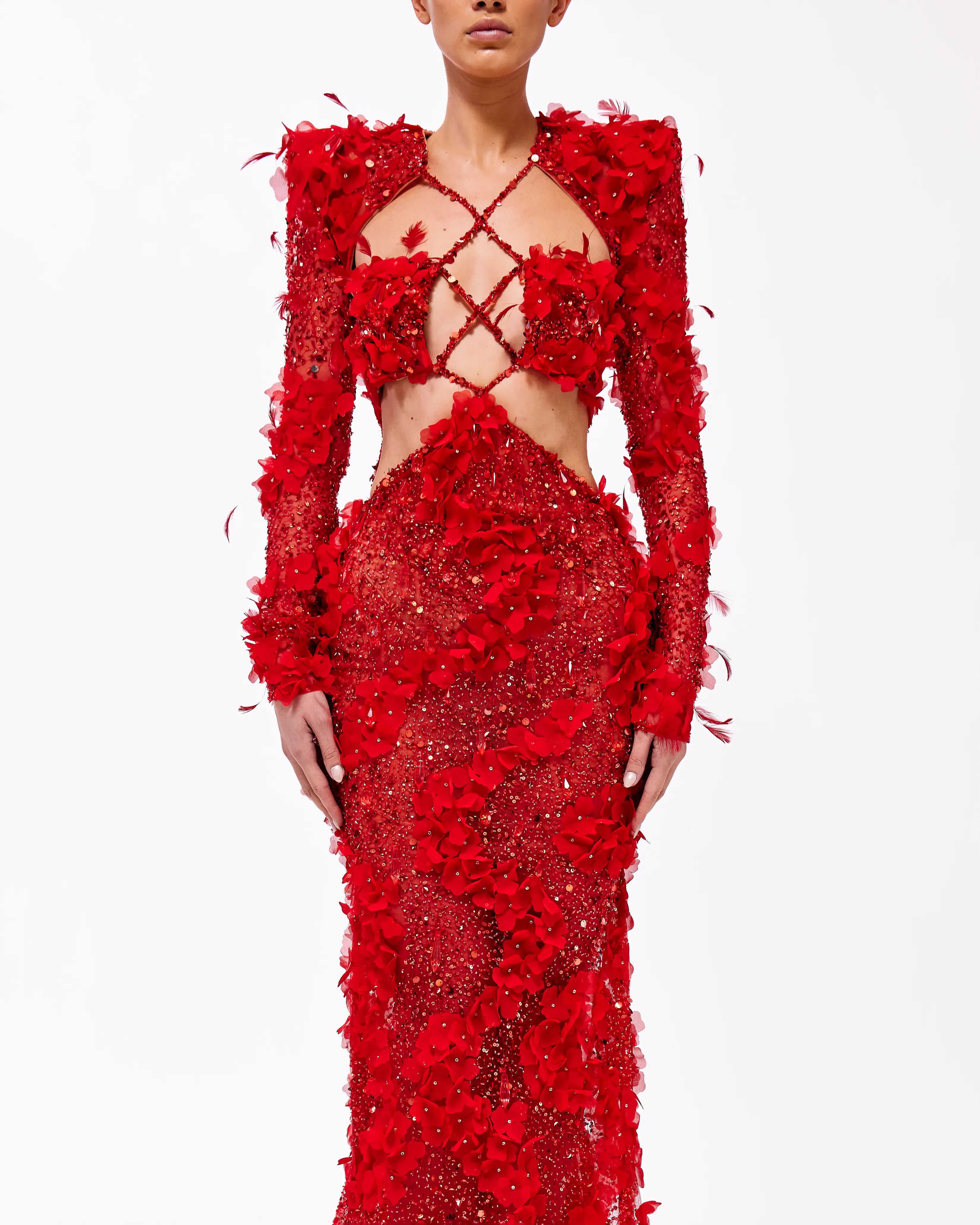 A collection full of life, Haute Allure brings your imagination to reality. With a vast selection in hues, these gowns provide ample options for extravagant events. This collection is elegantly maximalistic, with the floral lace material, cape aspect, and other unique features. Enter a world of colorful drama through Valdrin Sahiti.