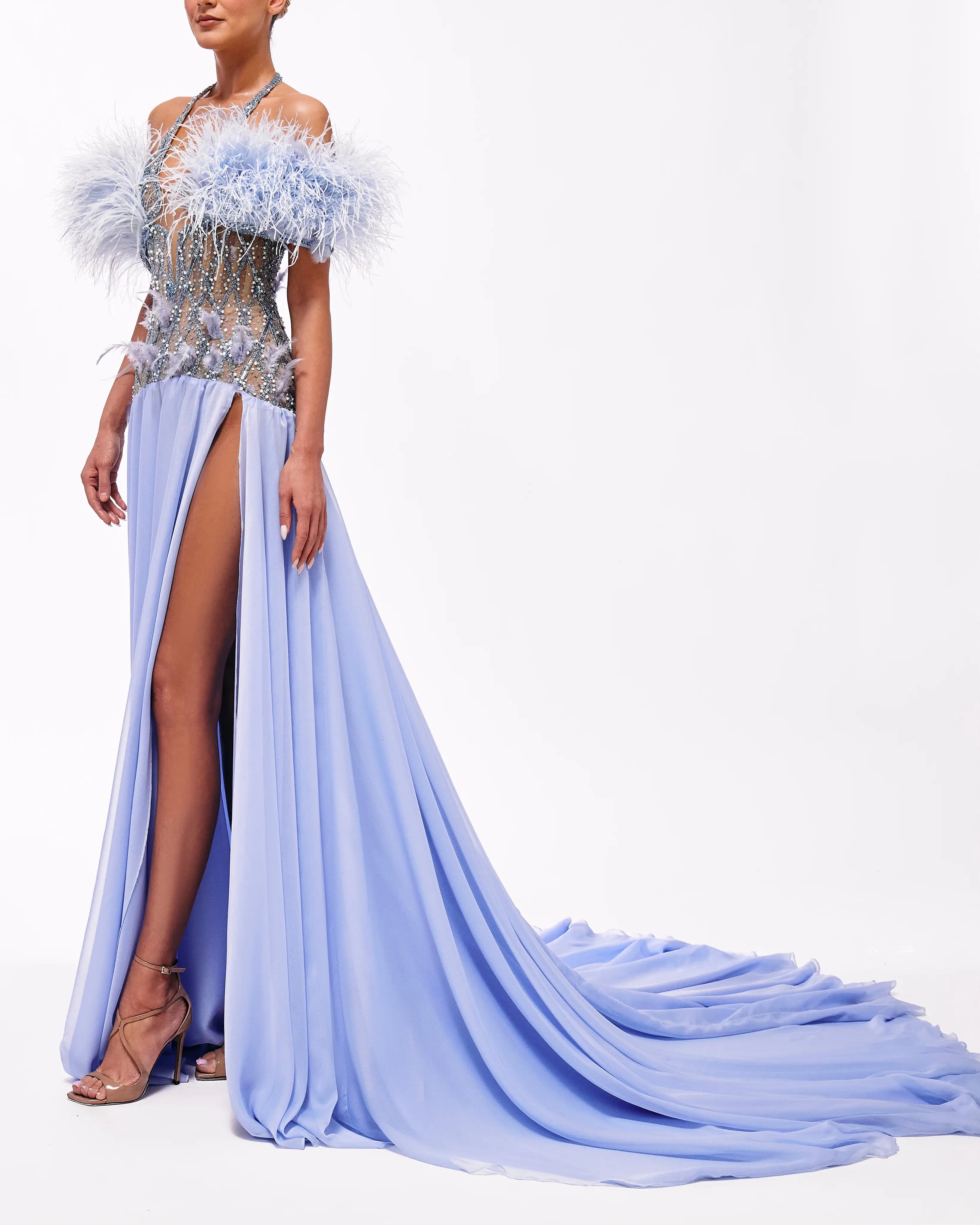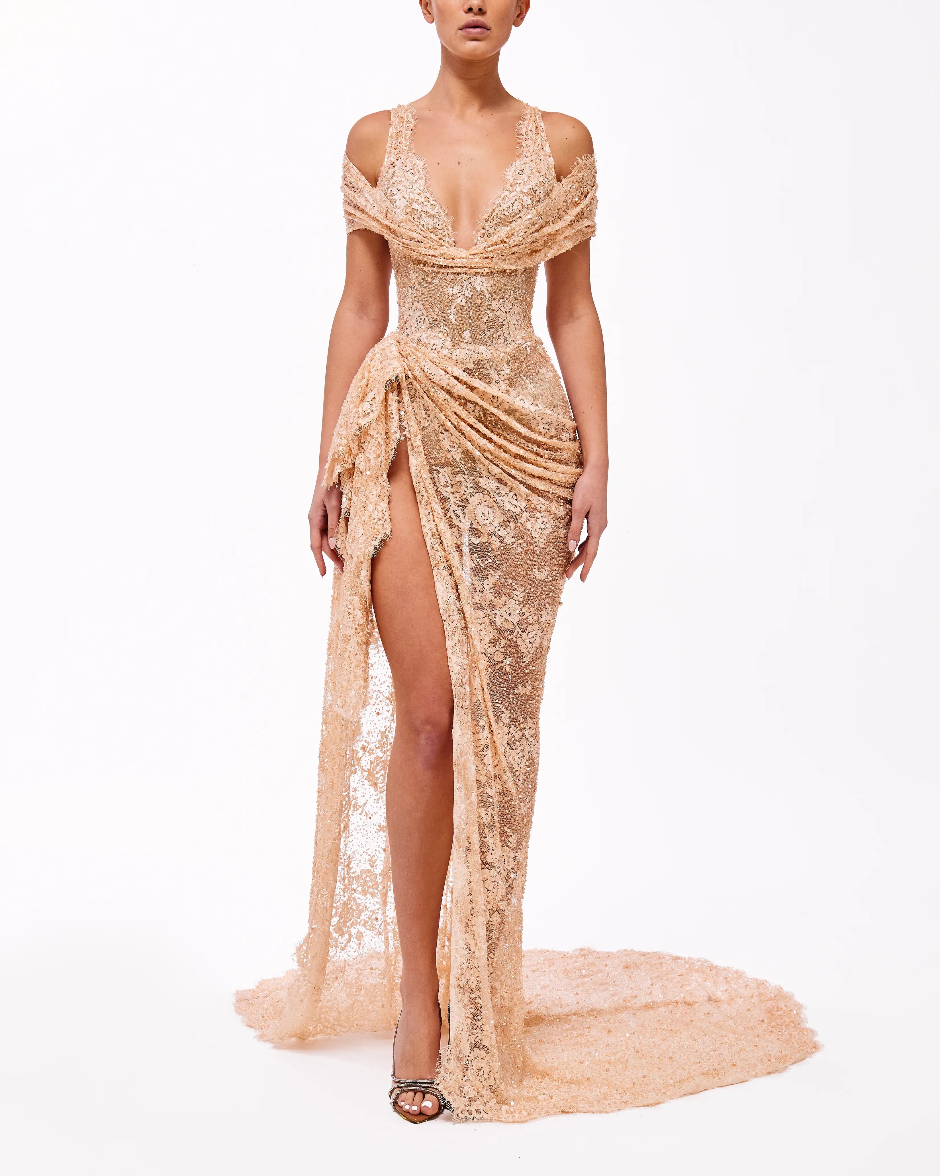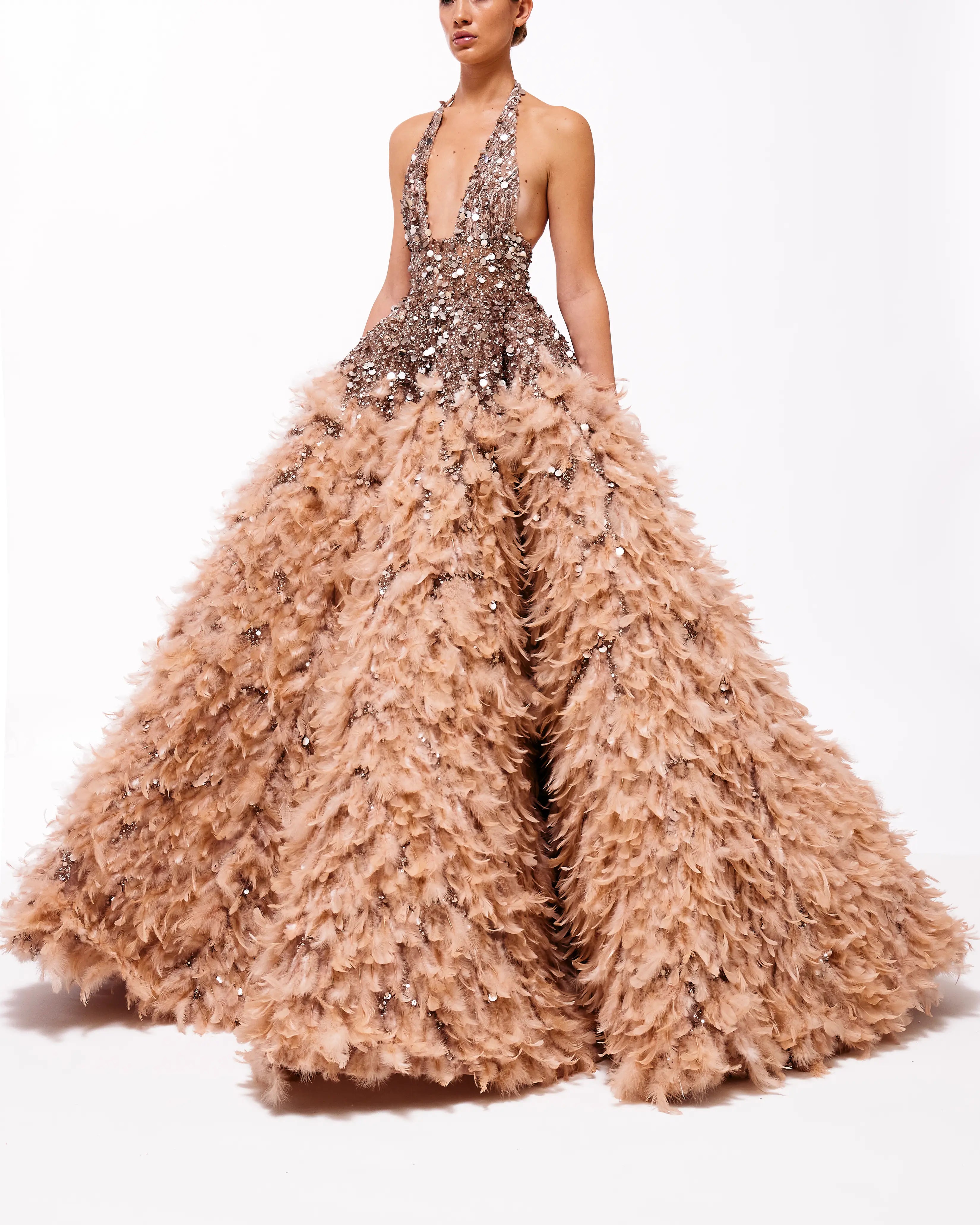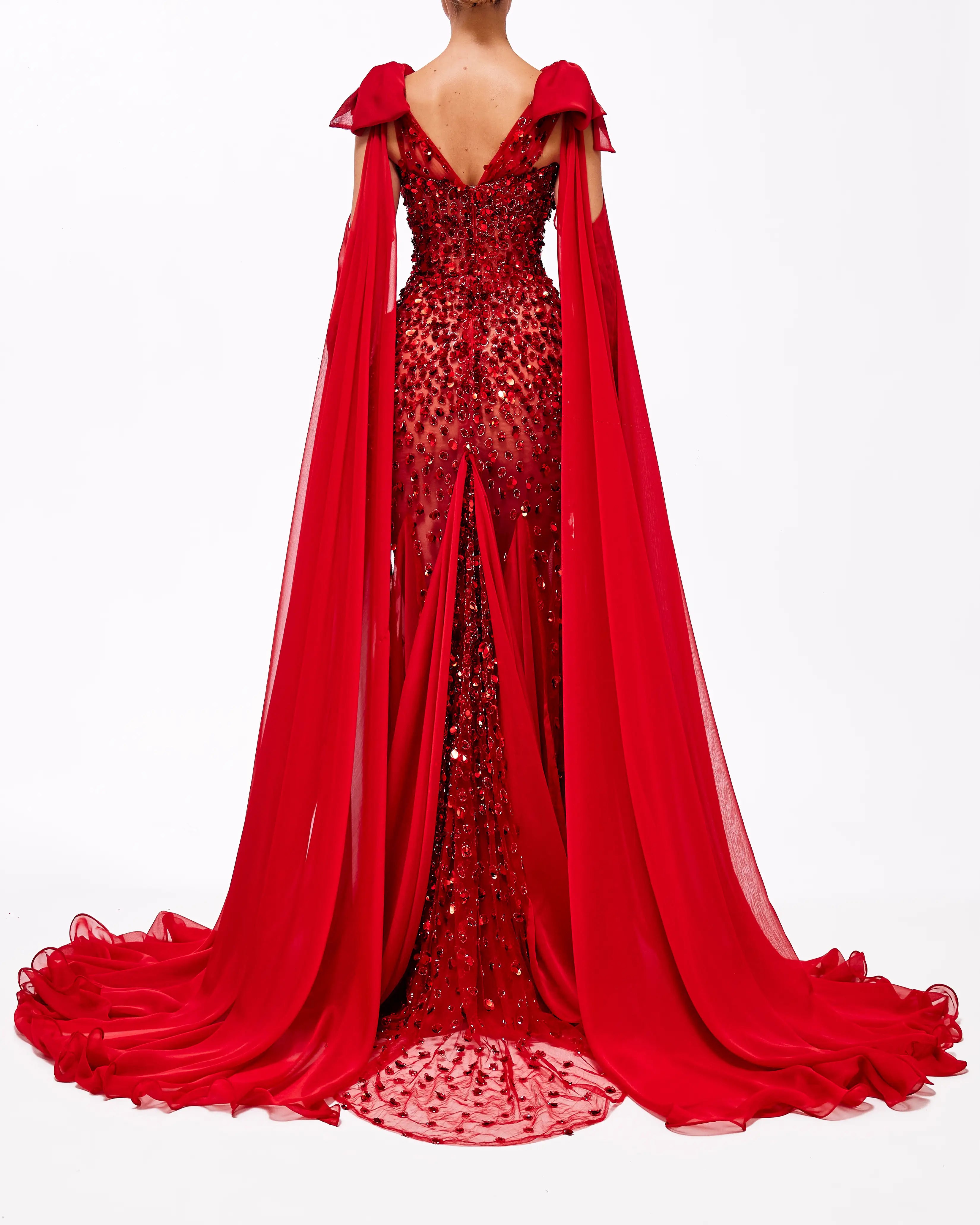 A collection full of life, Haute Allure brings your imagination to reality. With a vast selection in hues, these gowns provide ample options for extravagant events. This collection is elegantly maximalistic, with the floral lace material, cape aspect, and other unique features. Enter a world of colorful drama through Valdrin Sahiti.