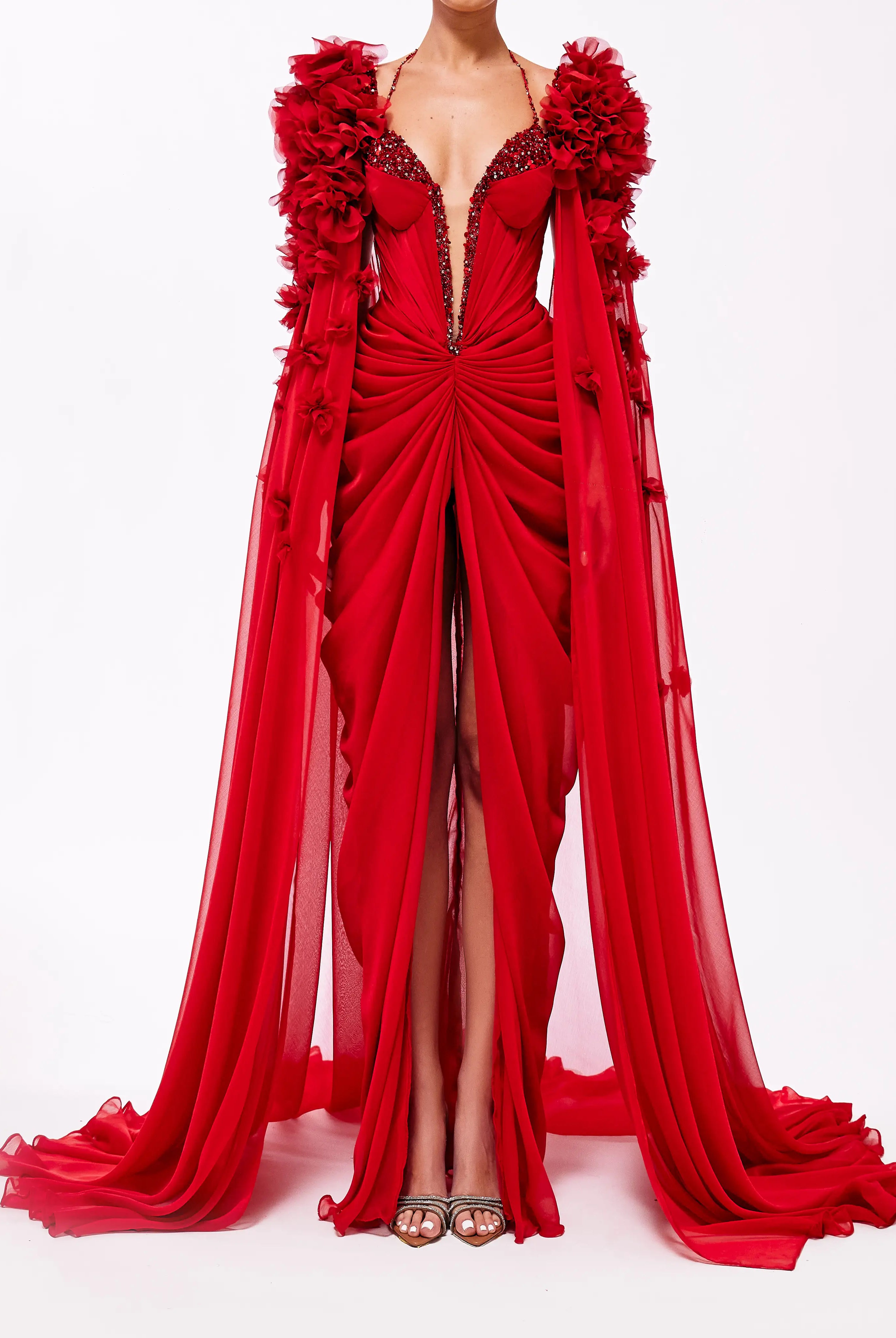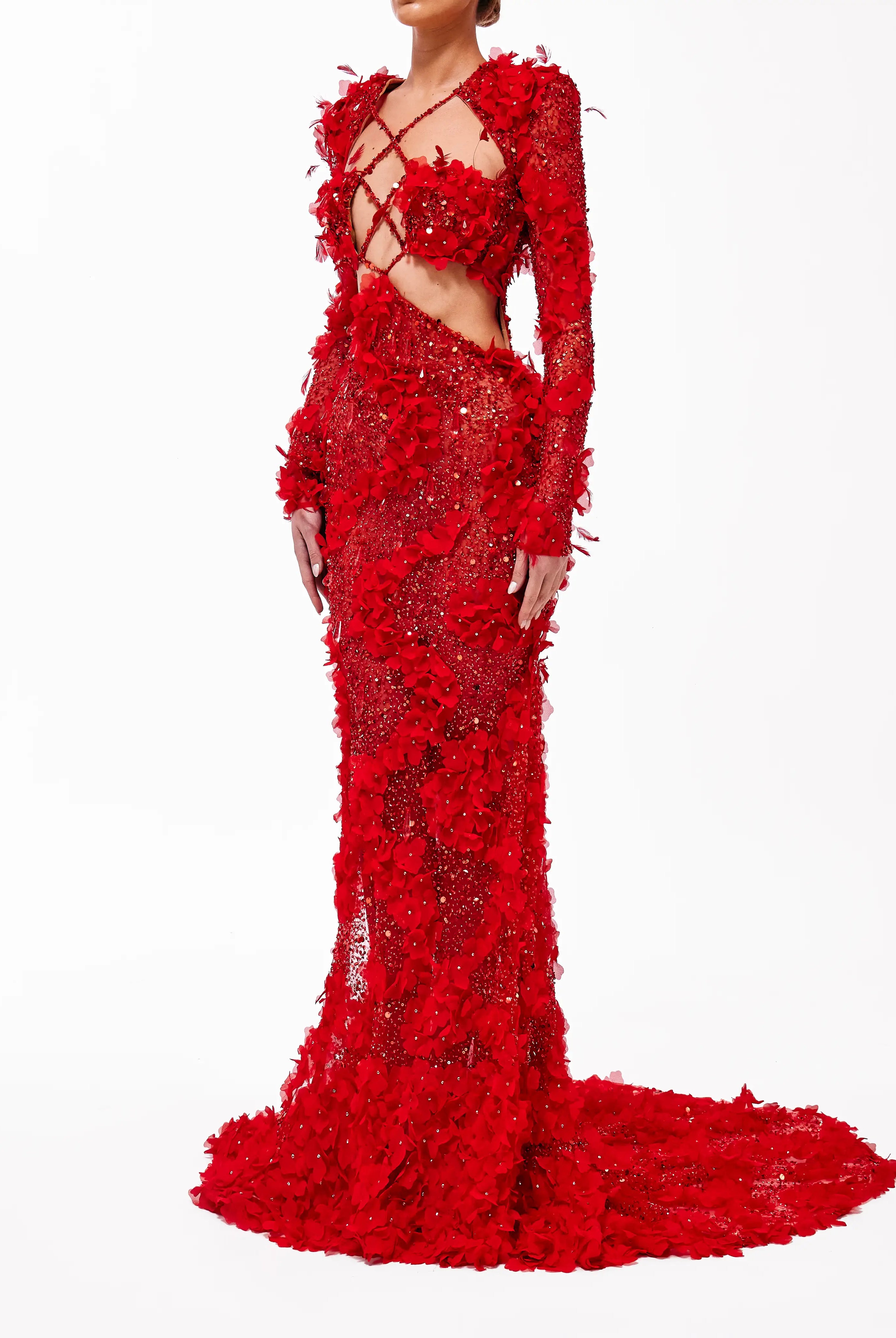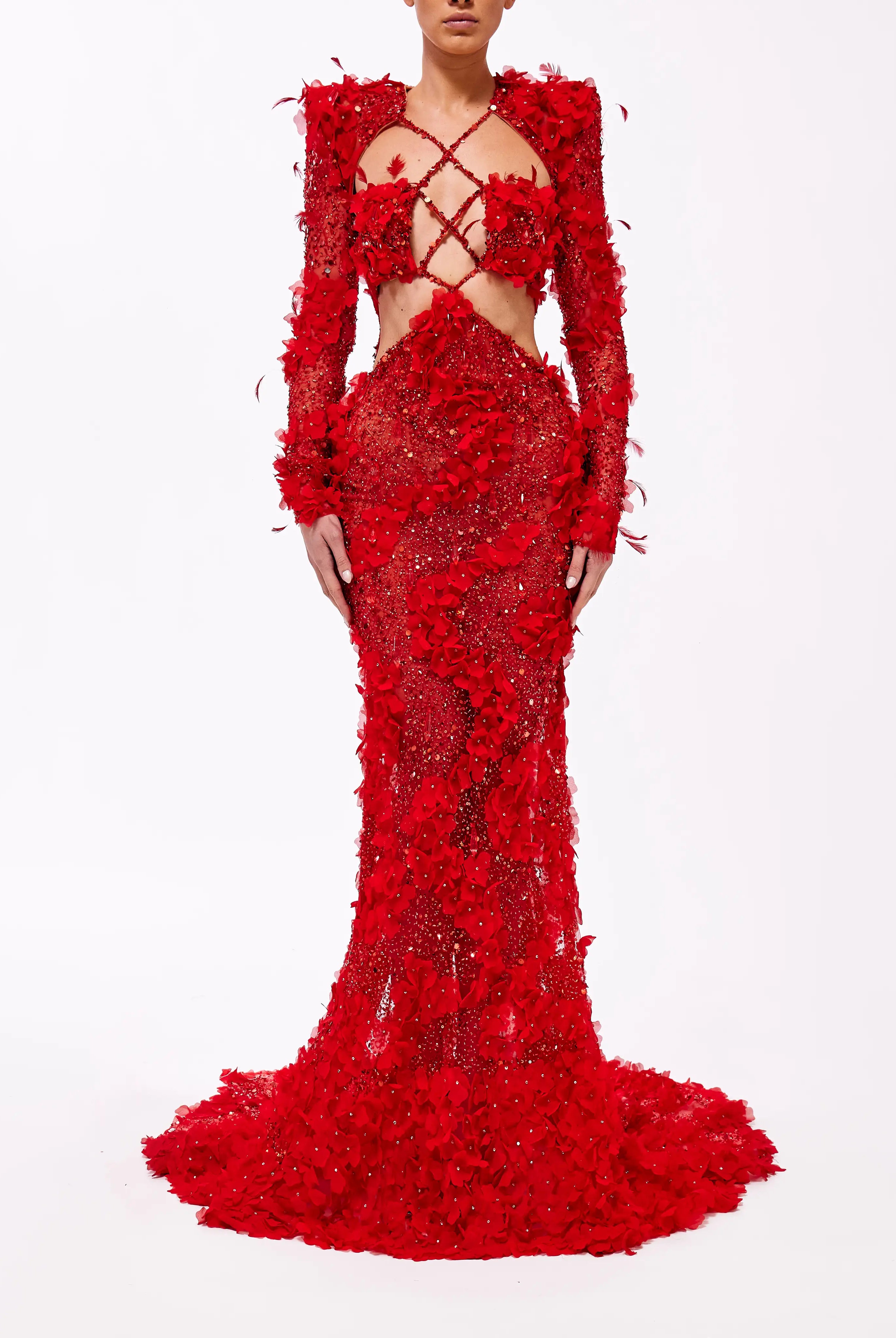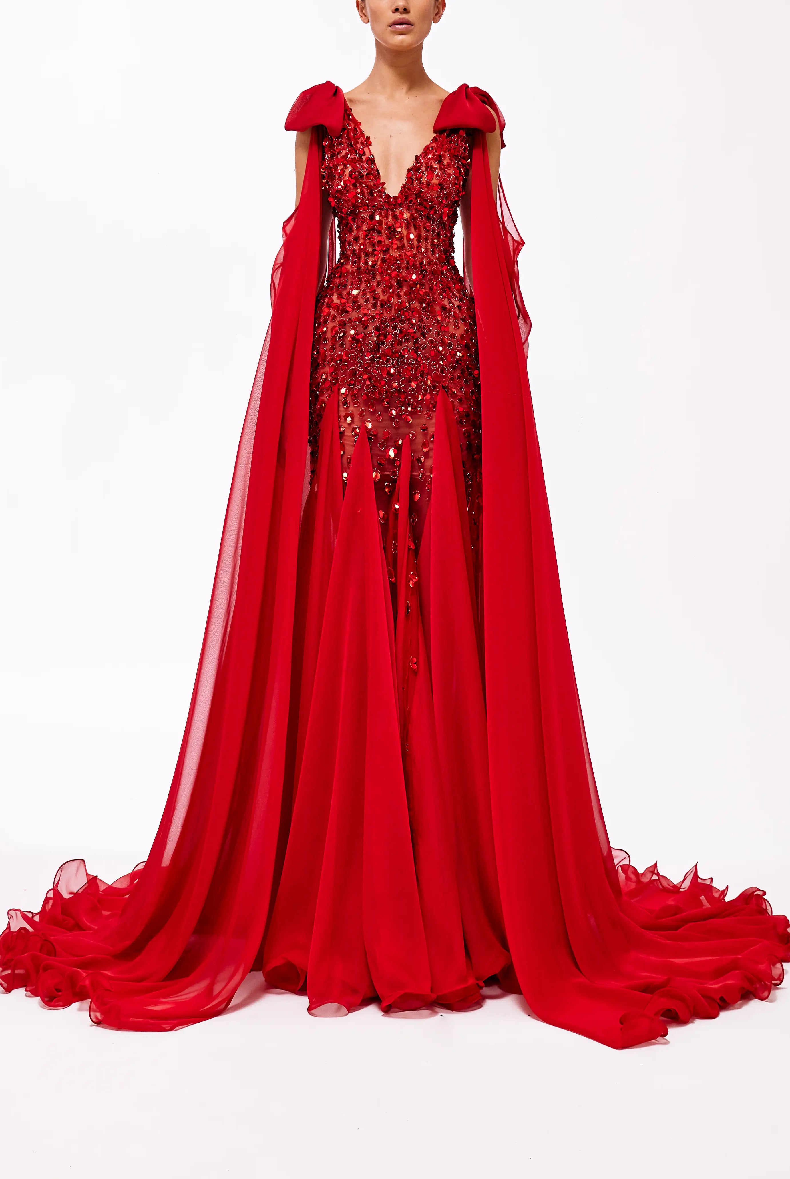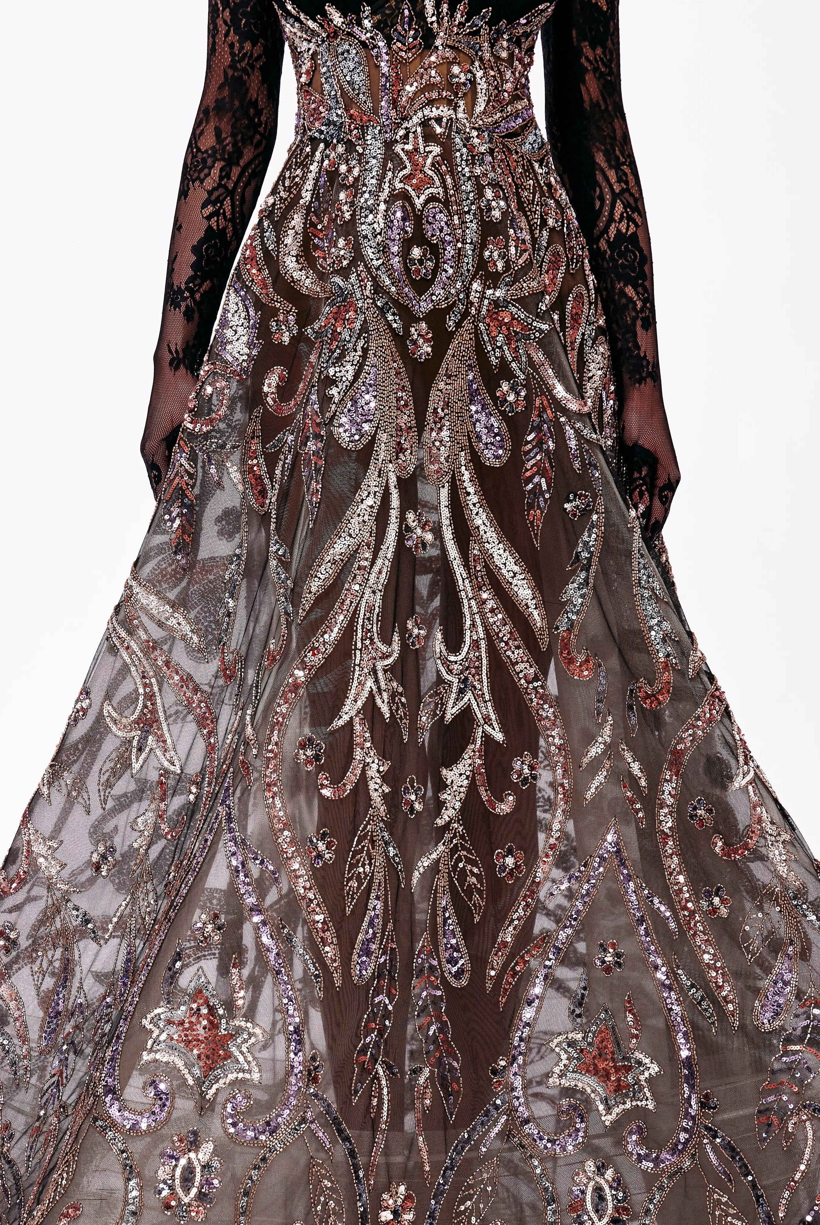 A collection full of life, Haute Allure brings your imagination to reality. With a vast selection in hues, these gowns provide ample options for extravagant events. This collection is elegantly maximalistic, with the floral lace material, cape aspect, and other unique features. Enter a world of colorful drama through Valdrin Sahiti.