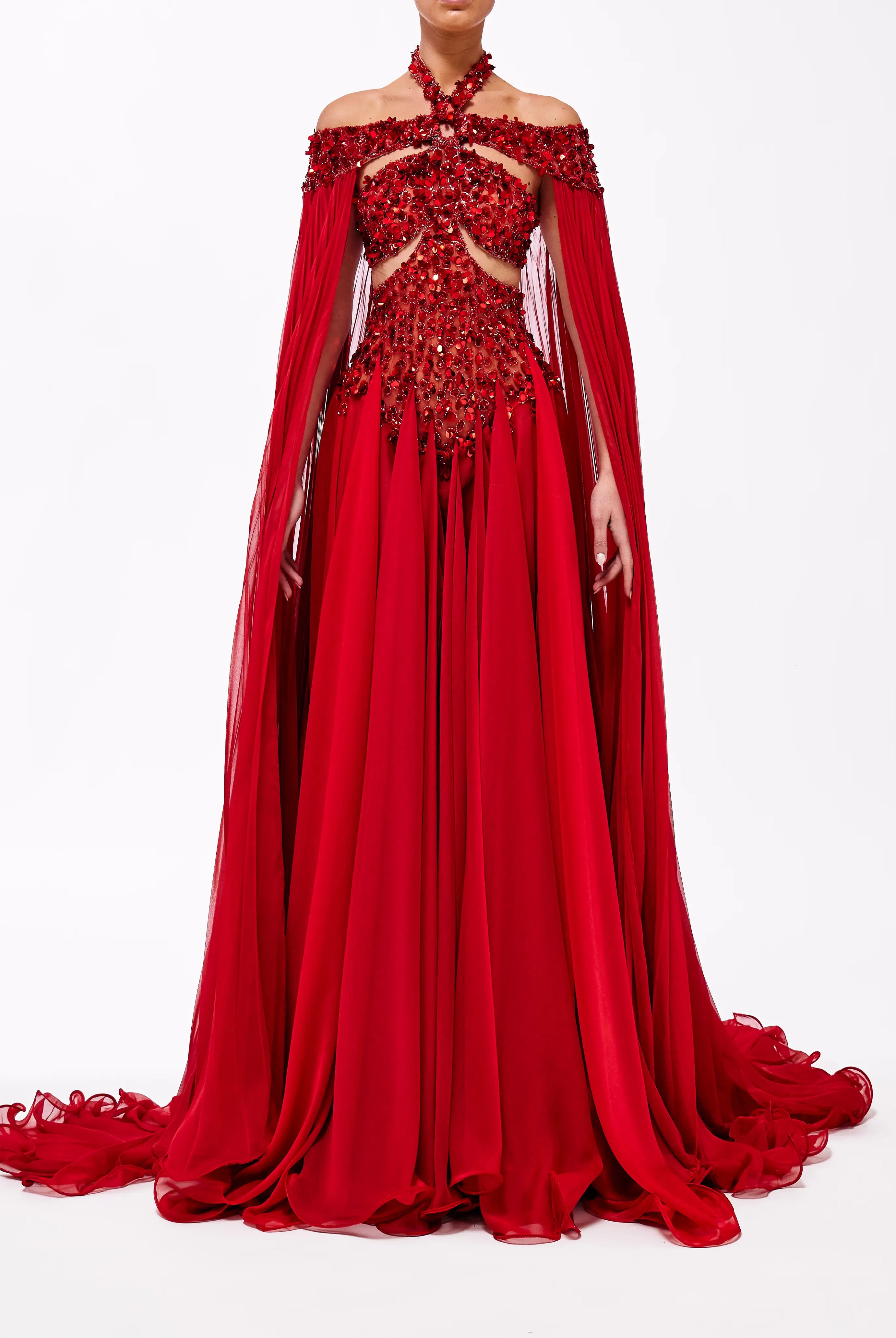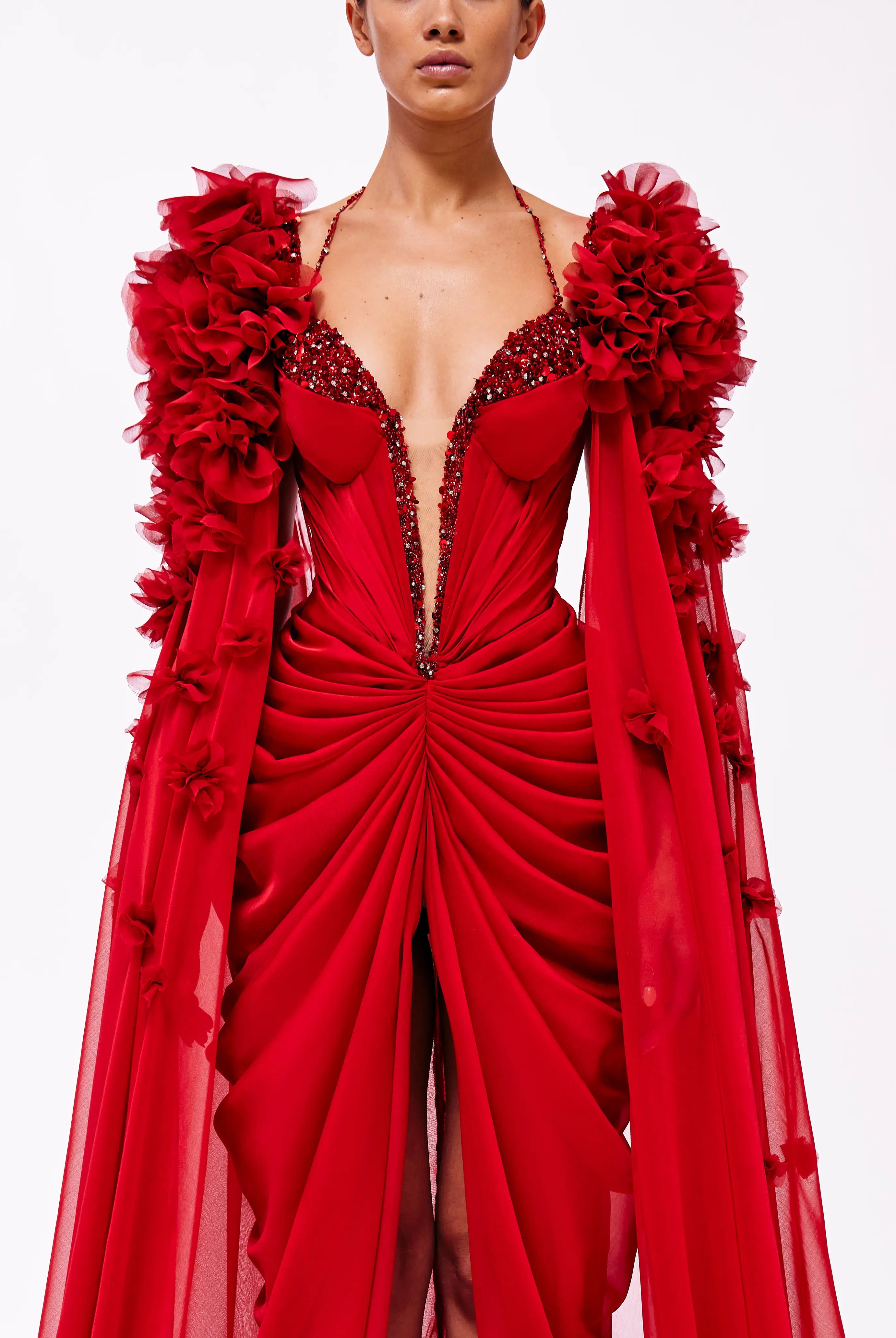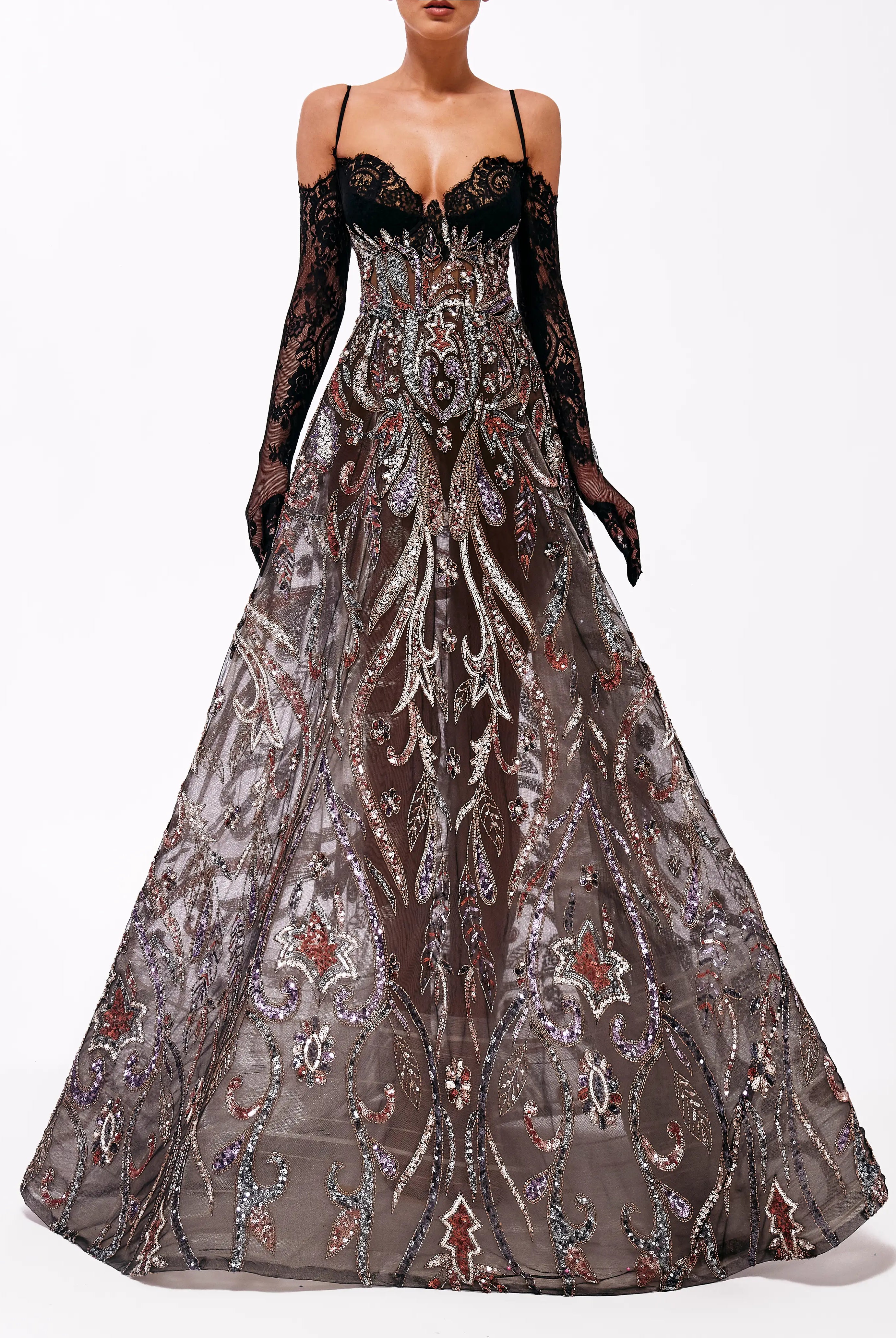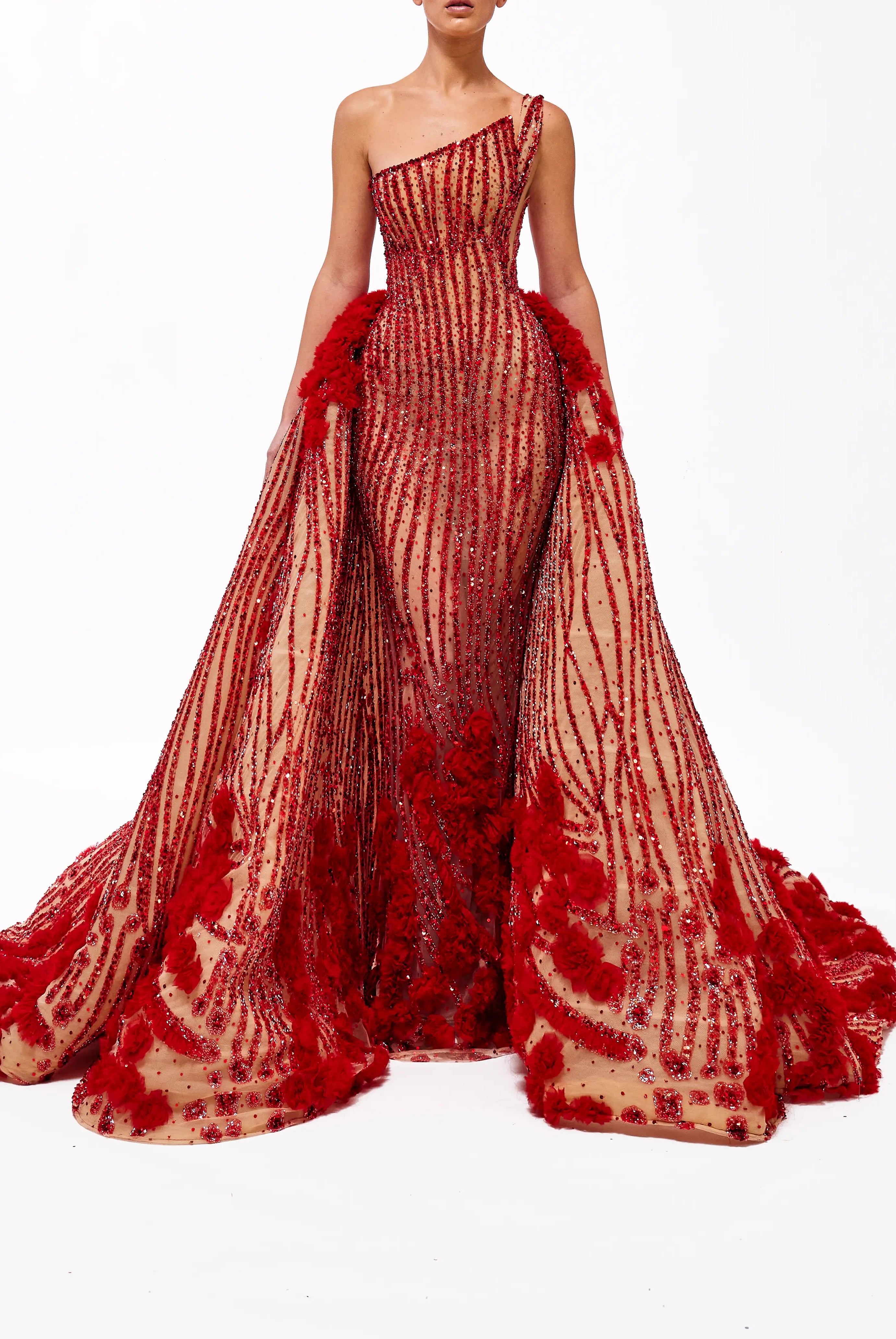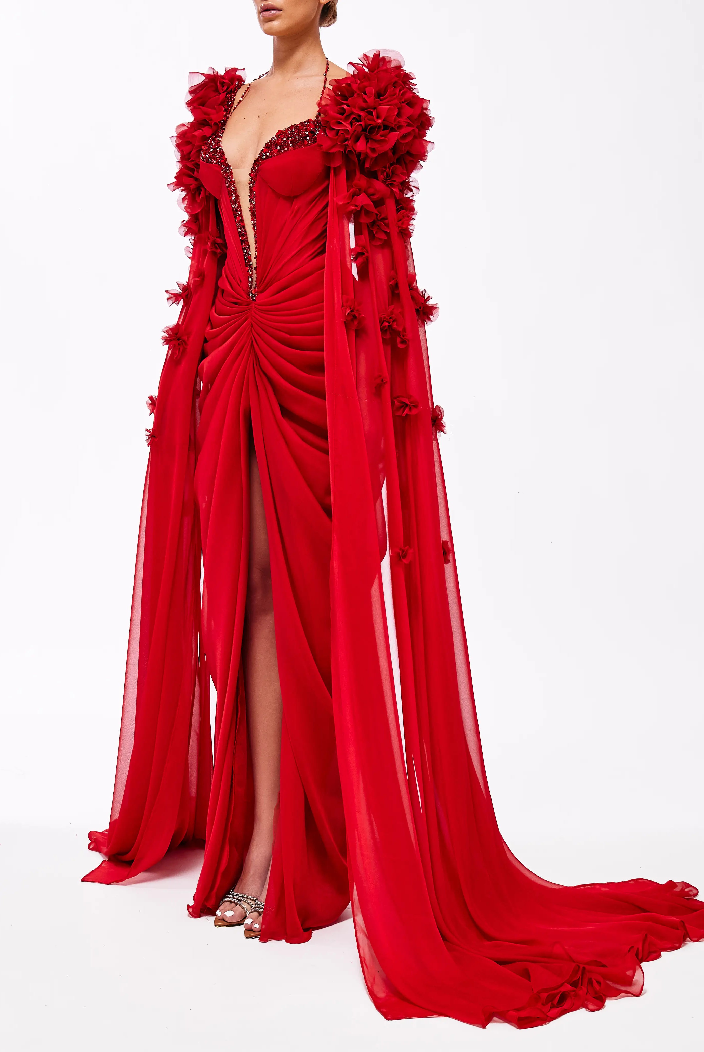A collection full of life, Haute Allure brings your imagination to reality. With a vast selection in hues, these gowns provide ample options for extravagant events. This collection is elegantly maximalistic, with the floral lace material, cape aspect, and other unique features. Enter a world of colorful drama through Valdrin Sahiti.