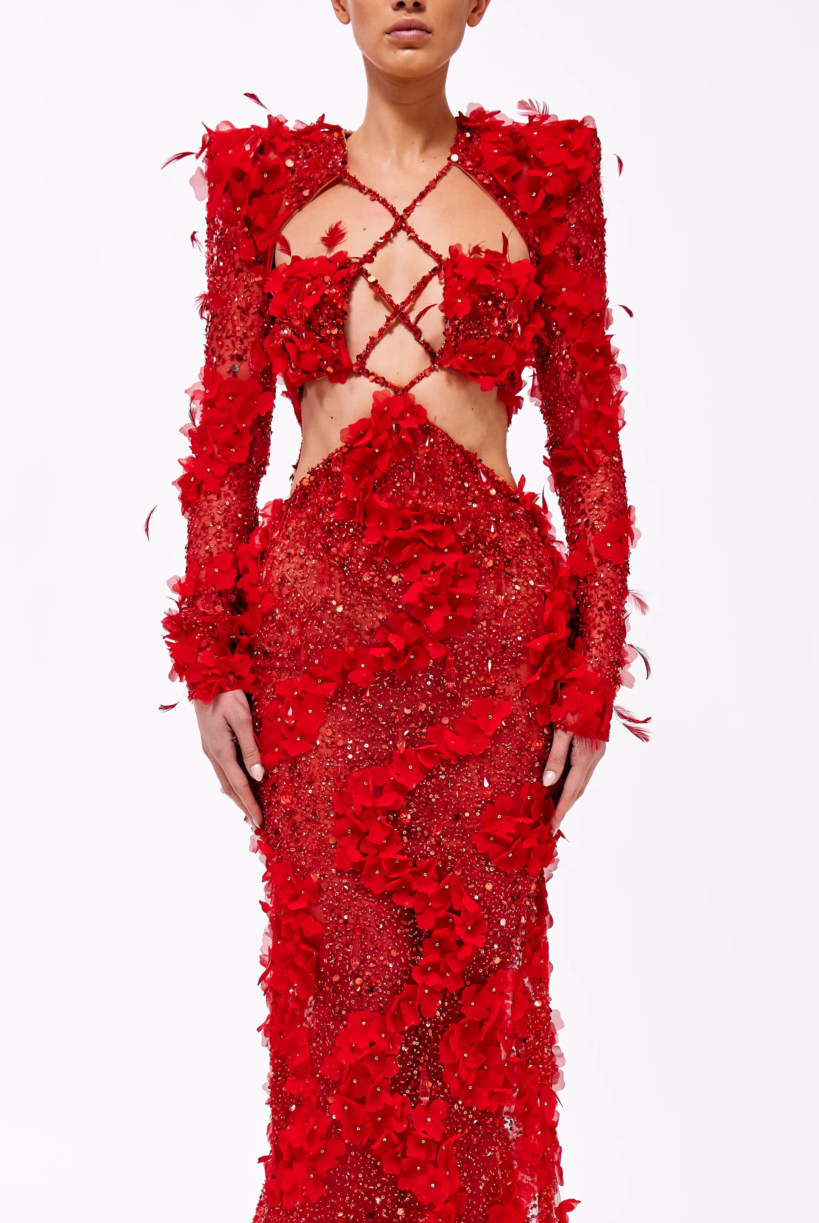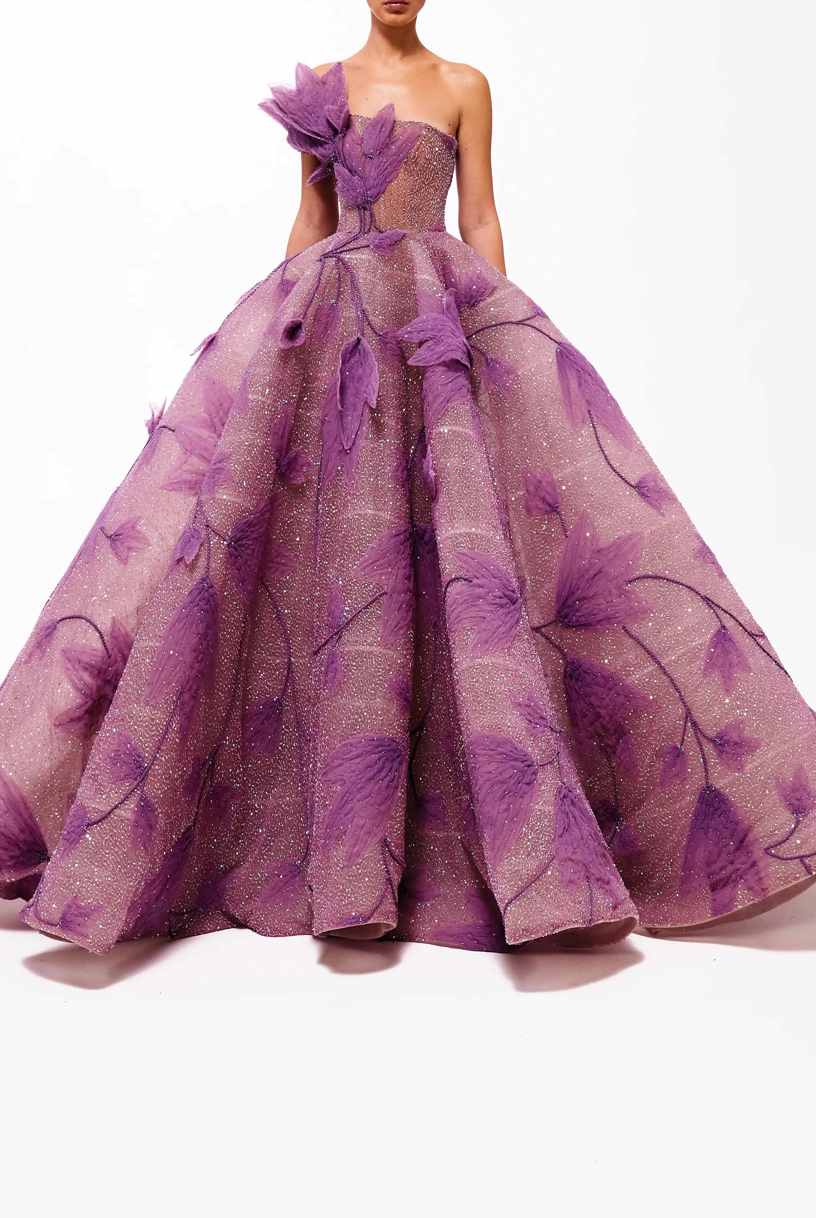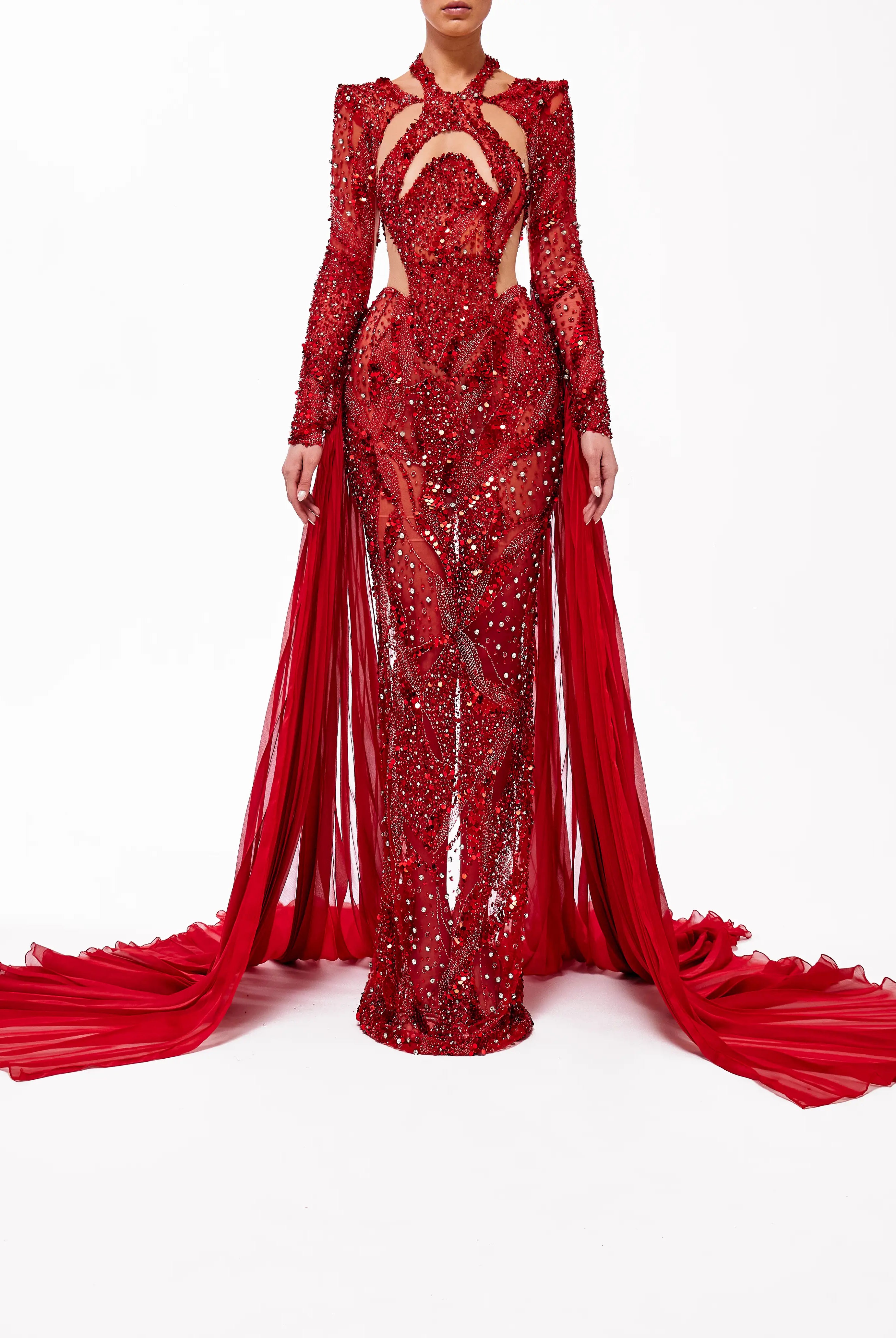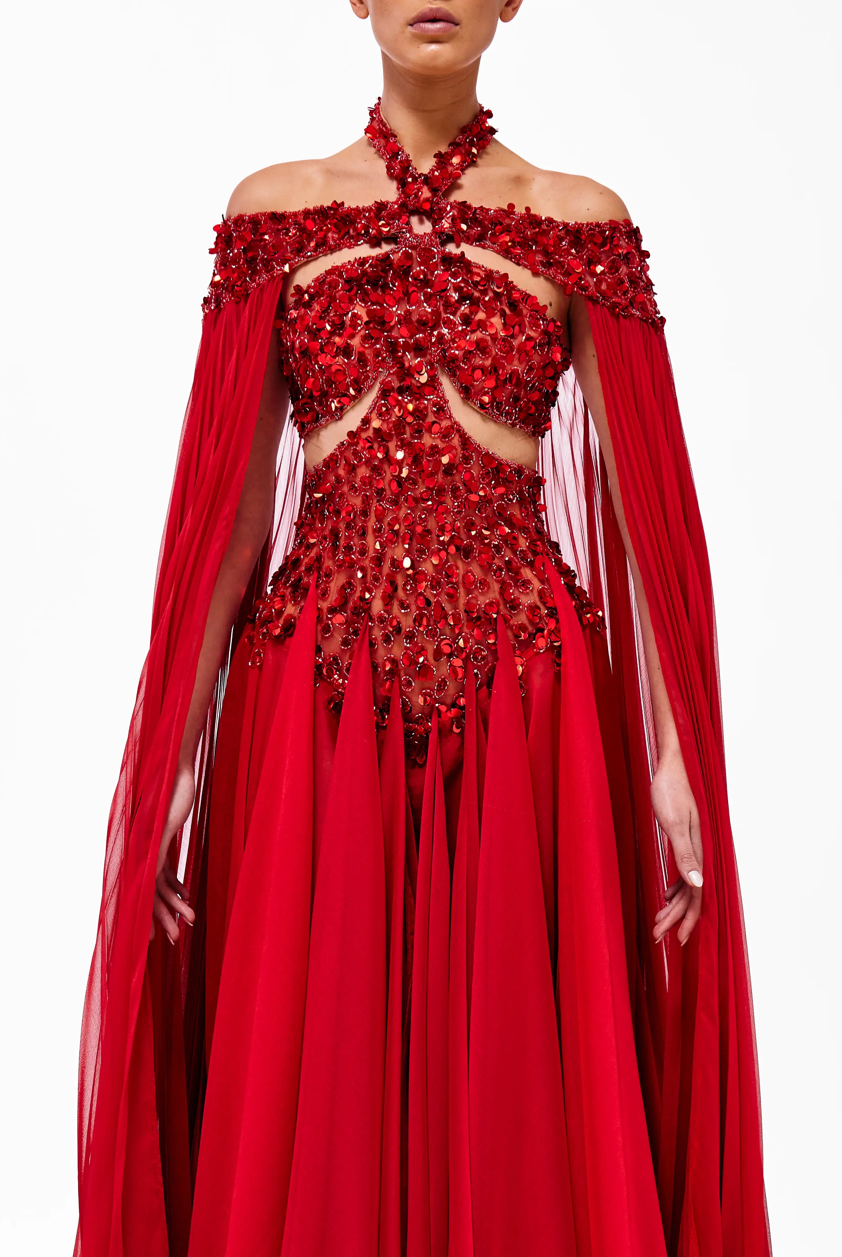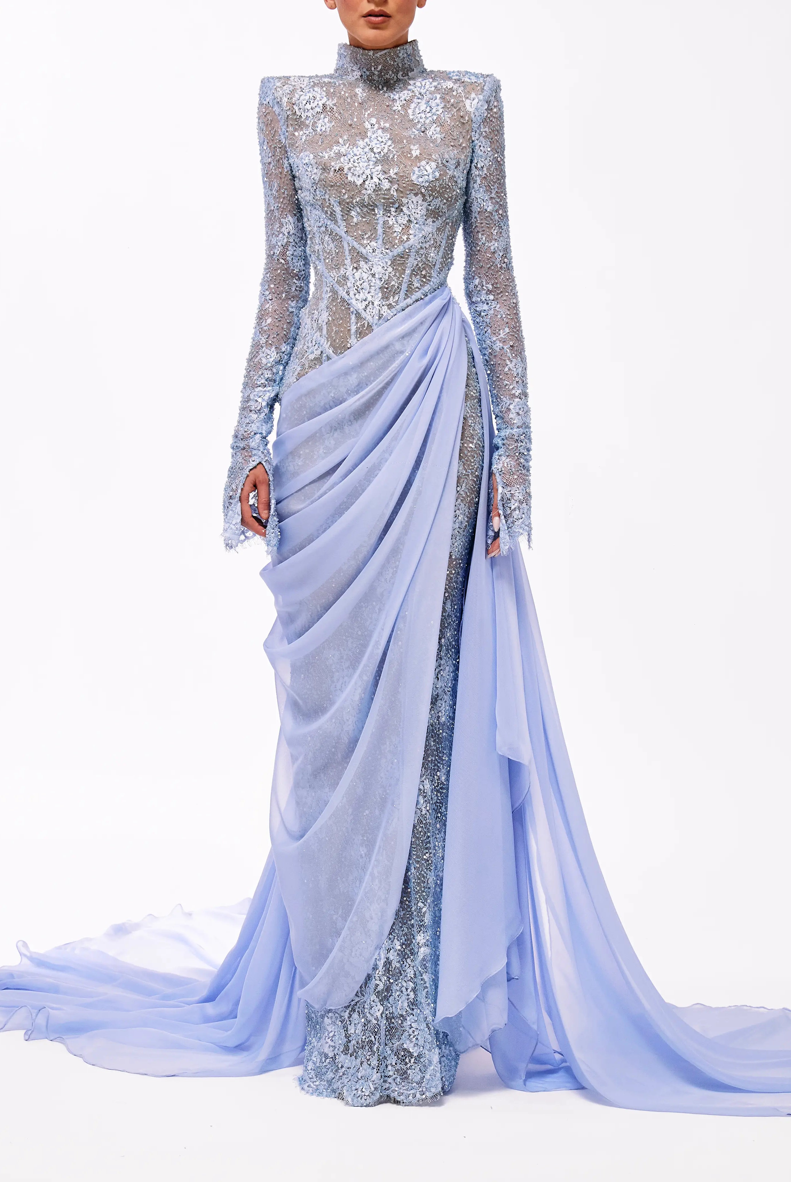 A collection full of life, Haute Allure brings your imagination to reality. With a vast selection in hues, these gowns provide ample options for extravagant events. This collection is elegantly maximalistic, with the floral lace material, cape aspect, and other unique features. Enter a world of colorful drama through Valdrin Sahiti.