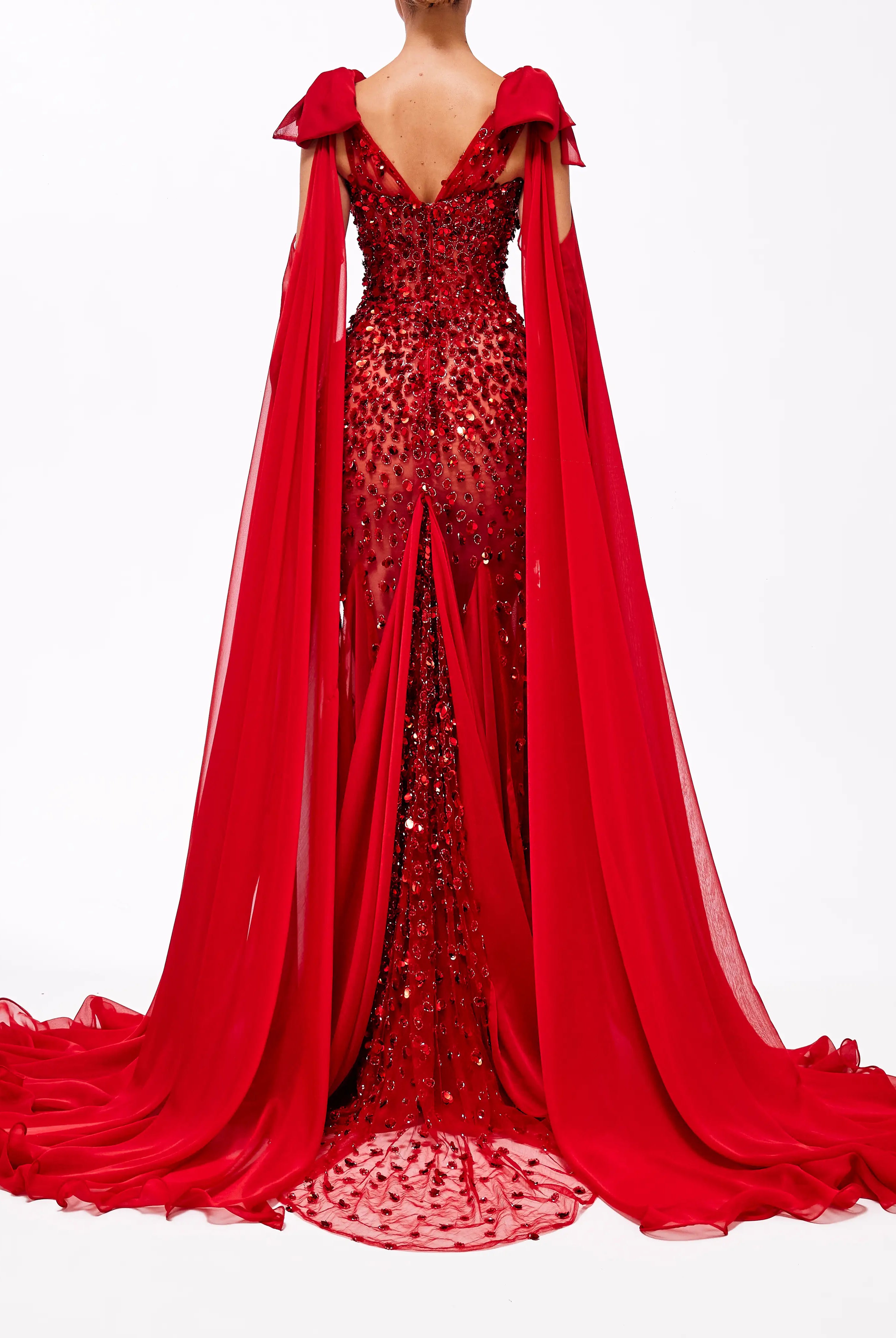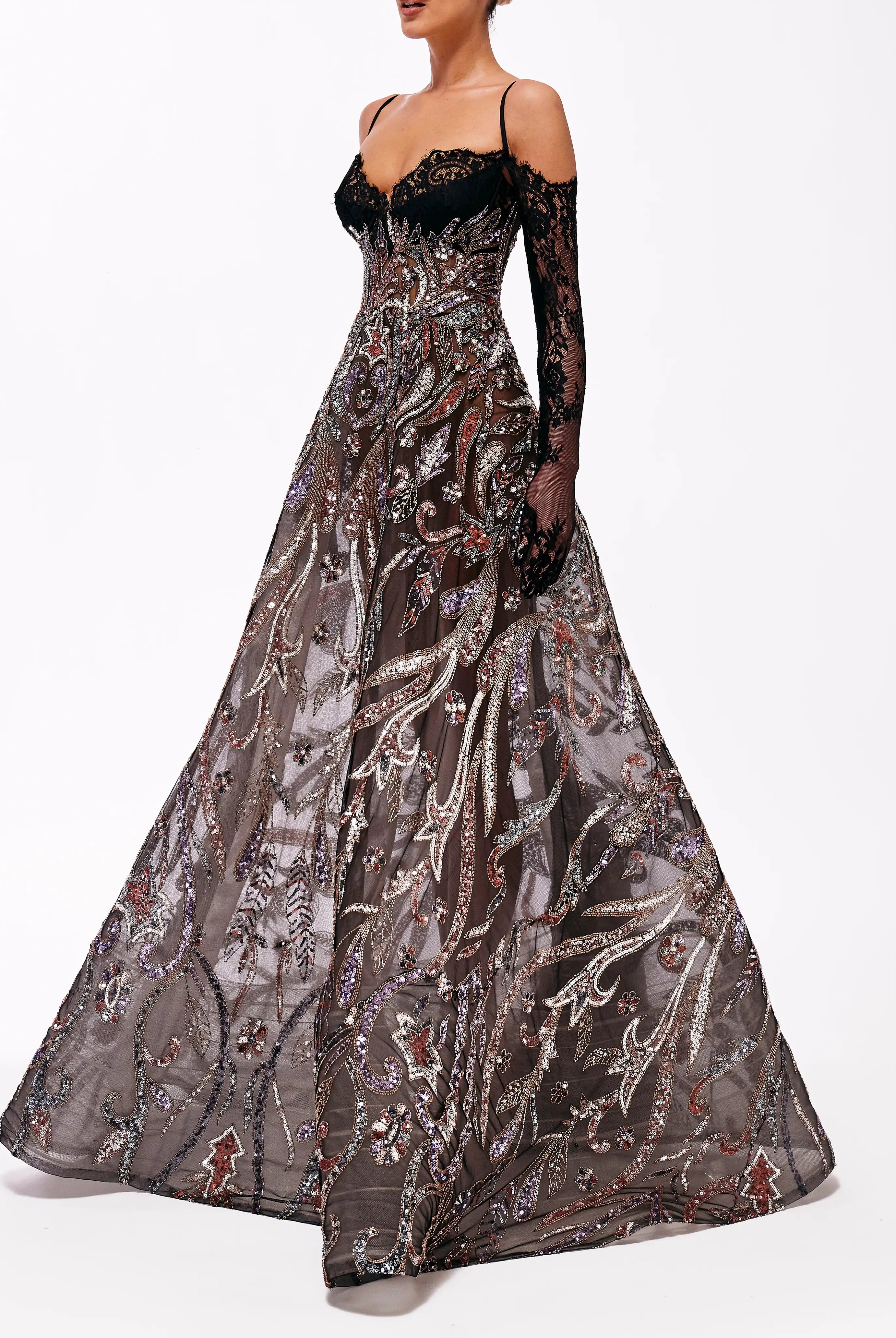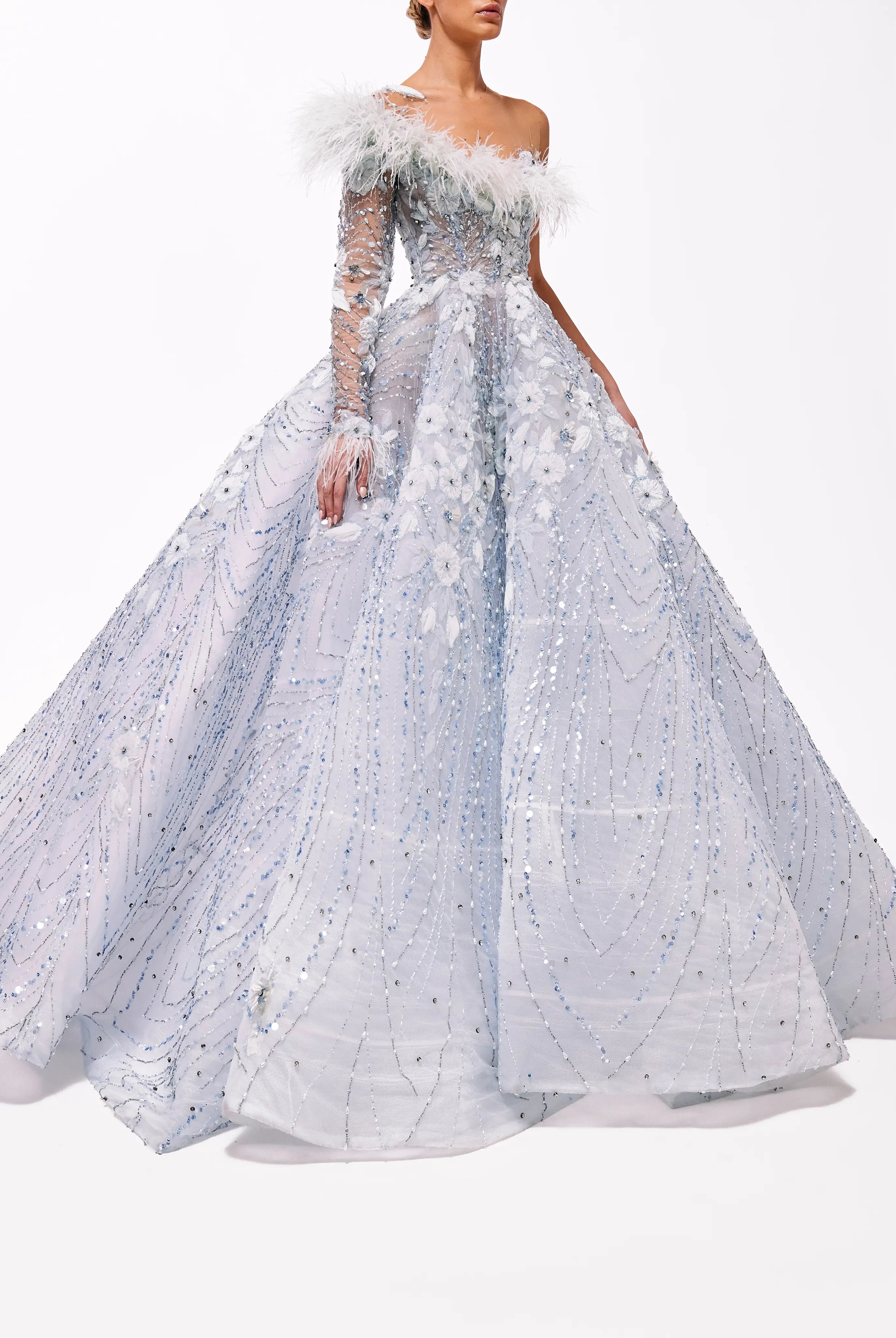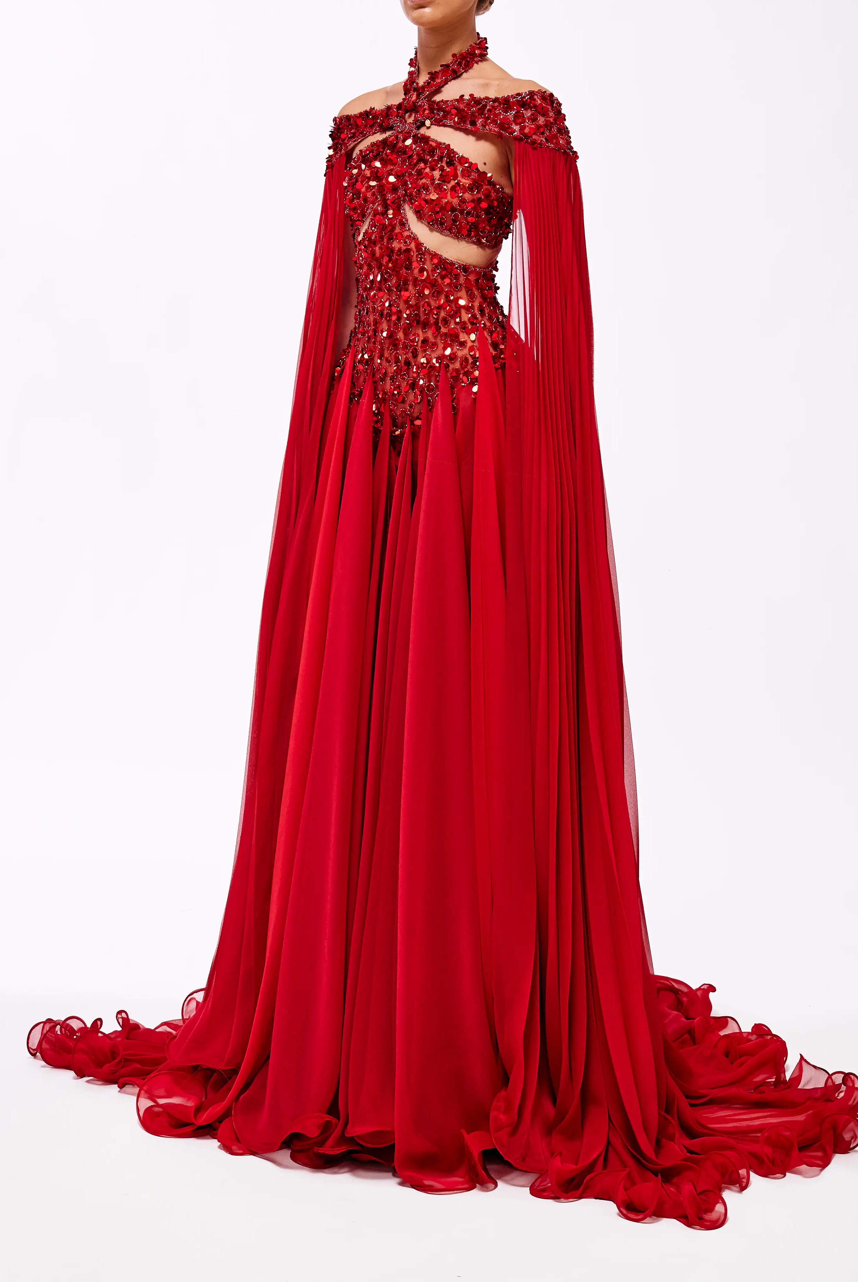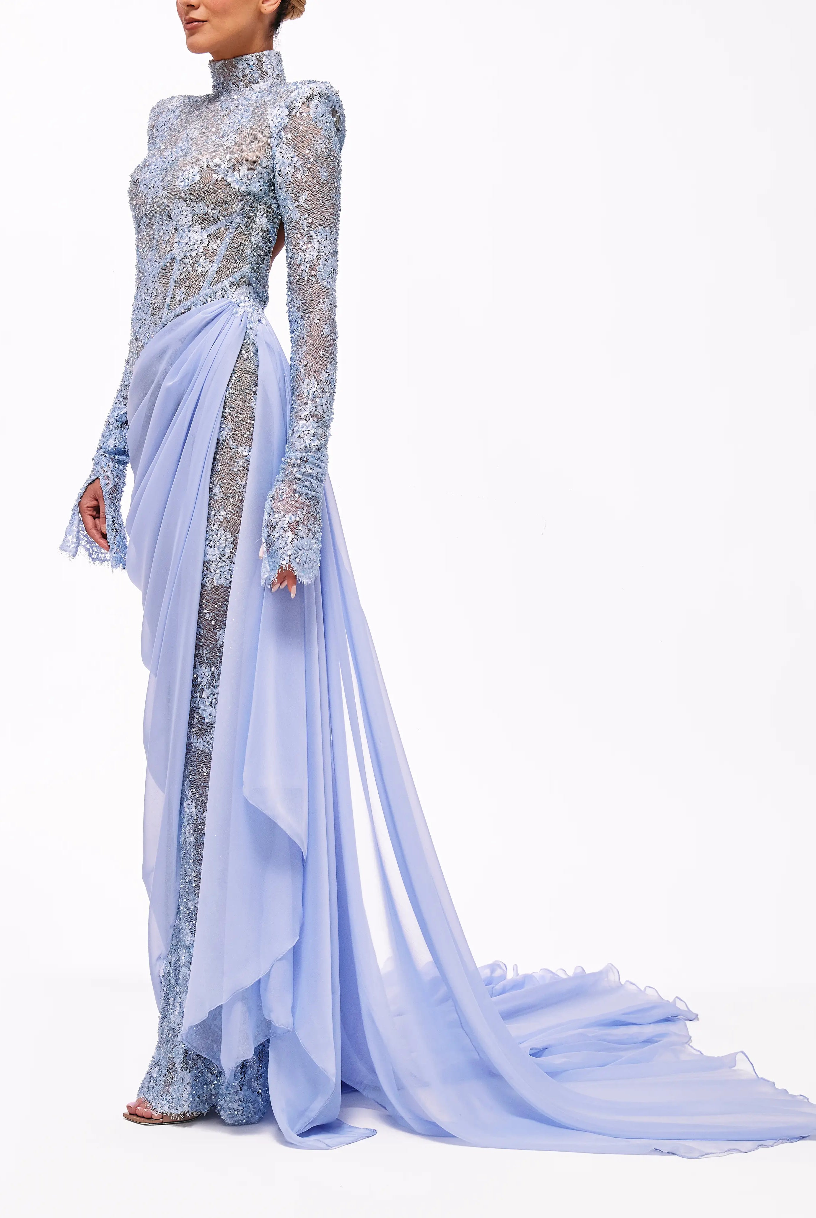 A collection full of life, Haute Allure brings your imagination to reality. With a vast selection in hues, these gowns provide ample options for extravagant events. This collection is elegantly maximalistic, with the floral lace material, cape aspect, and other unique features. Enter a world of colorful drama through Valdrin Sahiti.