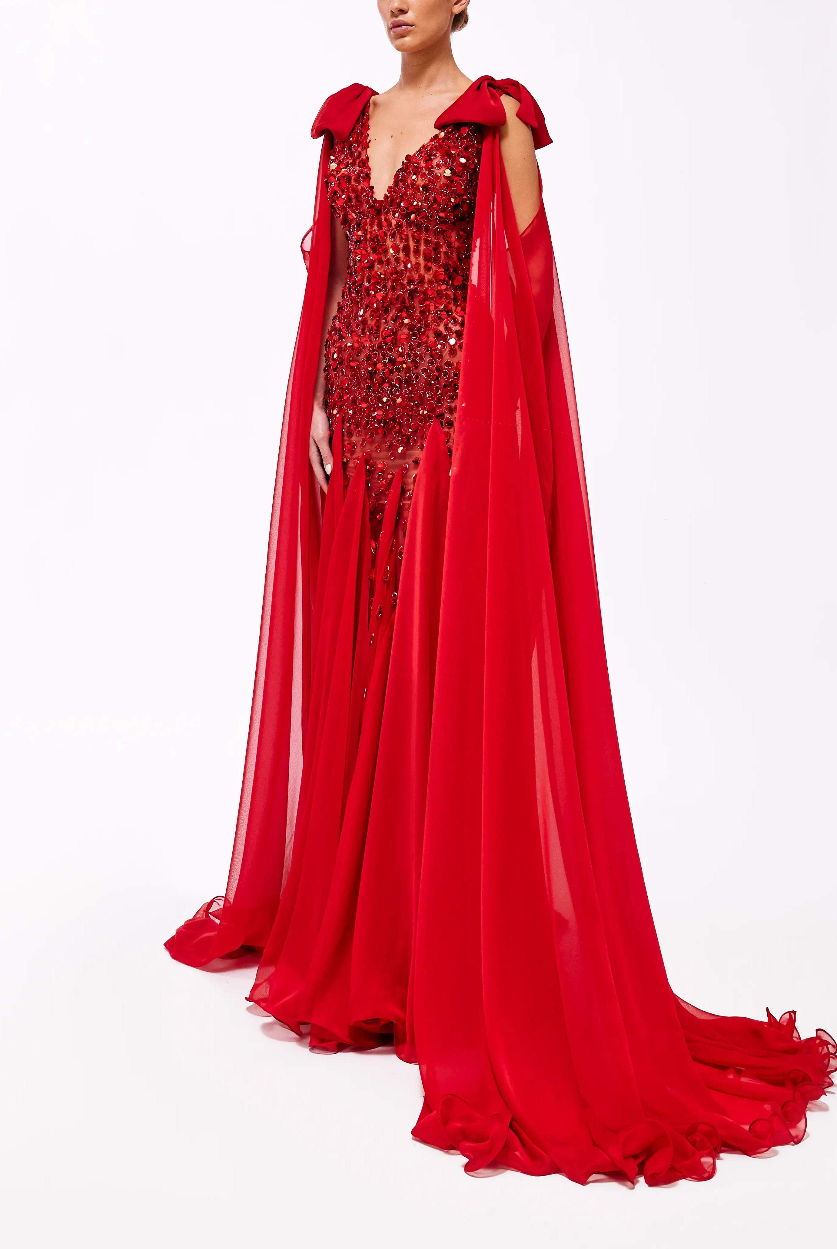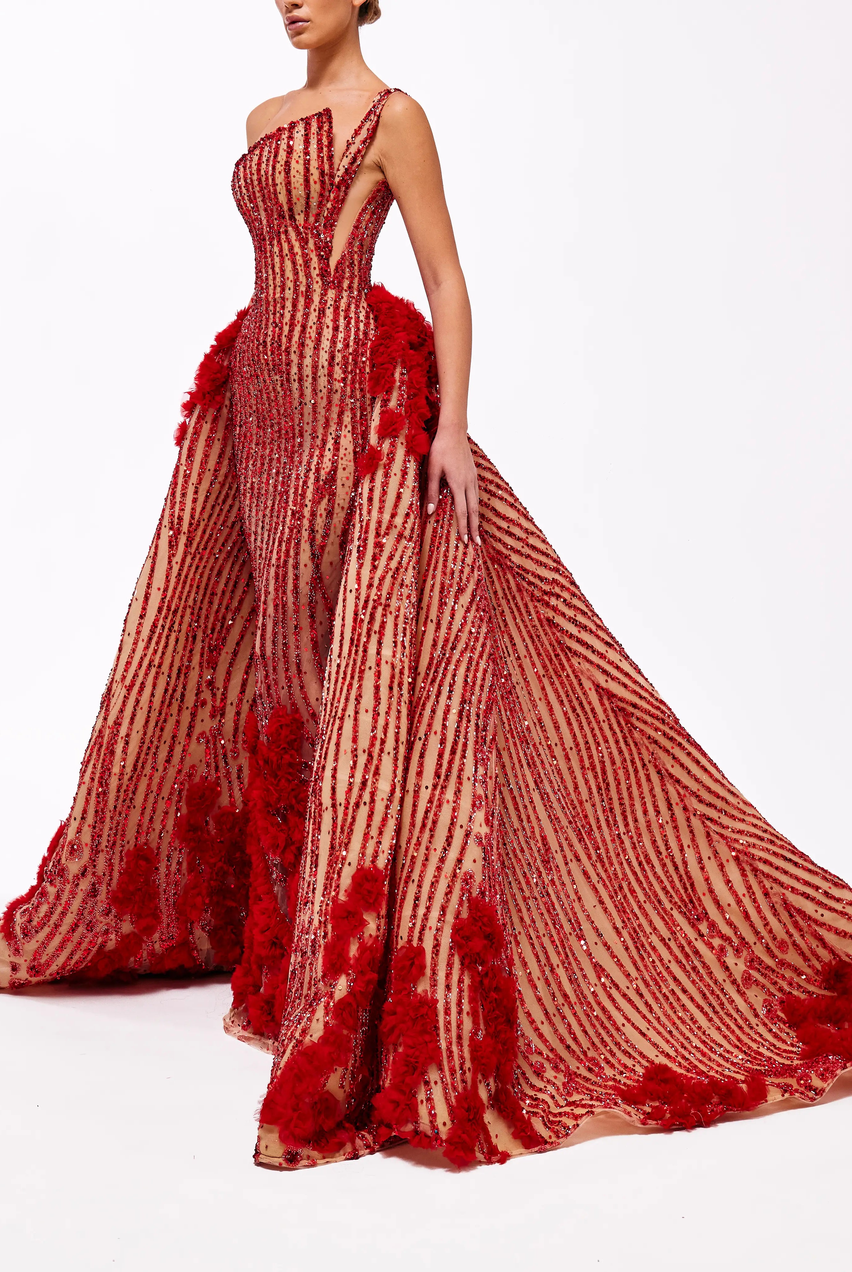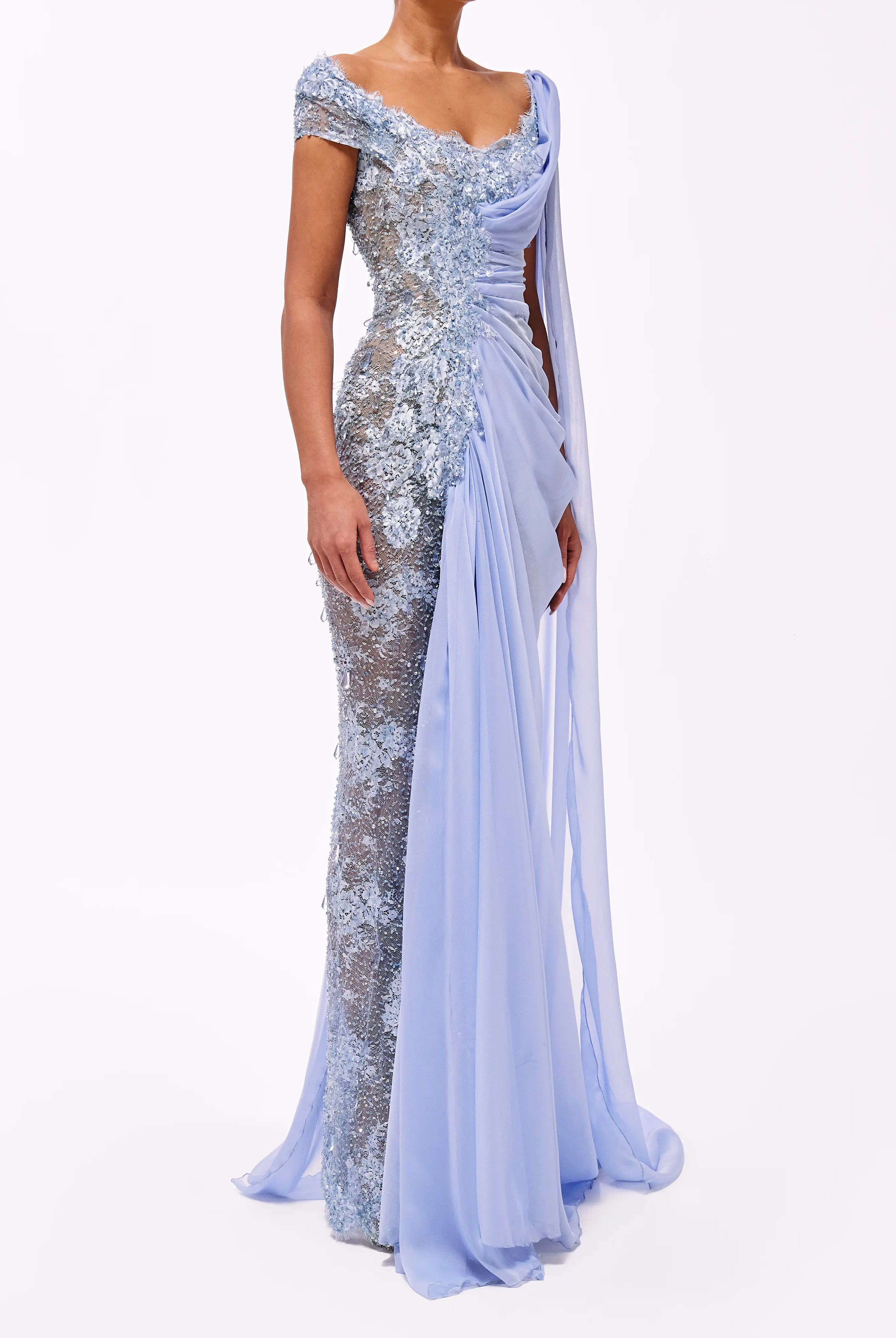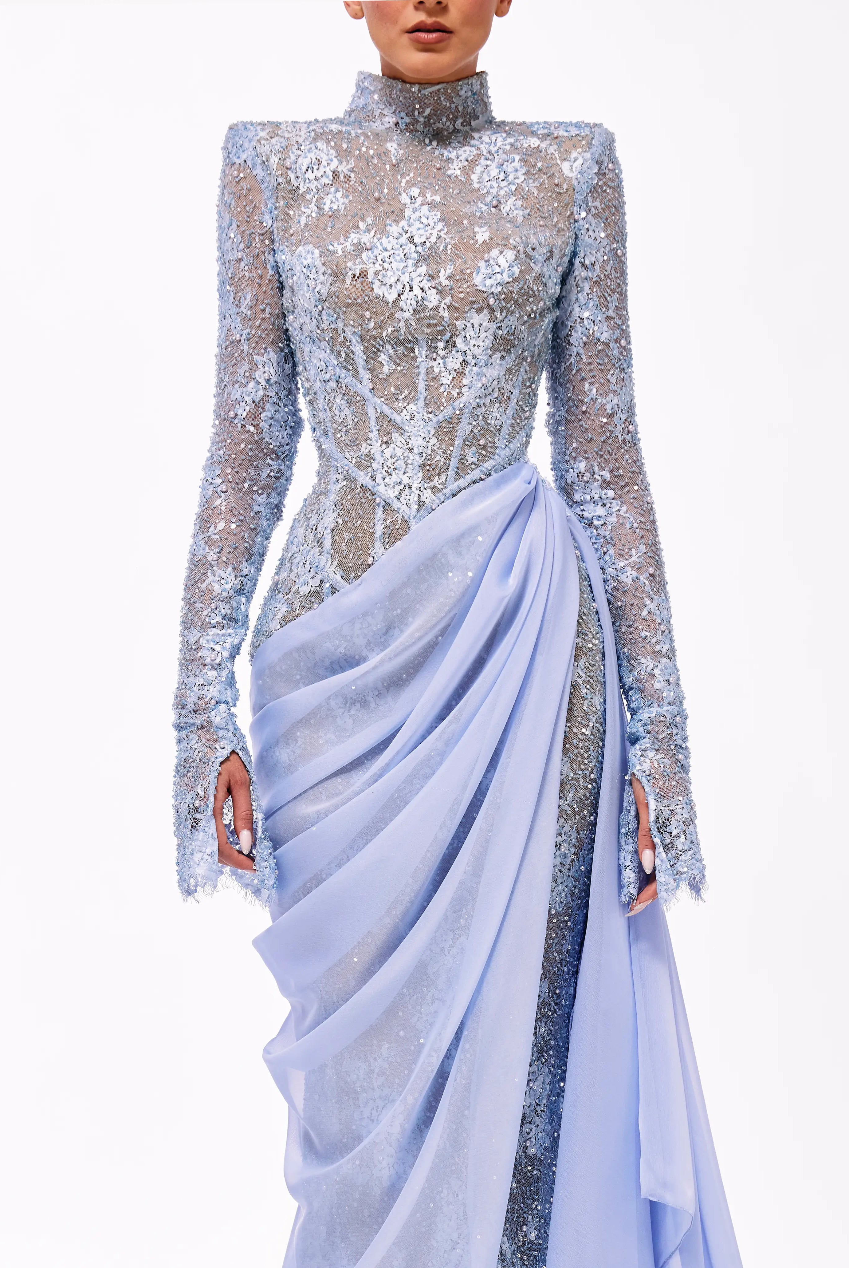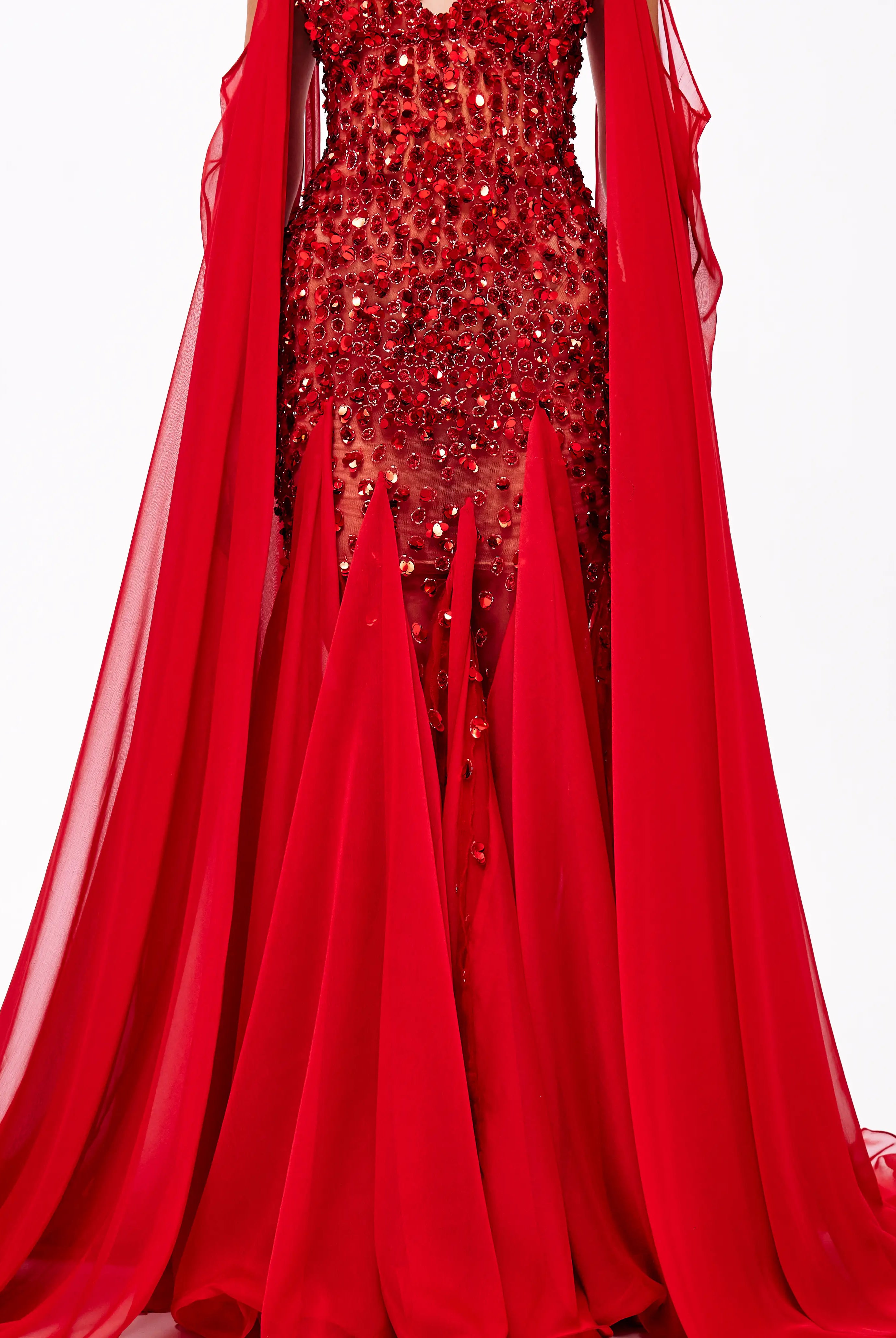 A collection full of life, Haute Allure brings your imagination to reality. With a vast selection in hues, these gowns provide ample options for extravagant events. This collection is elegantly maximalistic, with the floral lace material, cape aspect, and other unique features. Enter a world of colorful drama through Valdrin Sahiti.