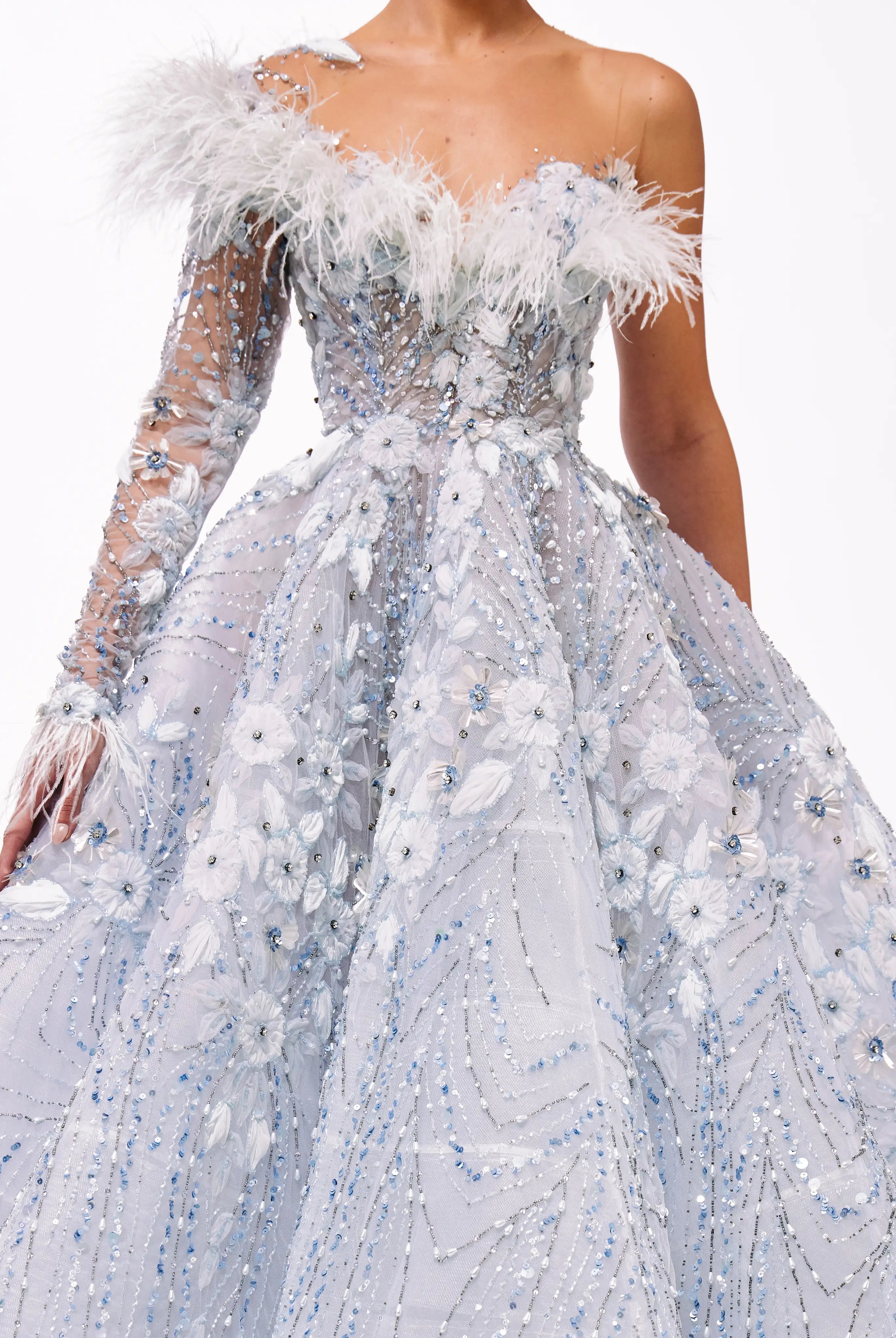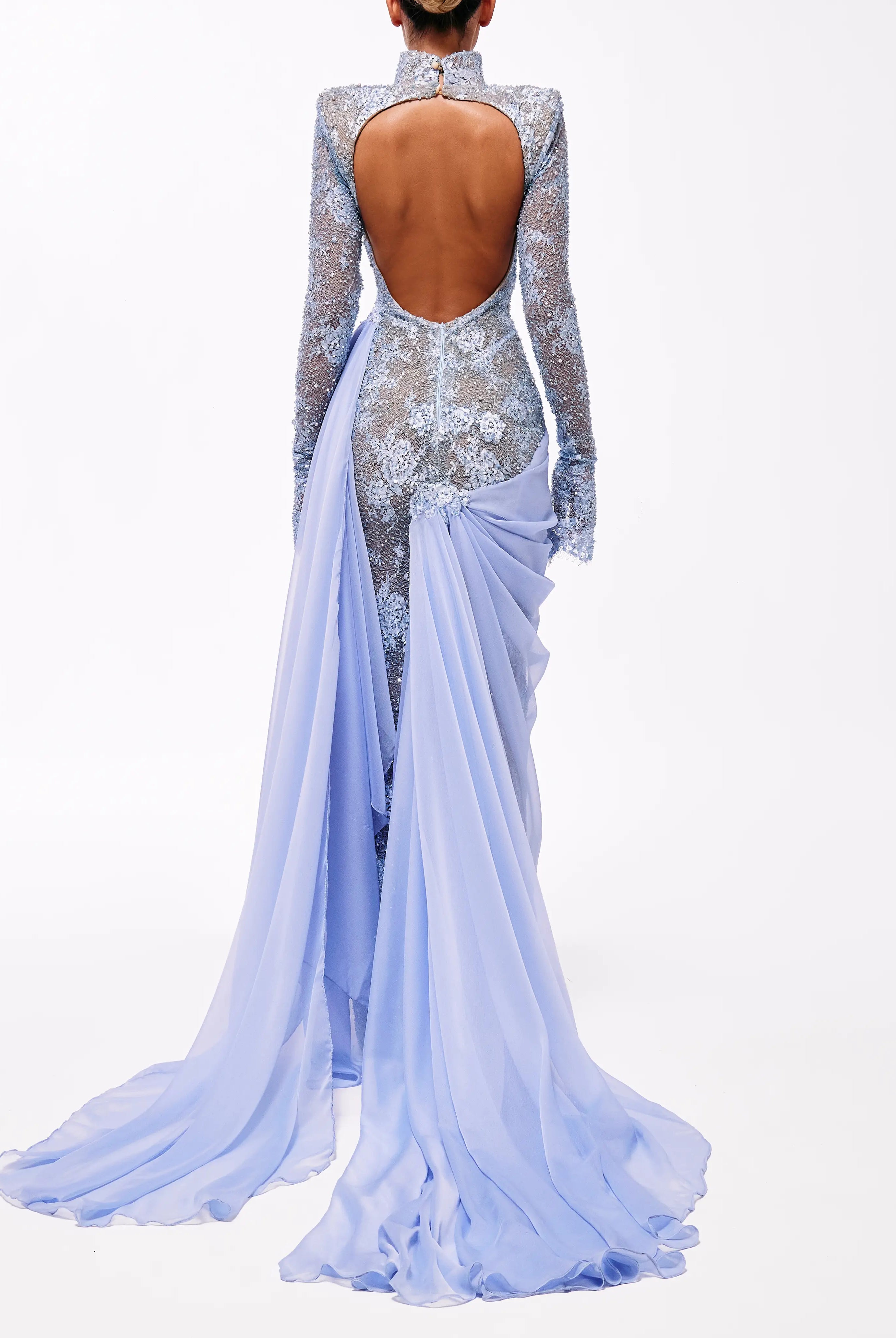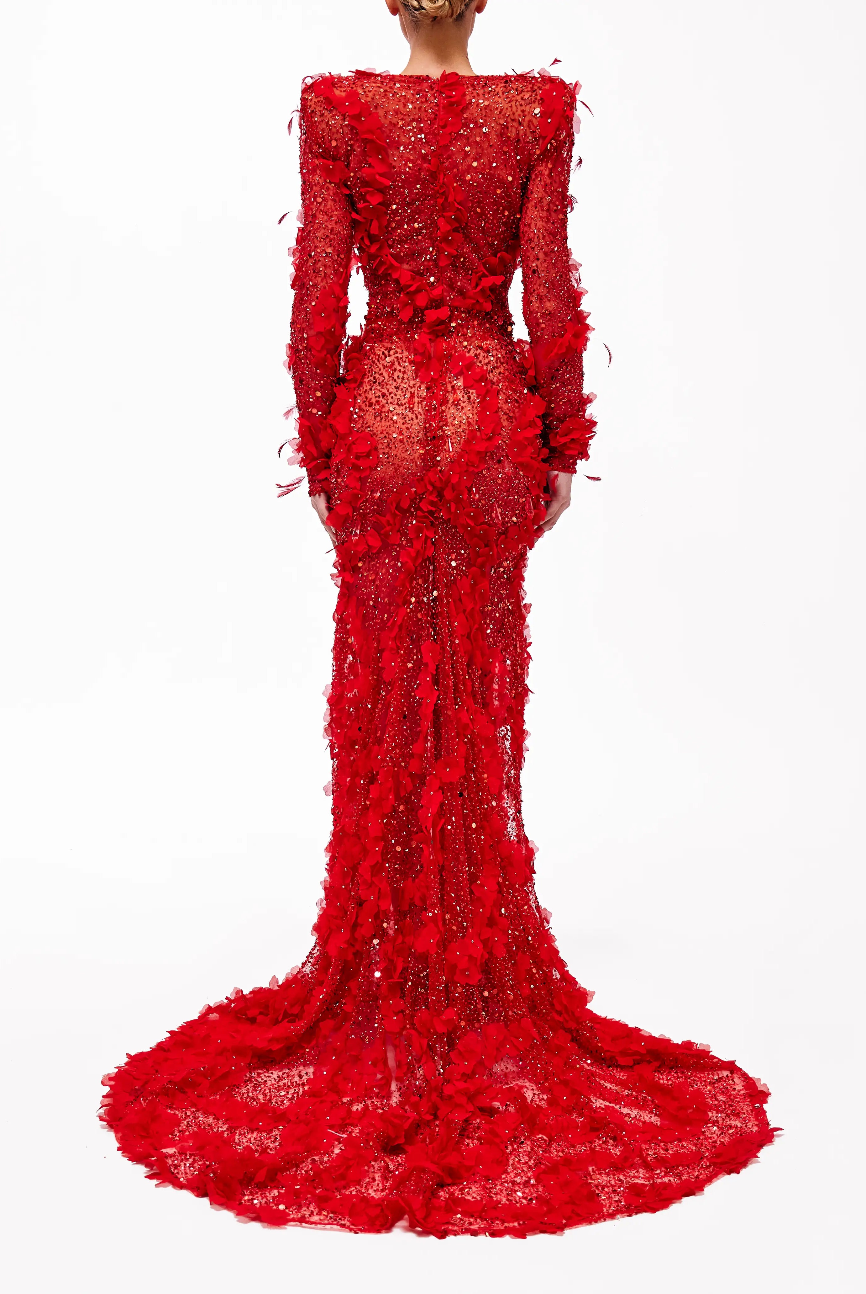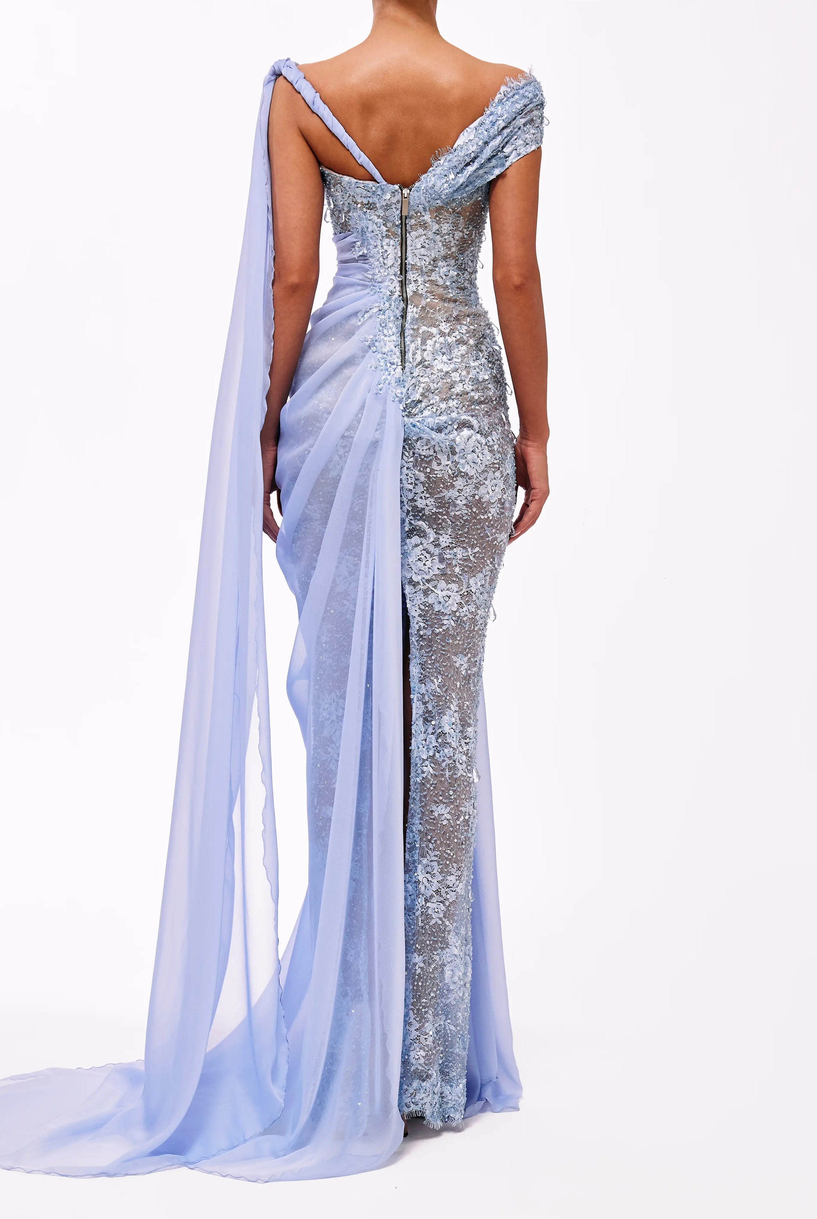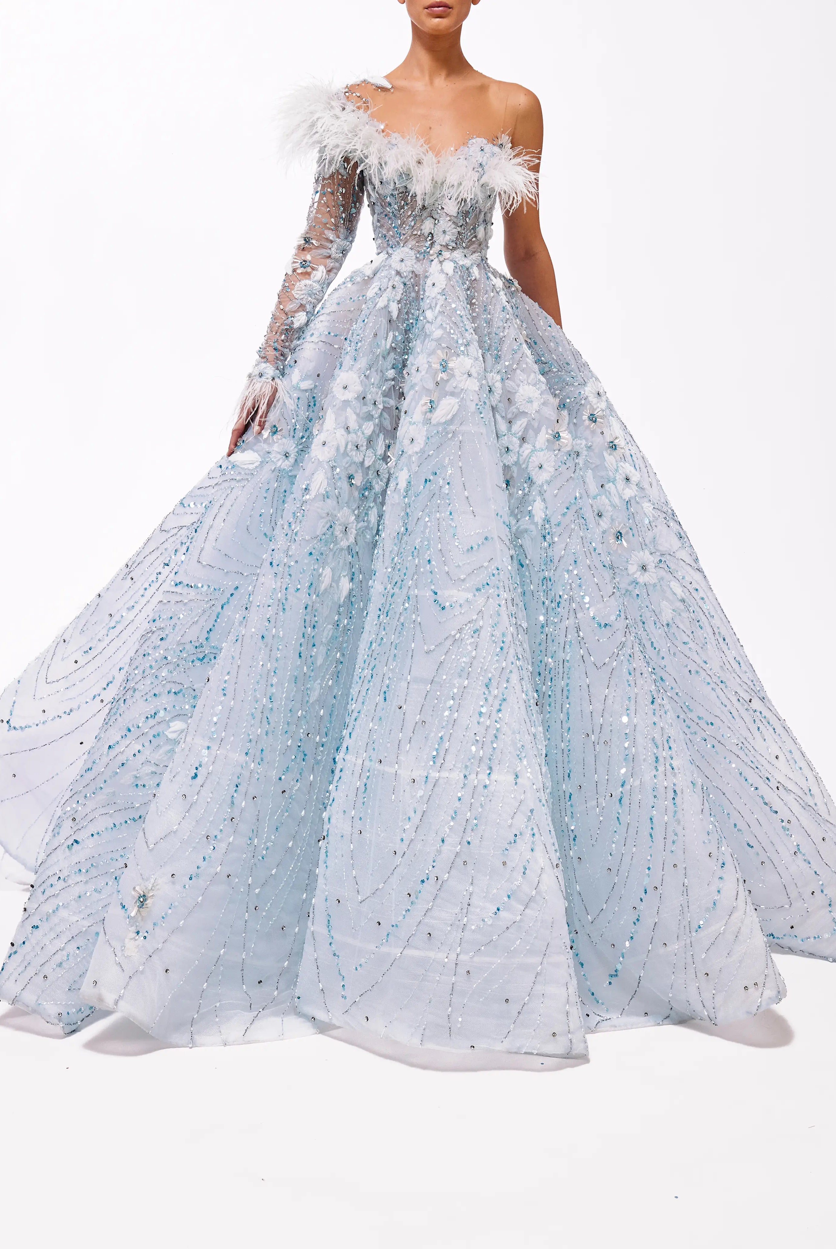 A collection full of life, Haute Allure brings your imagination to reality. With a vast selection in hues, these gowns provide ample options for extravagant events. This collection is elegantly maximalistic, with the floral lace material, cape aspect, and other unique features. Enter a world of colorful drama through Valdrin Sahiti.