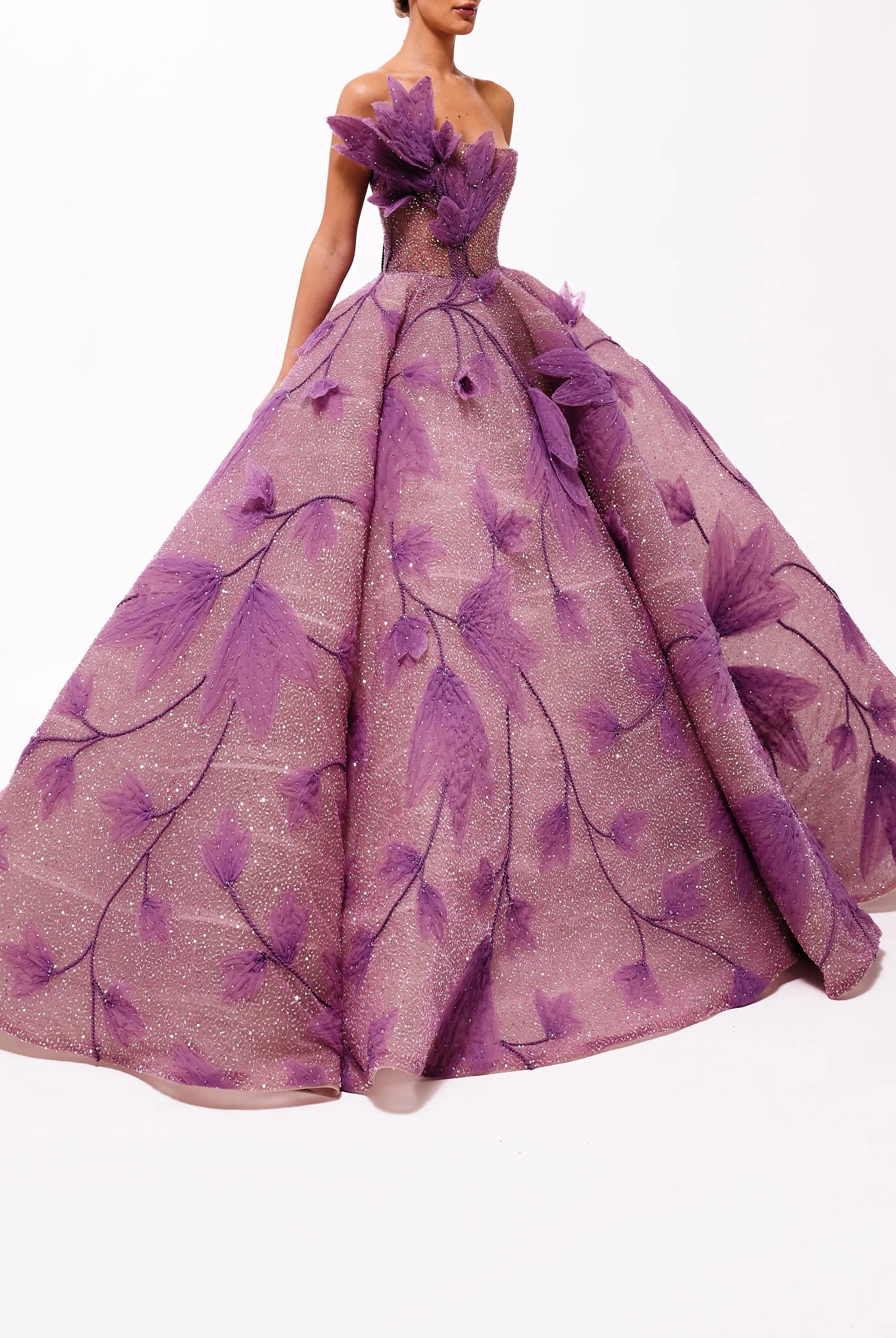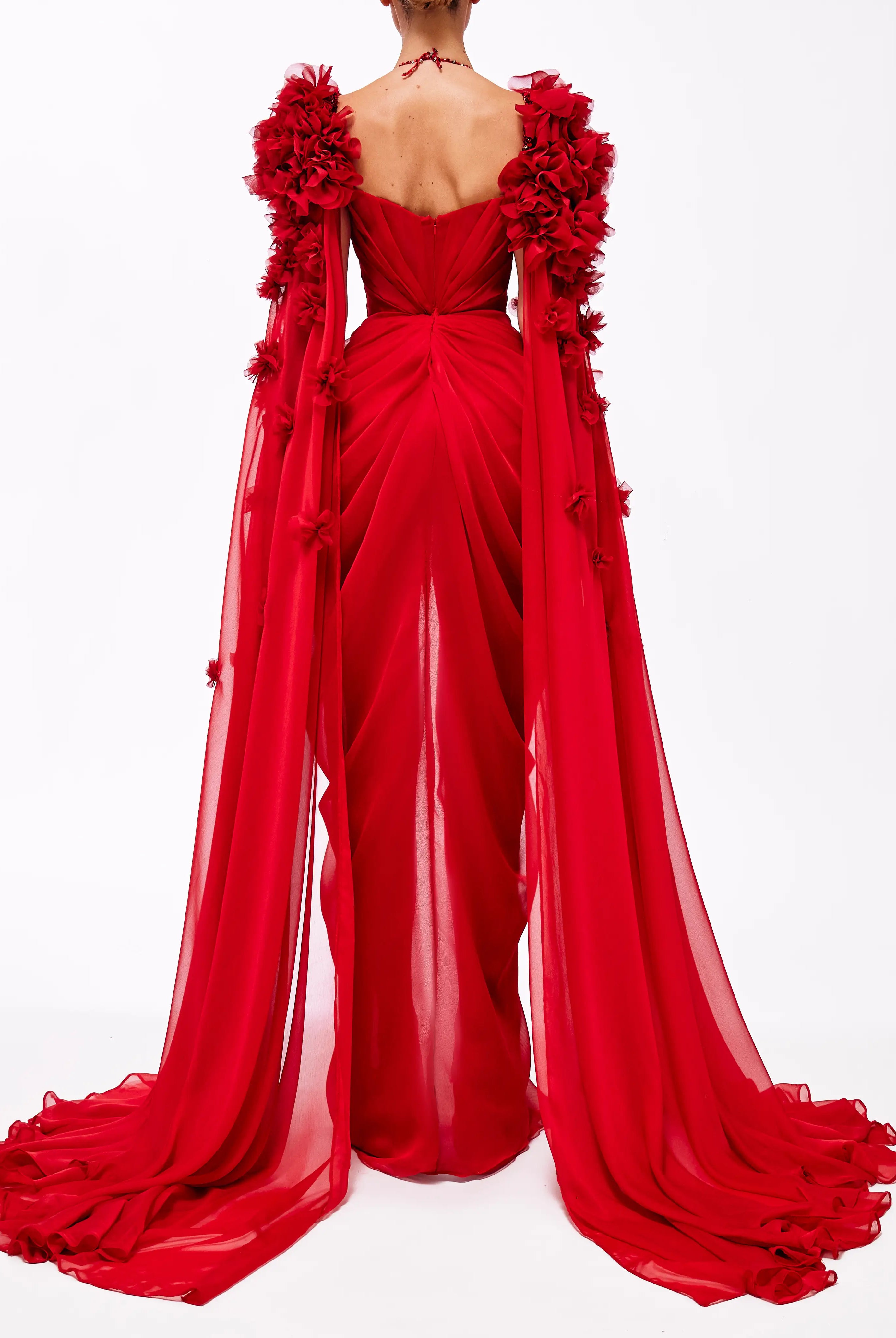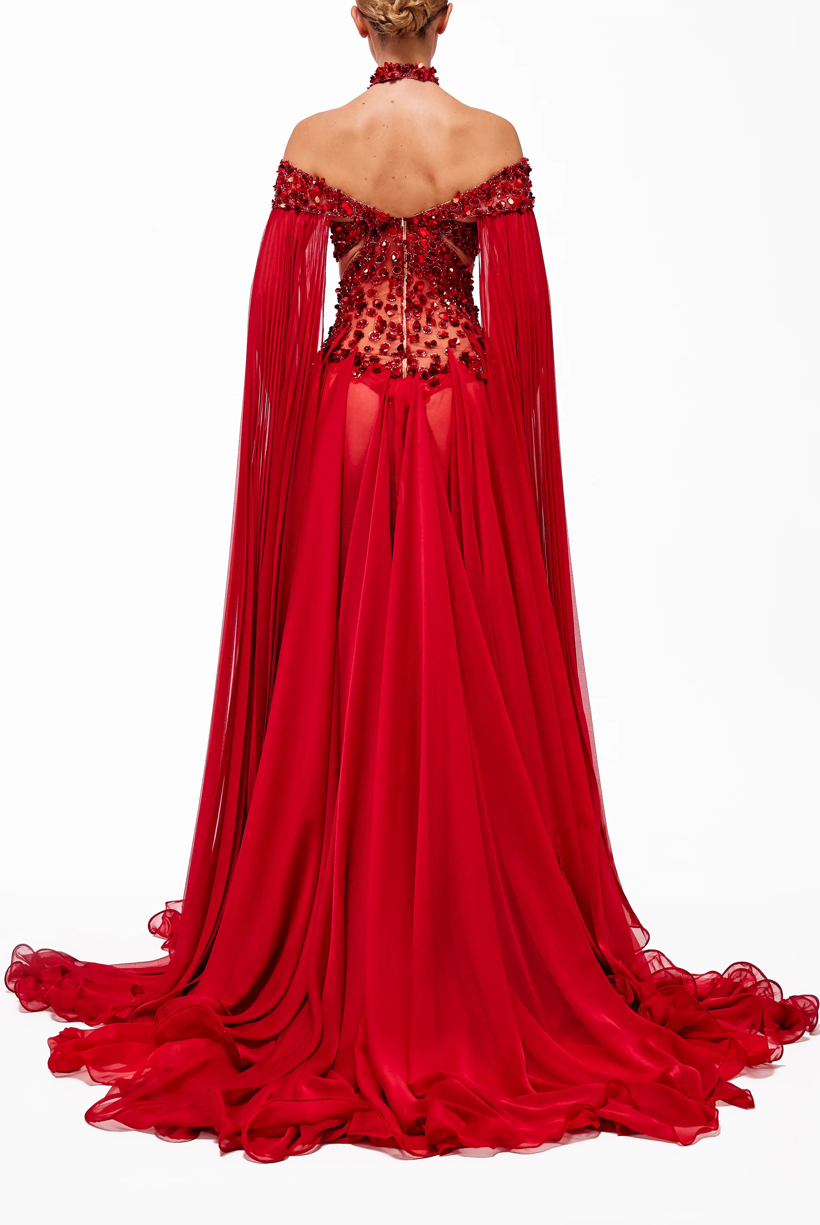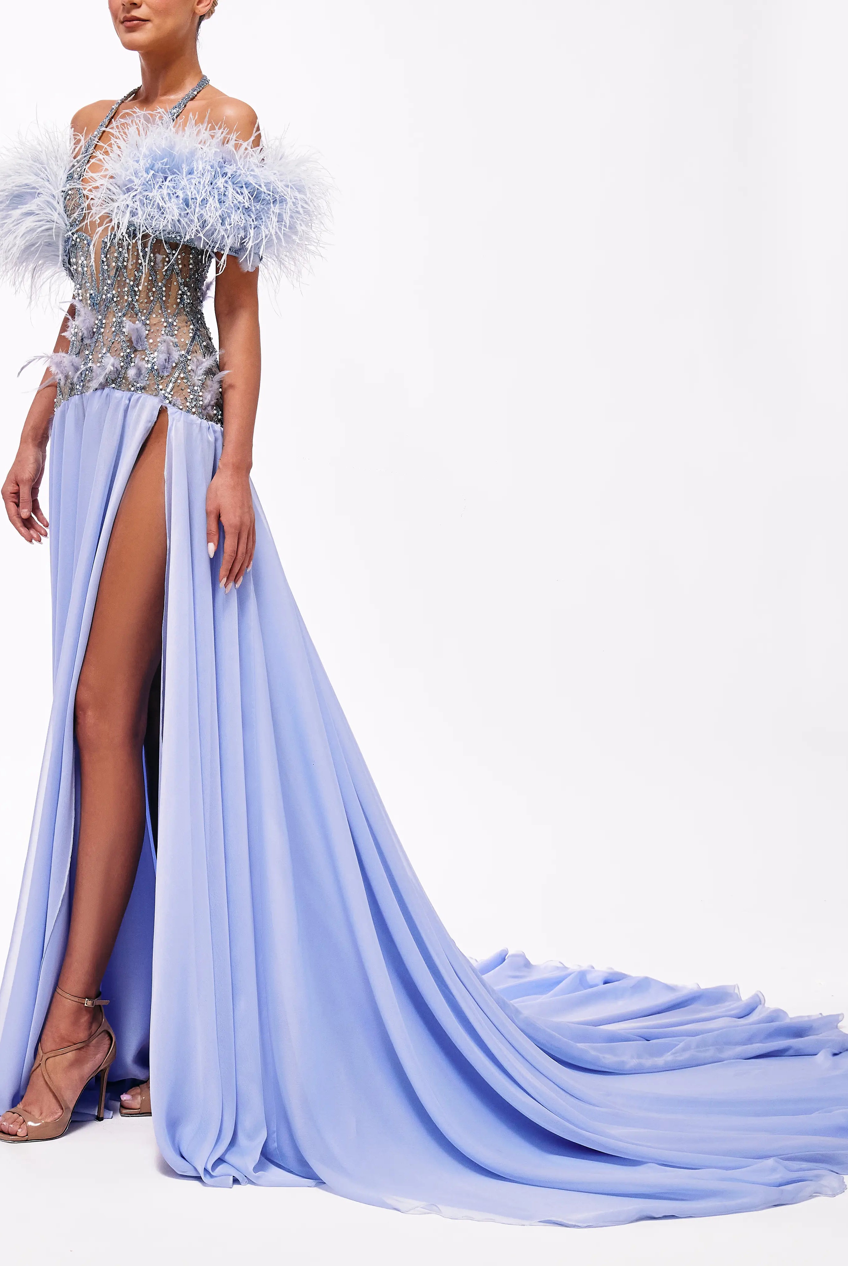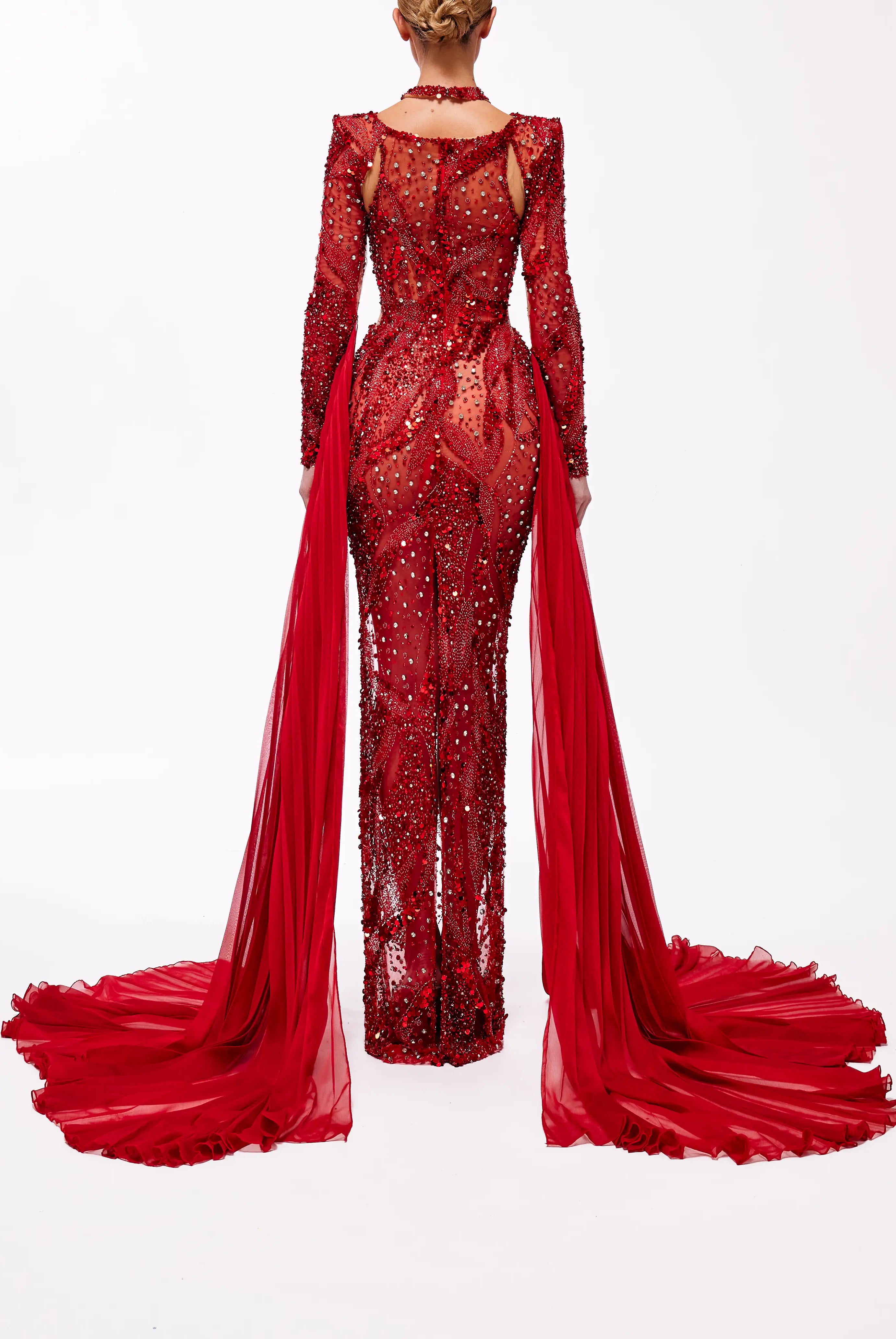 A collection full of life, Haute Allure brings your imagination to reality. With a vast selection in hues, these gowns provide ample options for extravagant events. This collection is elegantly maximalistic, with the floral lace material, cape aspect, and other unique features. Enter a world of colorful drama through Valdrin Sahiti.