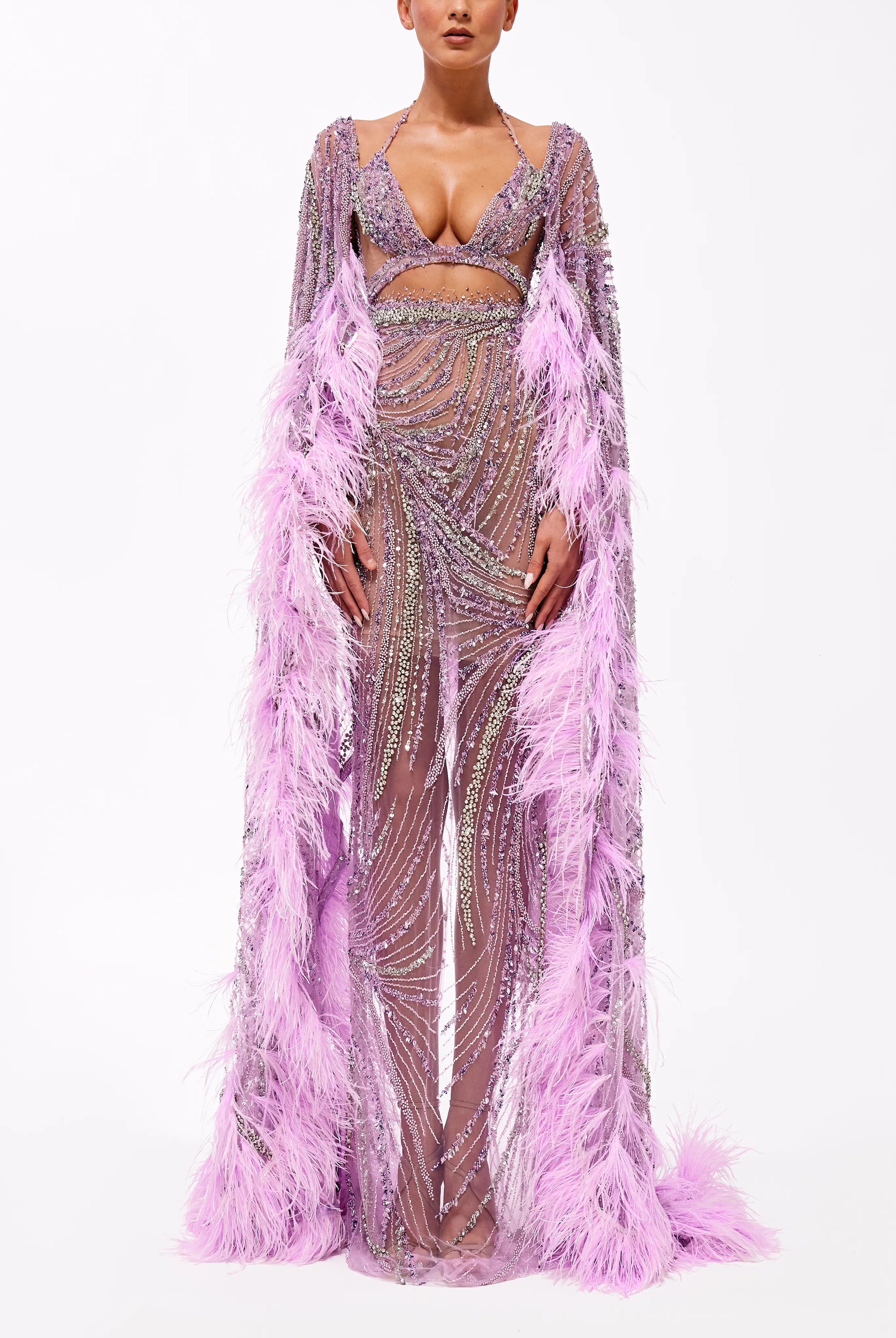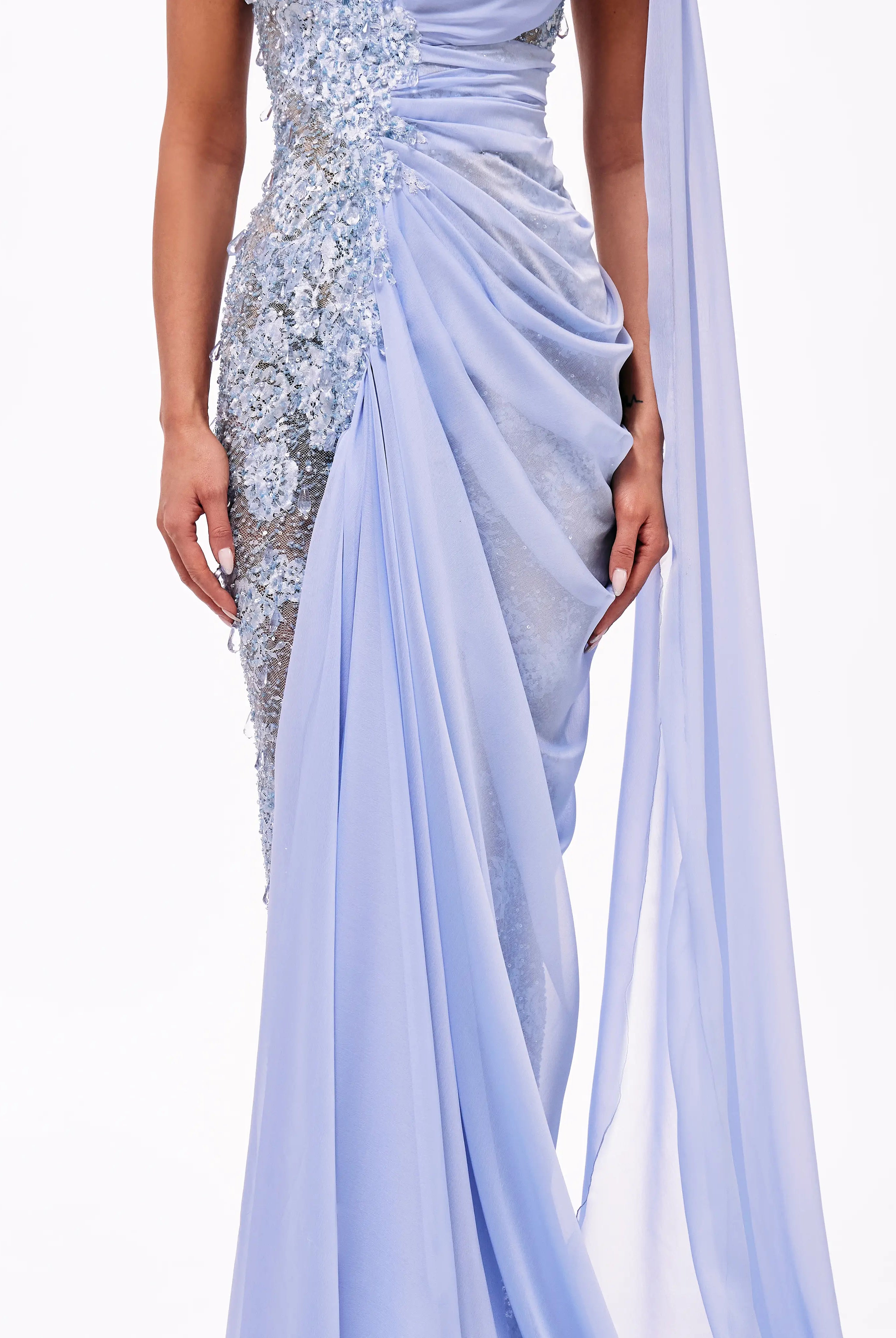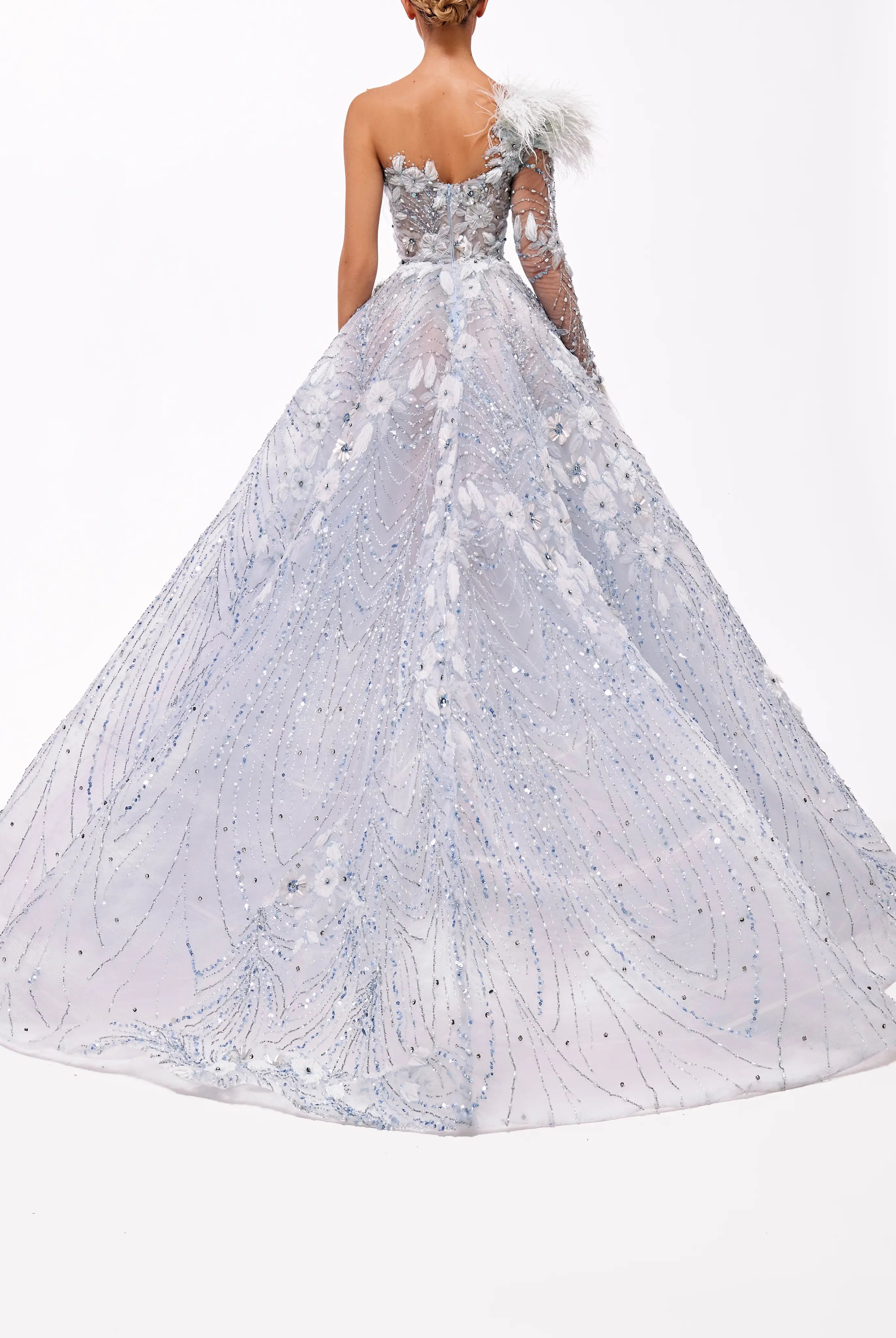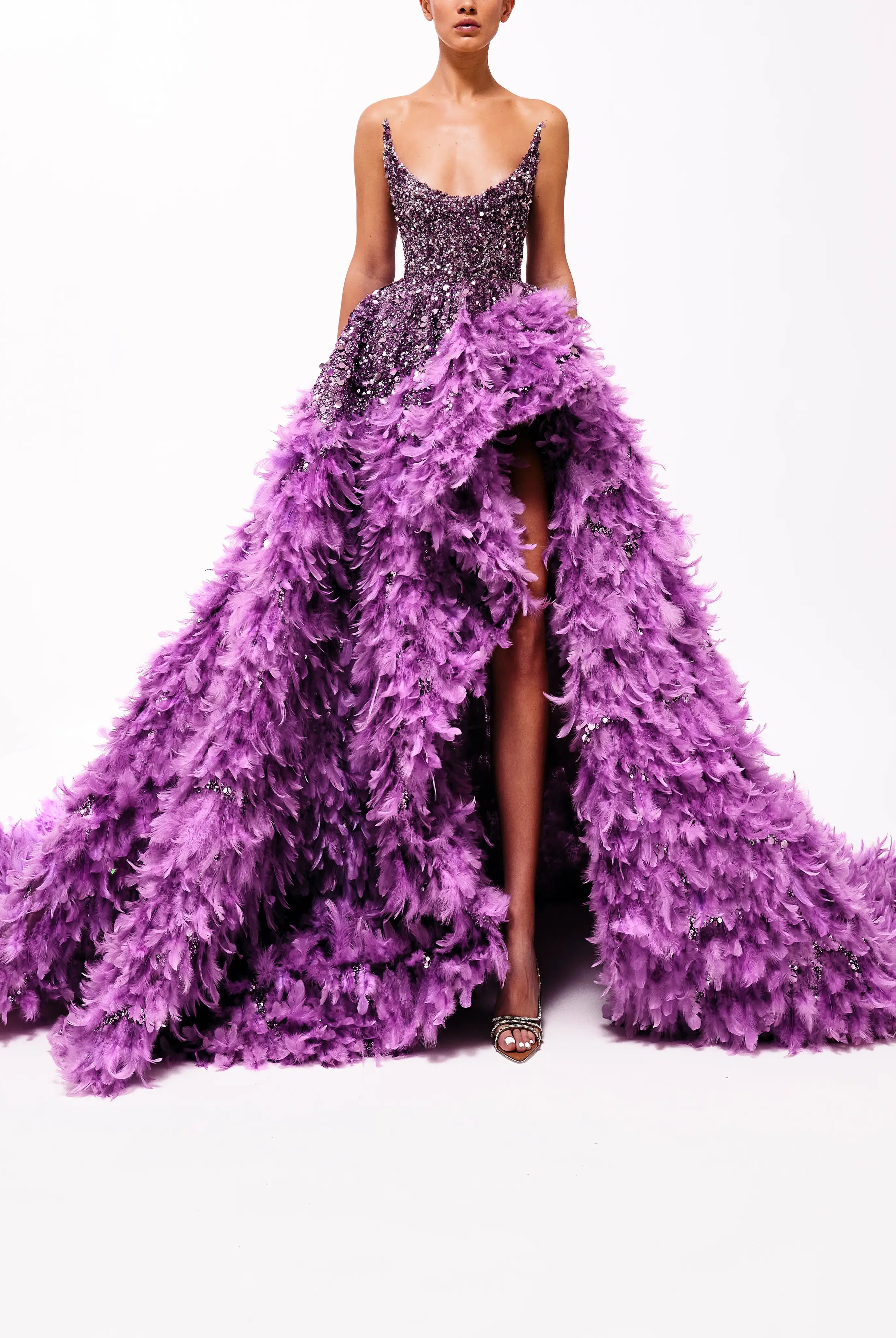 A collection full of life, Haute Allure brings your imagination to reality. With a vast selection in hues, these gowns provide ample options for extravagant events. This collection is elegantly maximalistic, with the floral lace material, cape aspect, and other unique features. Enter a world of colorful drama through Valdrin Sahiti.