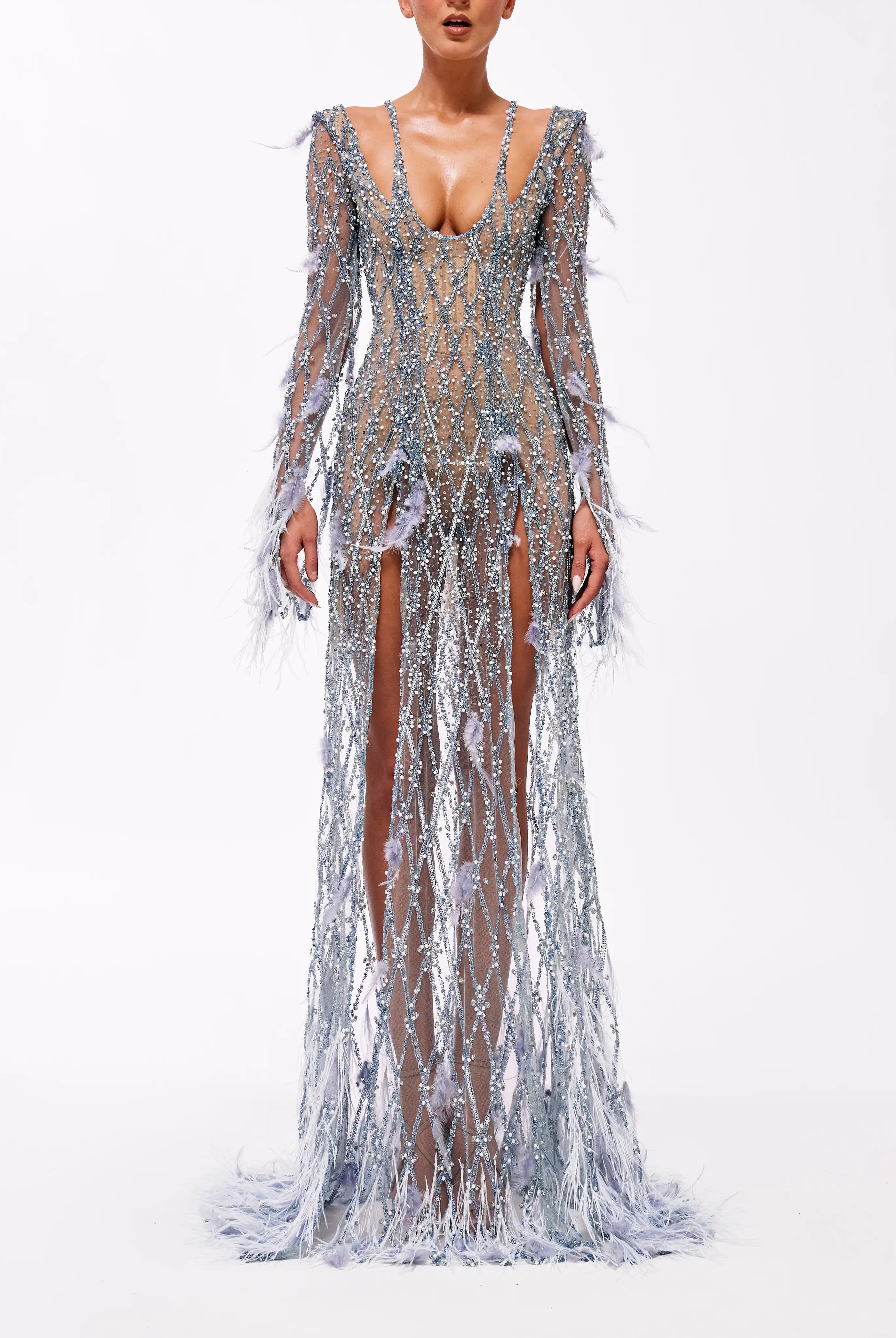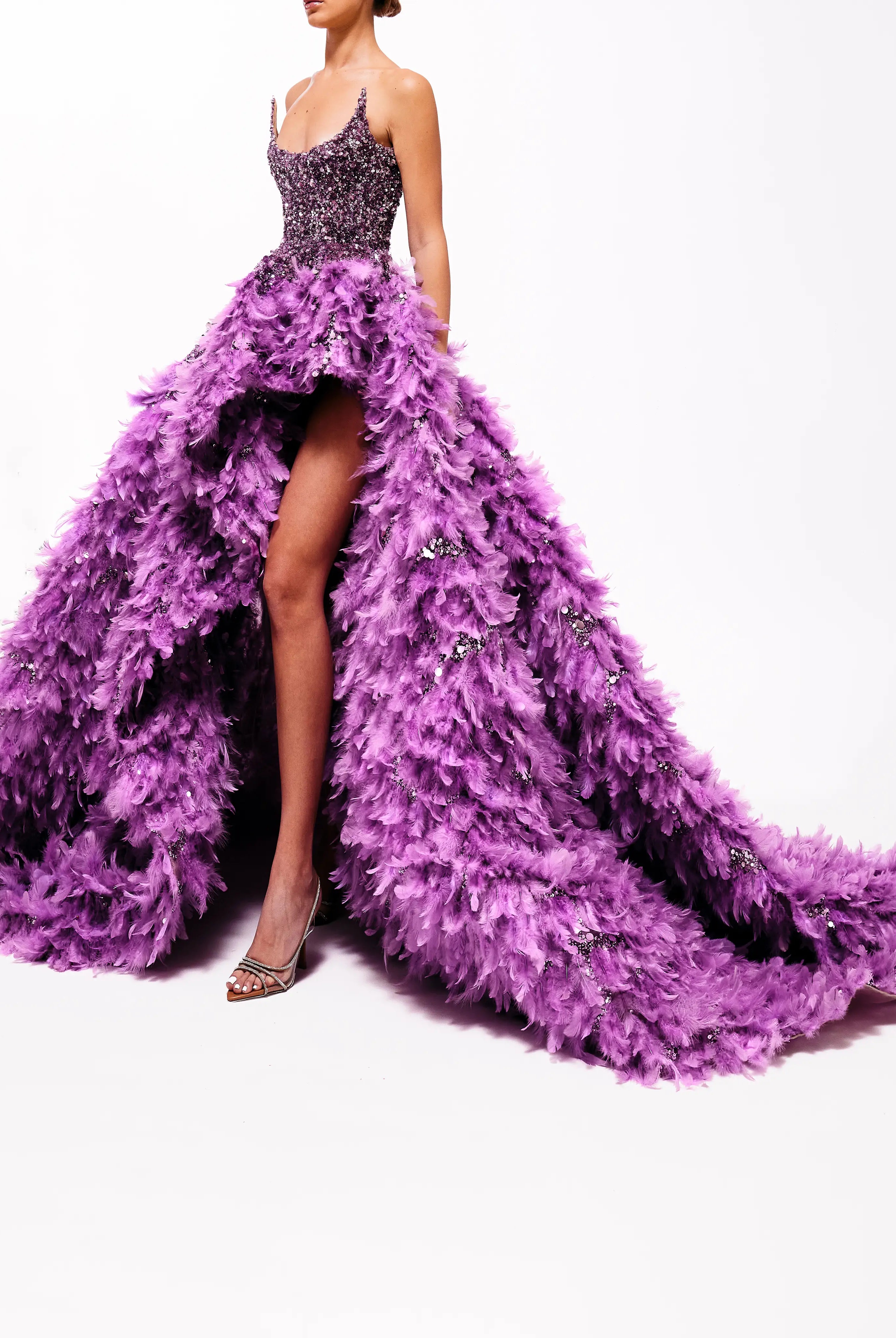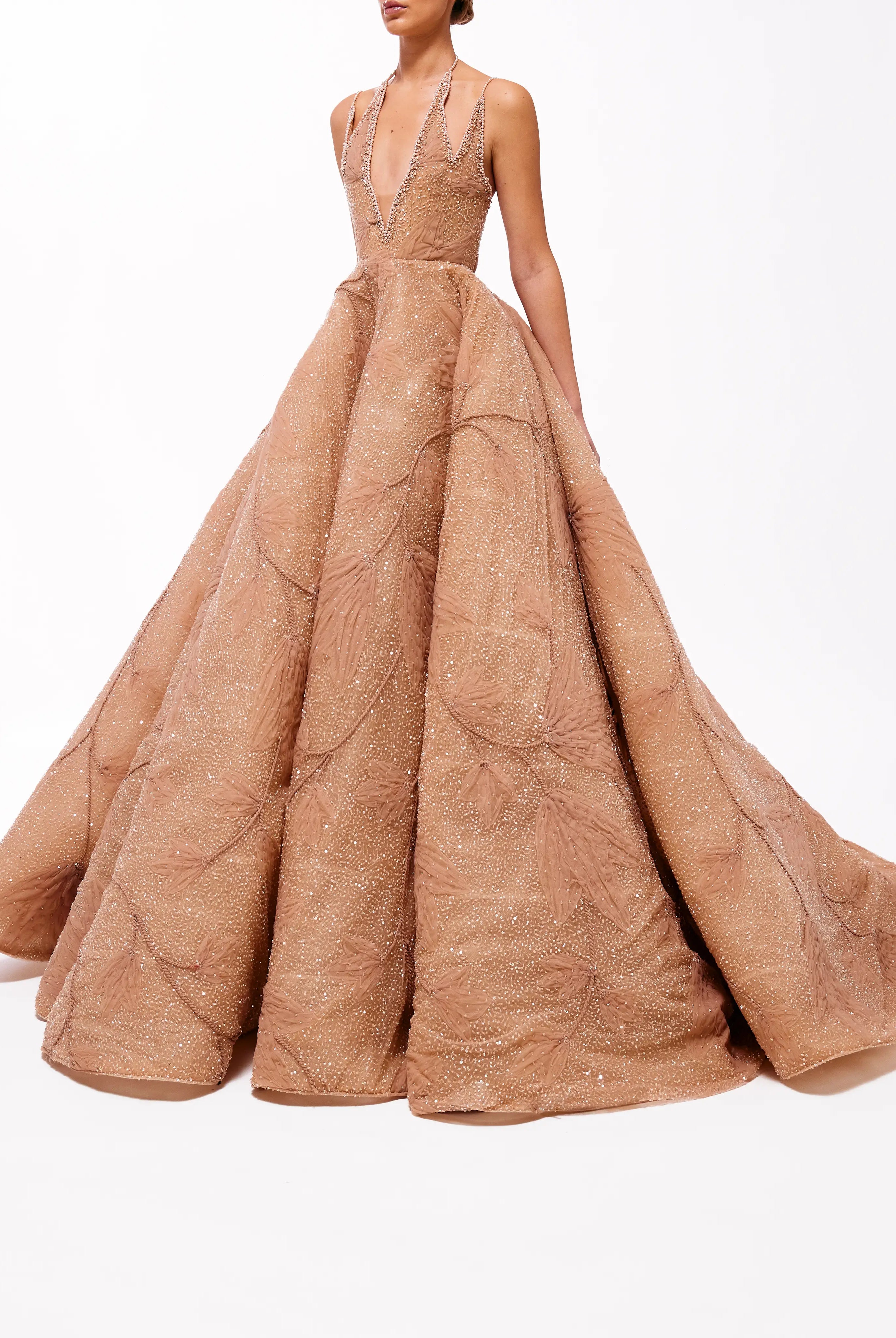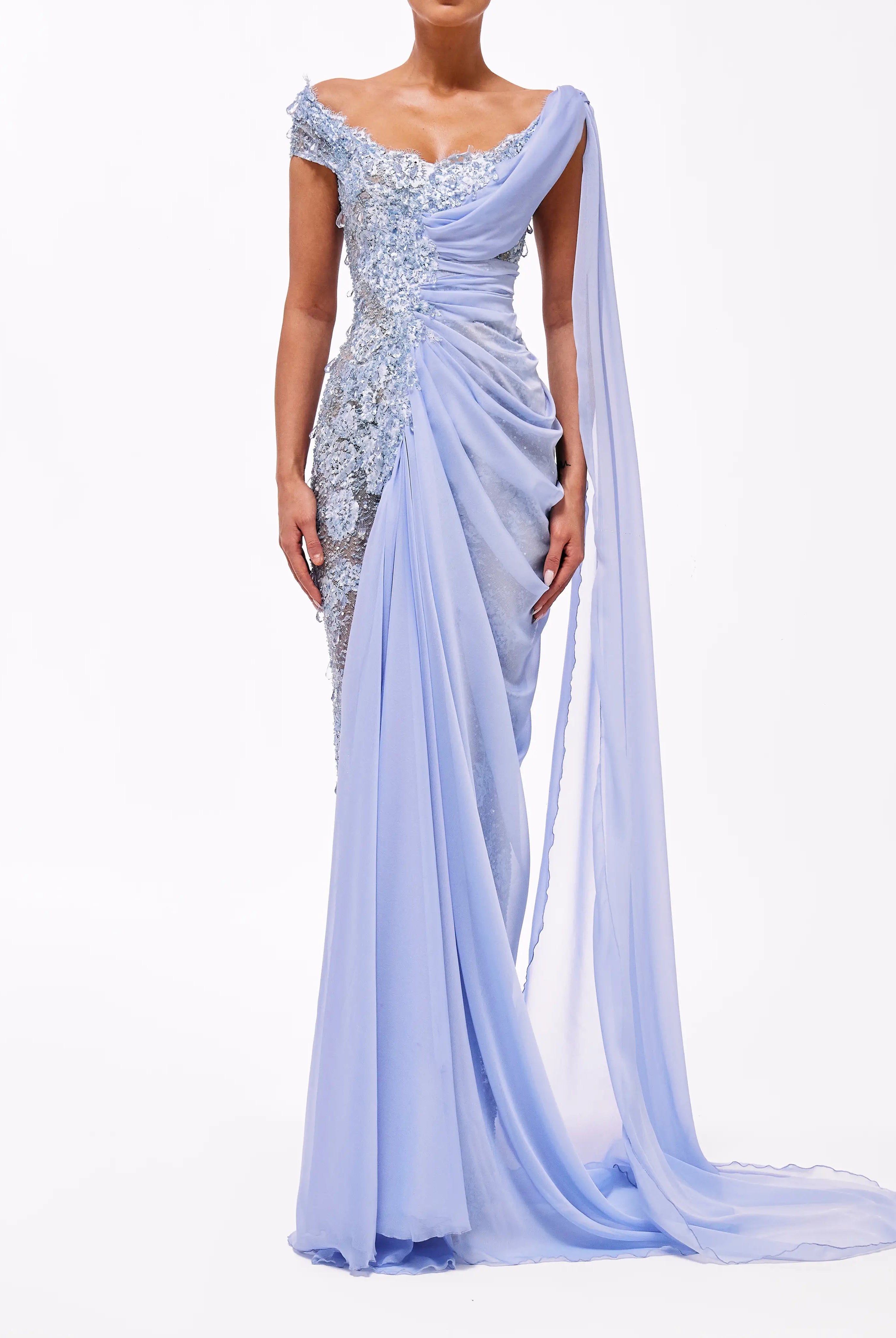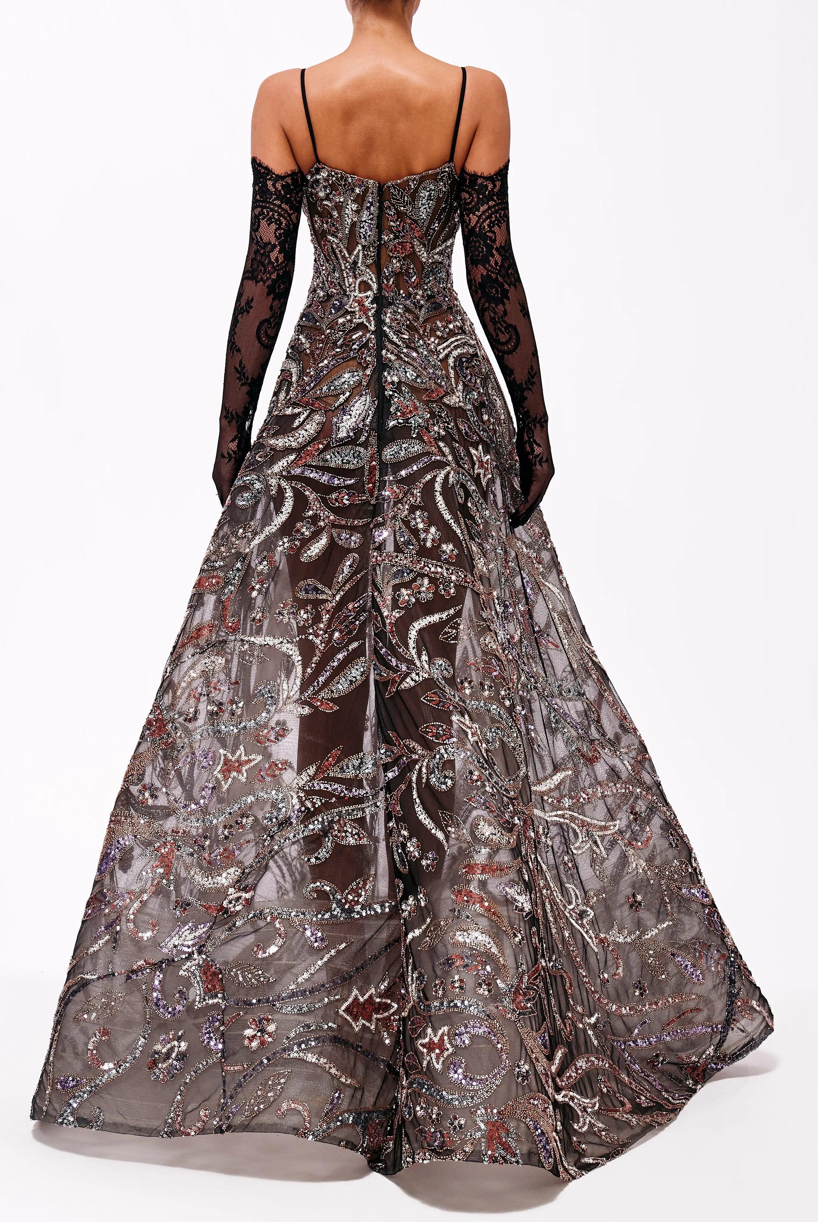 A collection full of life, Haute Allure brings your imagination to reality. With a vast selection in hues, these gowns provide ample options for extravagant events. This collection is elegantly maximalistic, with the floral lace material, cape aspect, and other unique features. Enter a world of colorful drama through Valdrin Sahiti.
